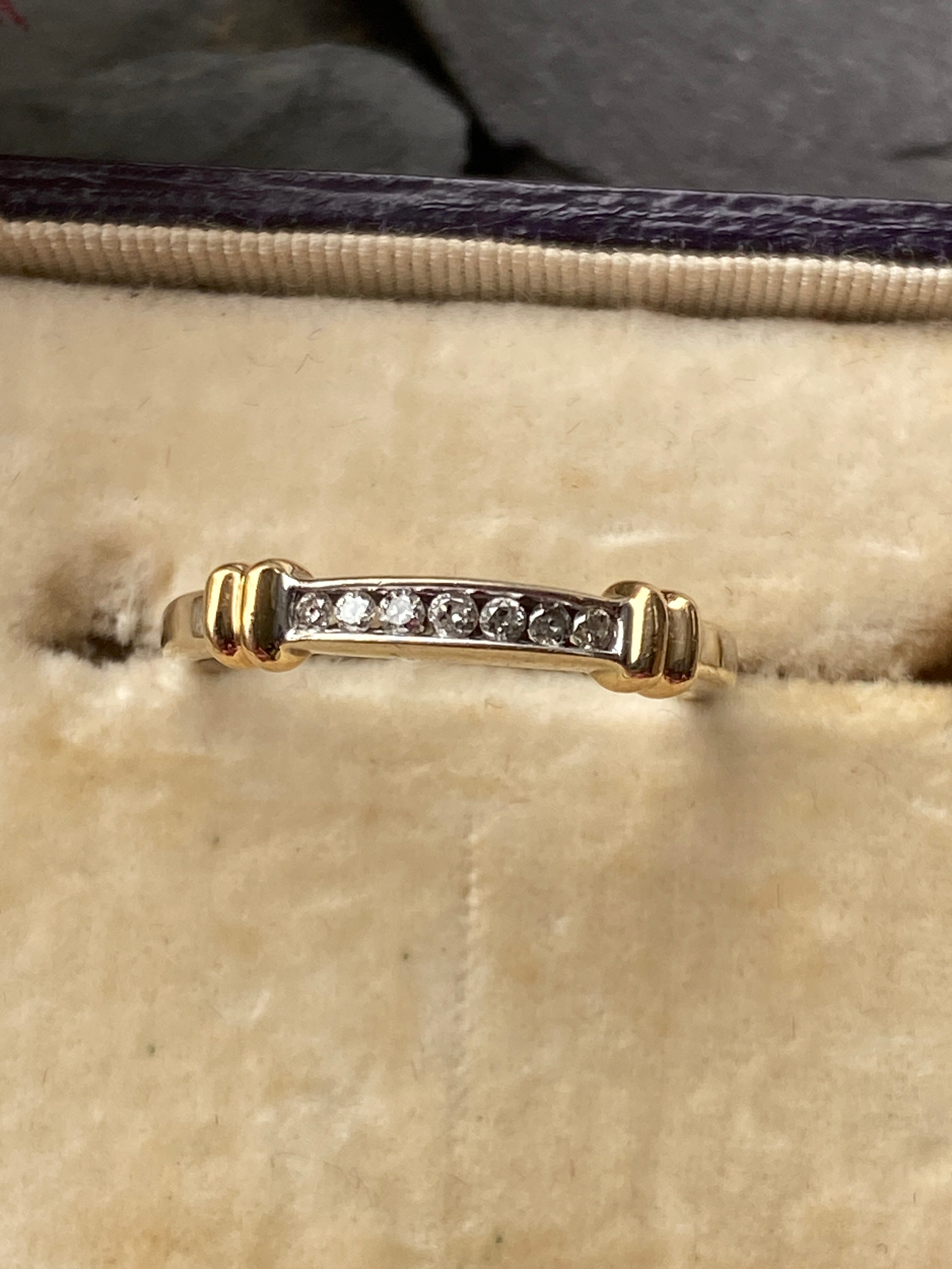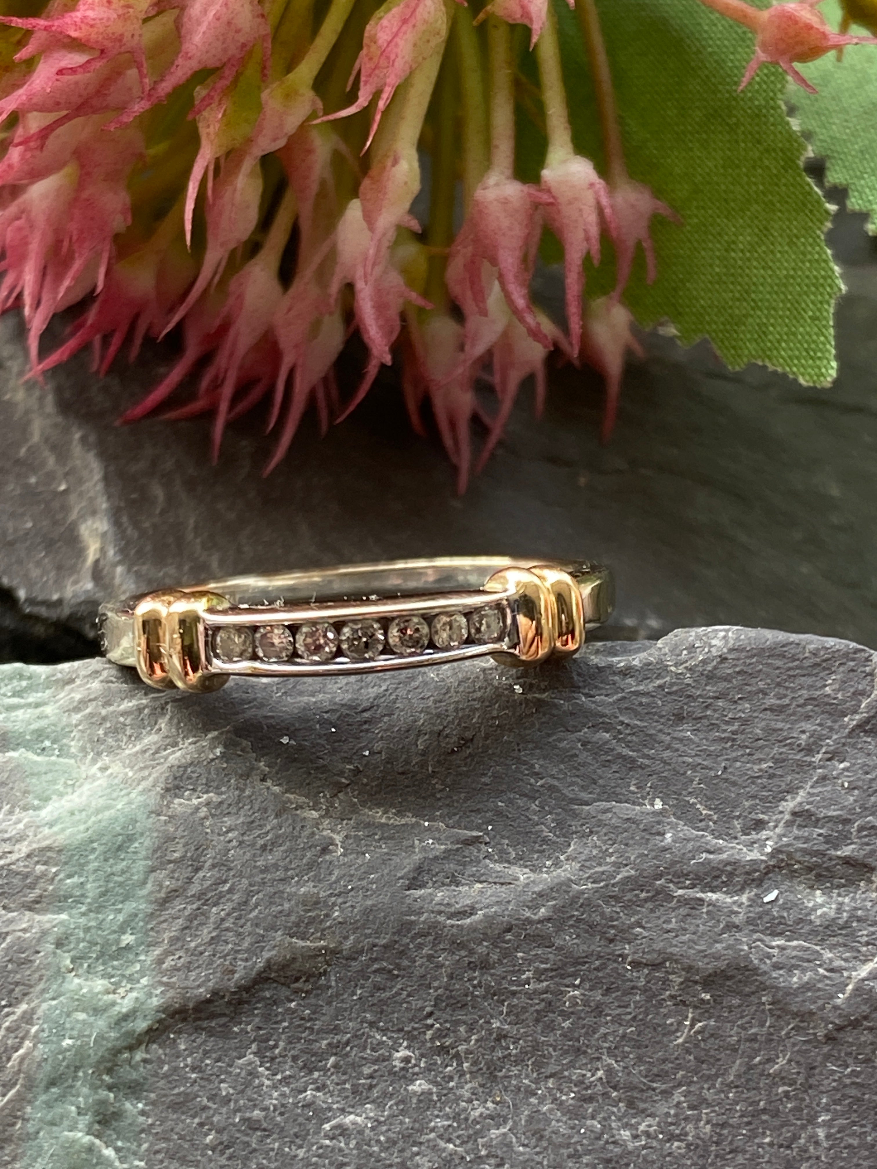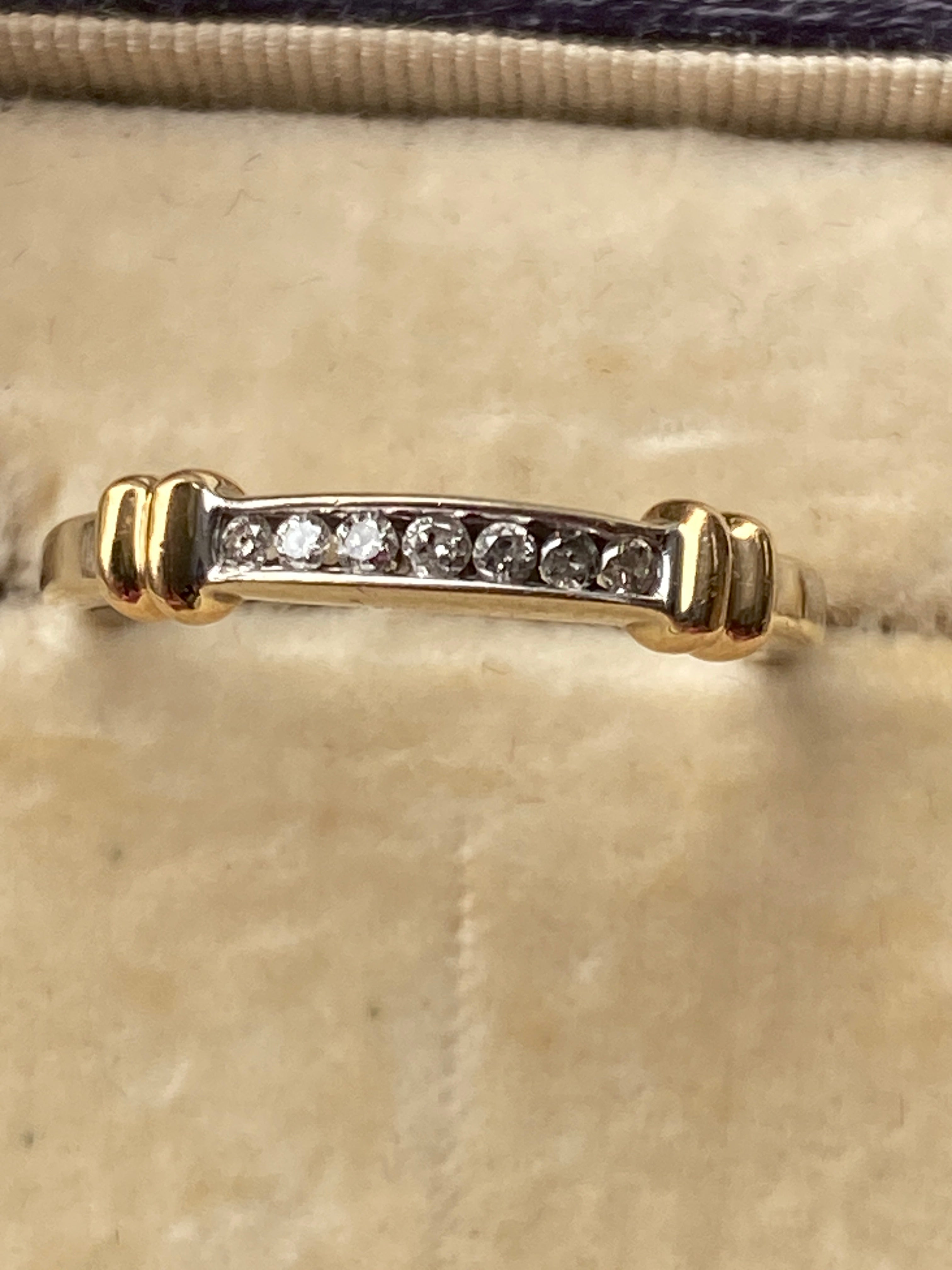 A pretty 14ct white gold eternity stacking ring set with a channel of round brilliant cut Diamonds highlighted by two yellow gold collars.