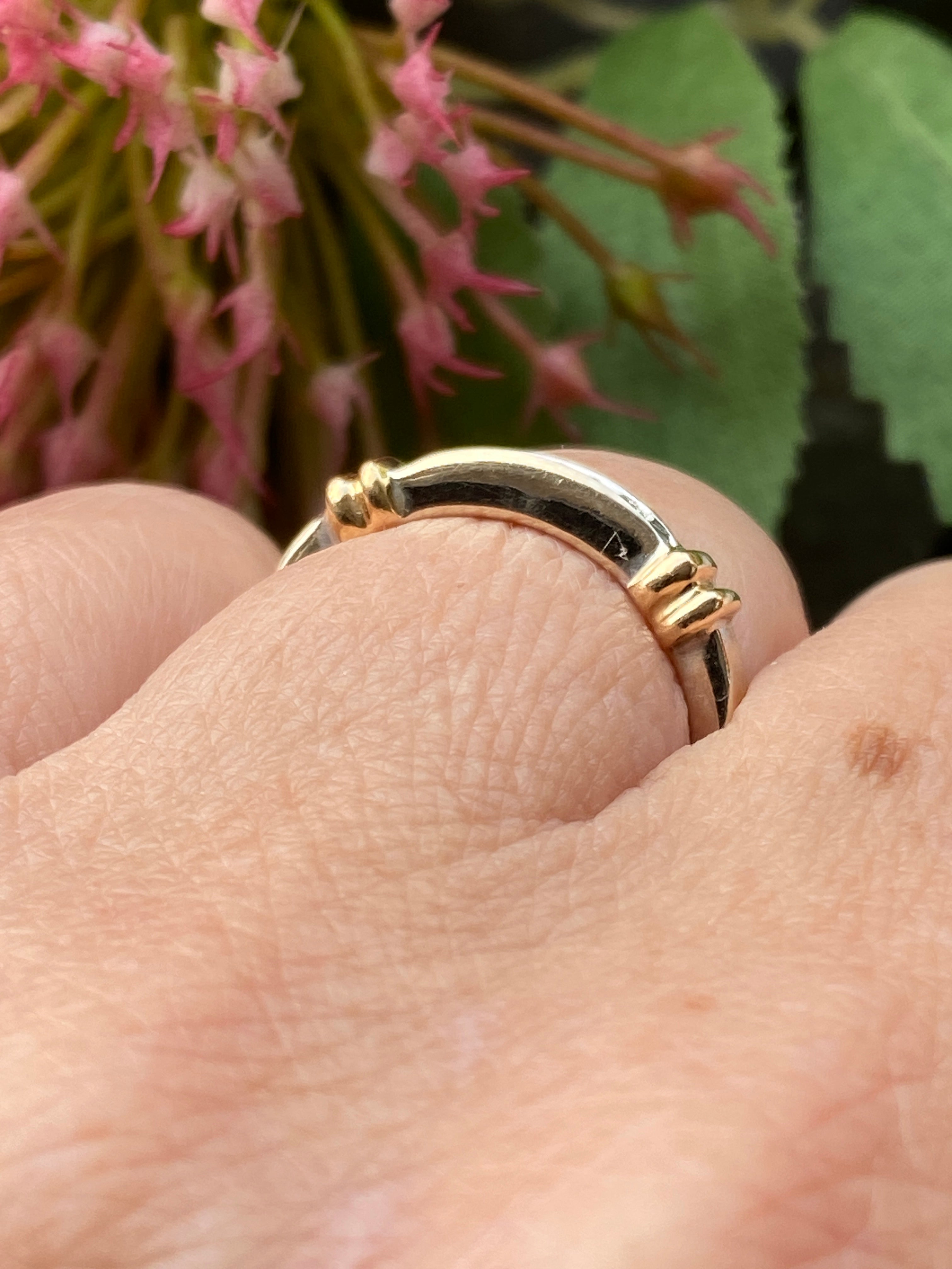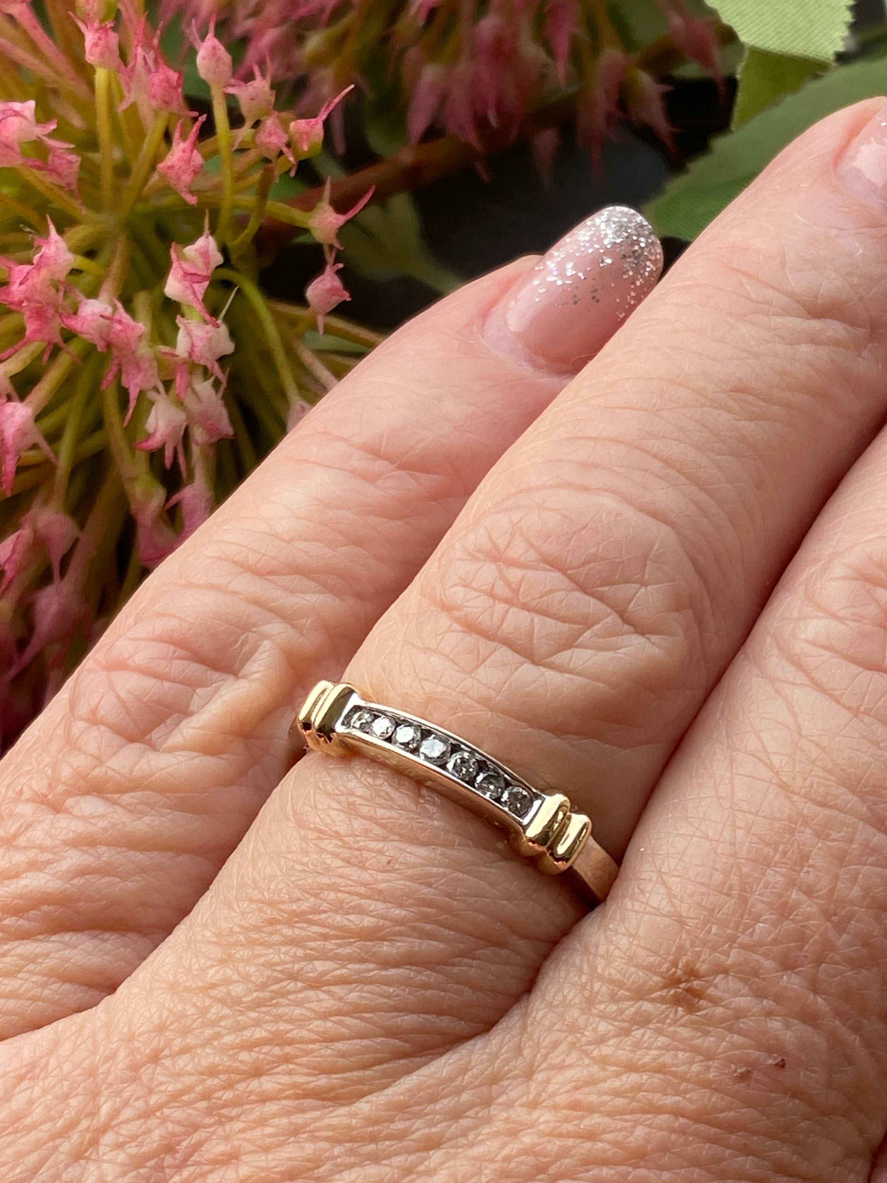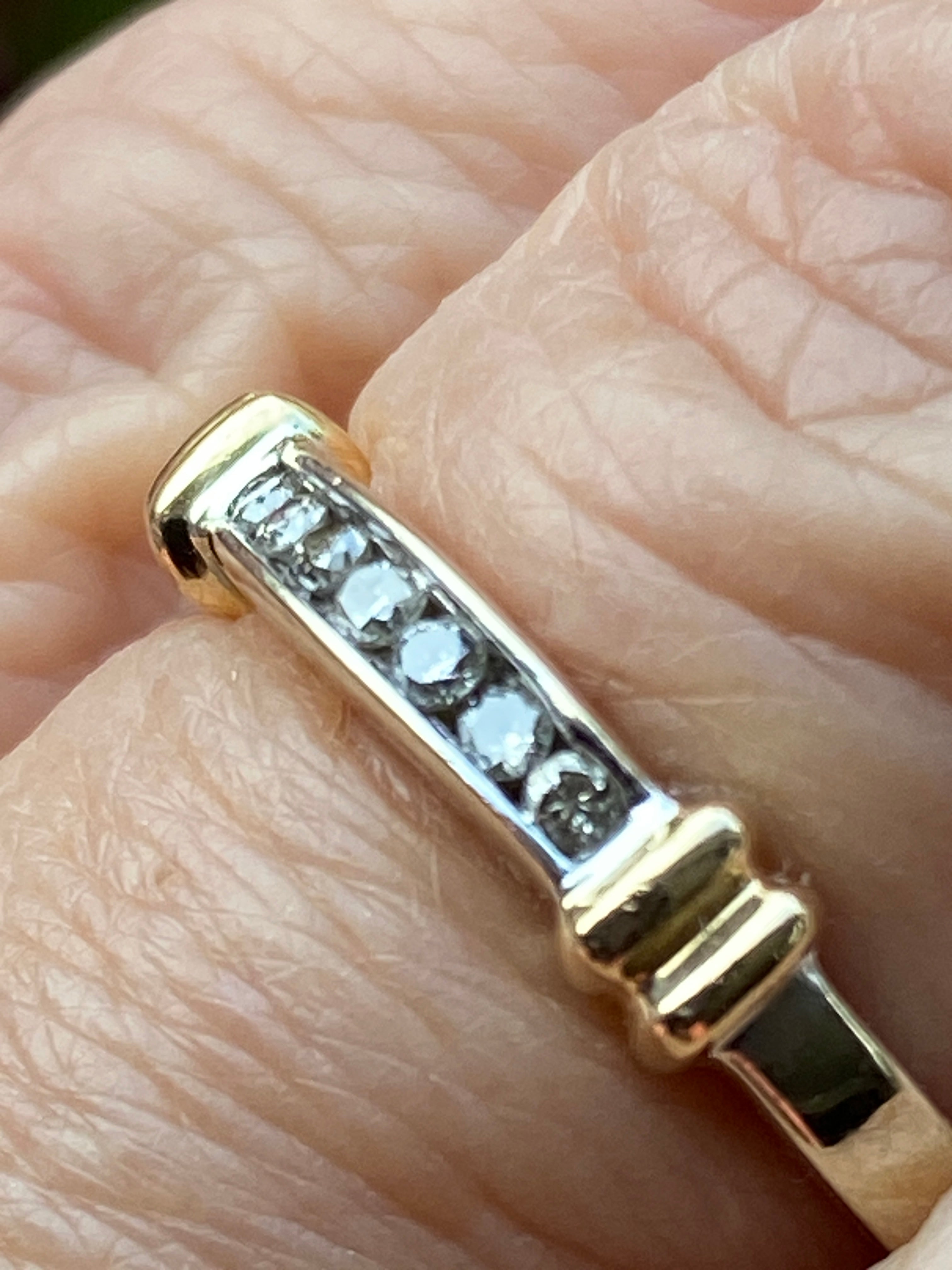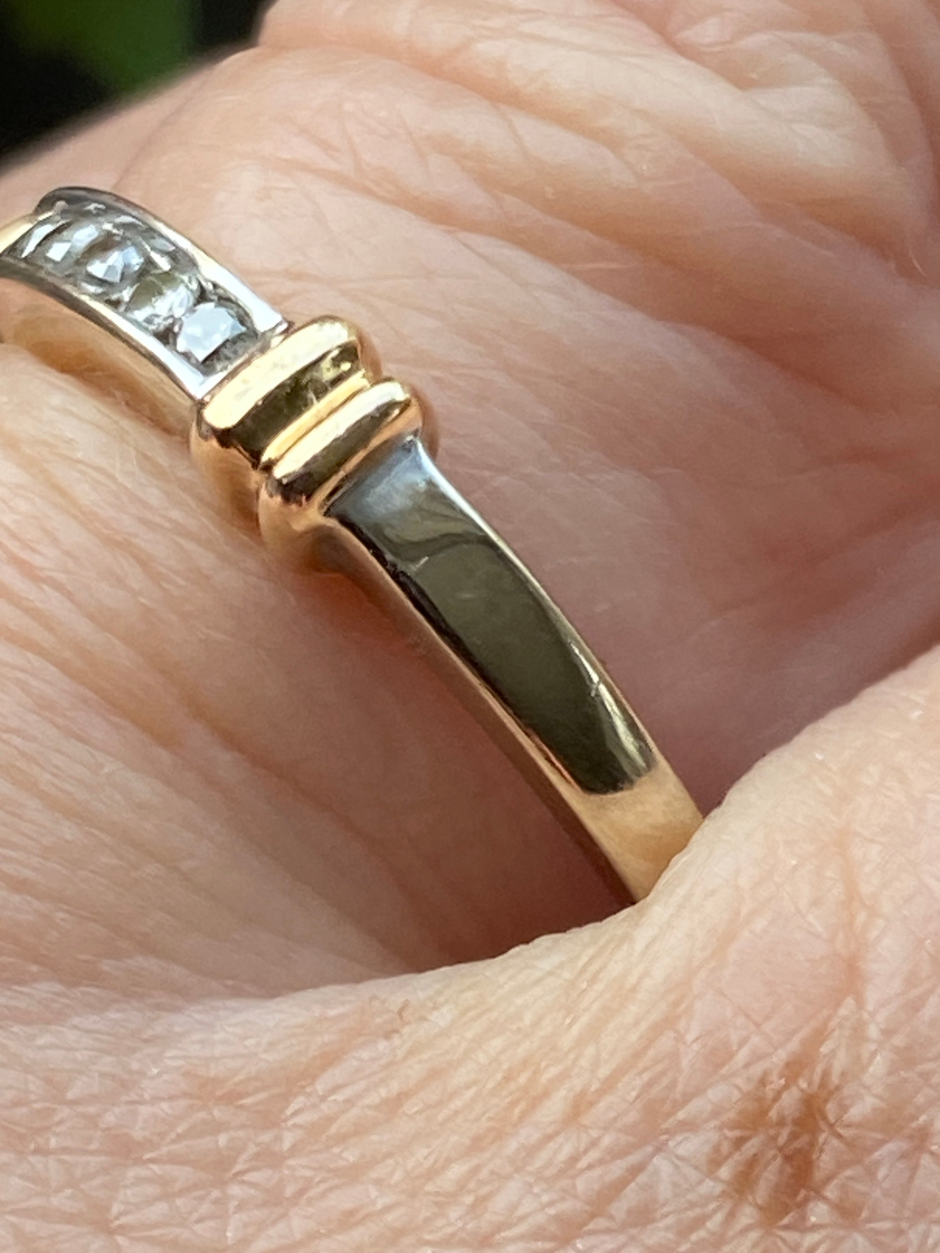 A pretty 14ct white gold eternity stacking ring set with a channel of round brilliant cut Diamonds highlighted by two yellow gold collars.