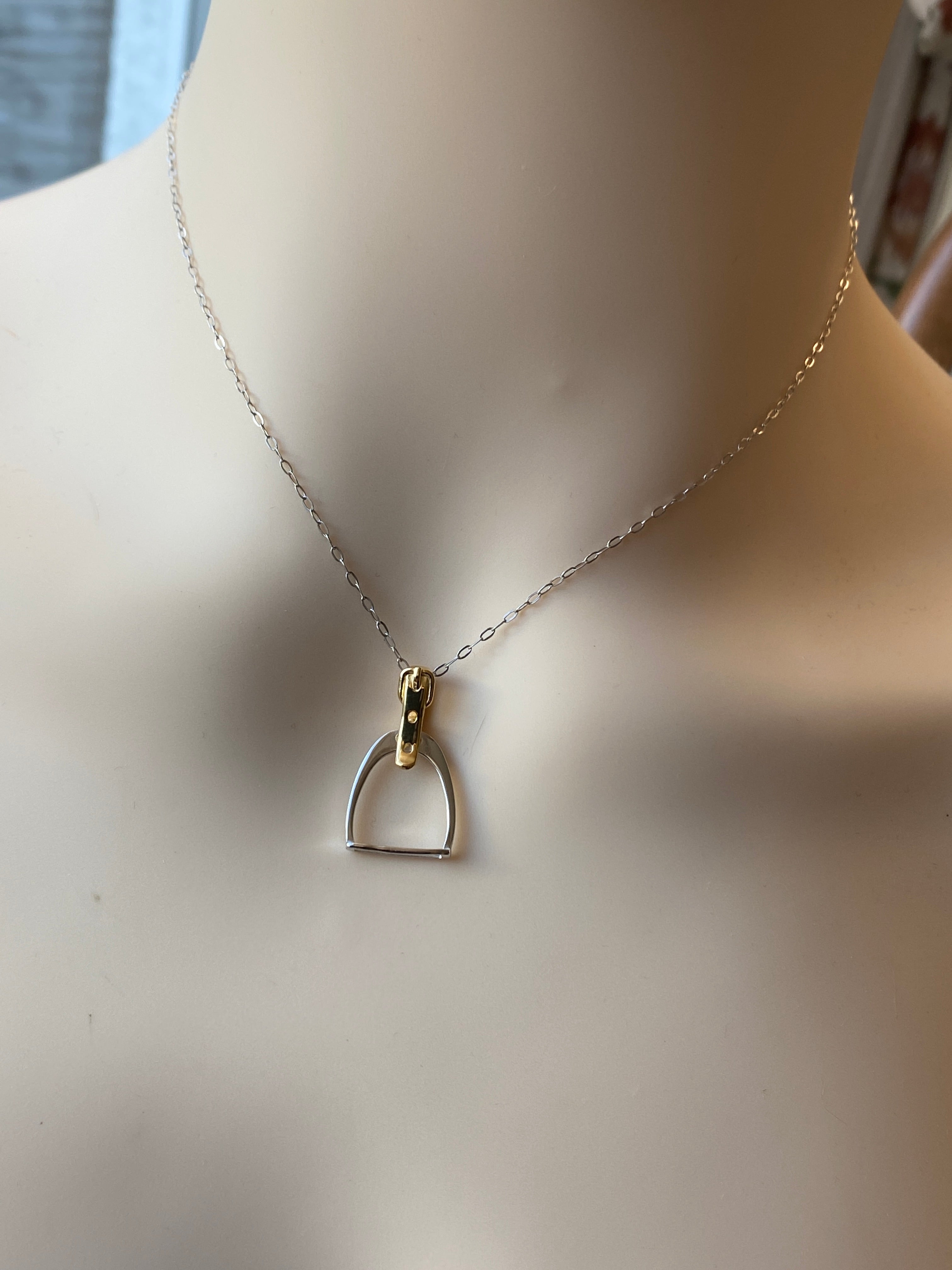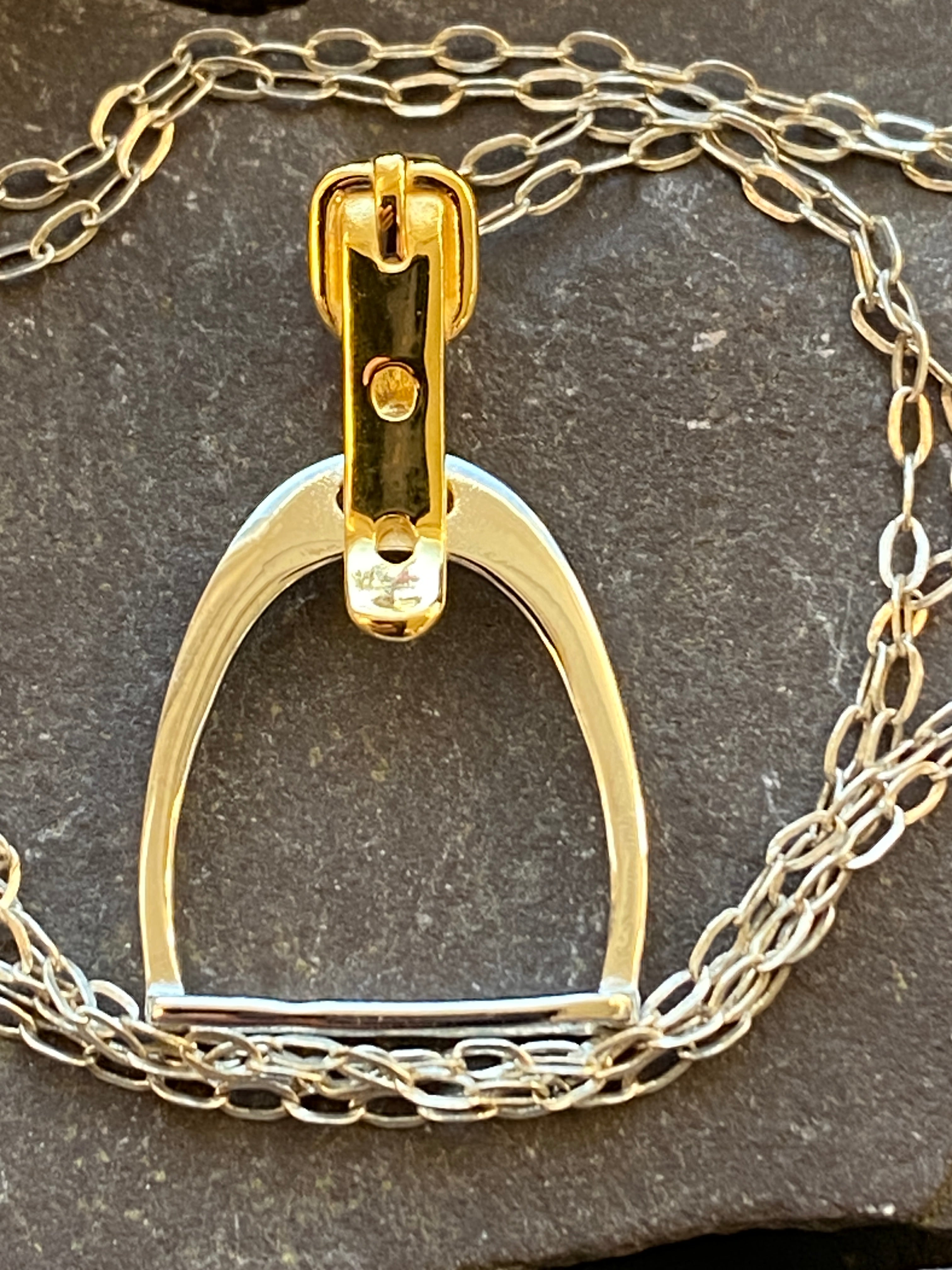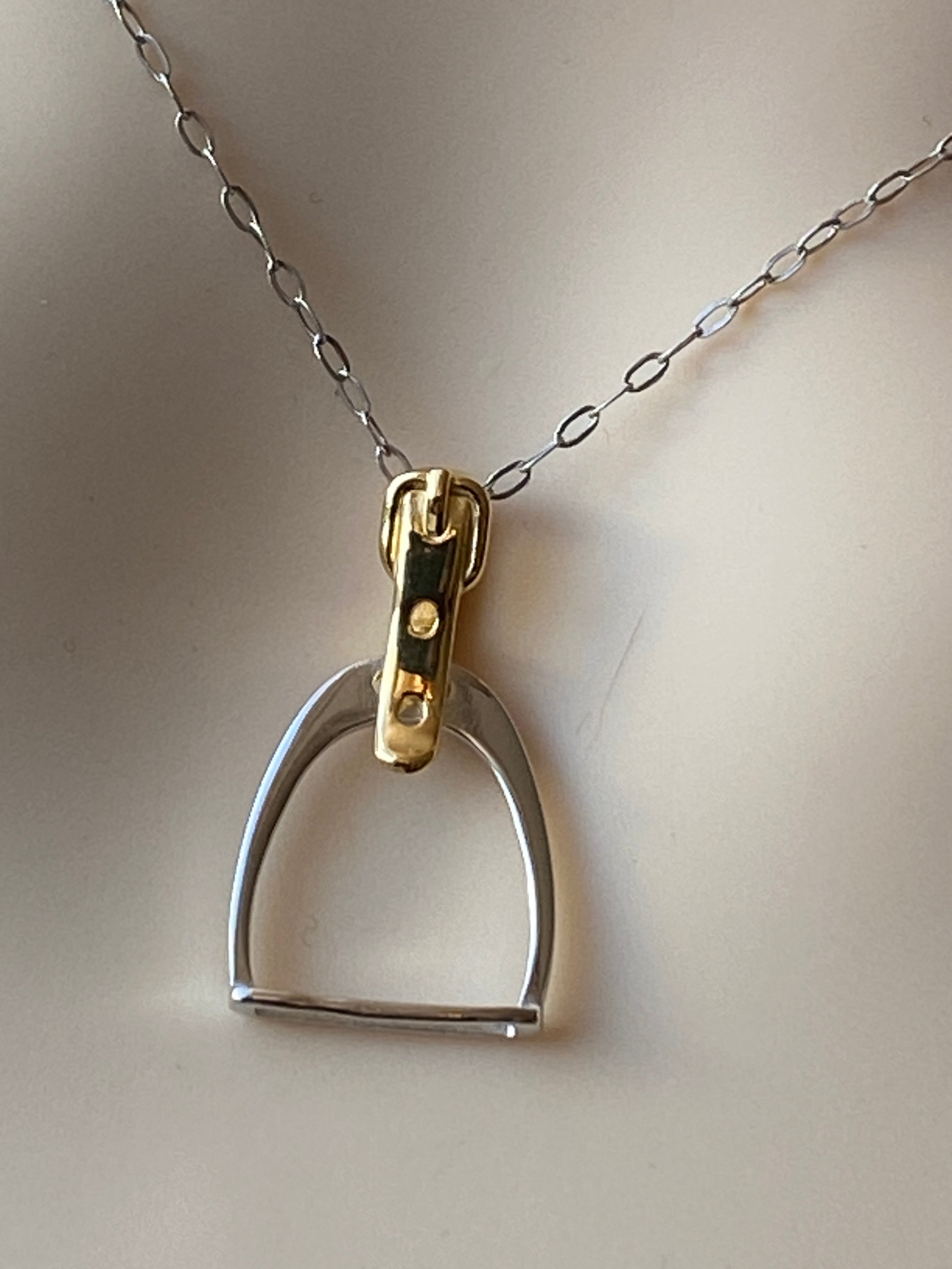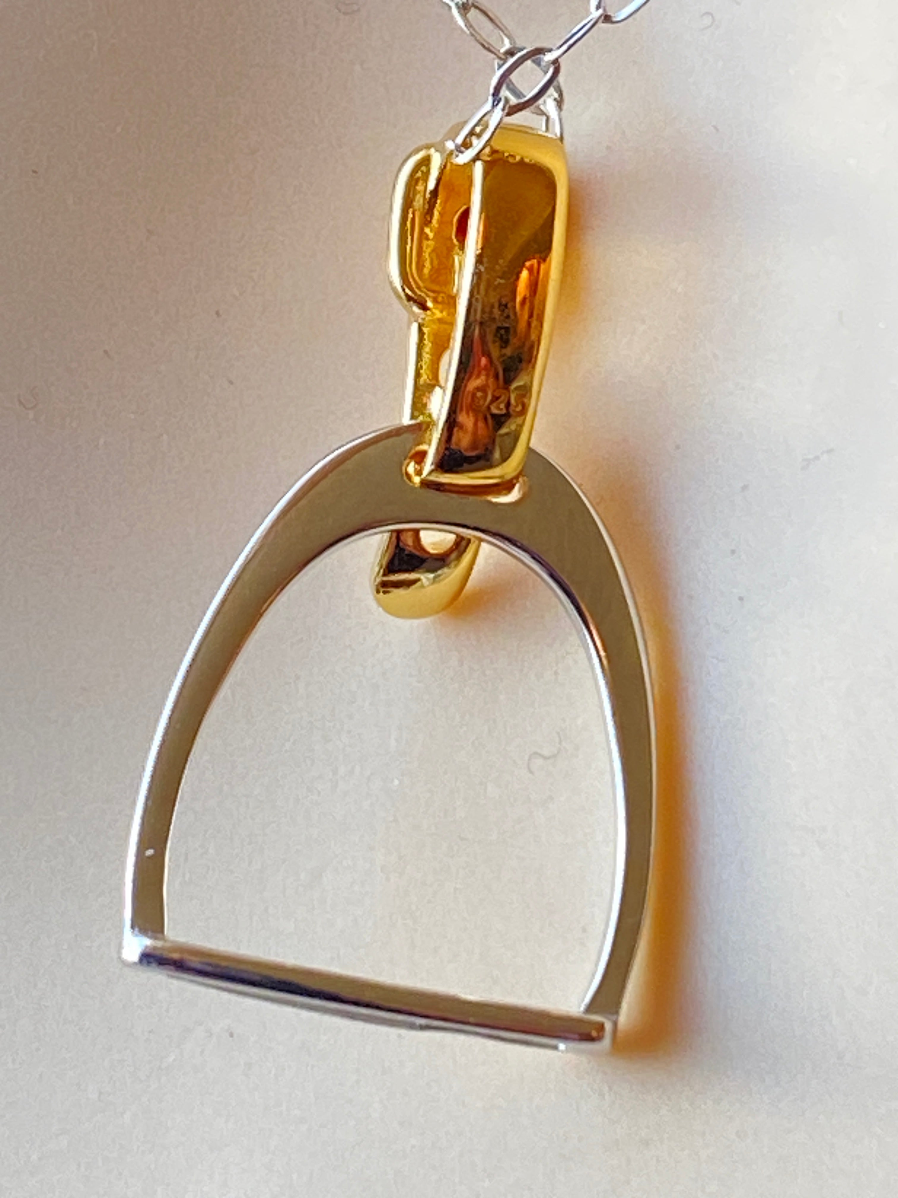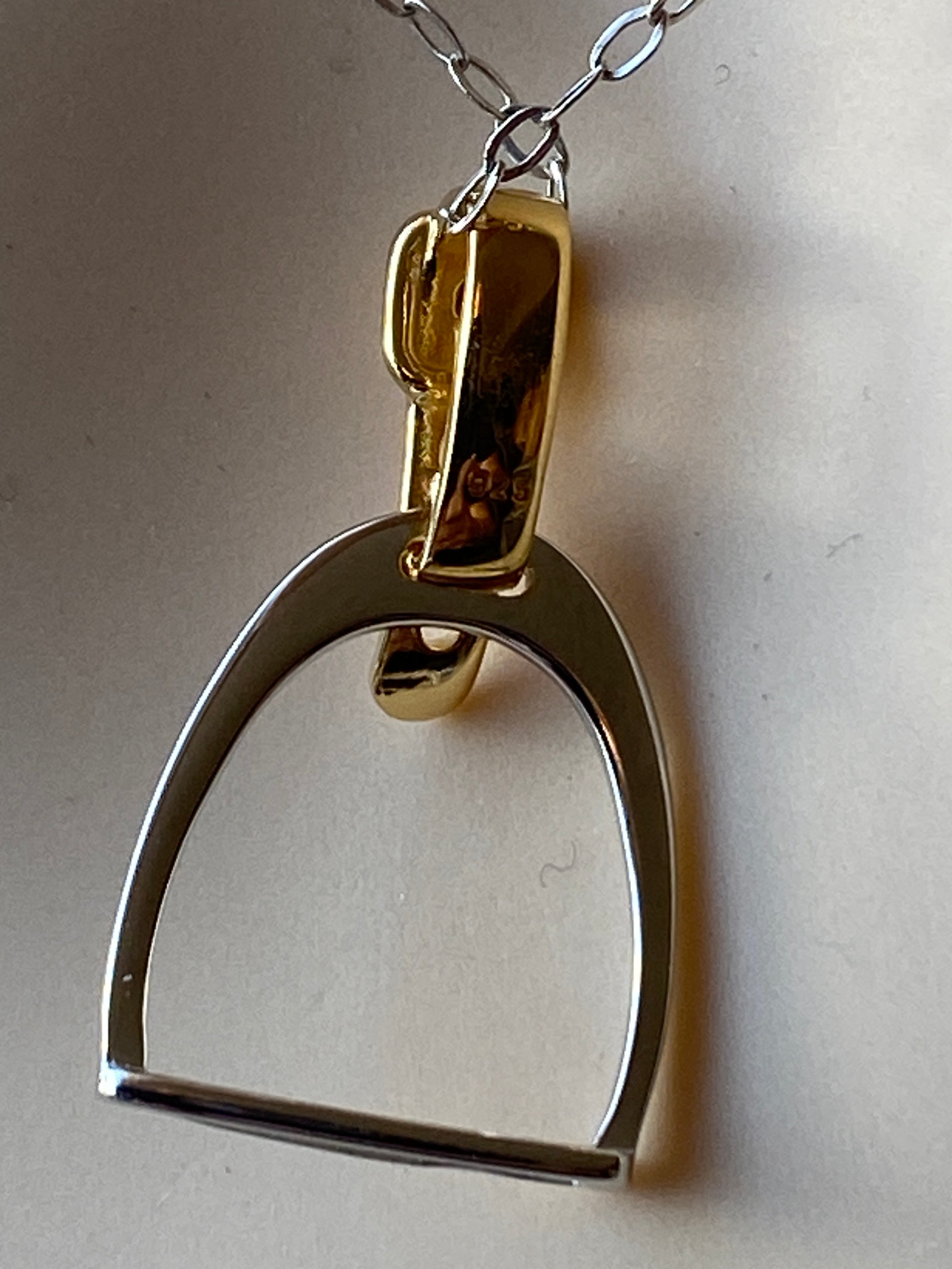 A stylish sterling silver Stirrup pendant with vermeil stirrup leather strap detail