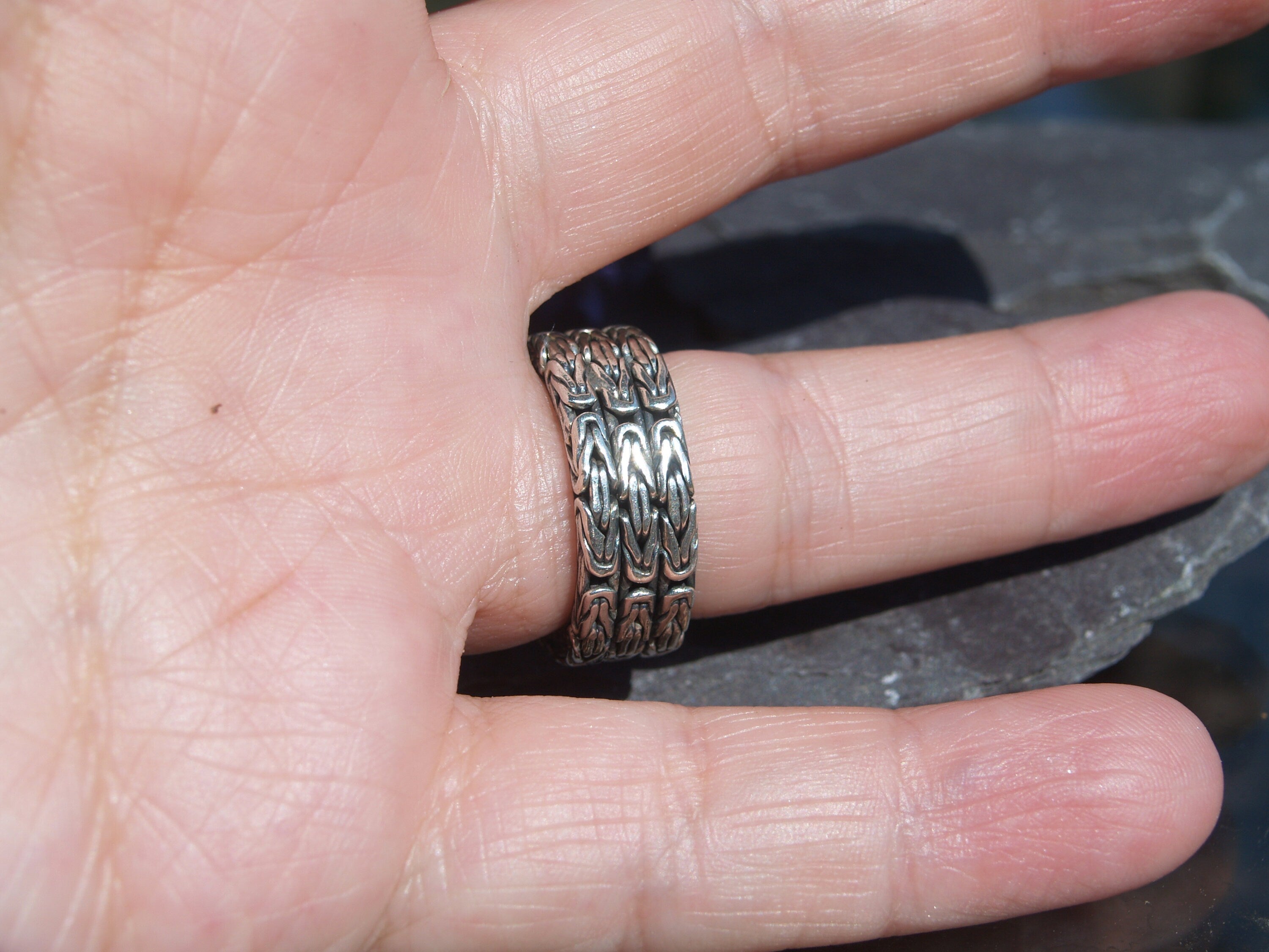 Three rows of byzantine link chain soldered together and lined. Well made.