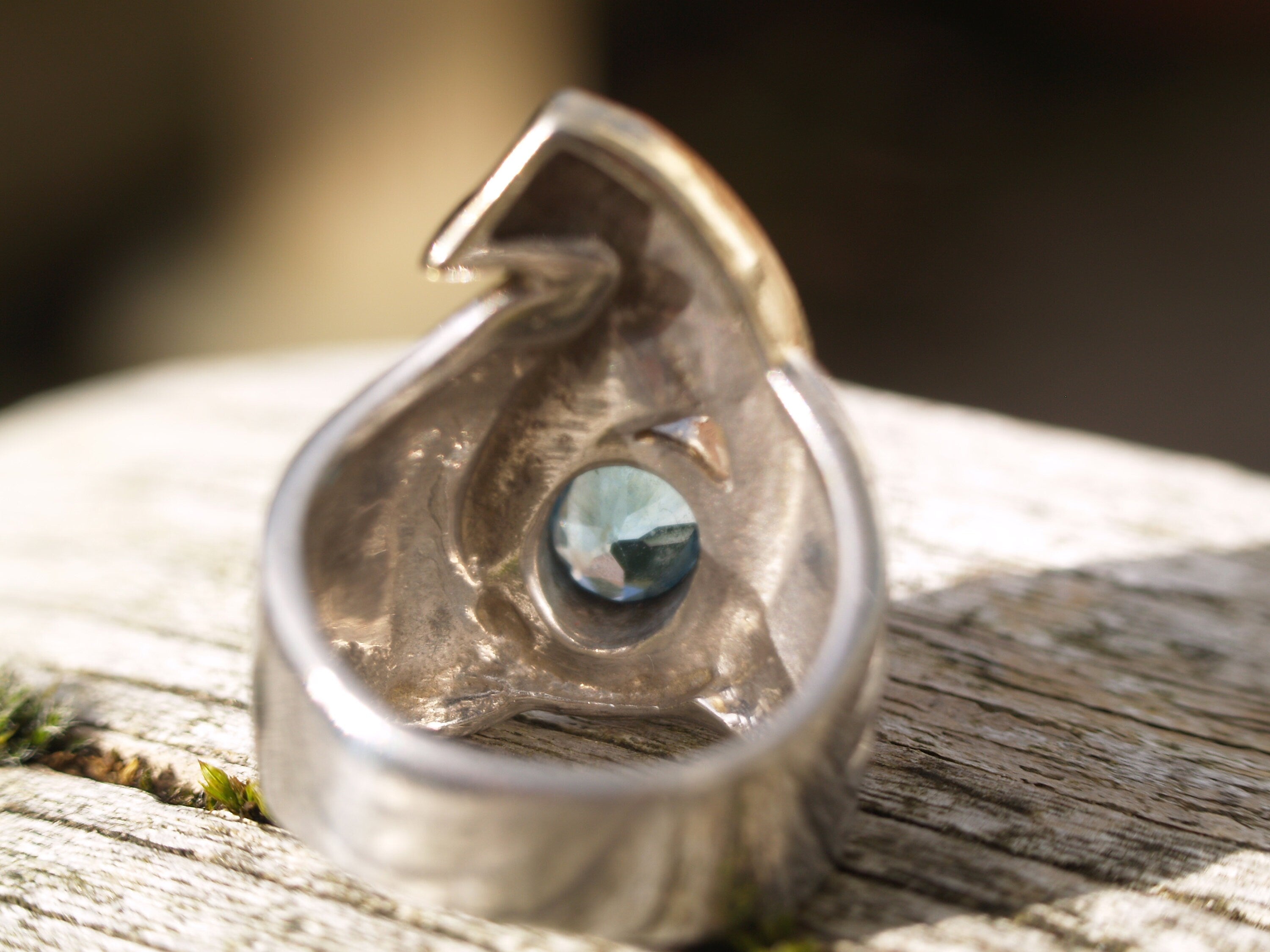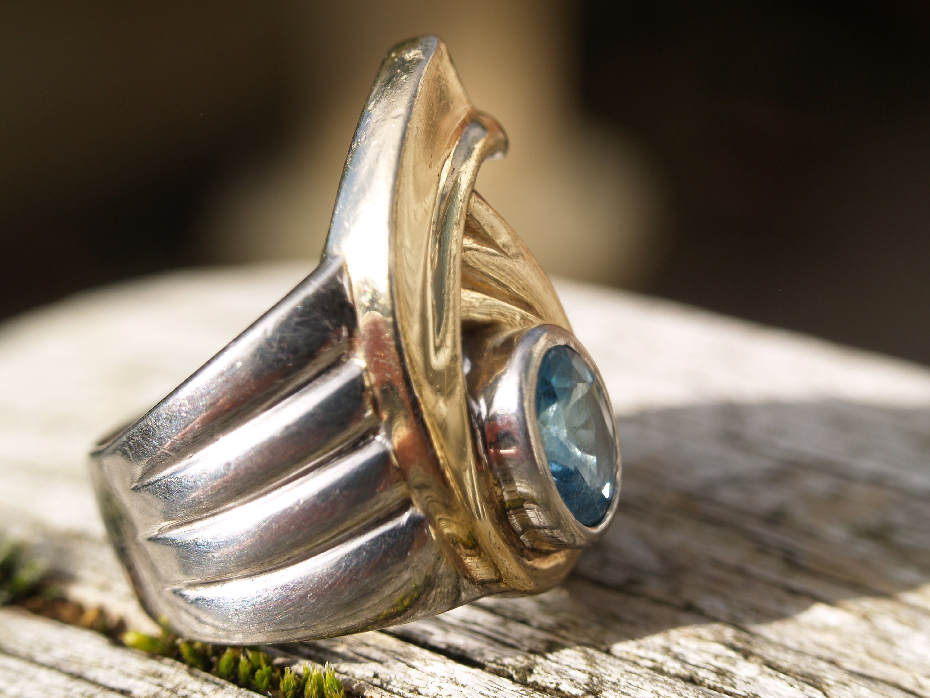 Modernist Sterling Silver & Gilt Blue Topaz Ring Size N 1/2 or 7 (US) Stamped 925