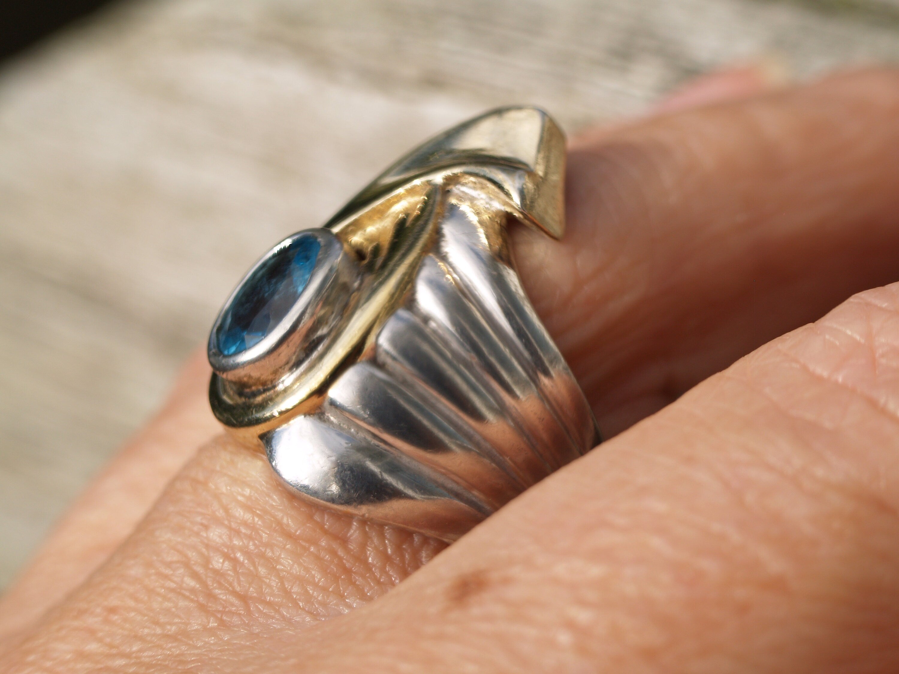 This is a true statement ring! Solid Sterling Silver with a gold wash accent set with Blue Topaz. A modernist design that is unique and eye catching.Stamped 925...