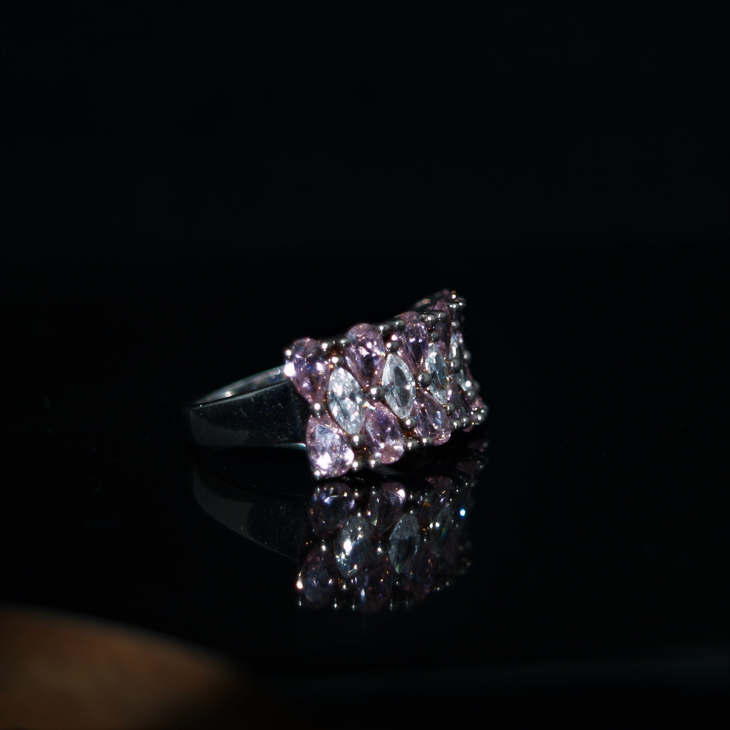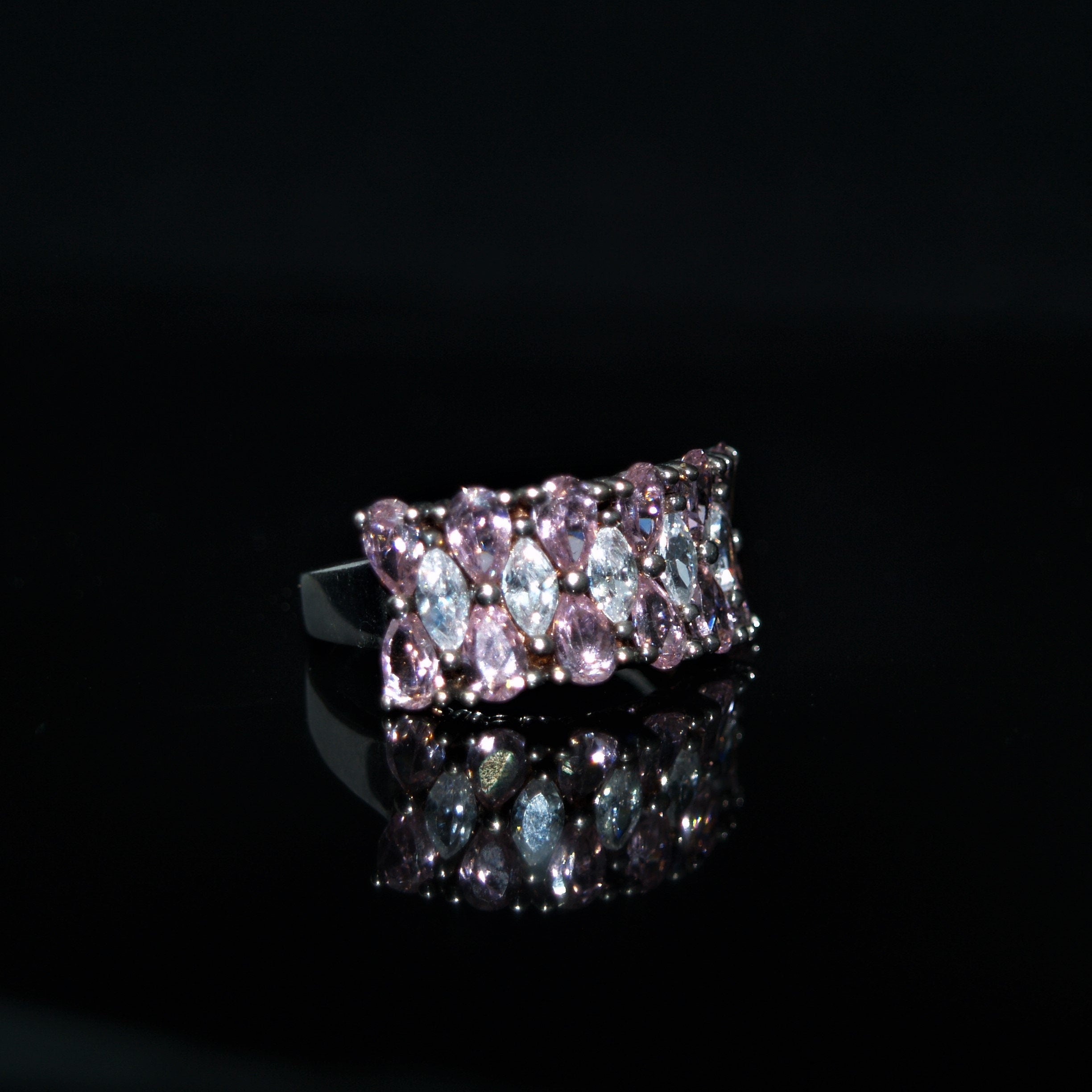 A stunning statement ring set with pink and 'white' pear cut and marquis cut Cubic Zirconia stones.
