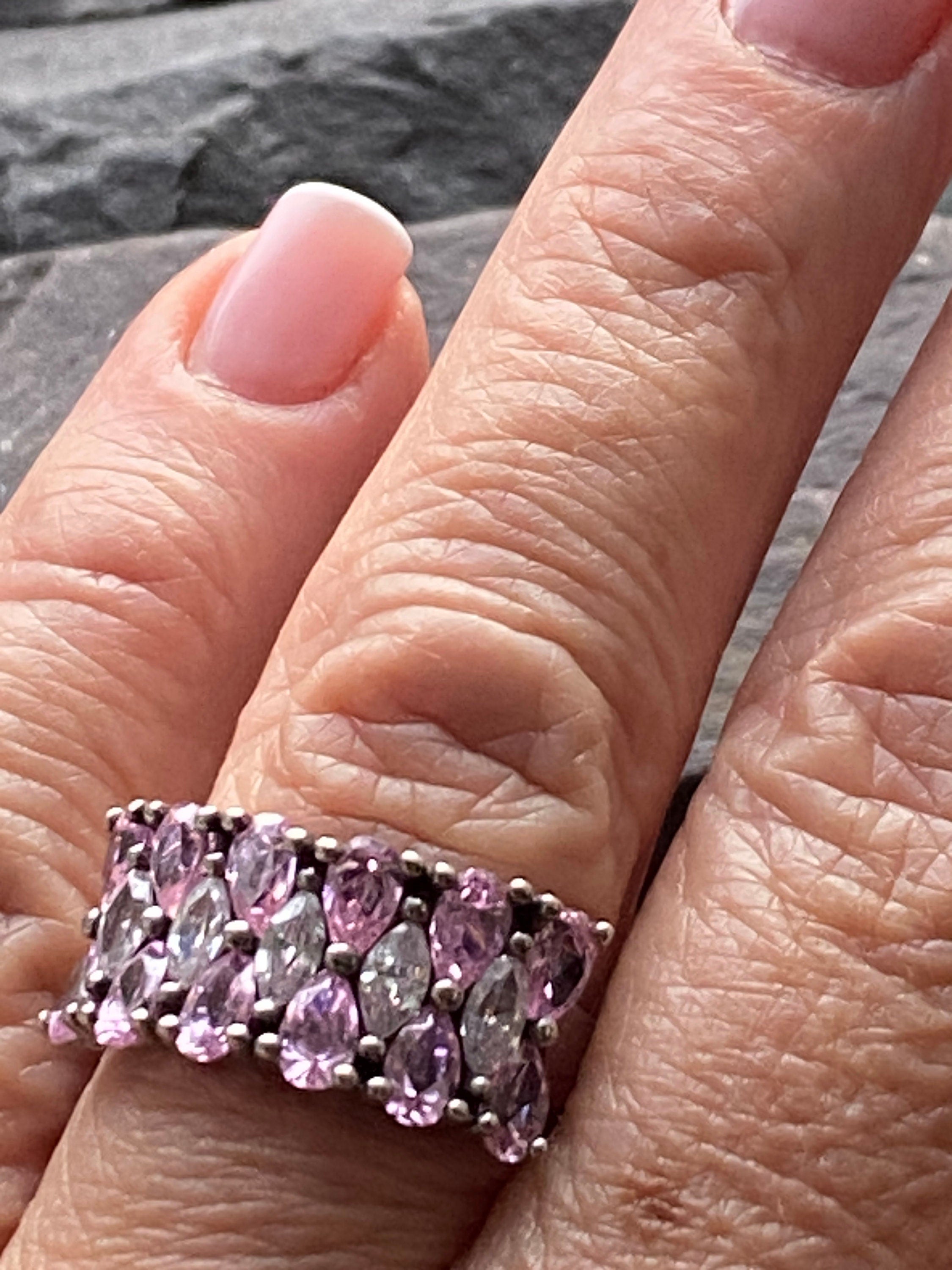 A stunning statement ring set with pink and 'white' pear cut and marquis cut Cubic Zirconia stones. Stamped 925 and CZ In lovely condition with no damage. Looks...
