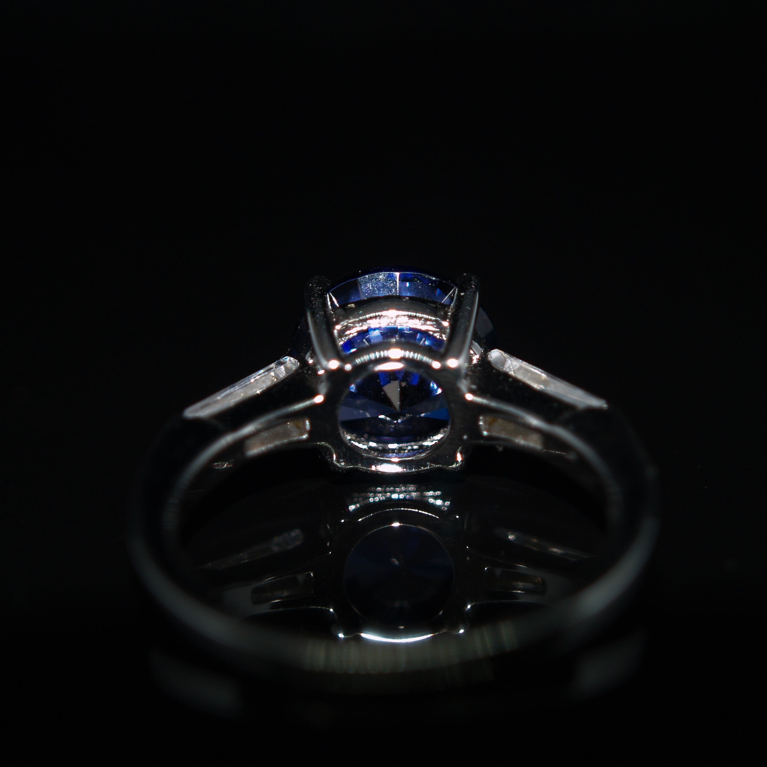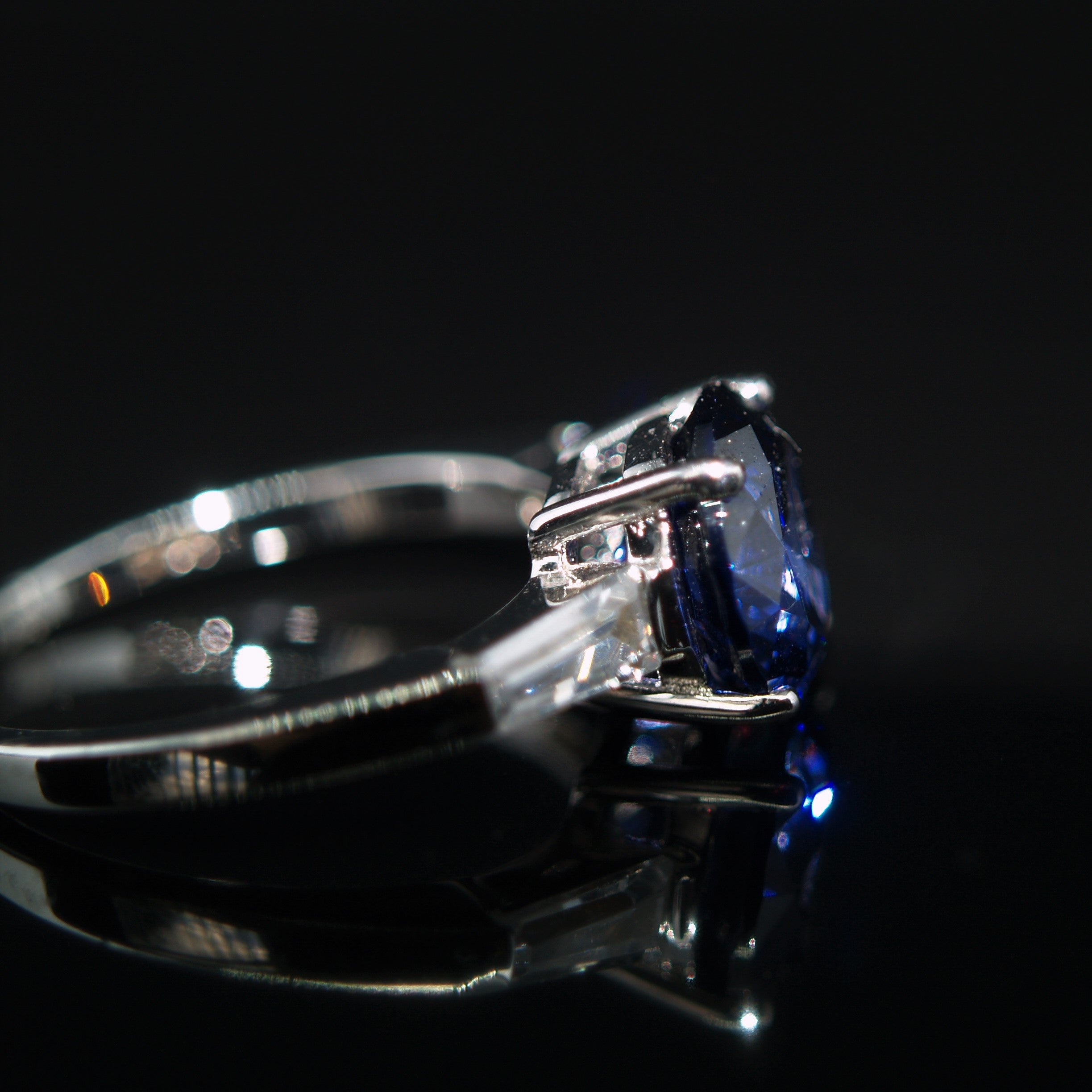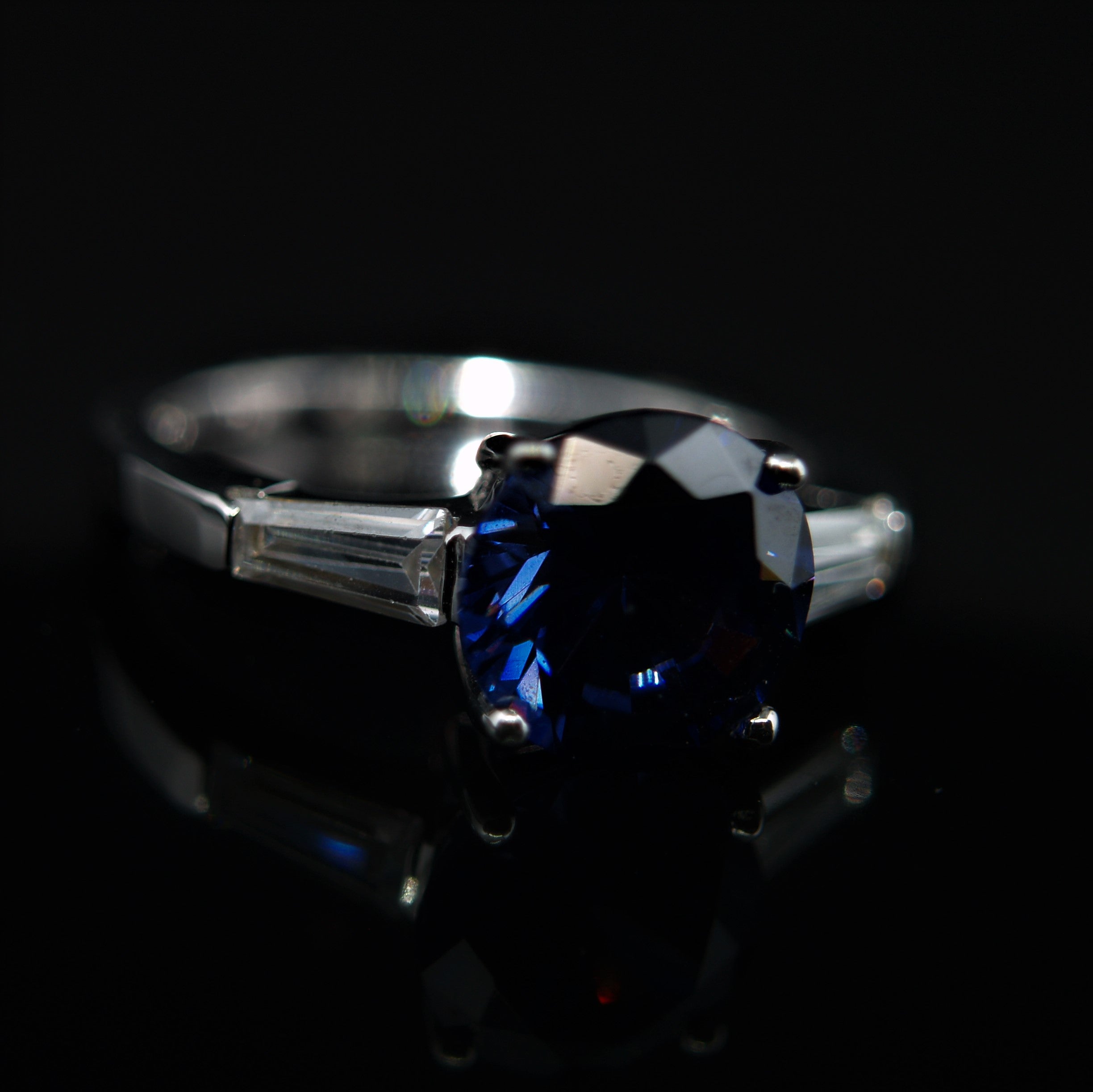 A classic engagement design set with a central ethical gemstone Tanzanite blue Cubic Zirconia flanked by two baguette cut Cubic Zirconia shoulders. .925 sterling silver. New item. Finger size O or 7 1/4 US.