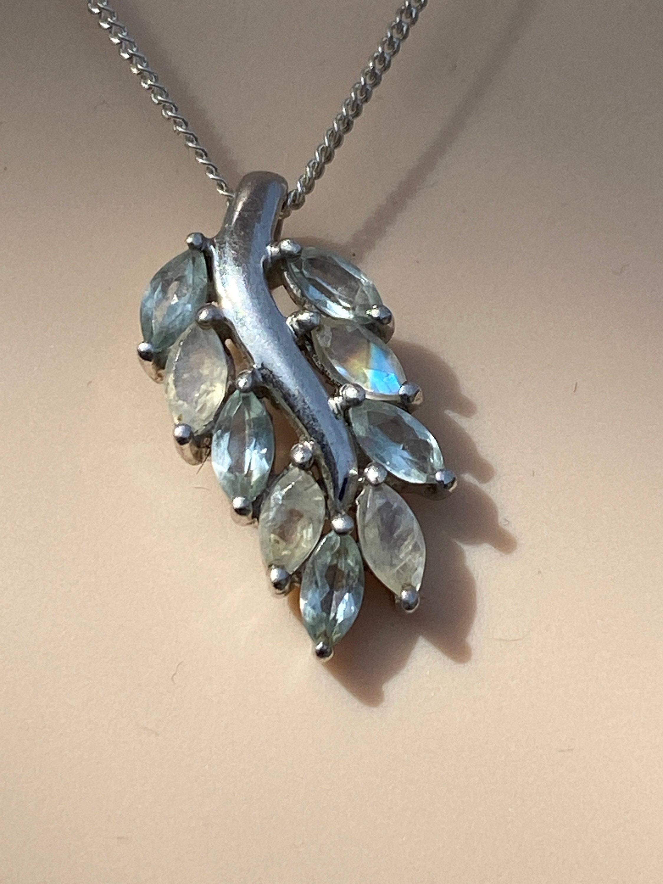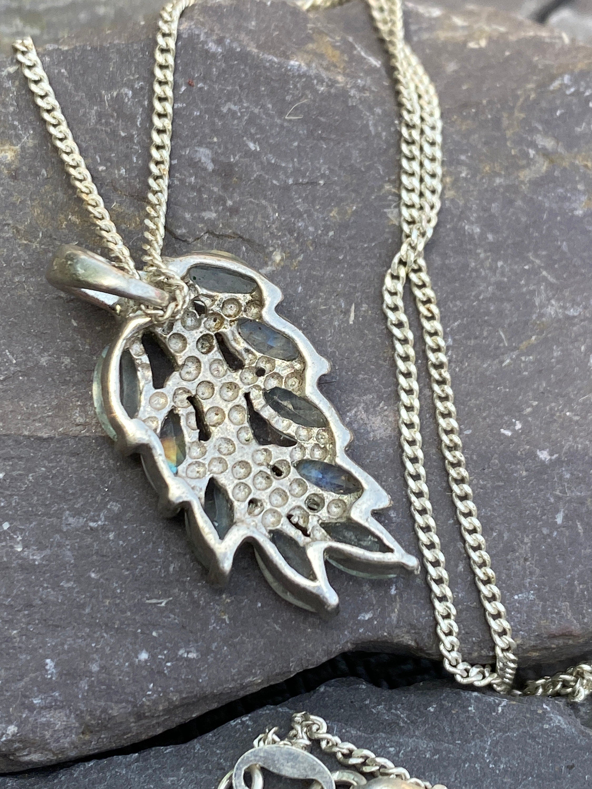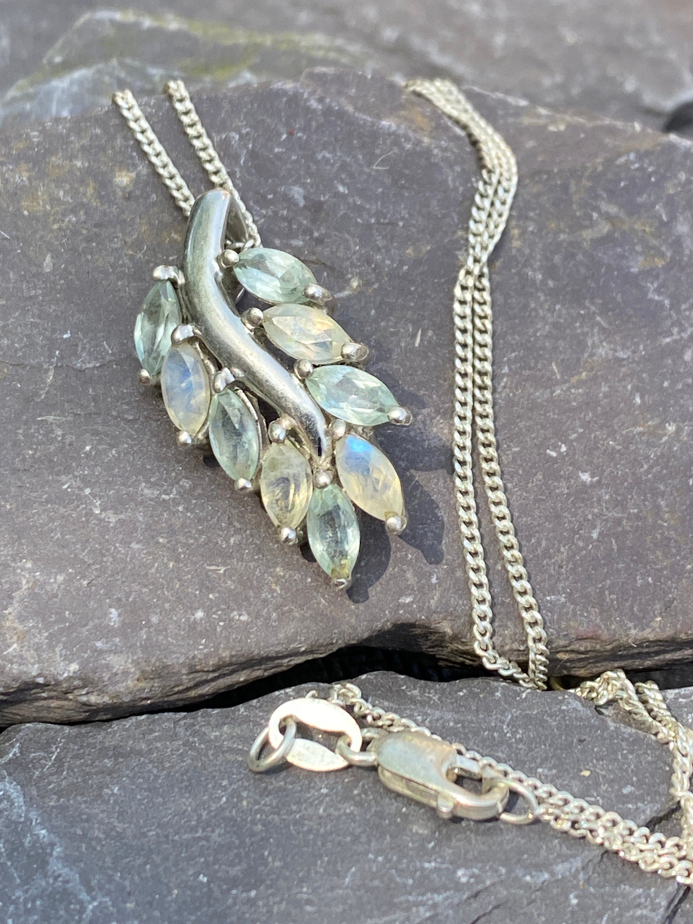 A pretty sterling silver leaf set with pale iridescent Labradorite stones sometimes referred to as rainbow moonstone