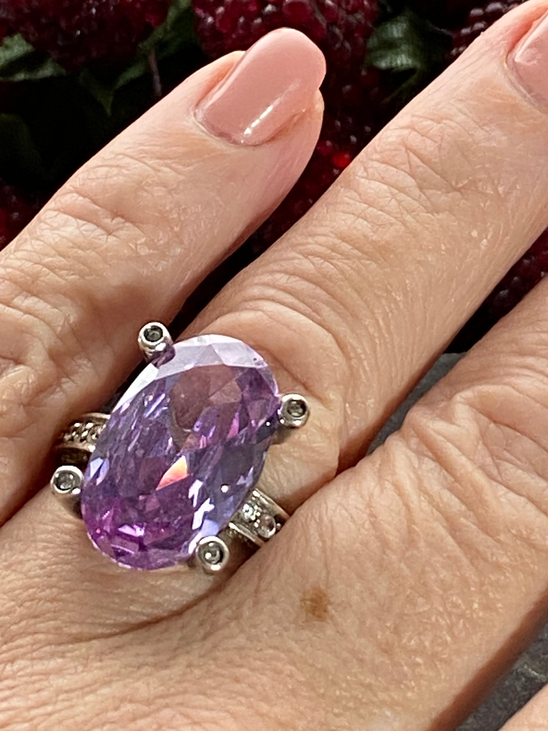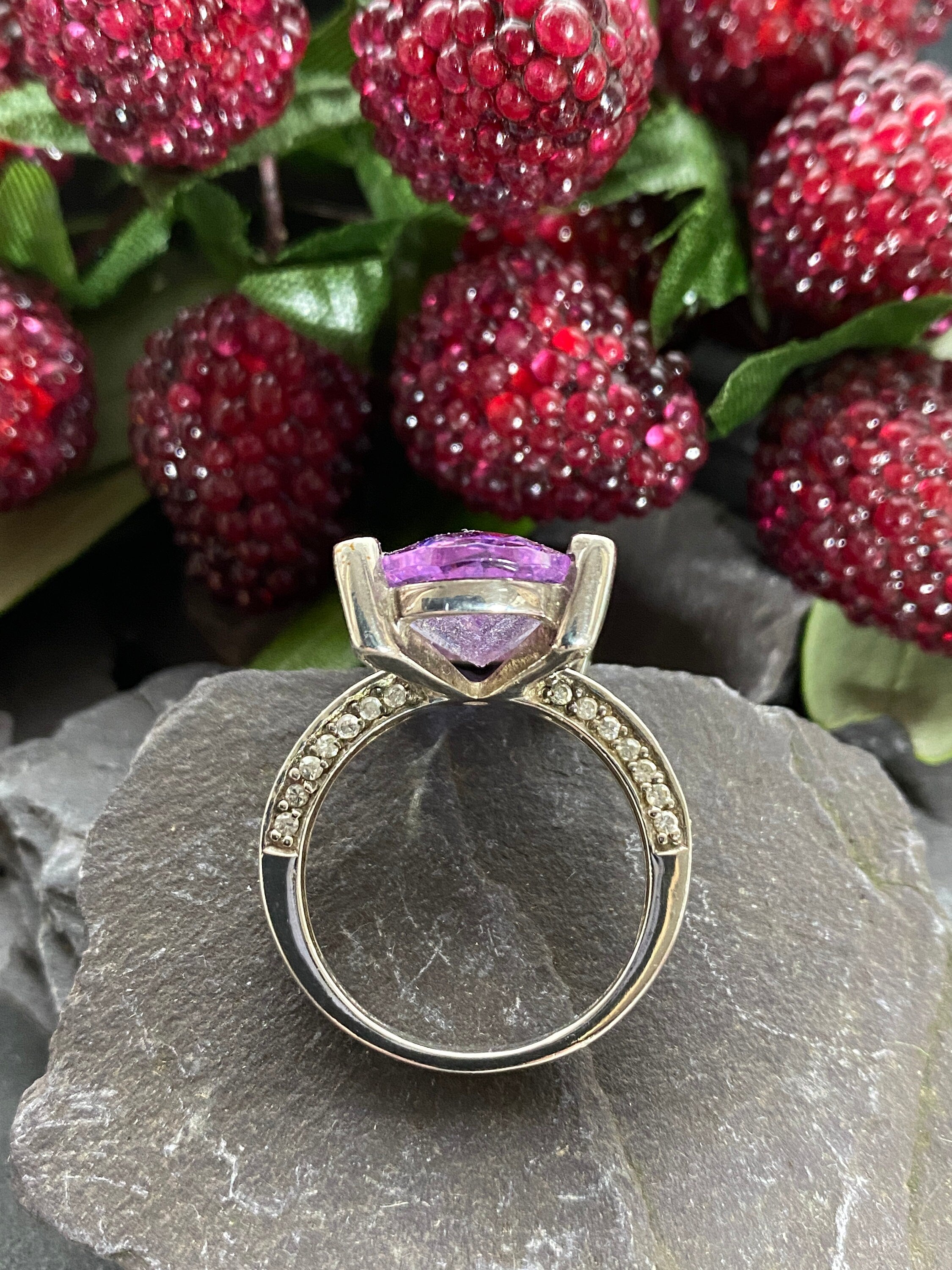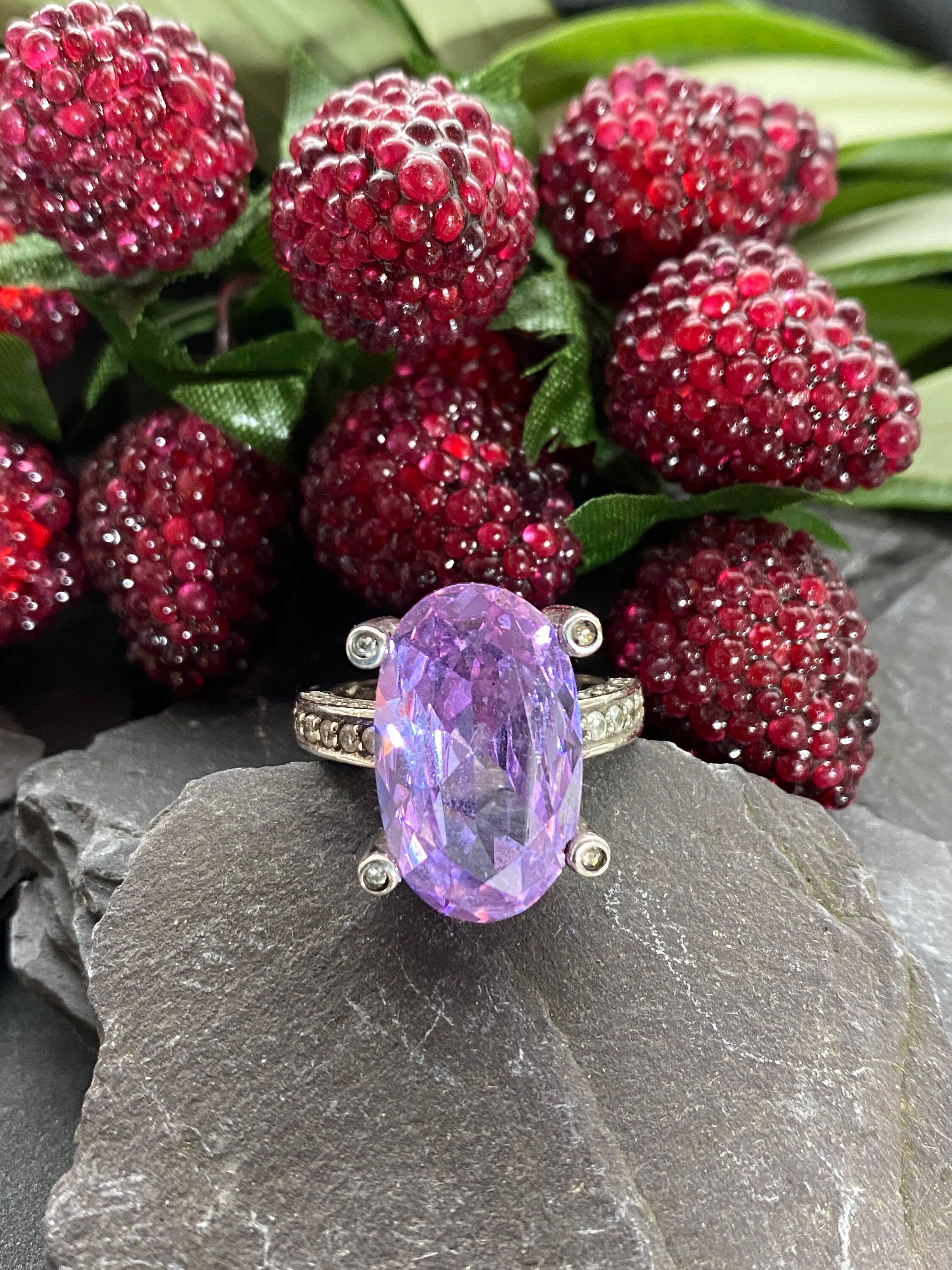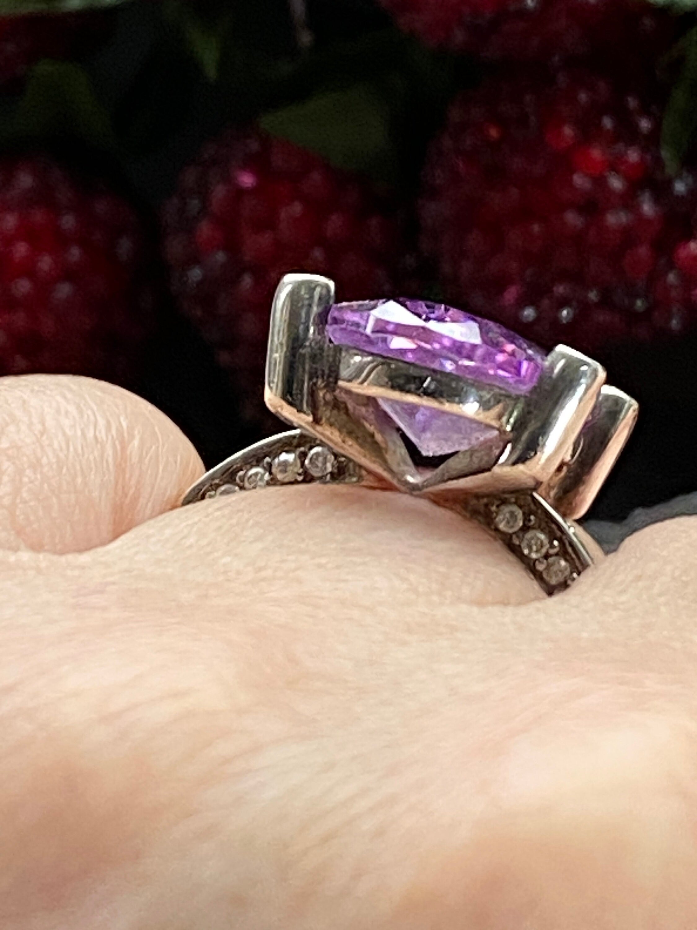 The centre lilac stone has four claws tipped with Cubic Zirconia and the stones follow around the setting and down the shoulders