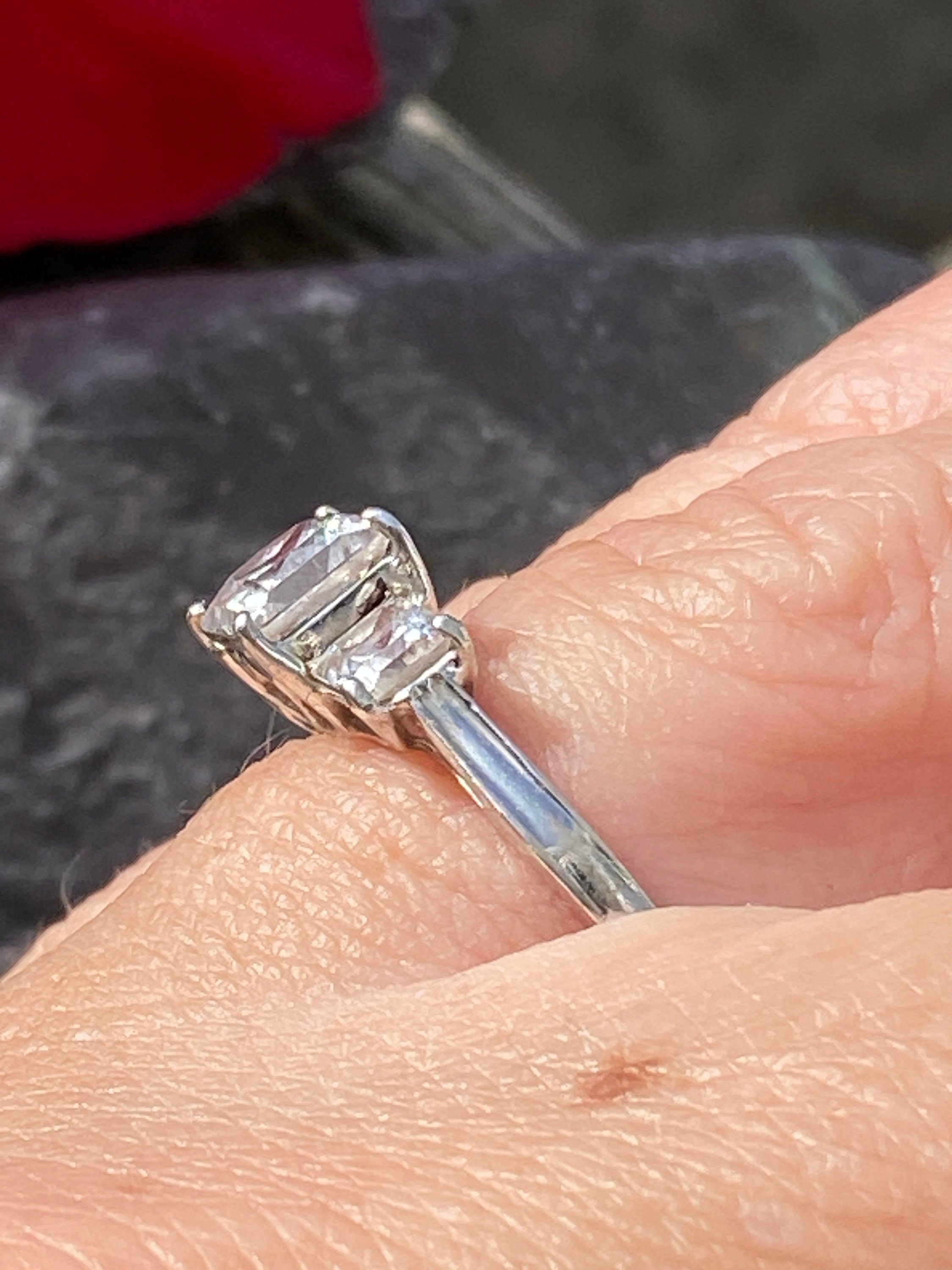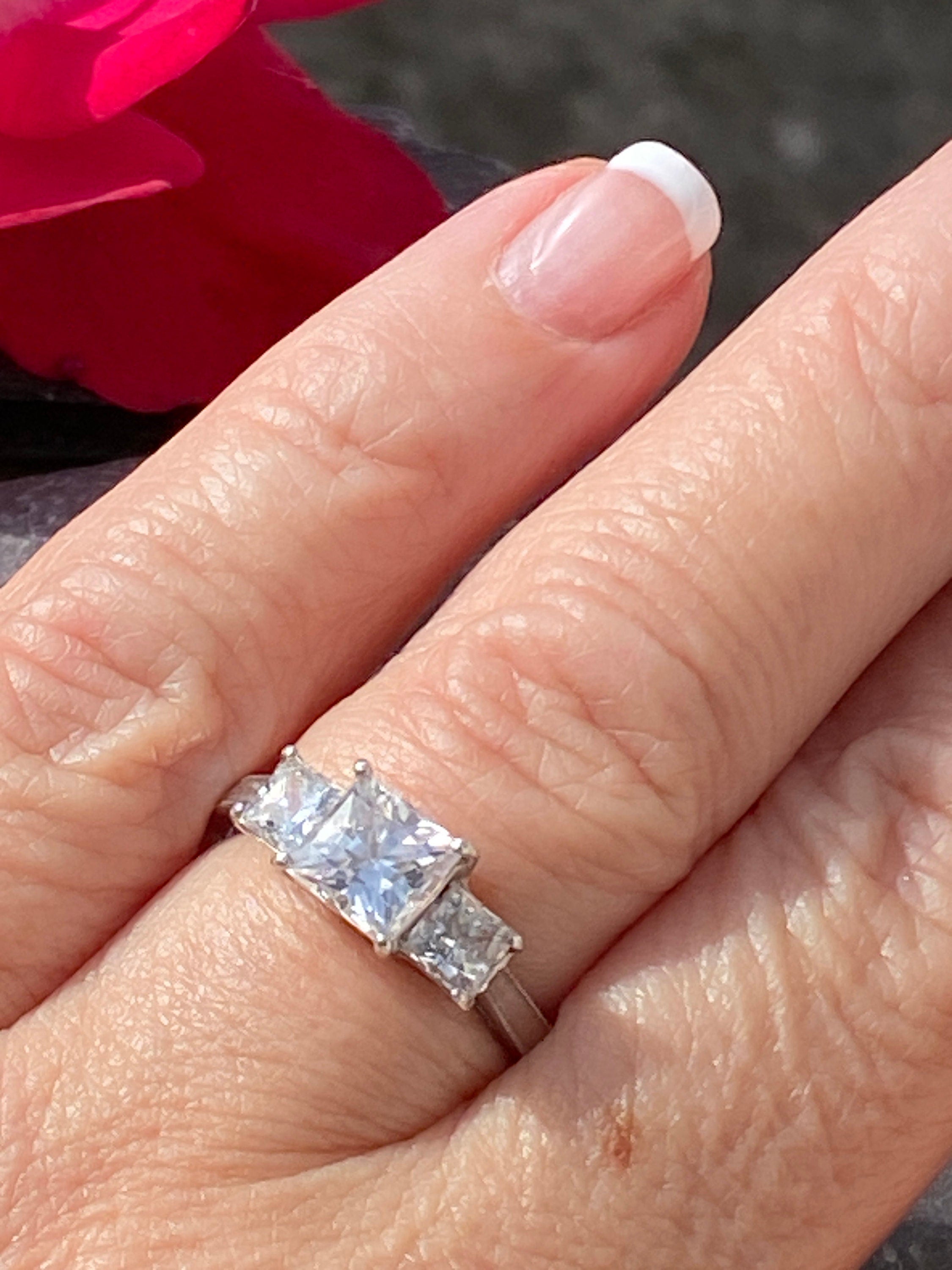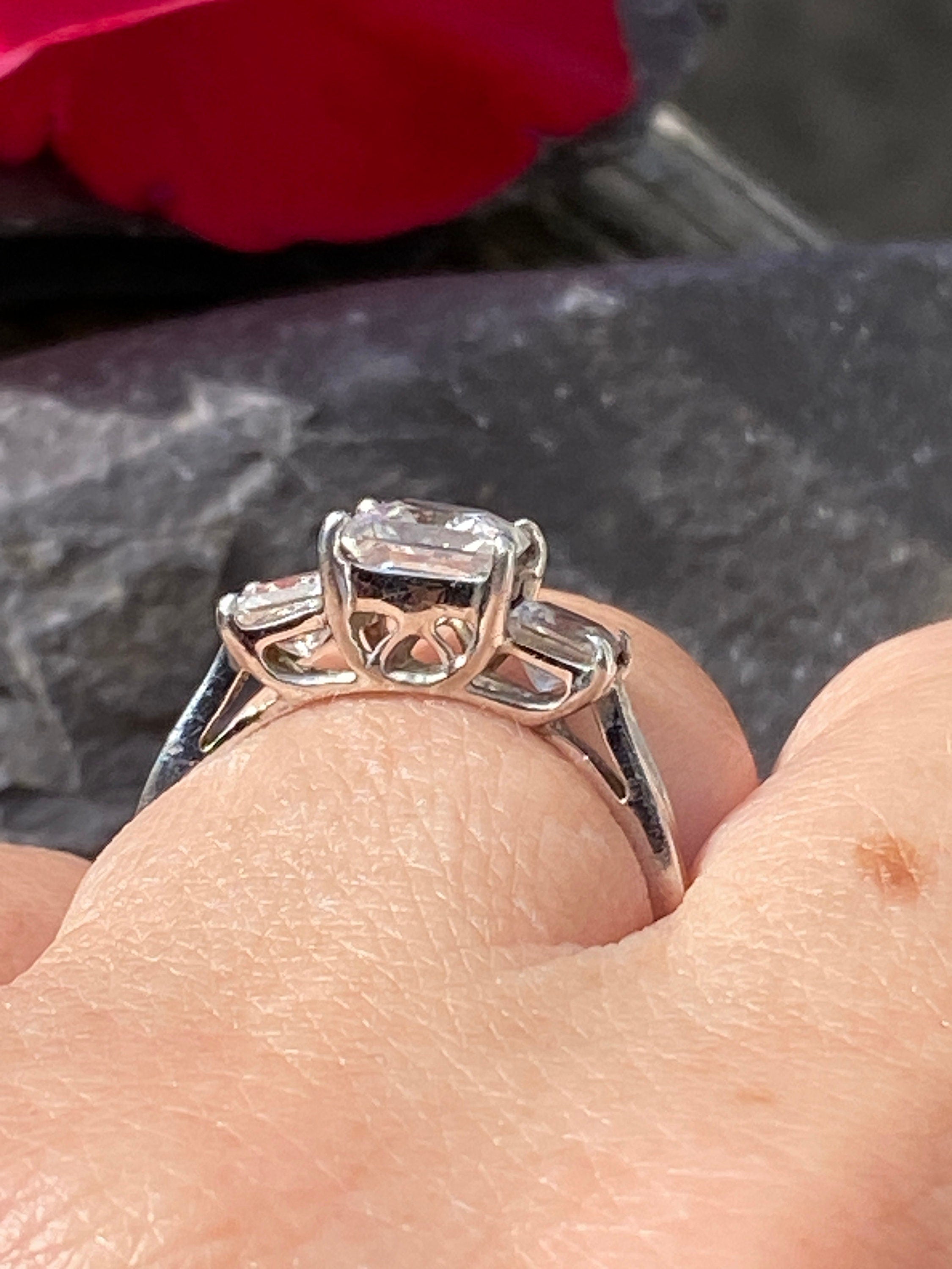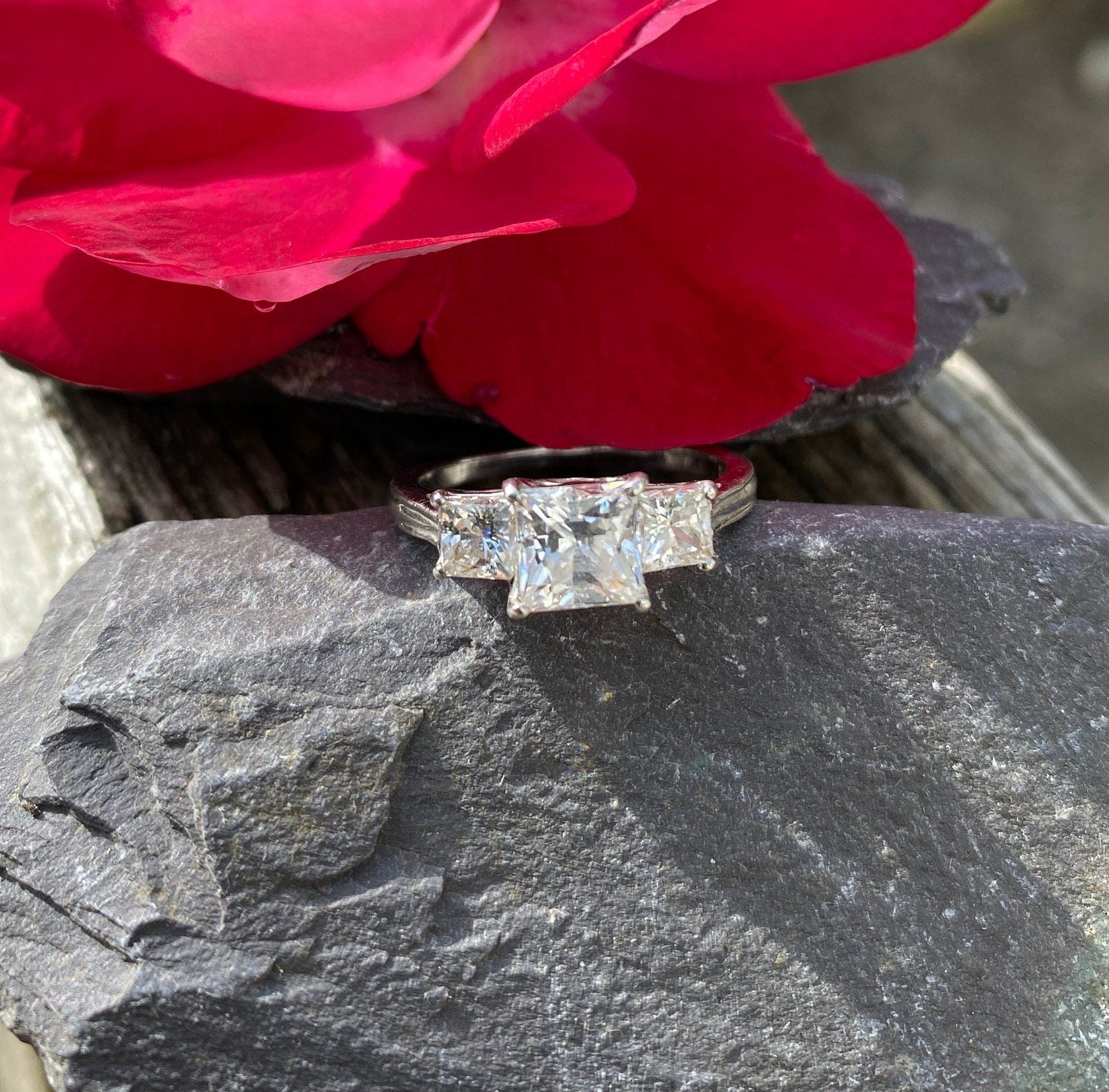 A traditional setting to this three stone trilogy ring in sterling silver. Set with three princess cut Cubic Zirconia ethical gemstones