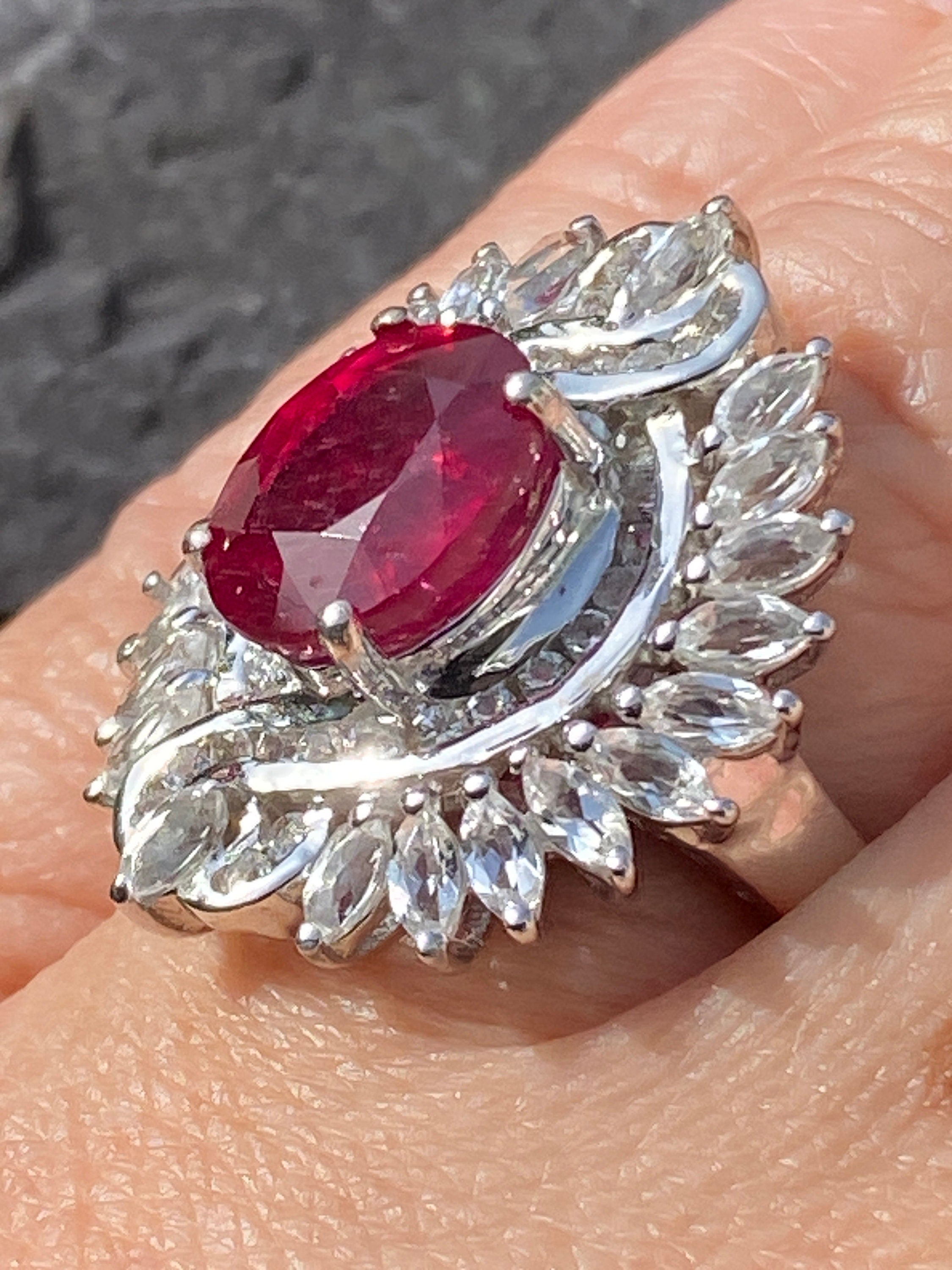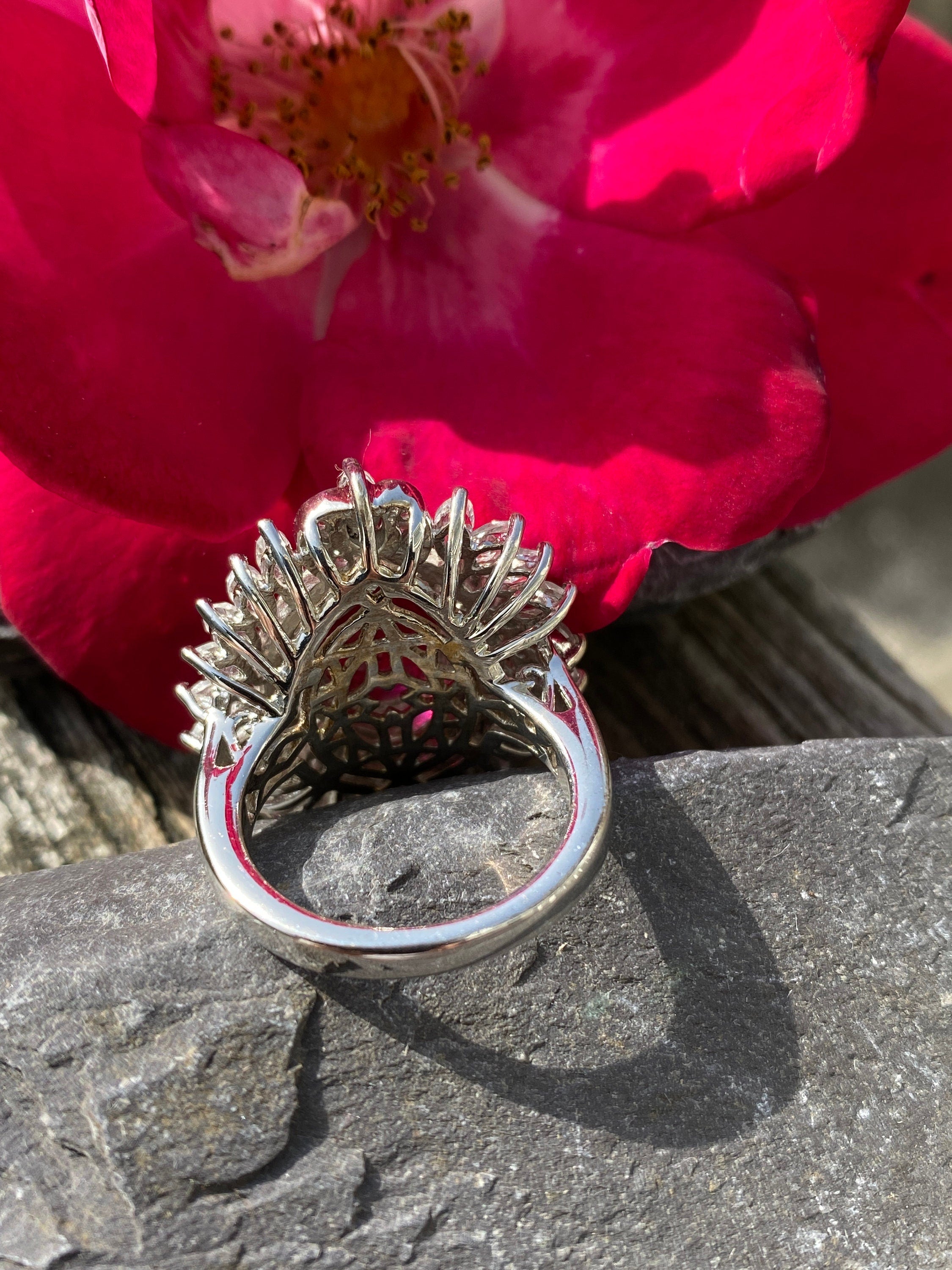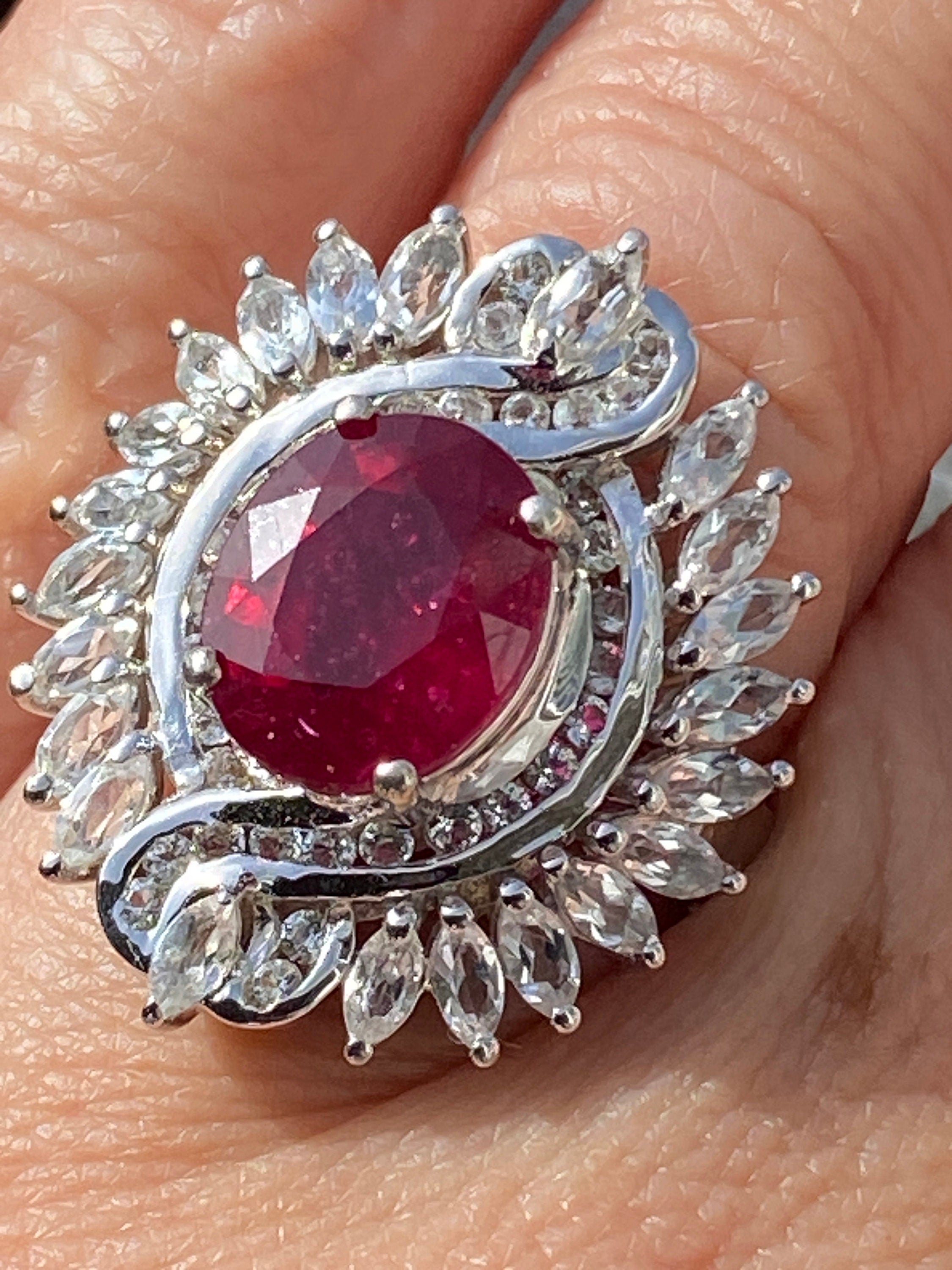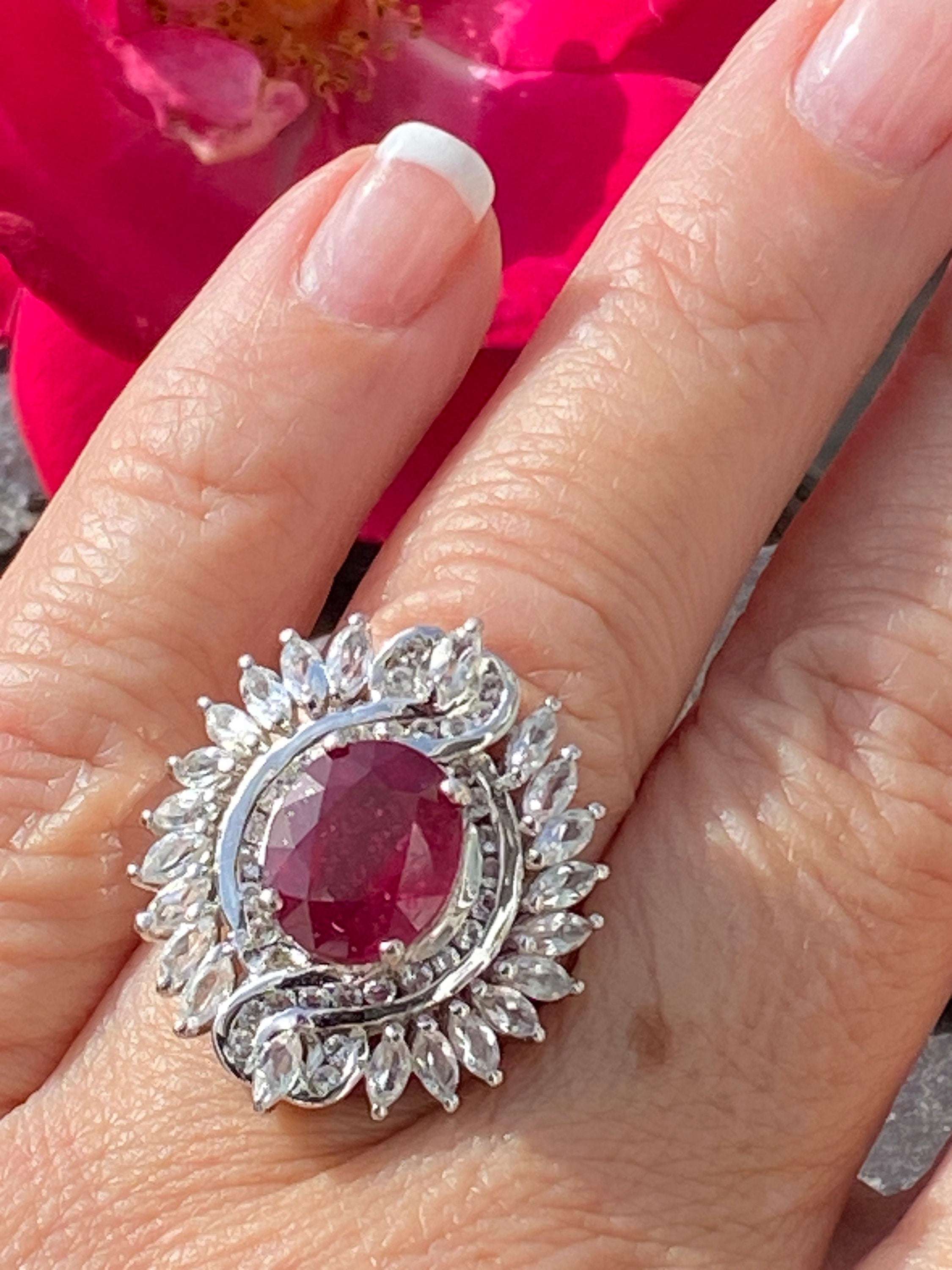 A stunning statement or cocktail ring in sterling silver set with a created Ruby surrounded by sparkling Cubic Zirconia ethical gemstones