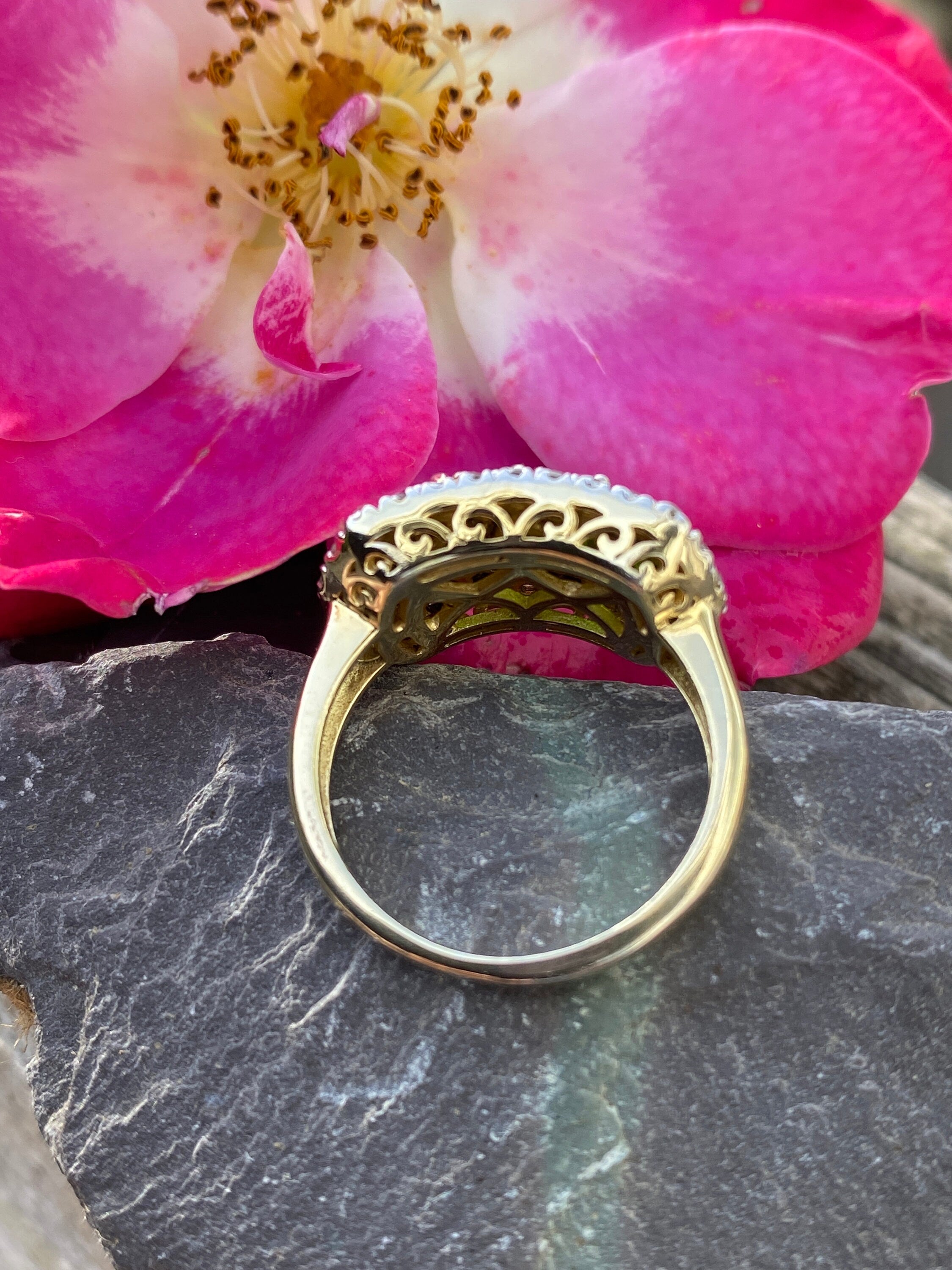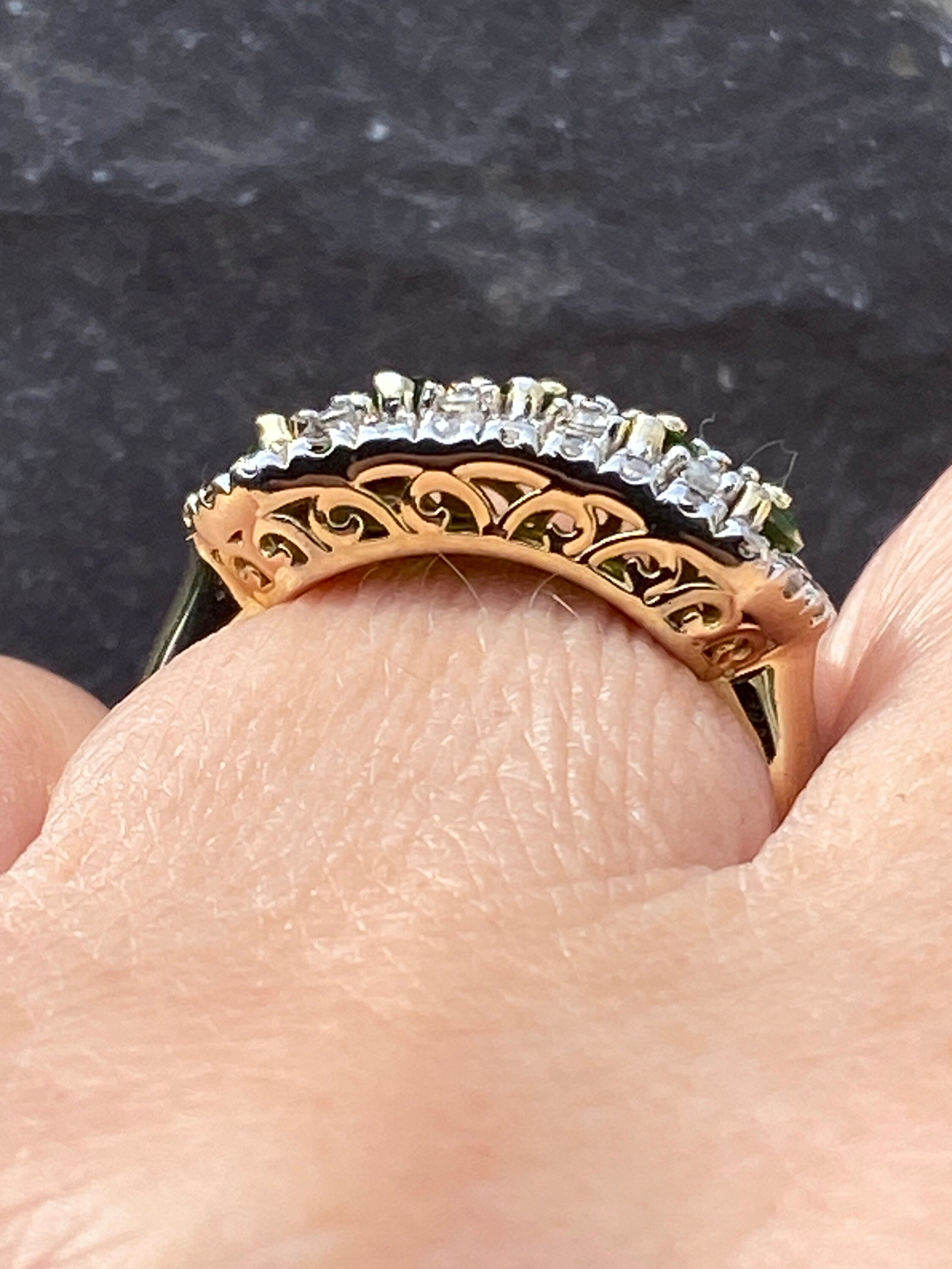 A very smart sterling silver ring with vermeil shank and ornate gallery set with five marquis cut green Cubic zirconia within a round brilliant Cubic Zirconia border.