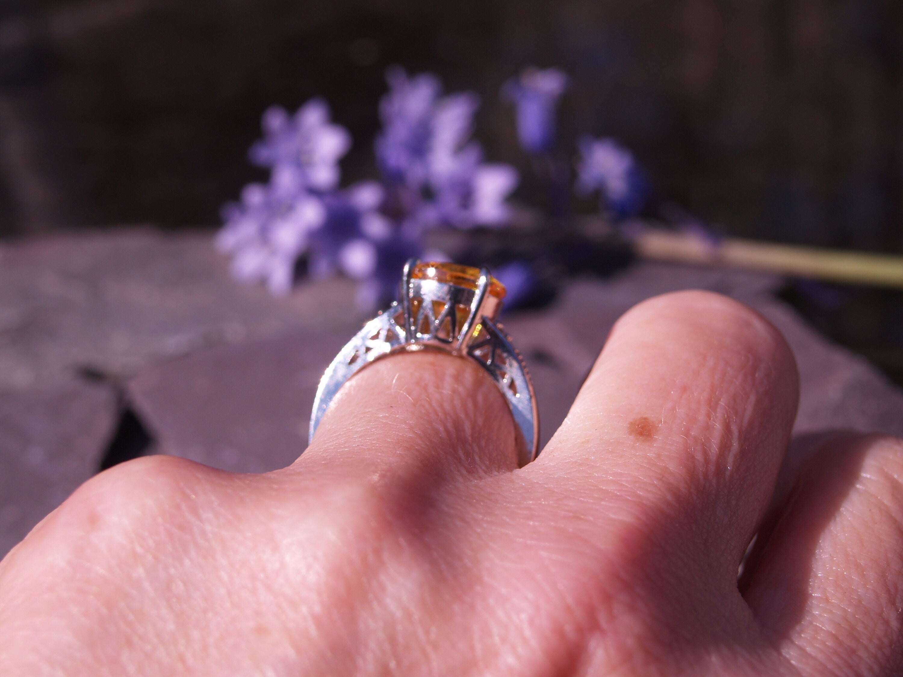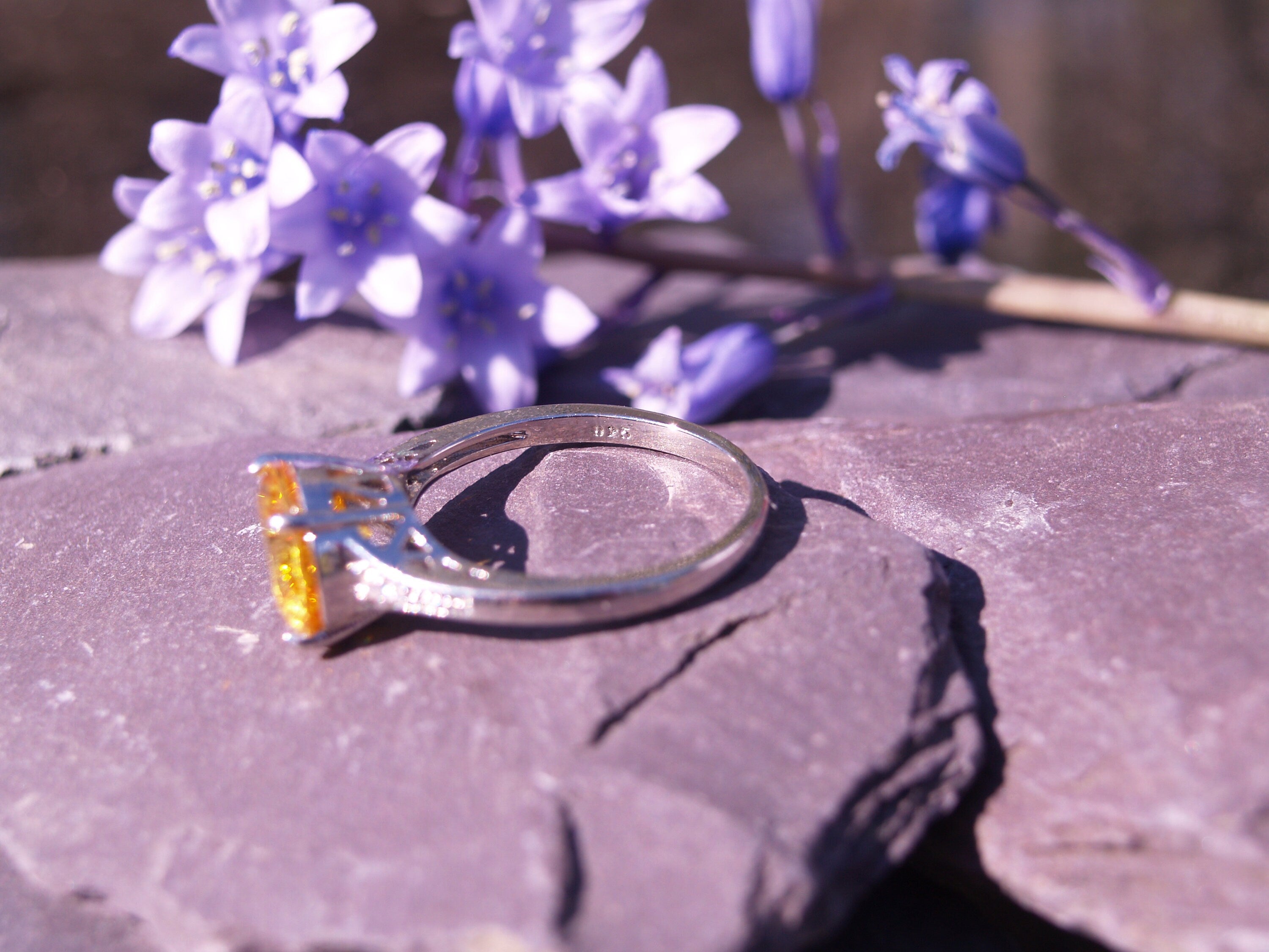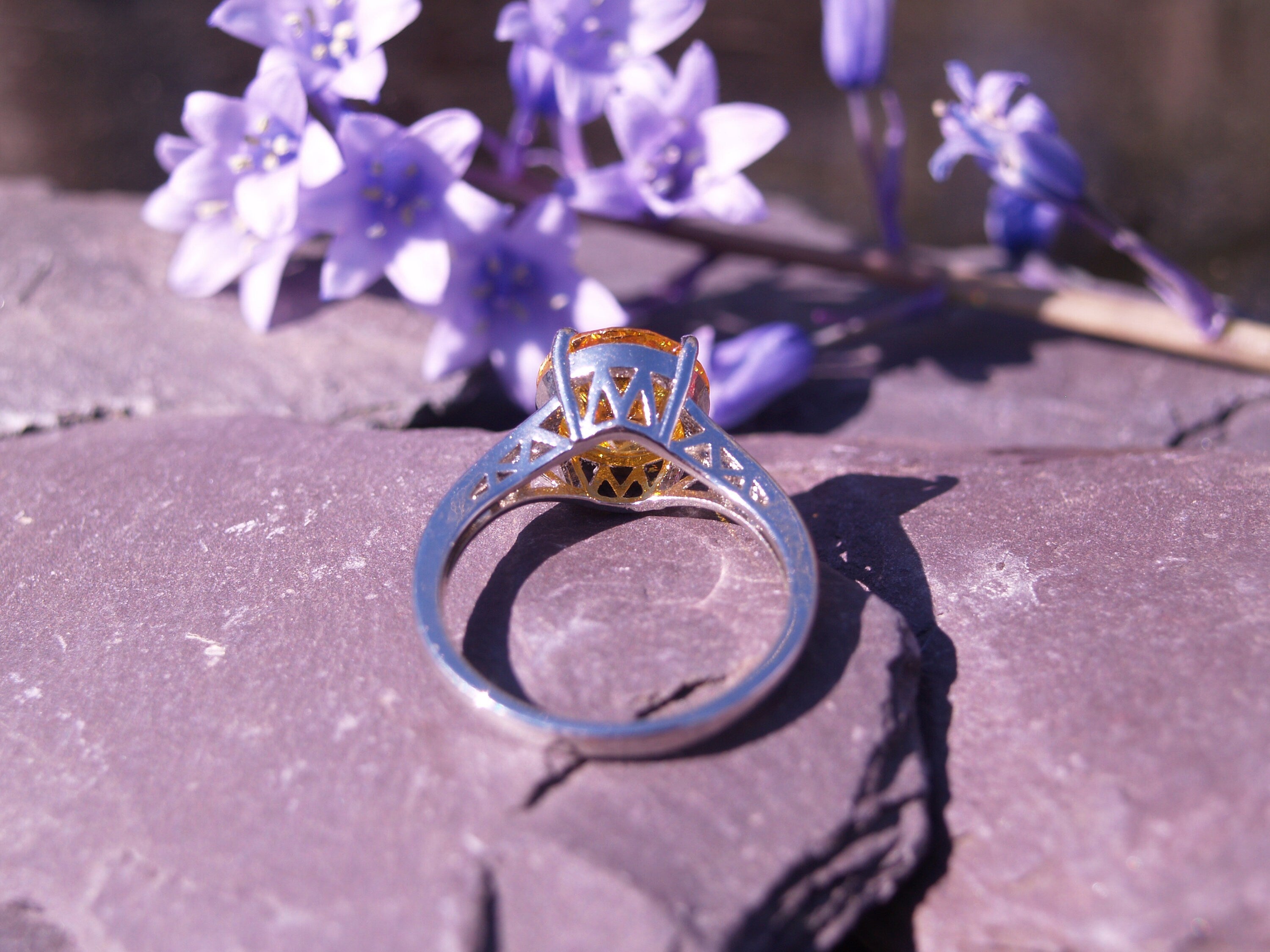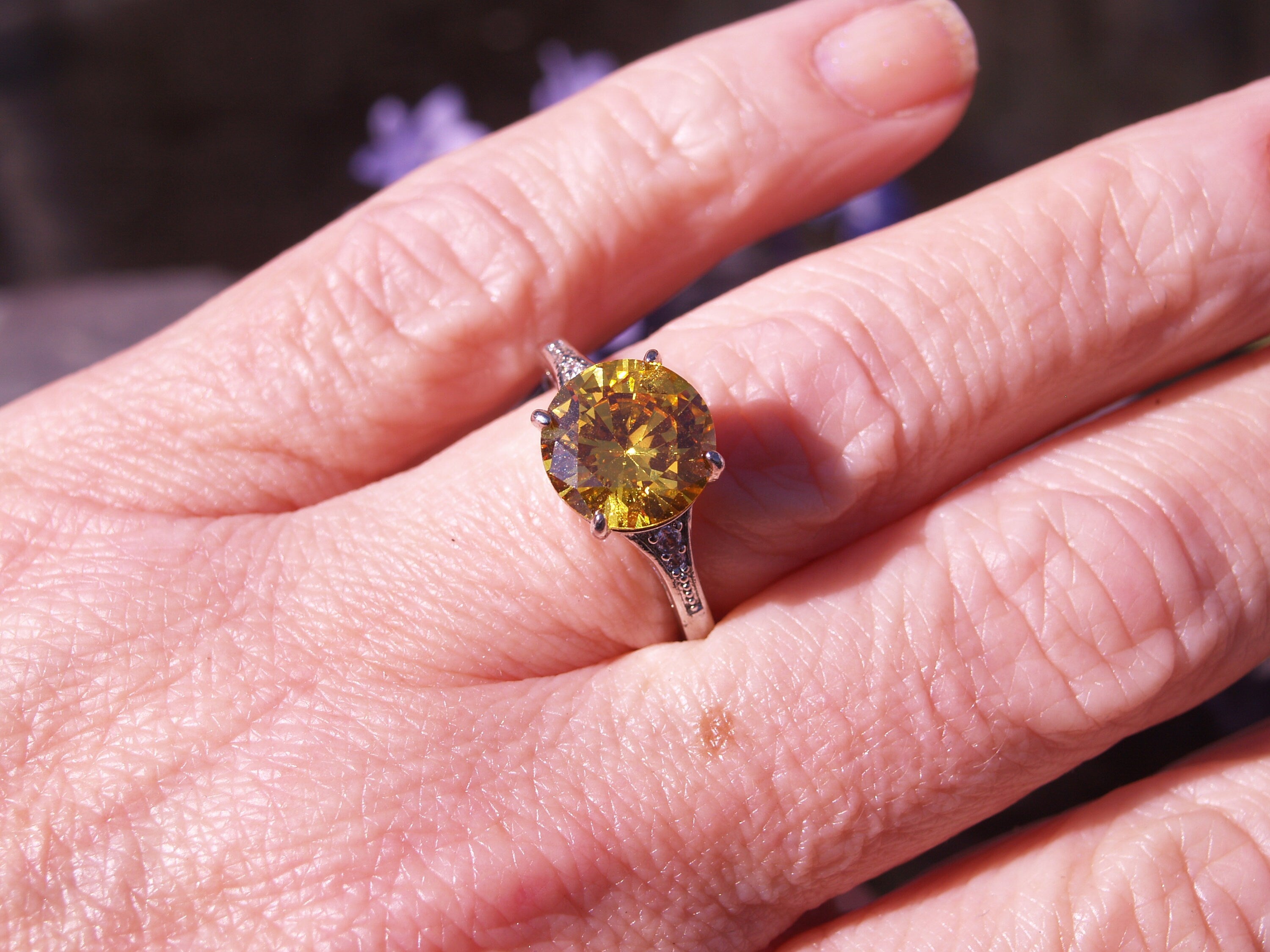 A super sparkly sterling silver ring set with a large round brilliant yellow Cubic Zirconia with two further 'white' CZ to each shoulder.