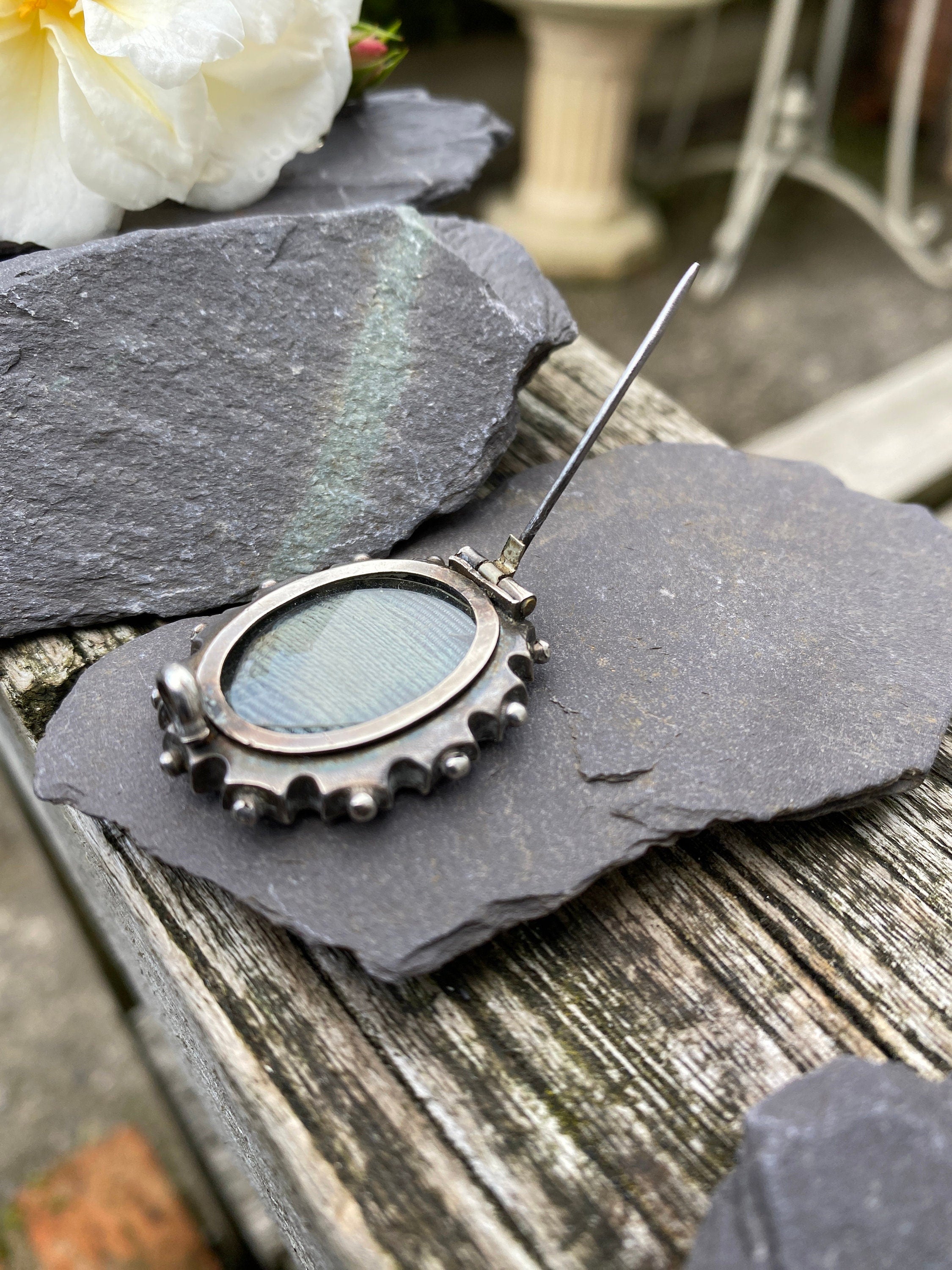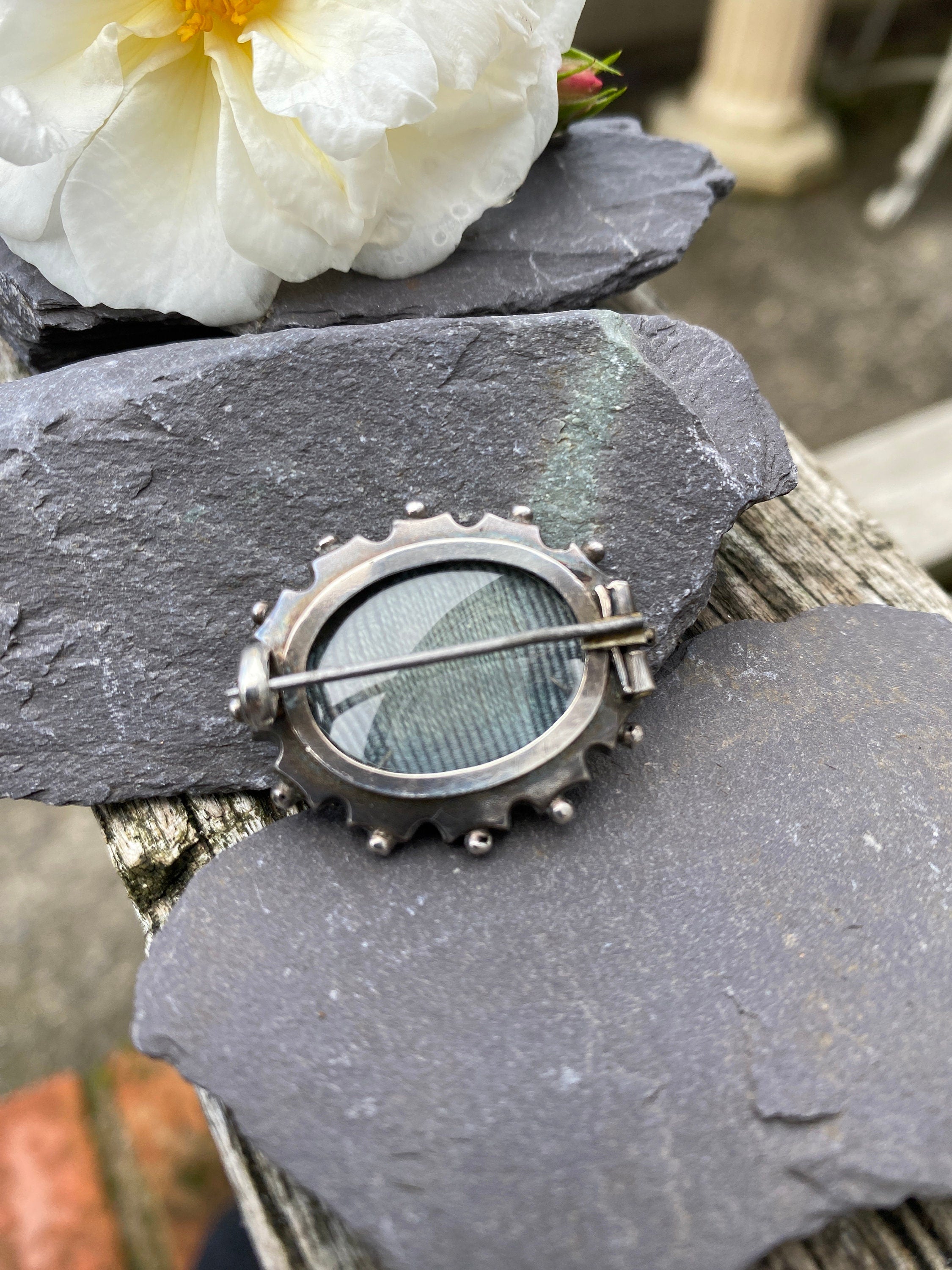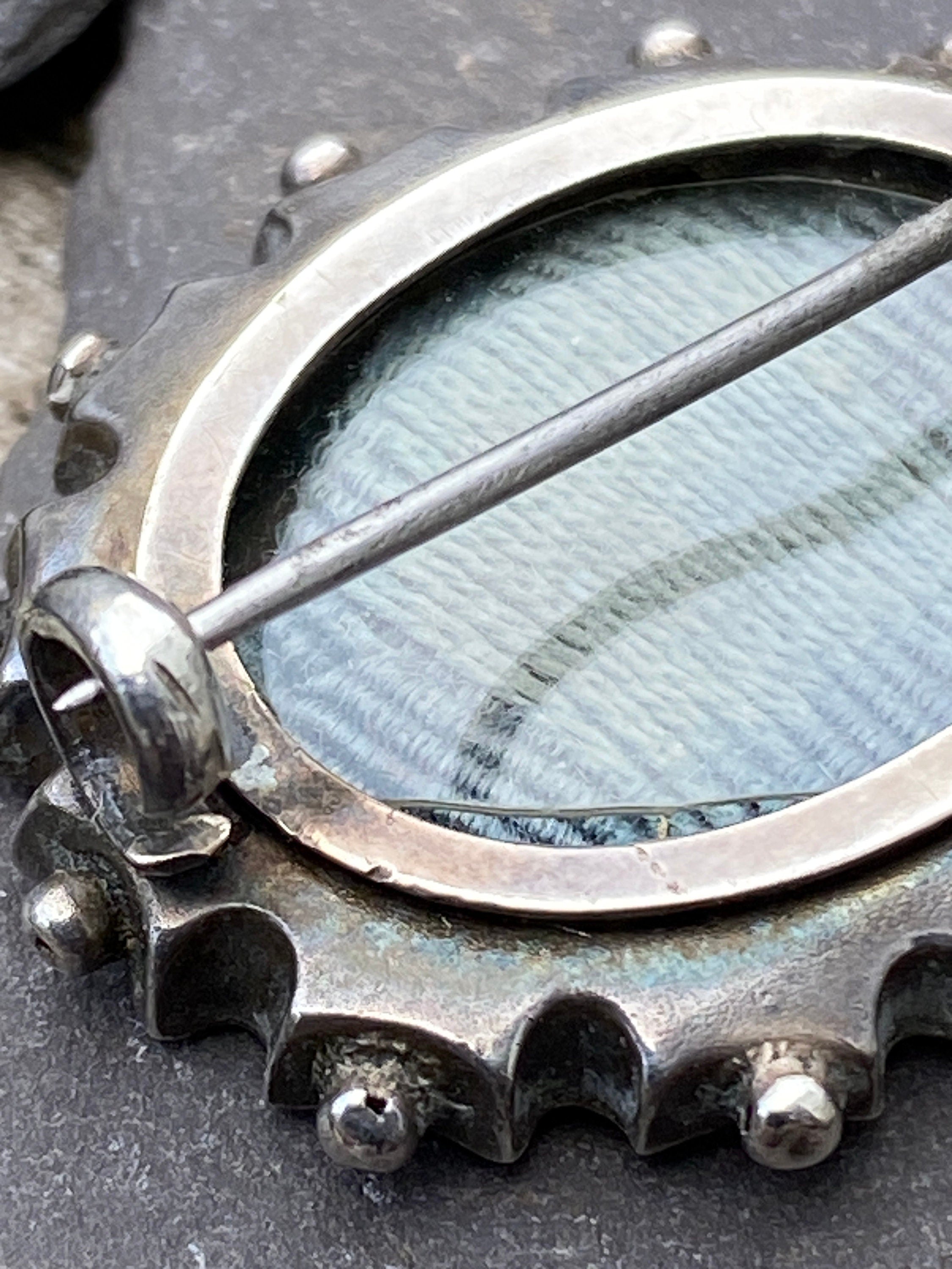 The back has a locket compartment for hair or a photograph with a piece of 'perspex' in place of glass.