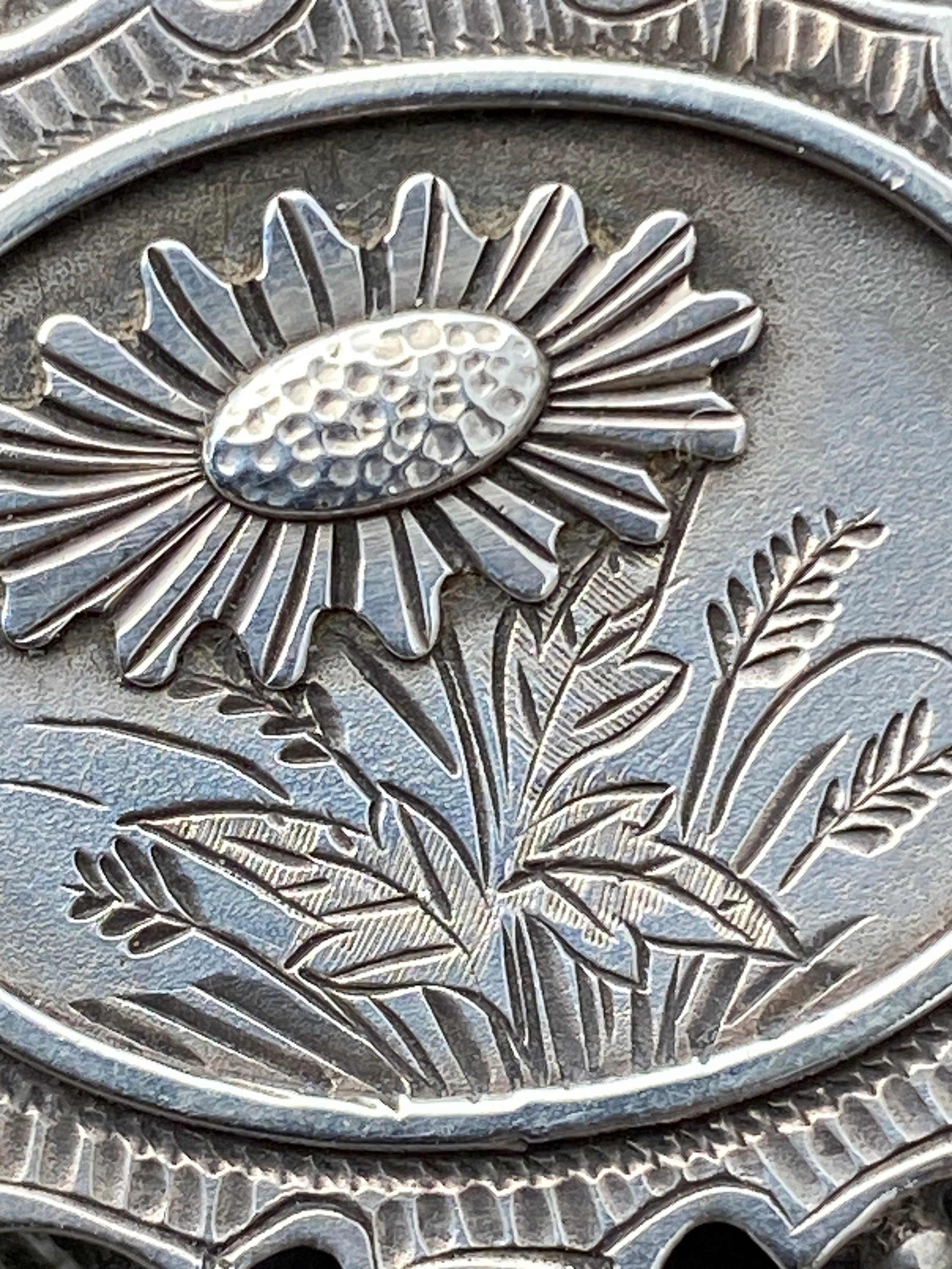 A Victorian Silver brooch featuring a daisy surrounded by an ornate border.