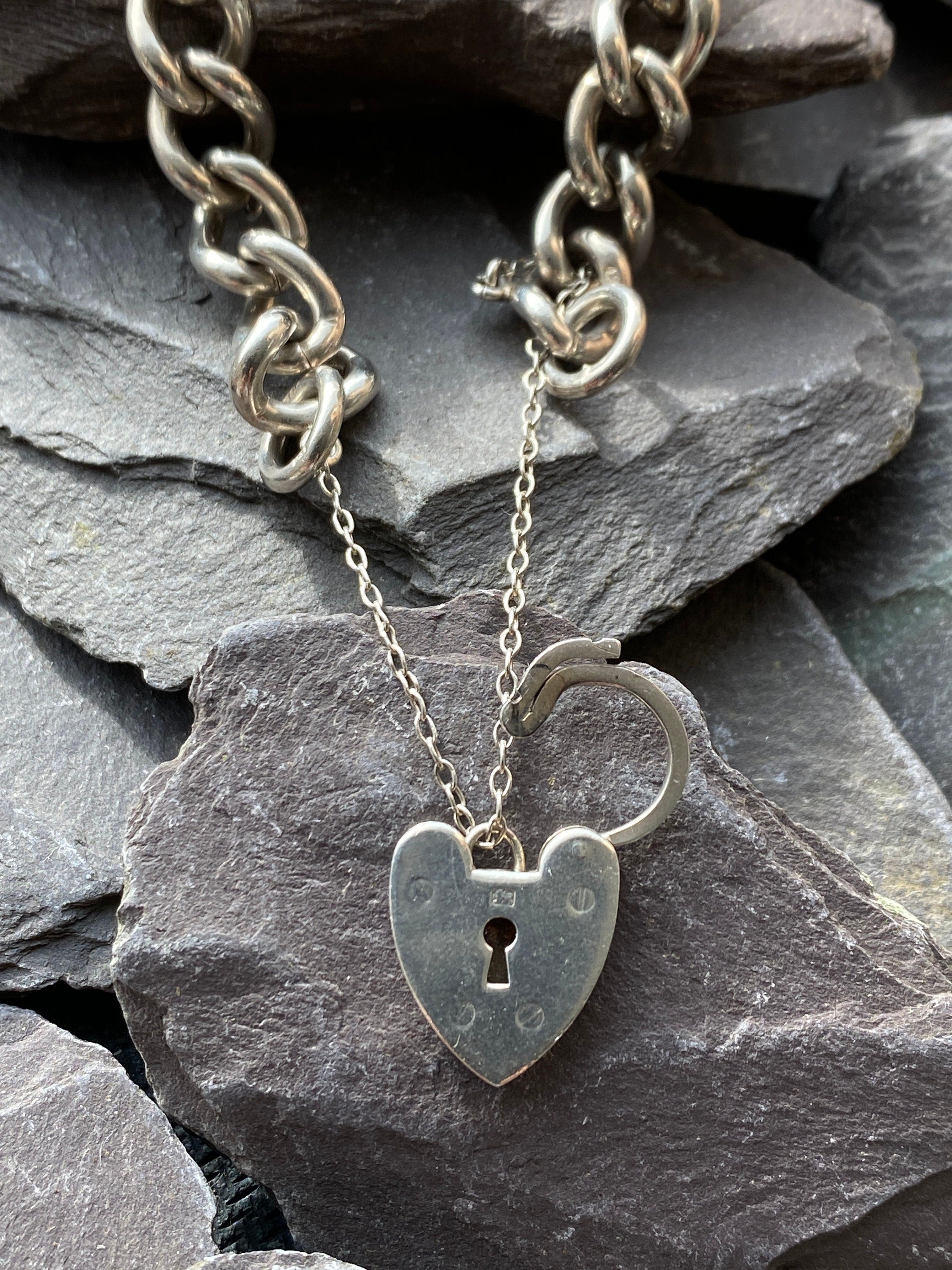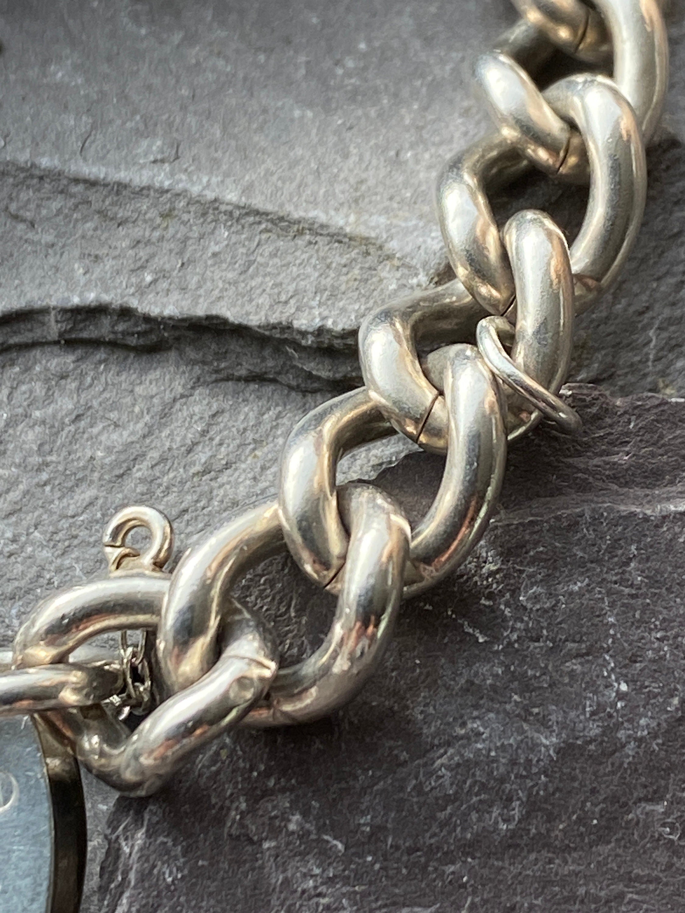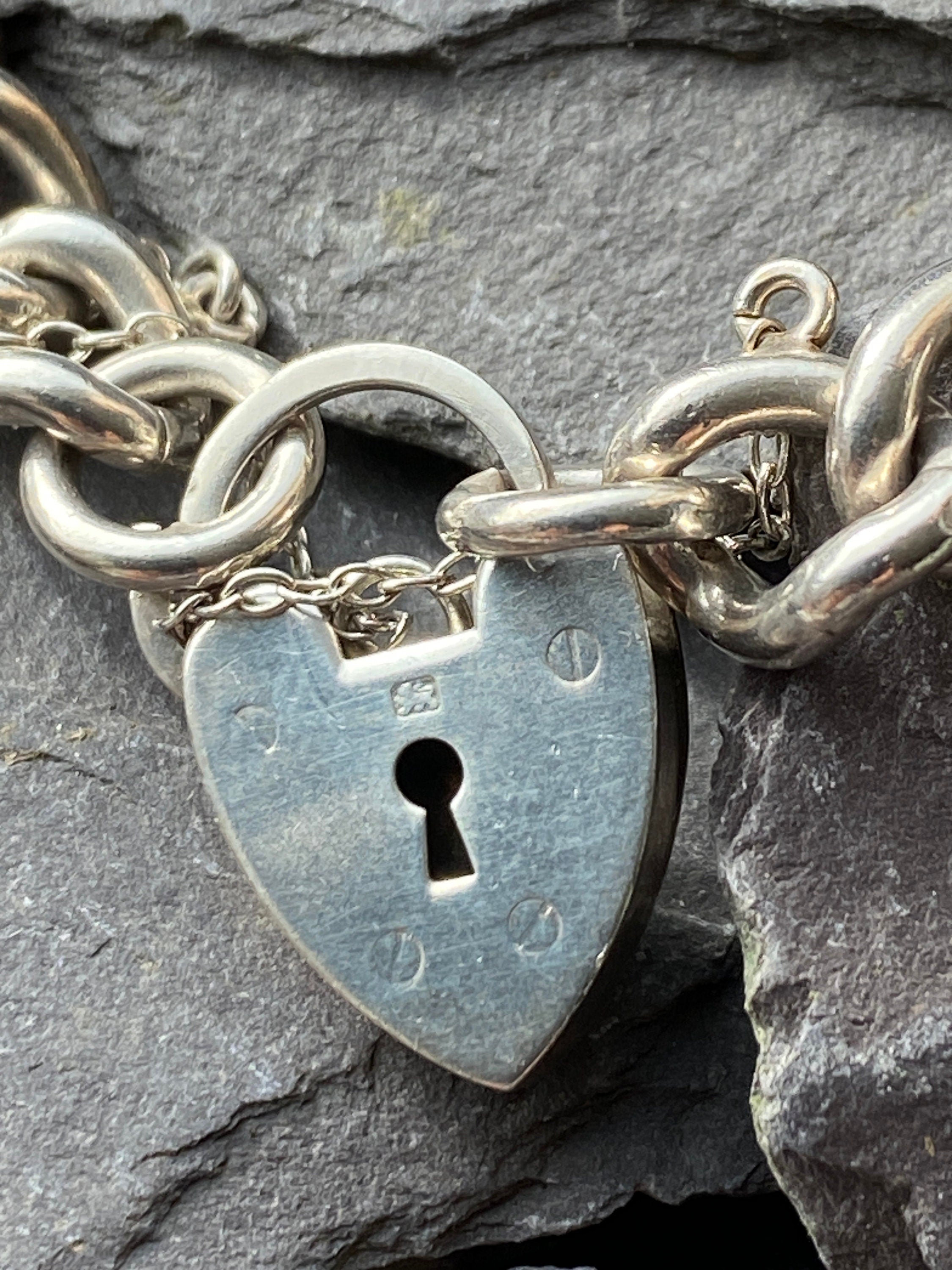A well made solid curb link sterling silver charm bracelet with padlock clasp and safety chain