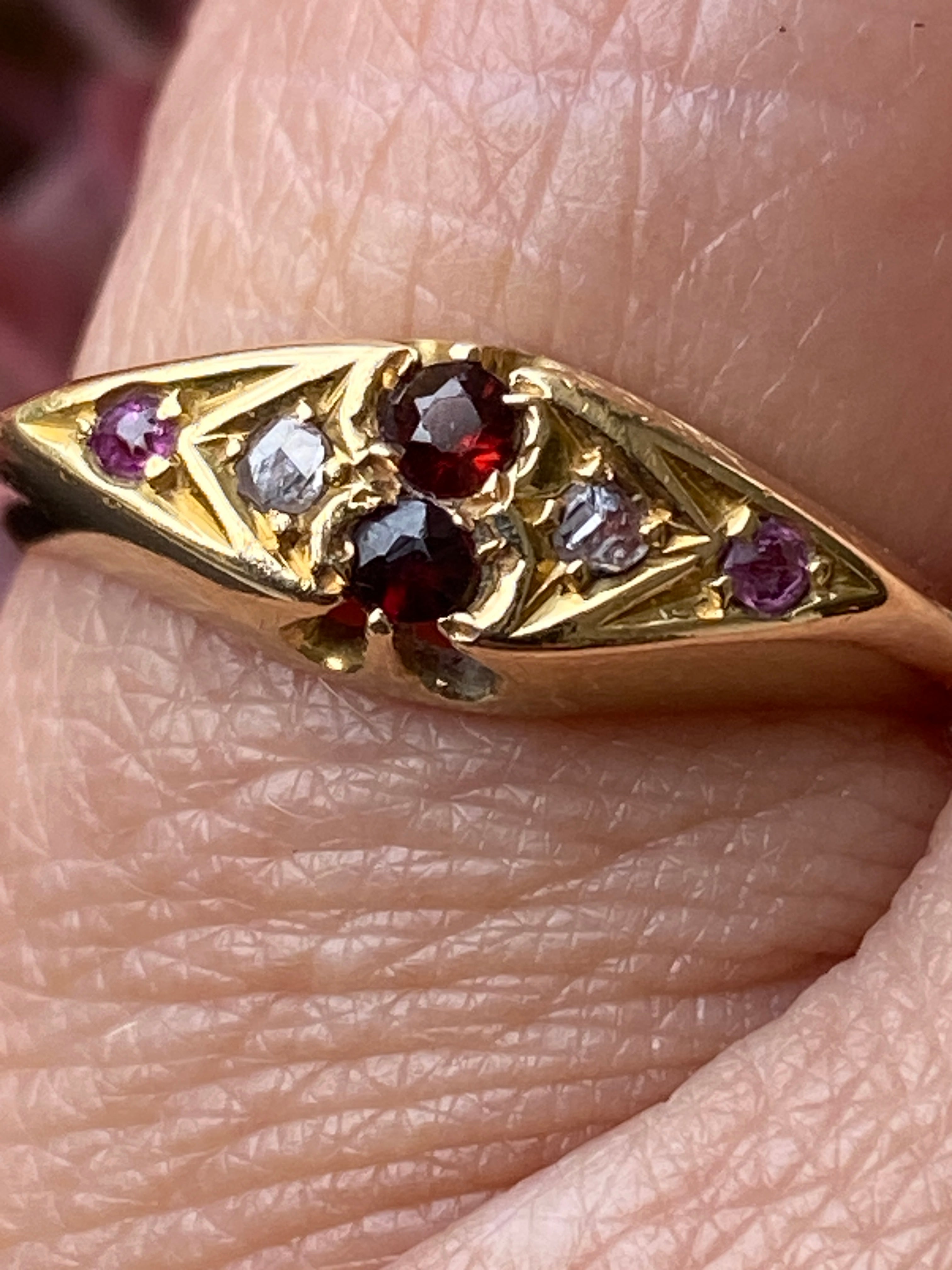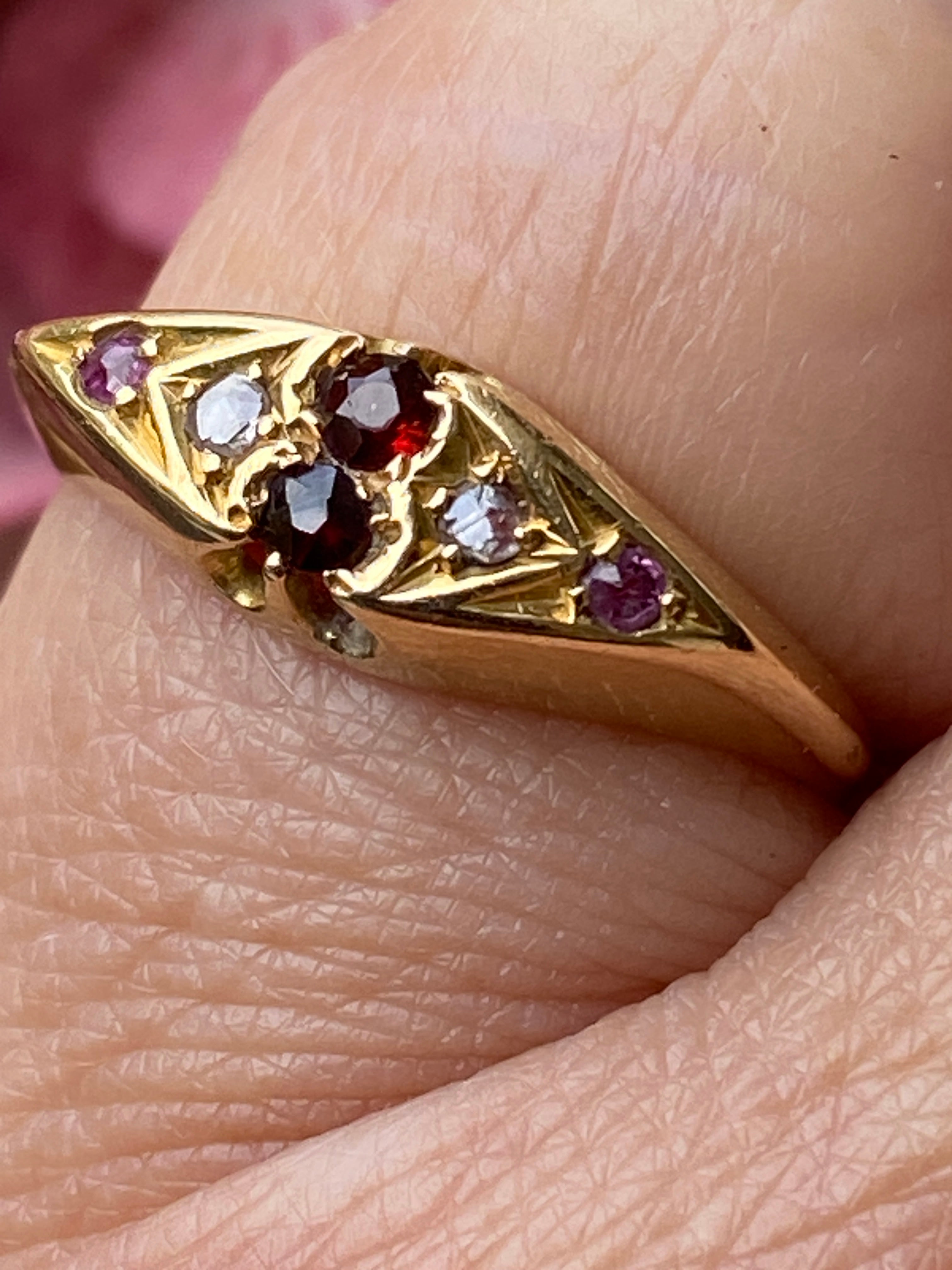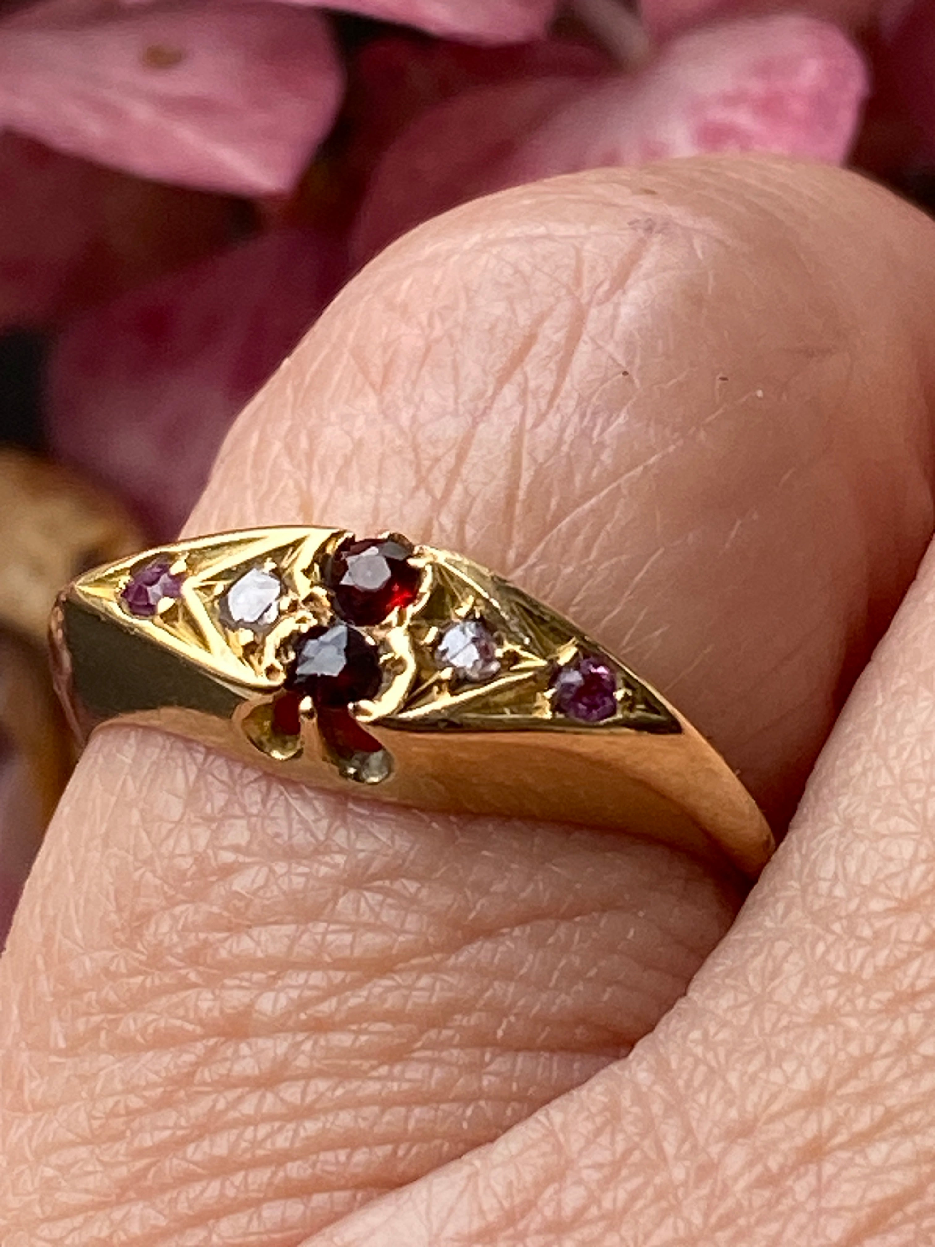 A very pretty 18ct gold ring set with old cut Garnet and Diamond stones.