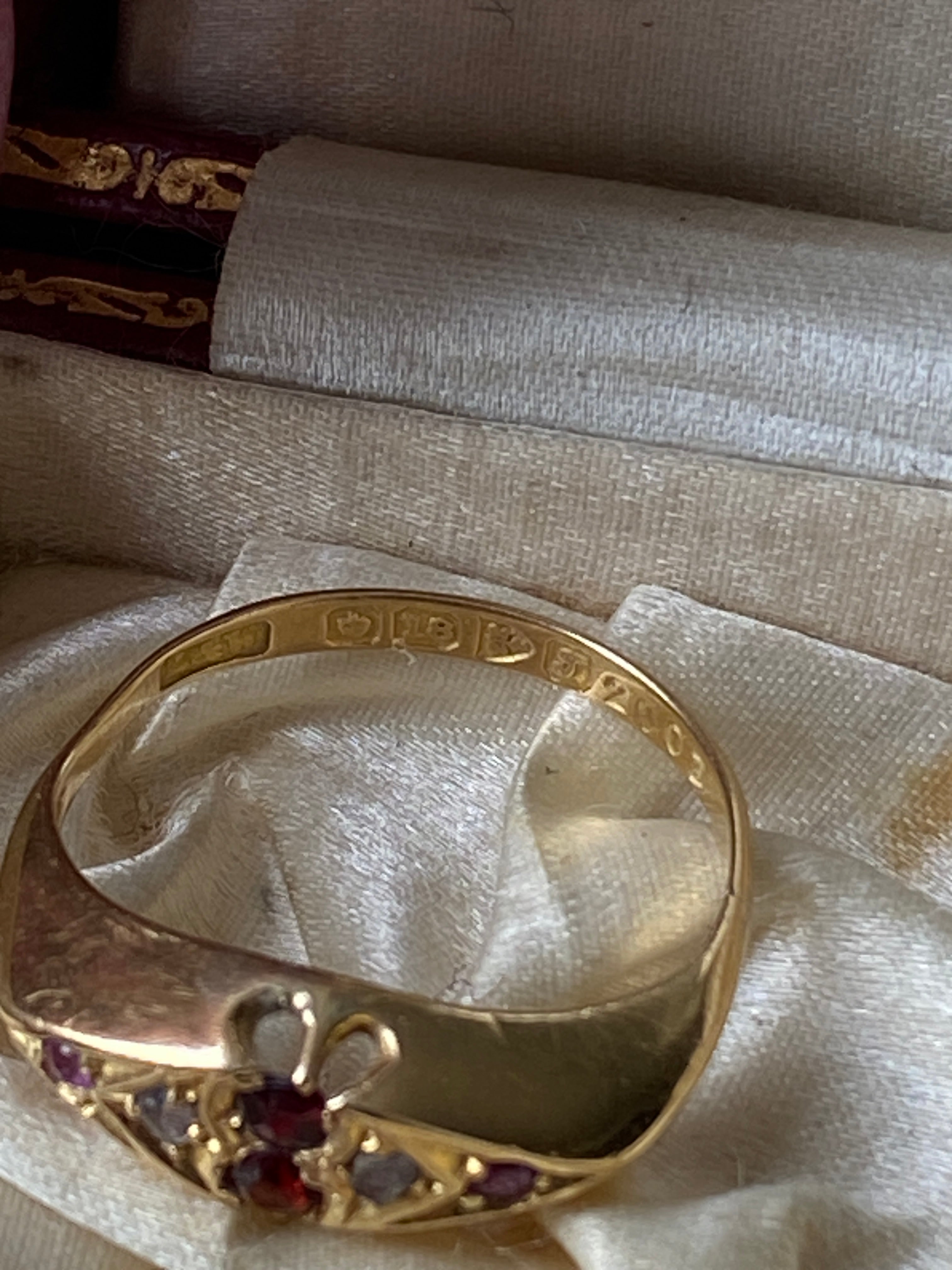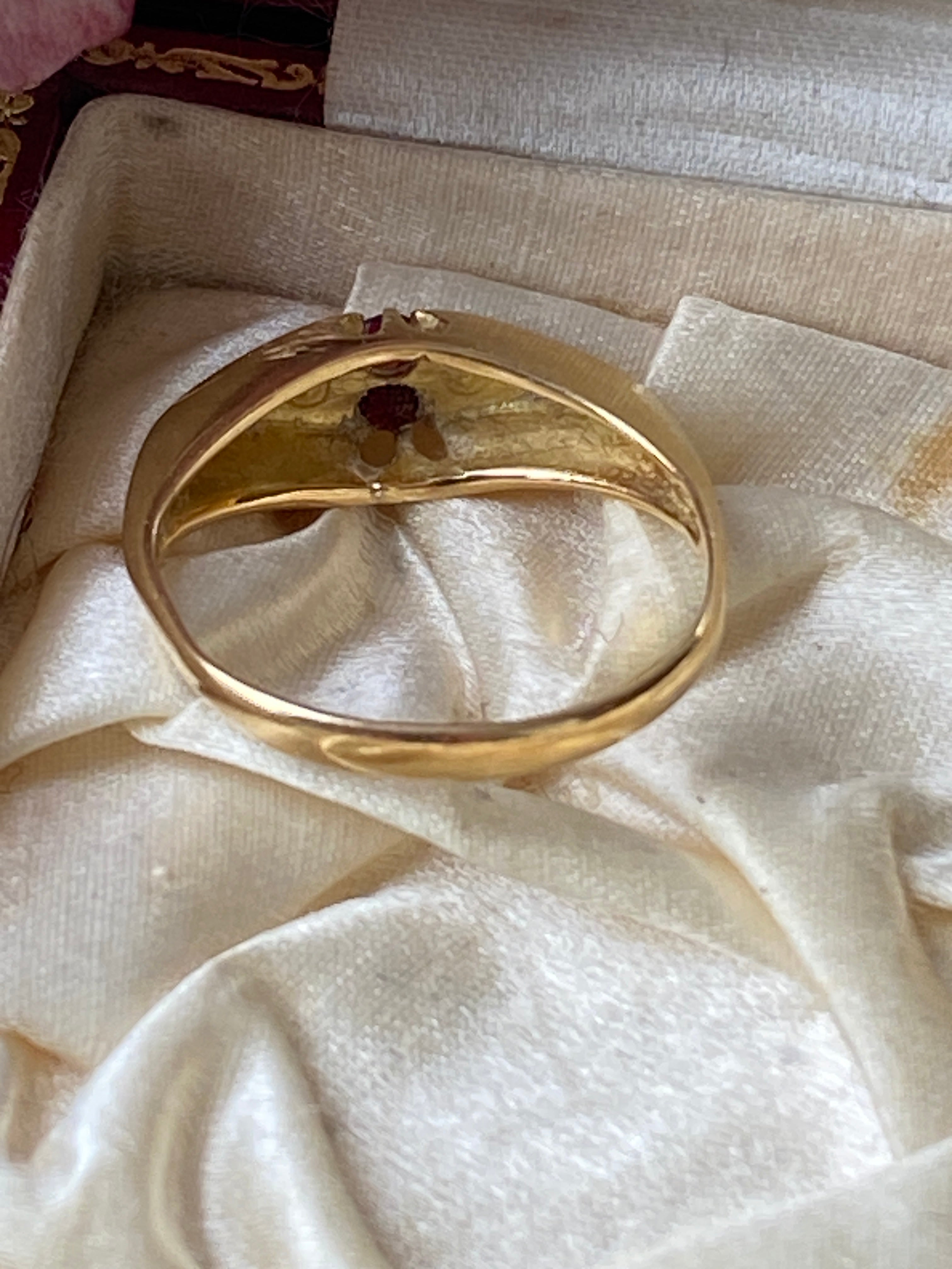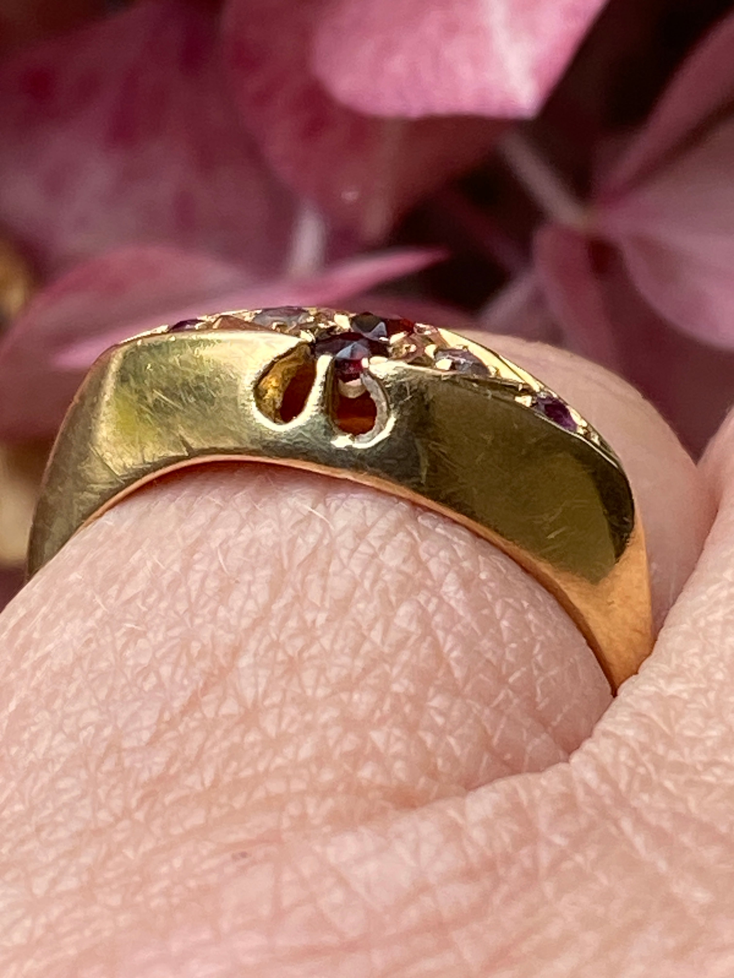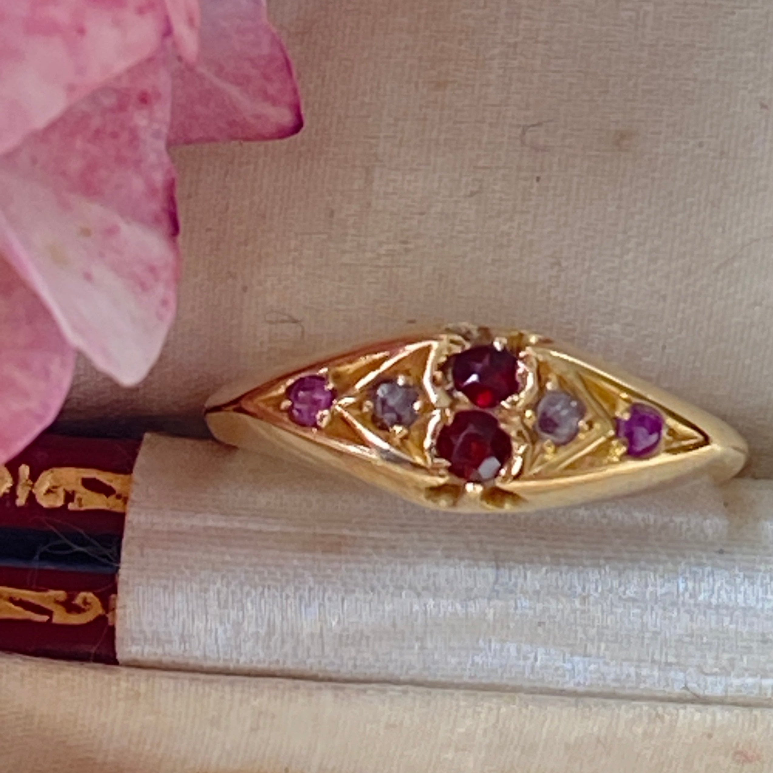 A very pretty 18ct gold ring set with old cut Garnet and Diamond stones.