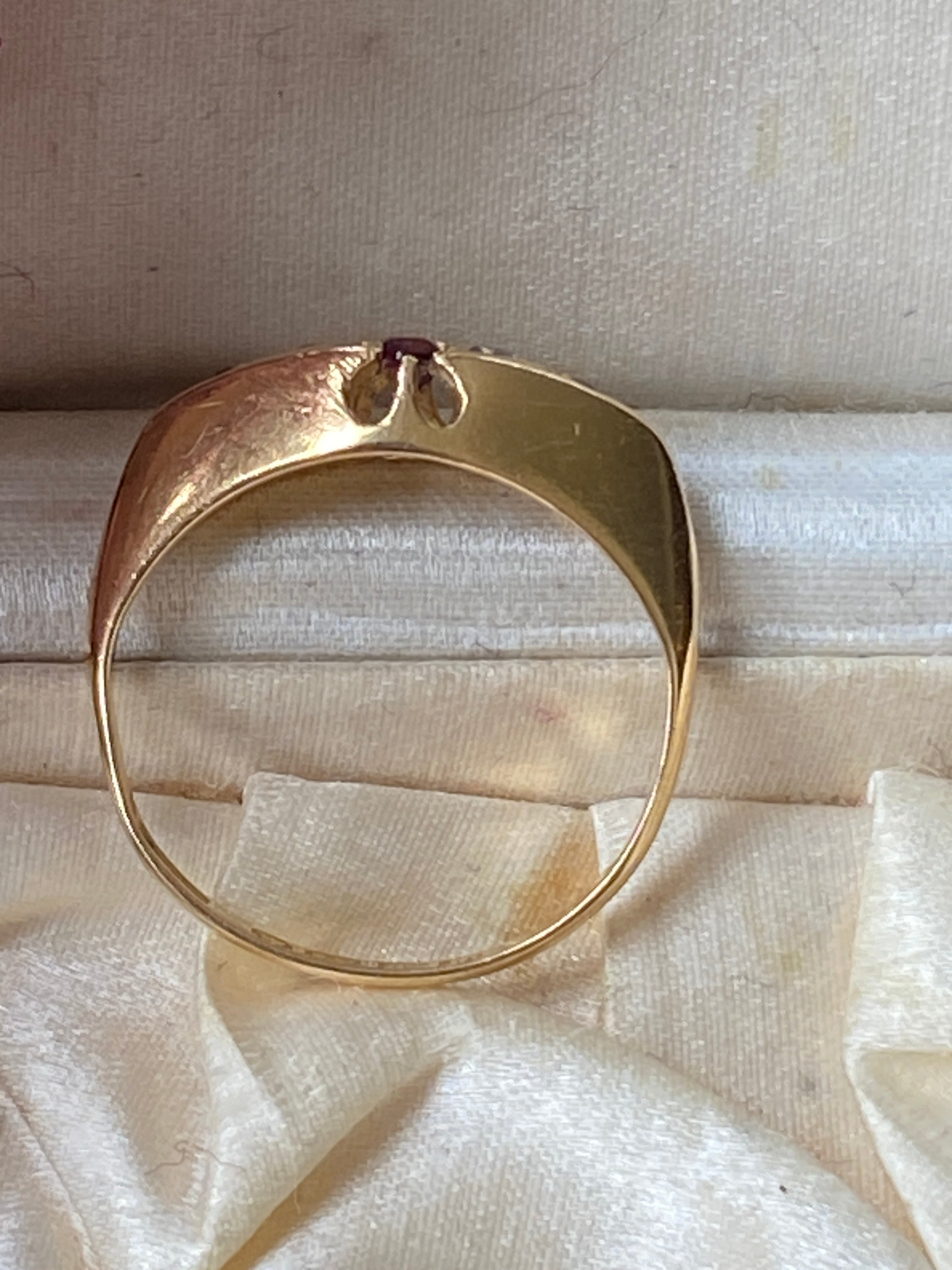 A very pretty 18ct gold ring set with old cut Garnet and Diamond stones. Full hallmarks for Chester 1919 . Makers mark of E & W Finger size...