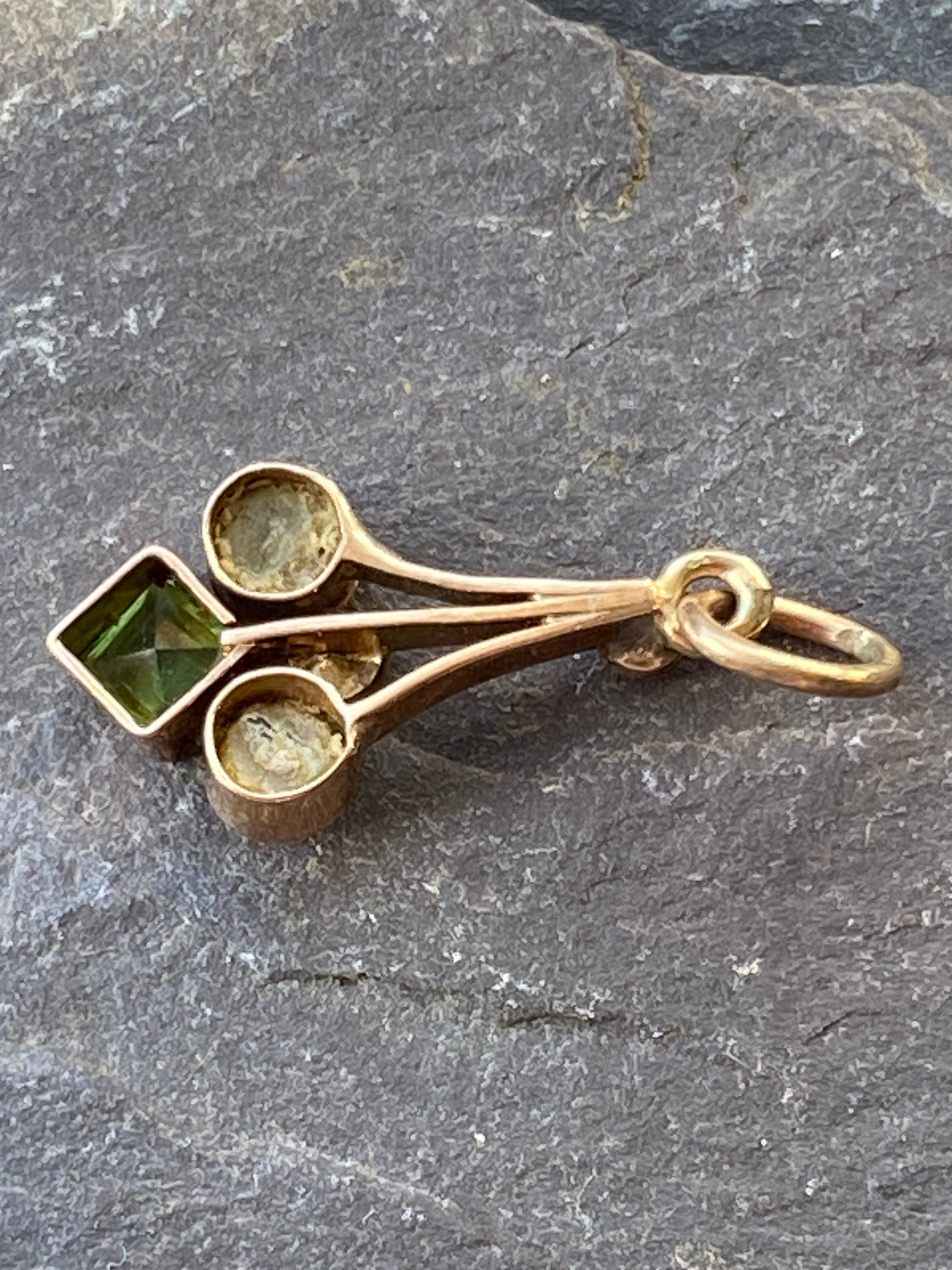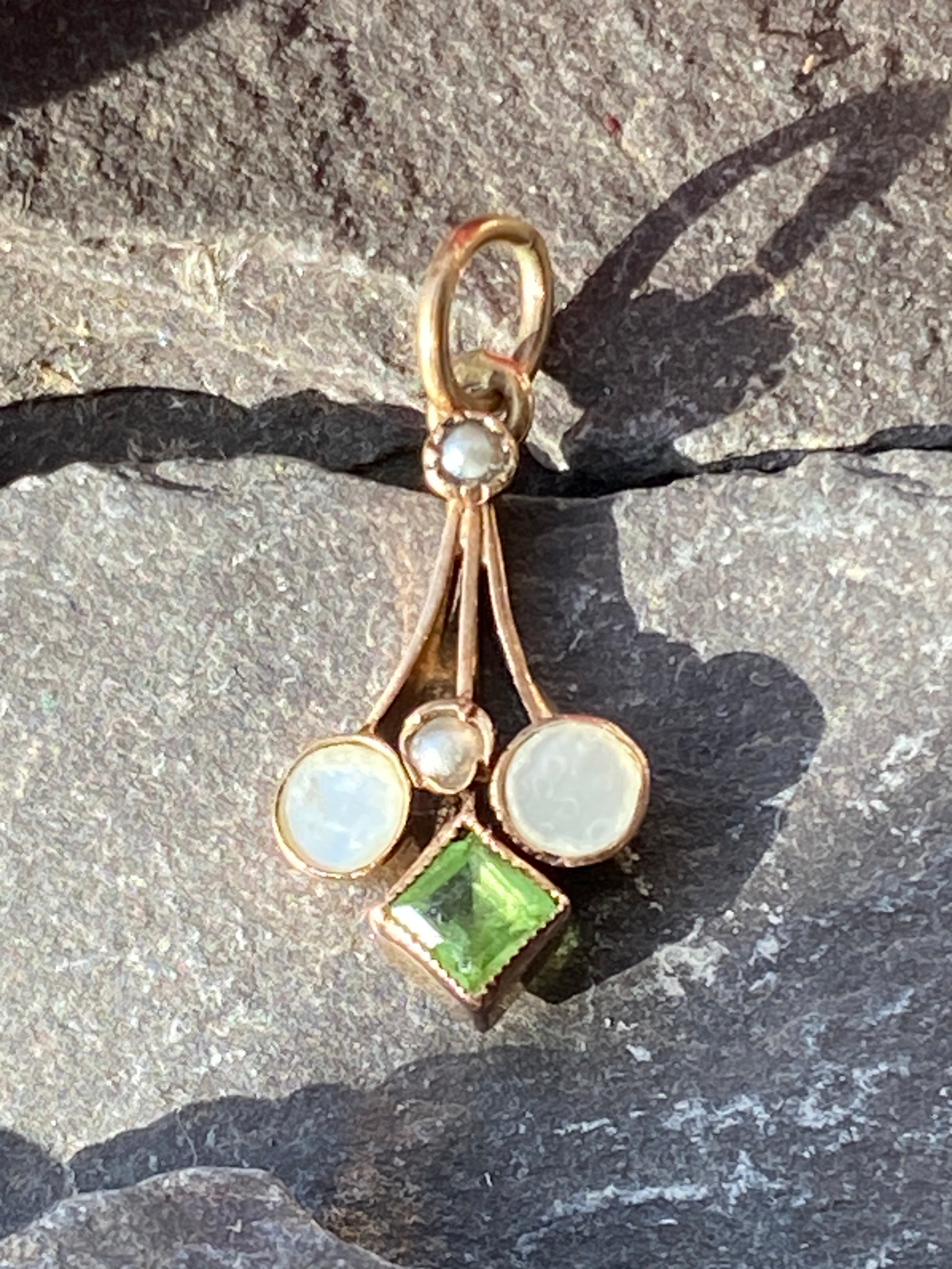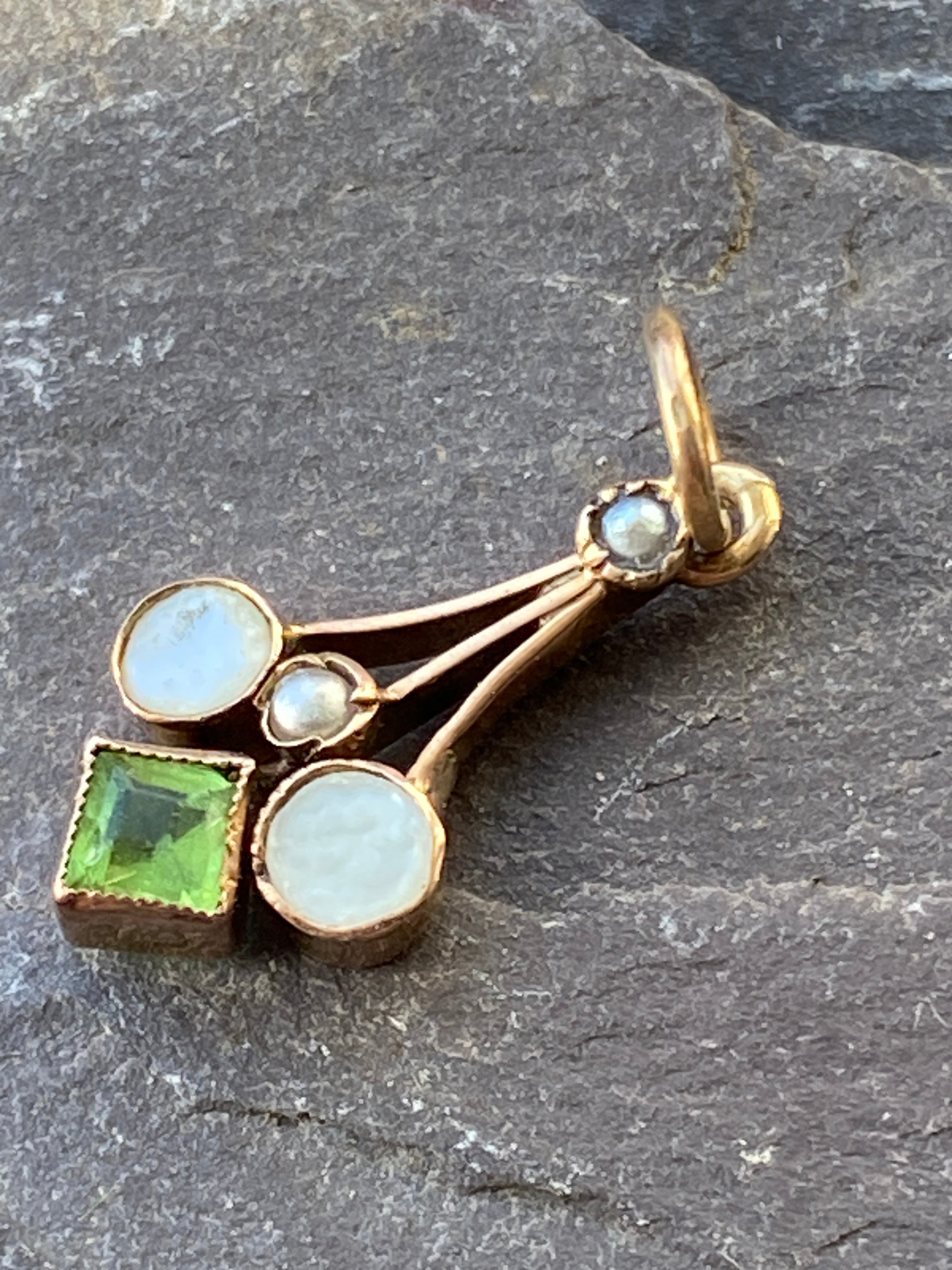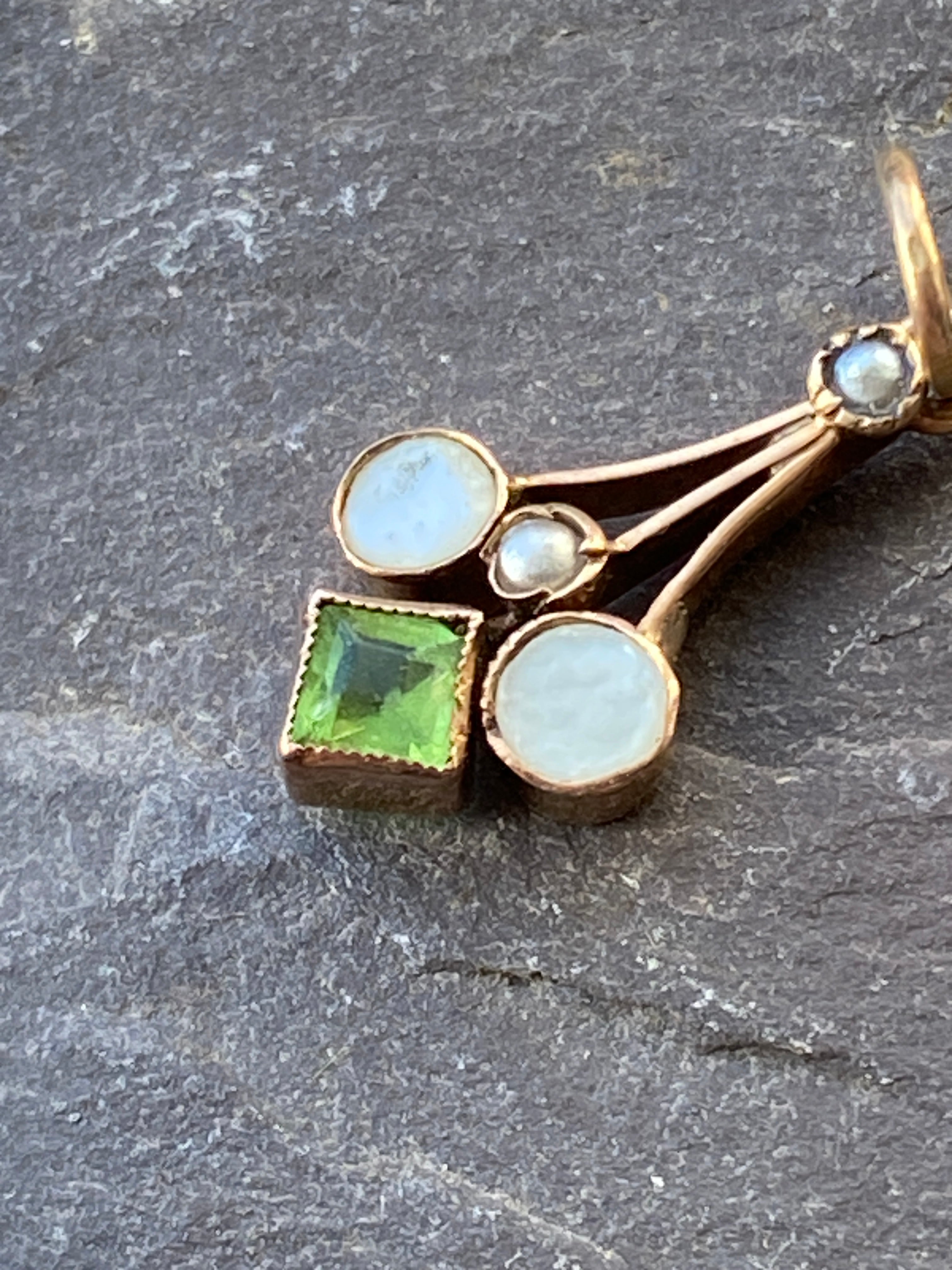 A dainty Edwardian 9ct gold pendant set with Peridot, Mother of Pearl & Seed Pearls.