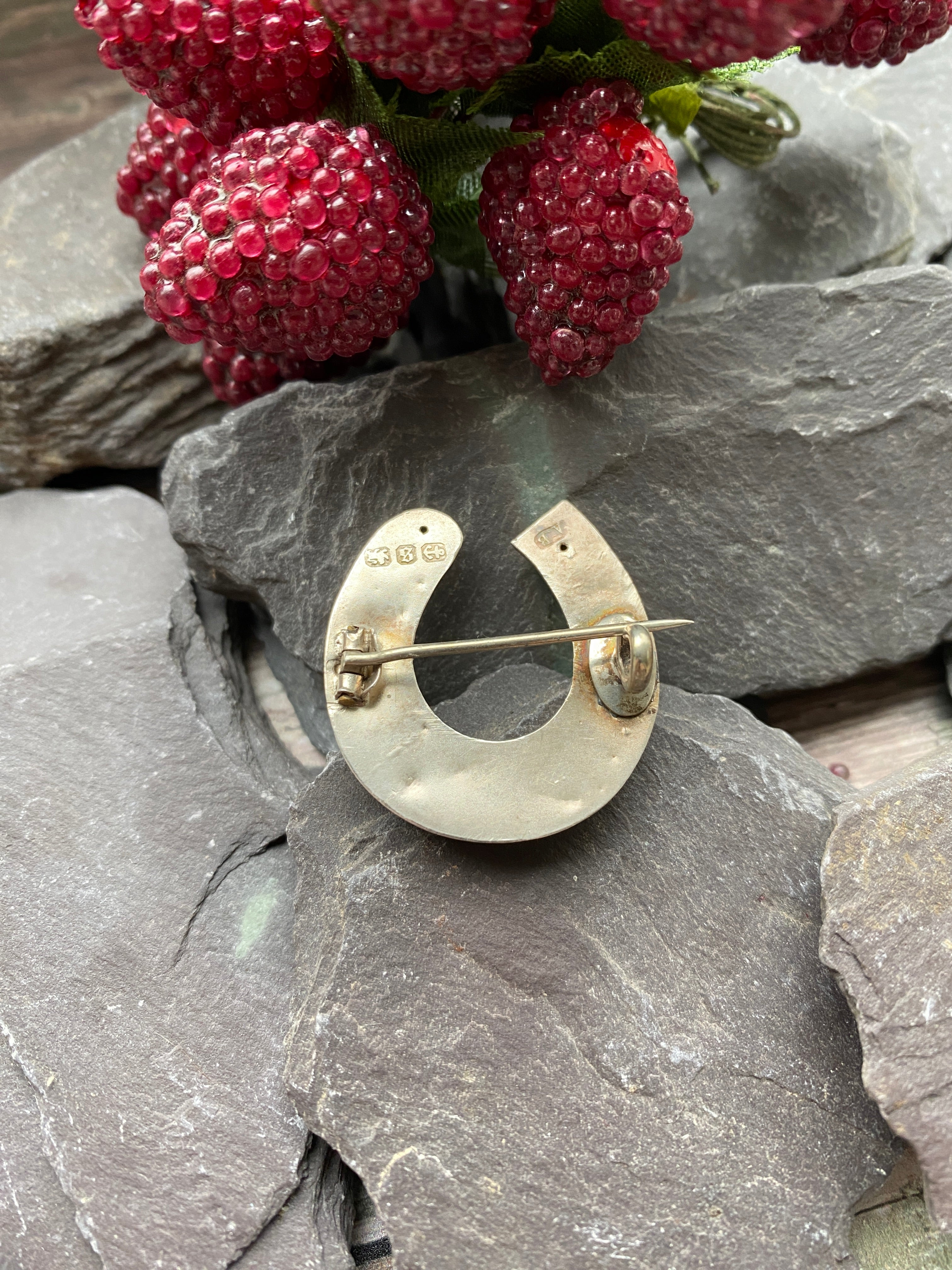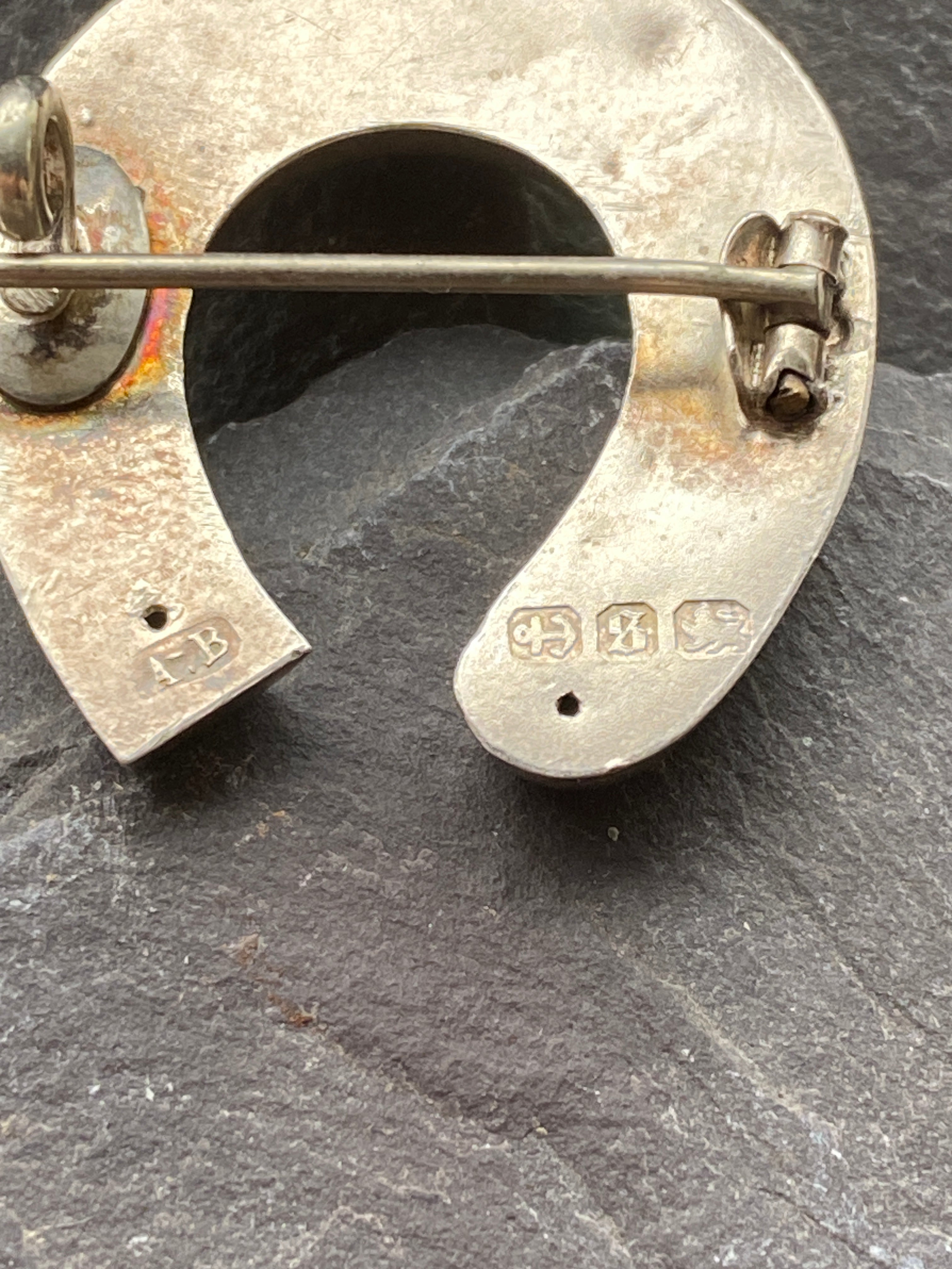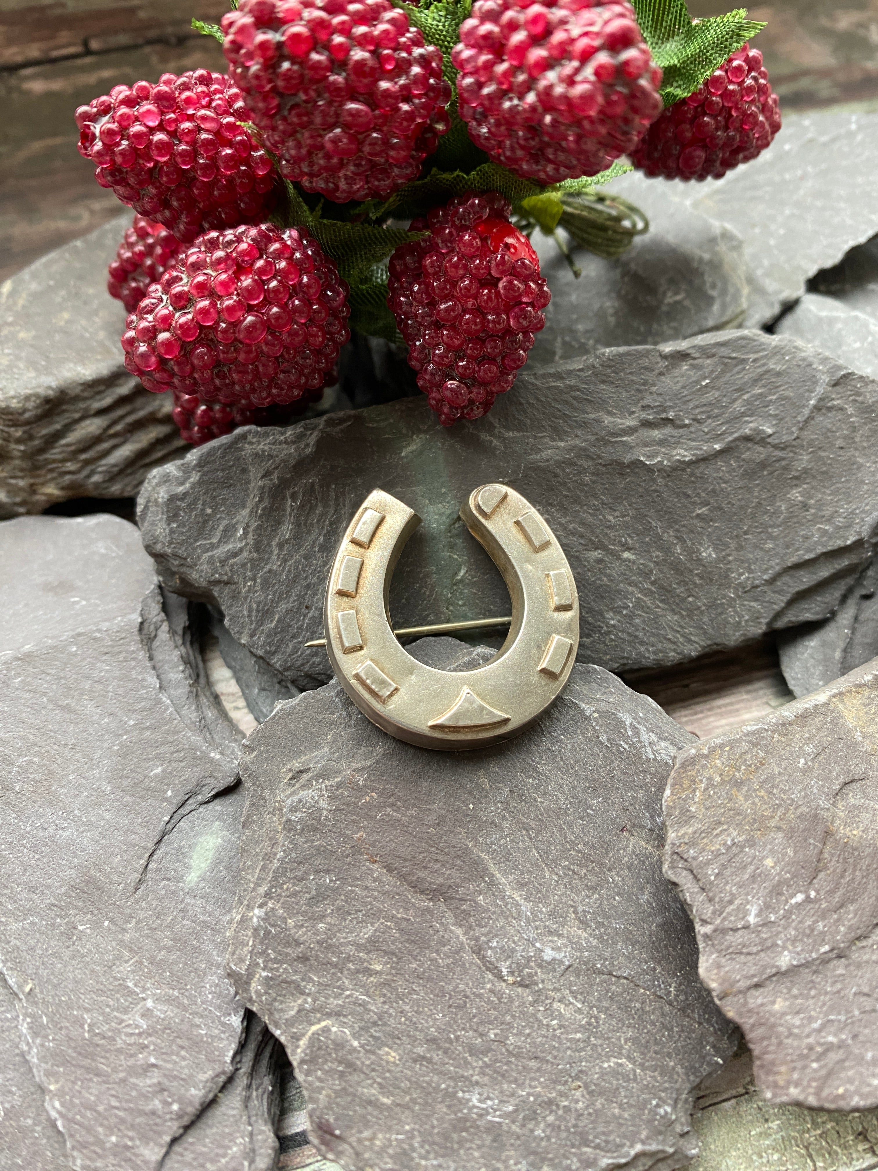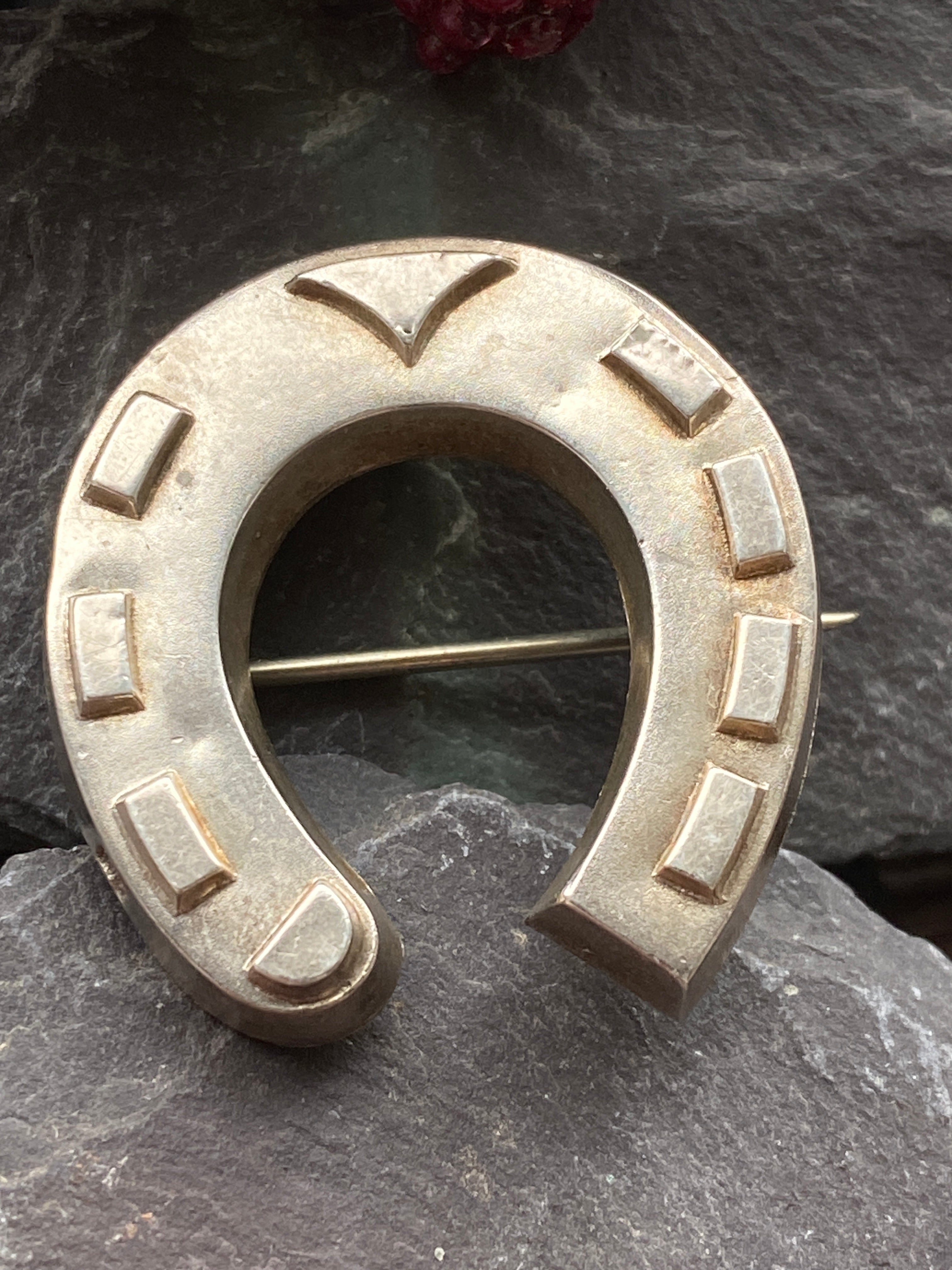 A sterling silver horse shoe brooch said to bring luck to the wearer.