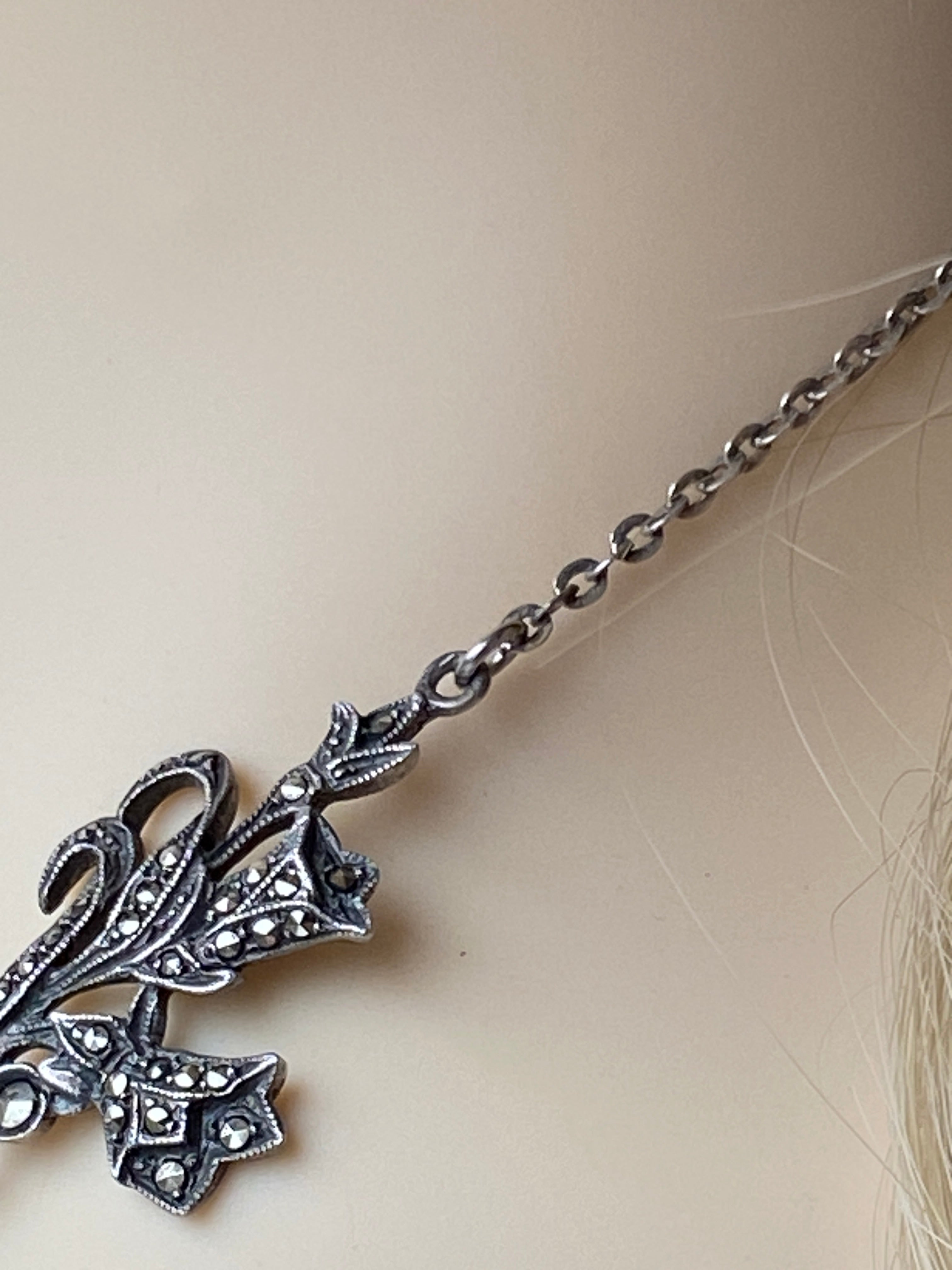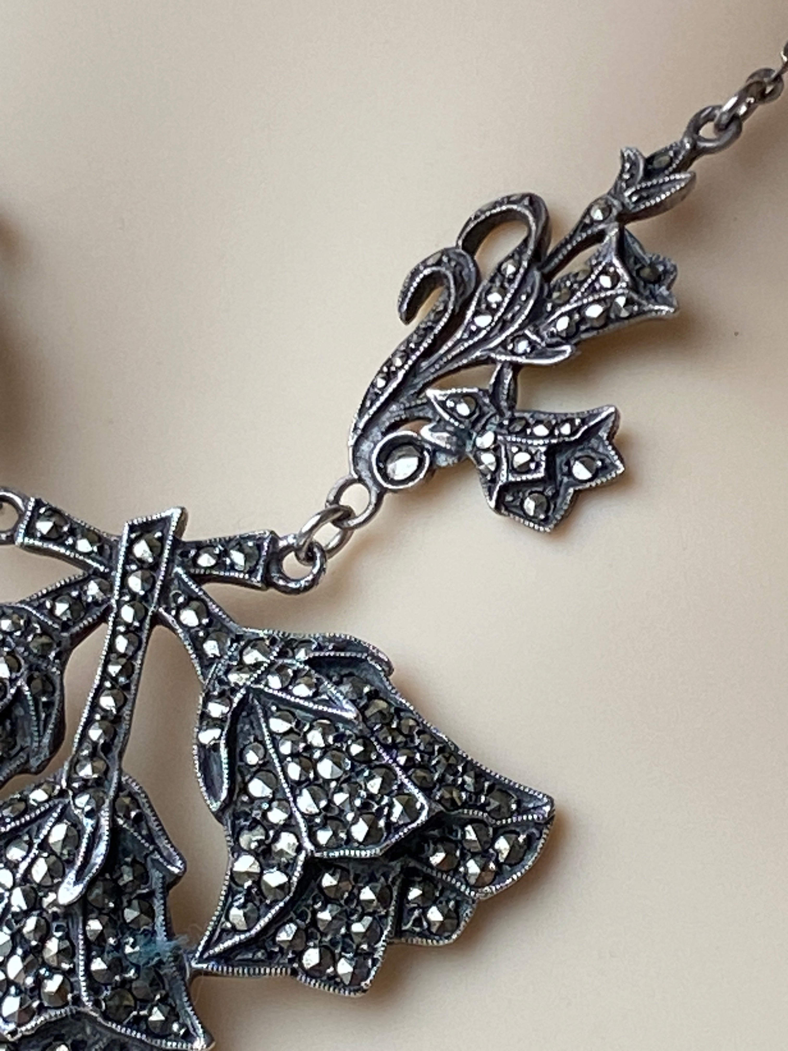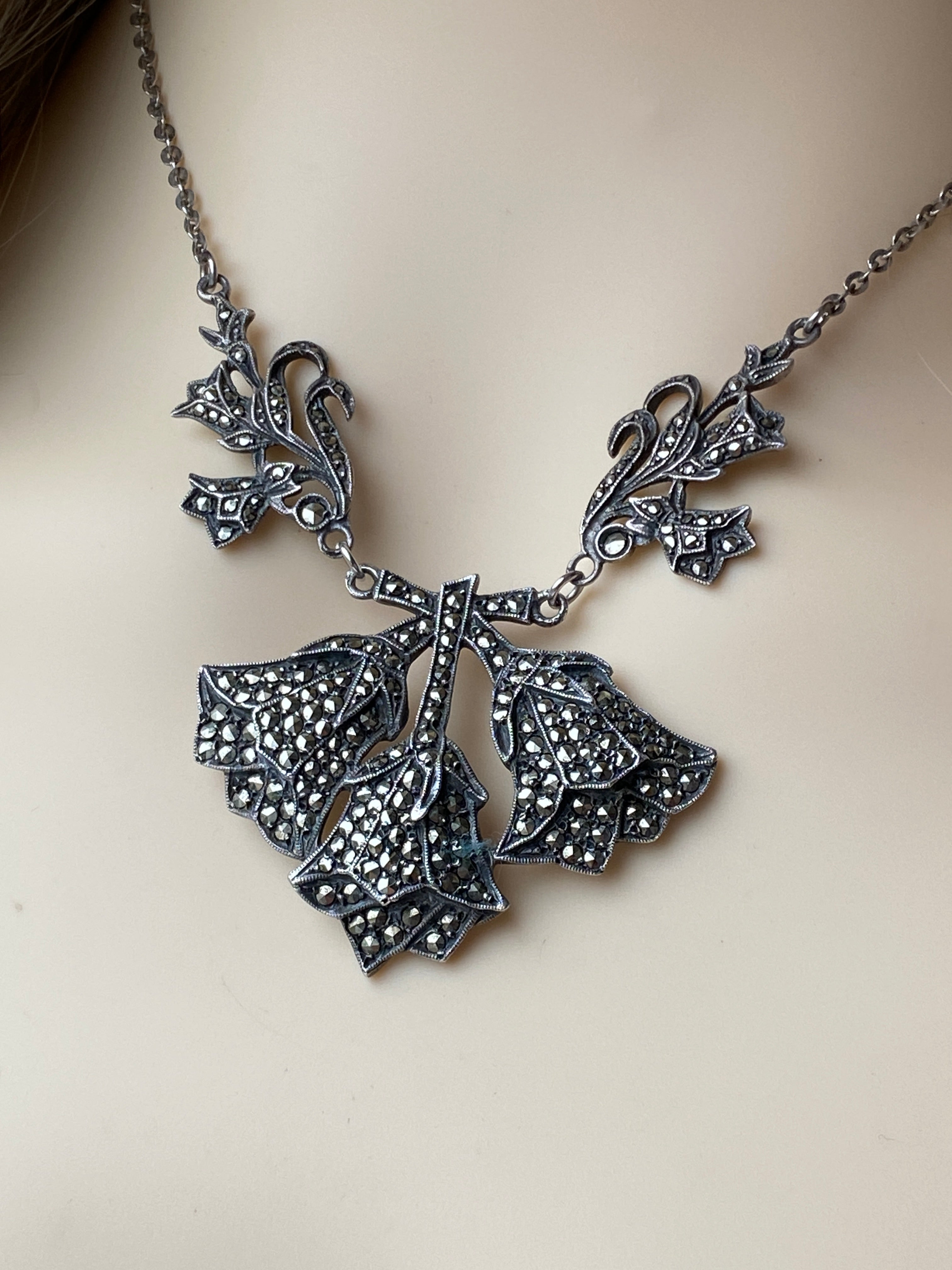 A stunning sterling silver necklace featuring a large drop of Bell flowers encrusted with Marcasite.