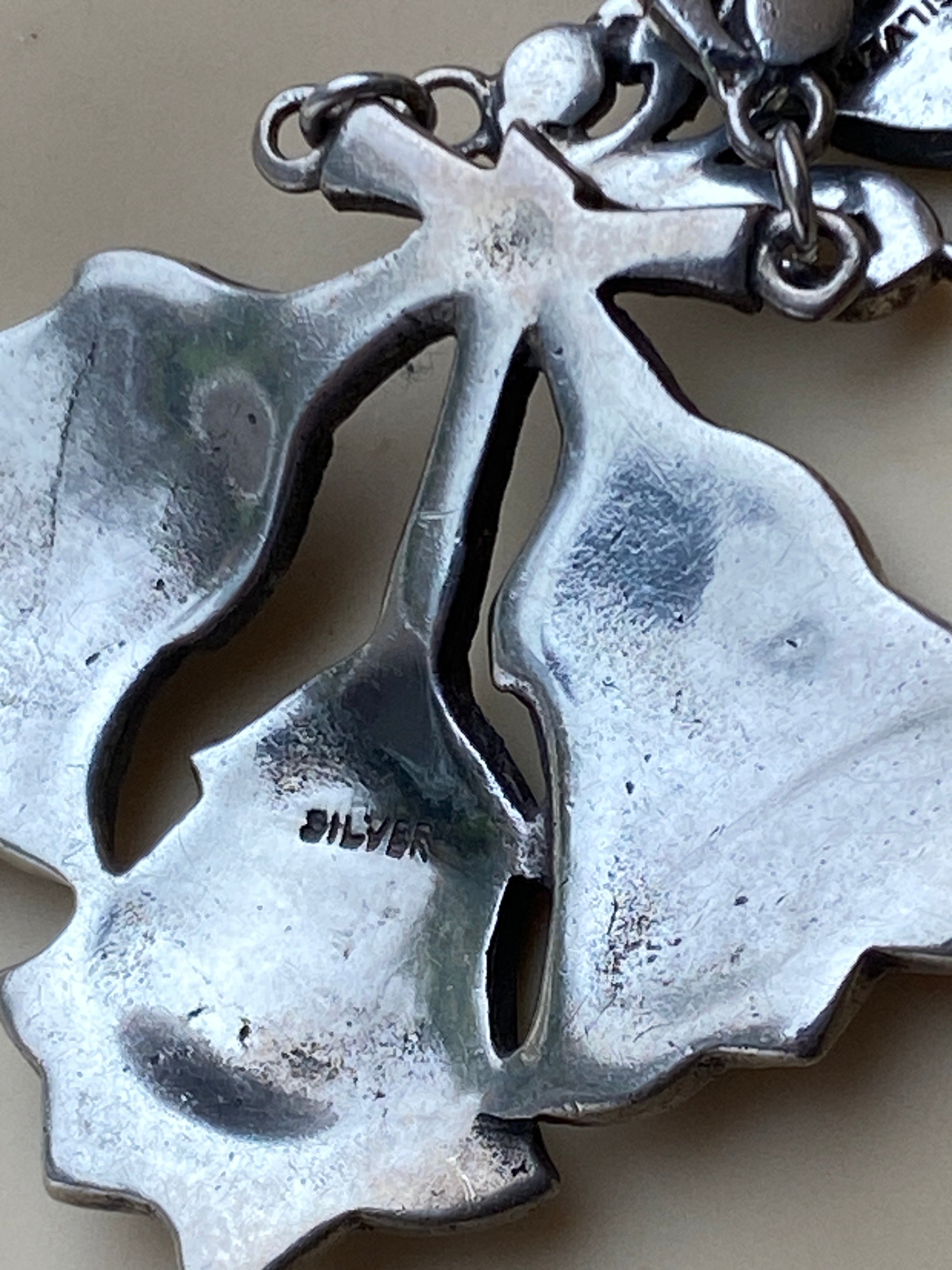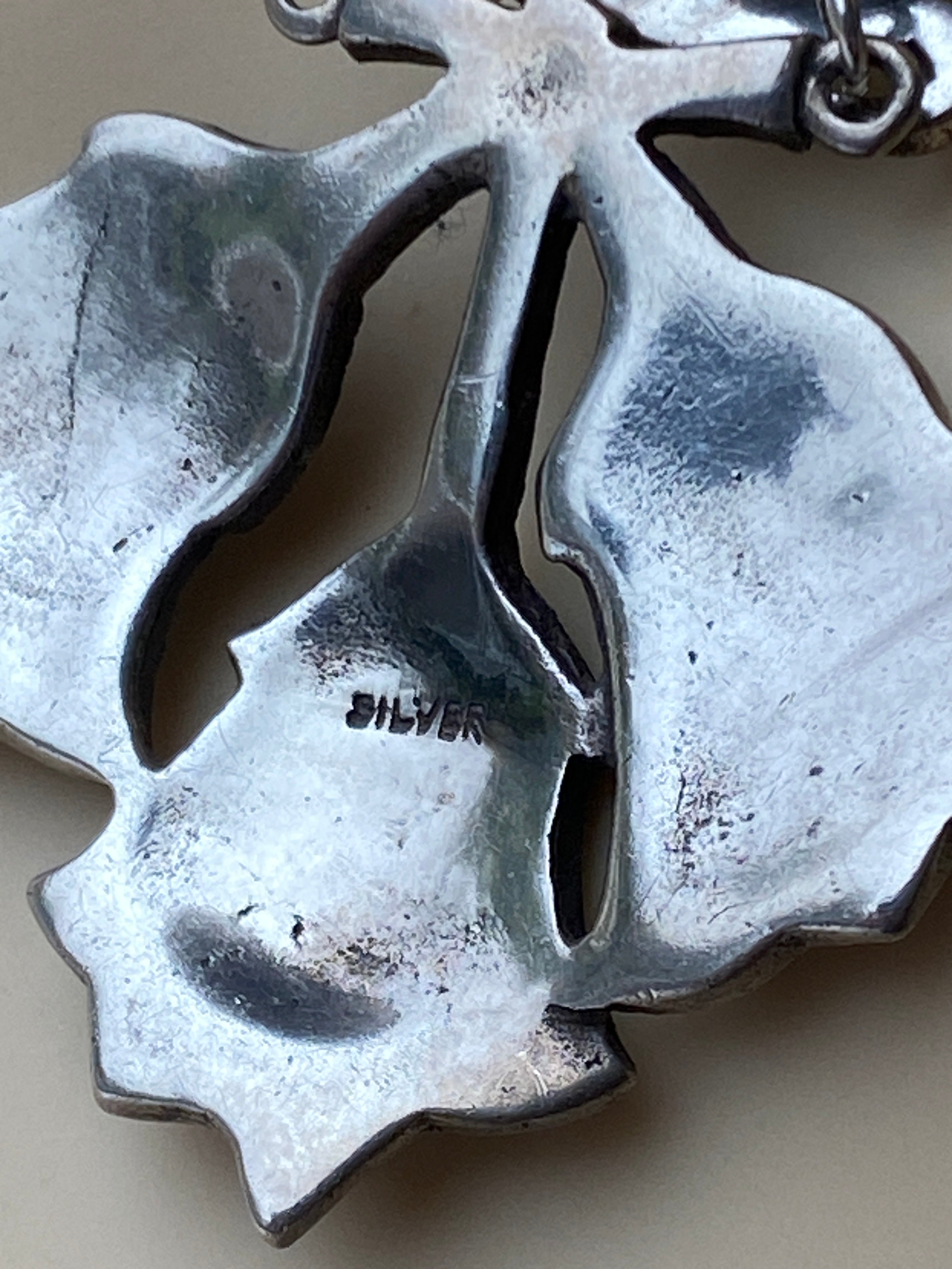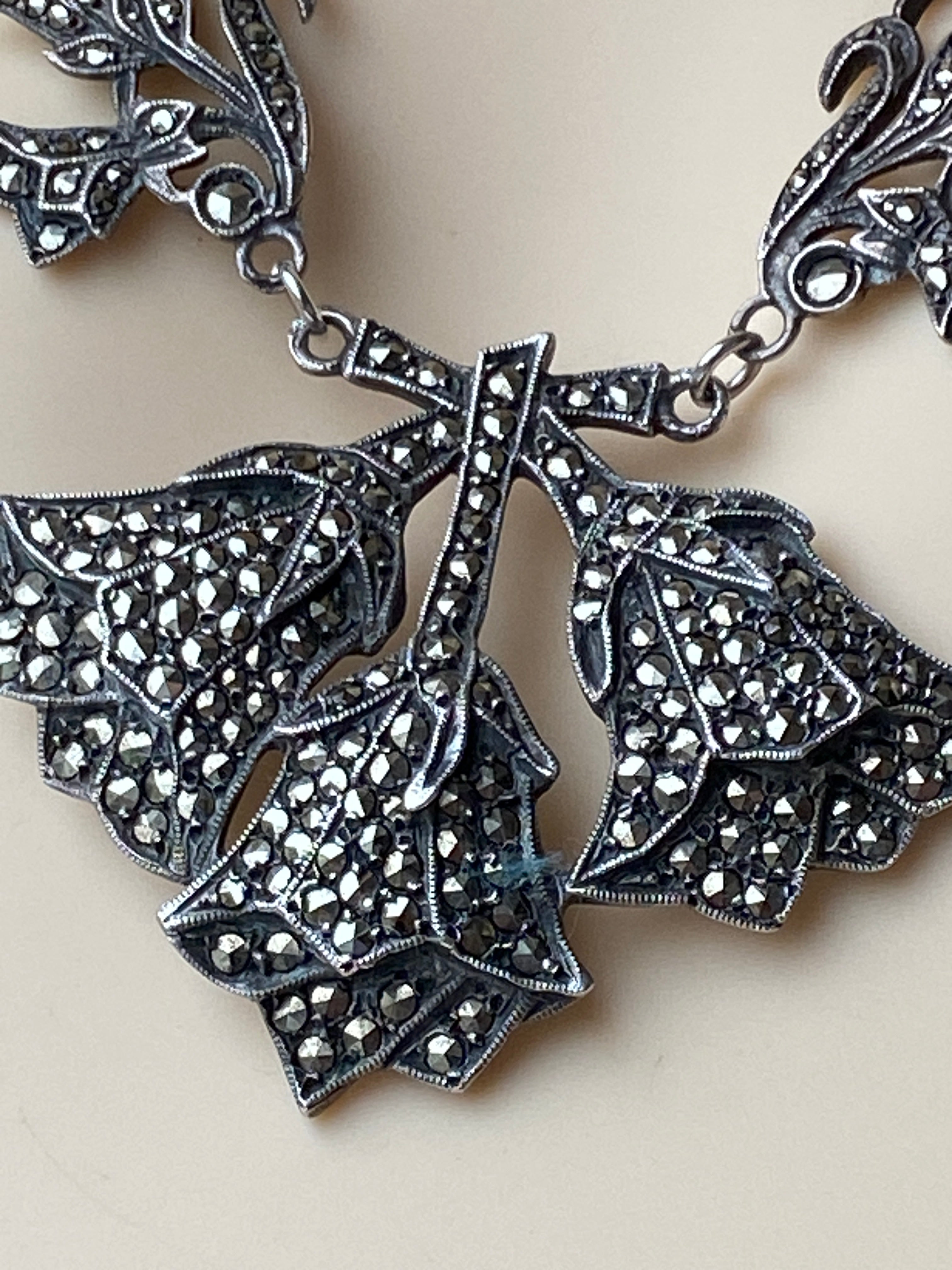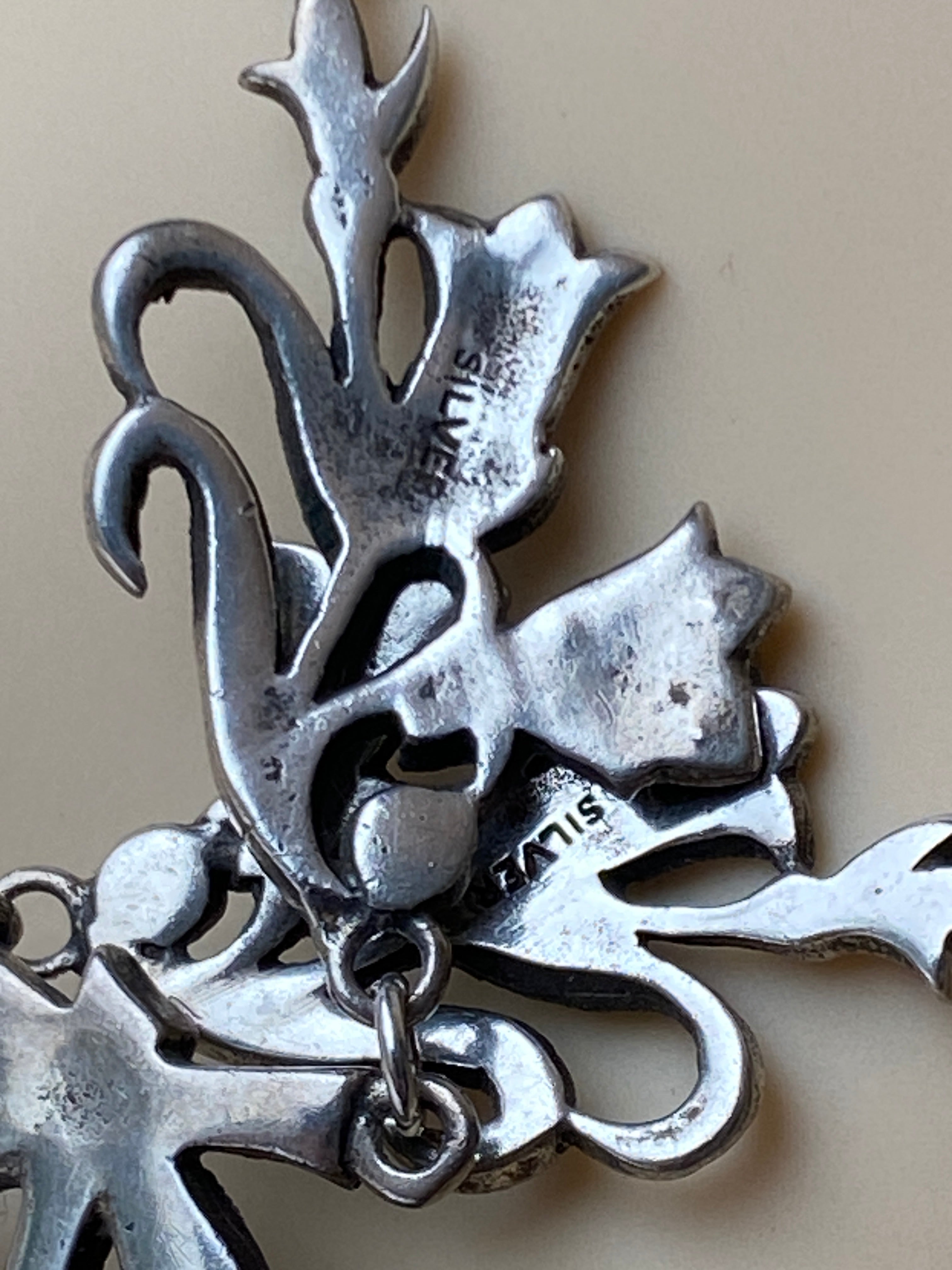 A stunning sterling silver necklace featuring a large drop of Bell flowers encrusted with Marcasite.