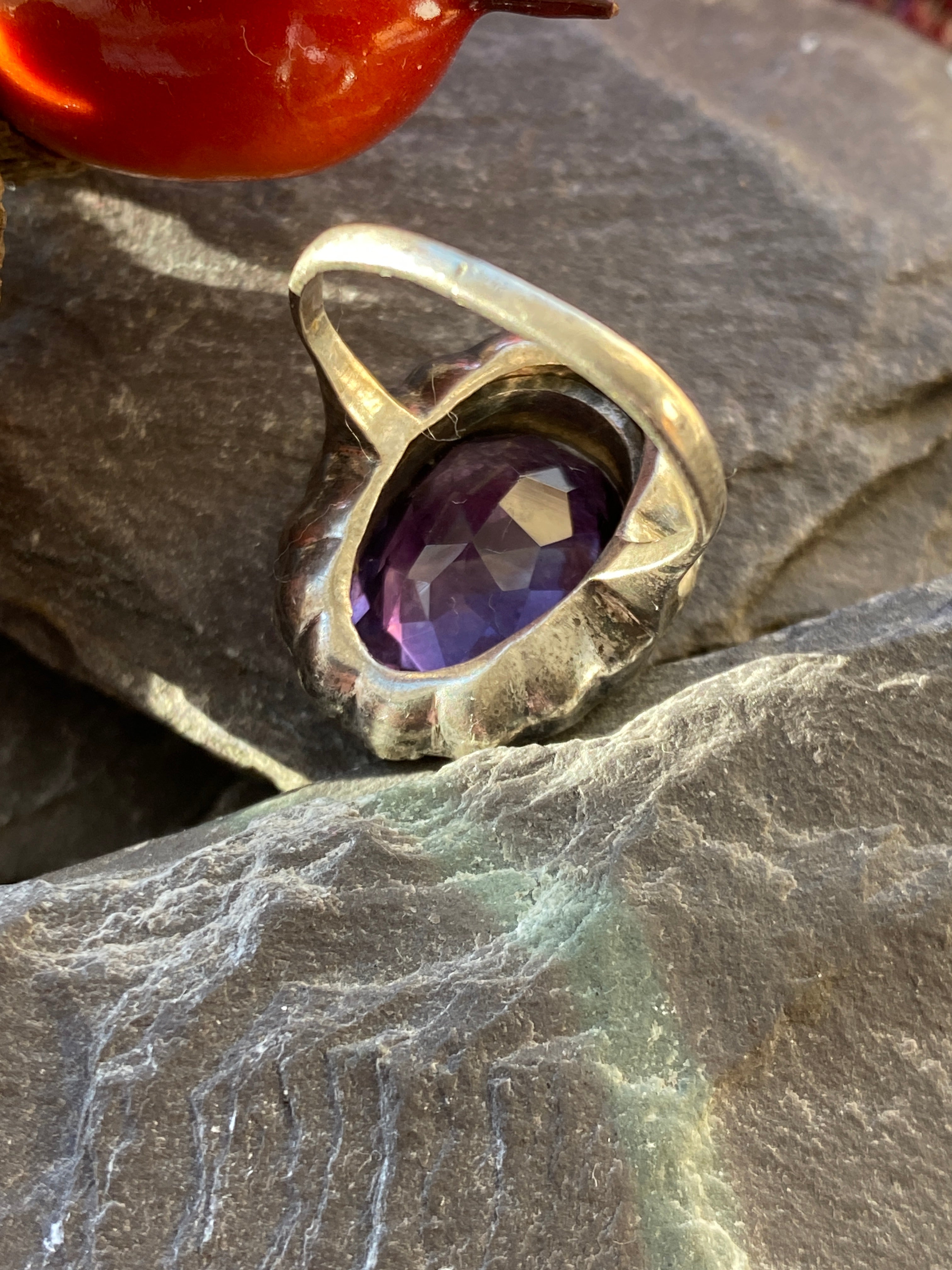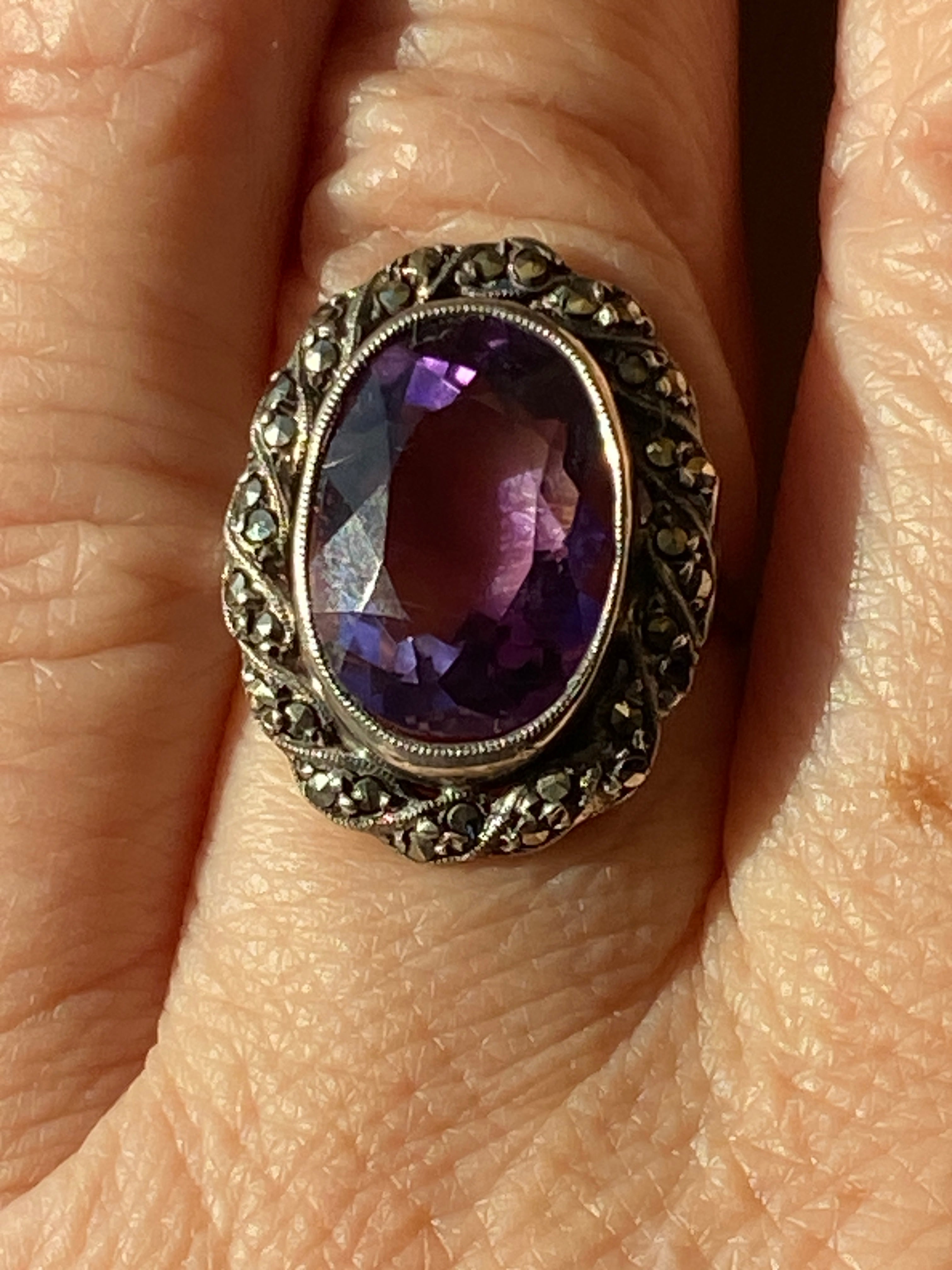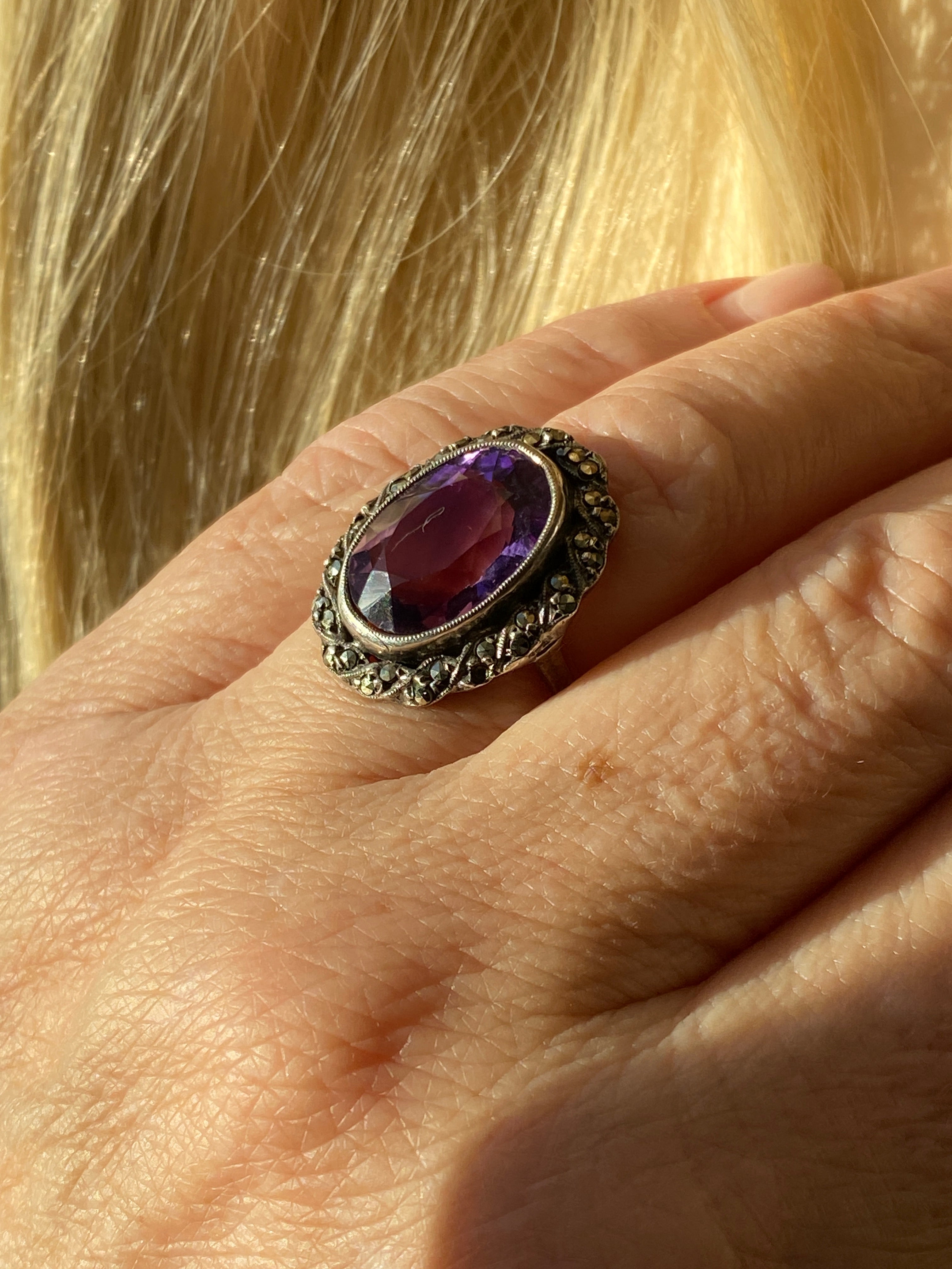 An antique sterling silver ring ring set with a natural Amethyst and surrounded by a marcasite border