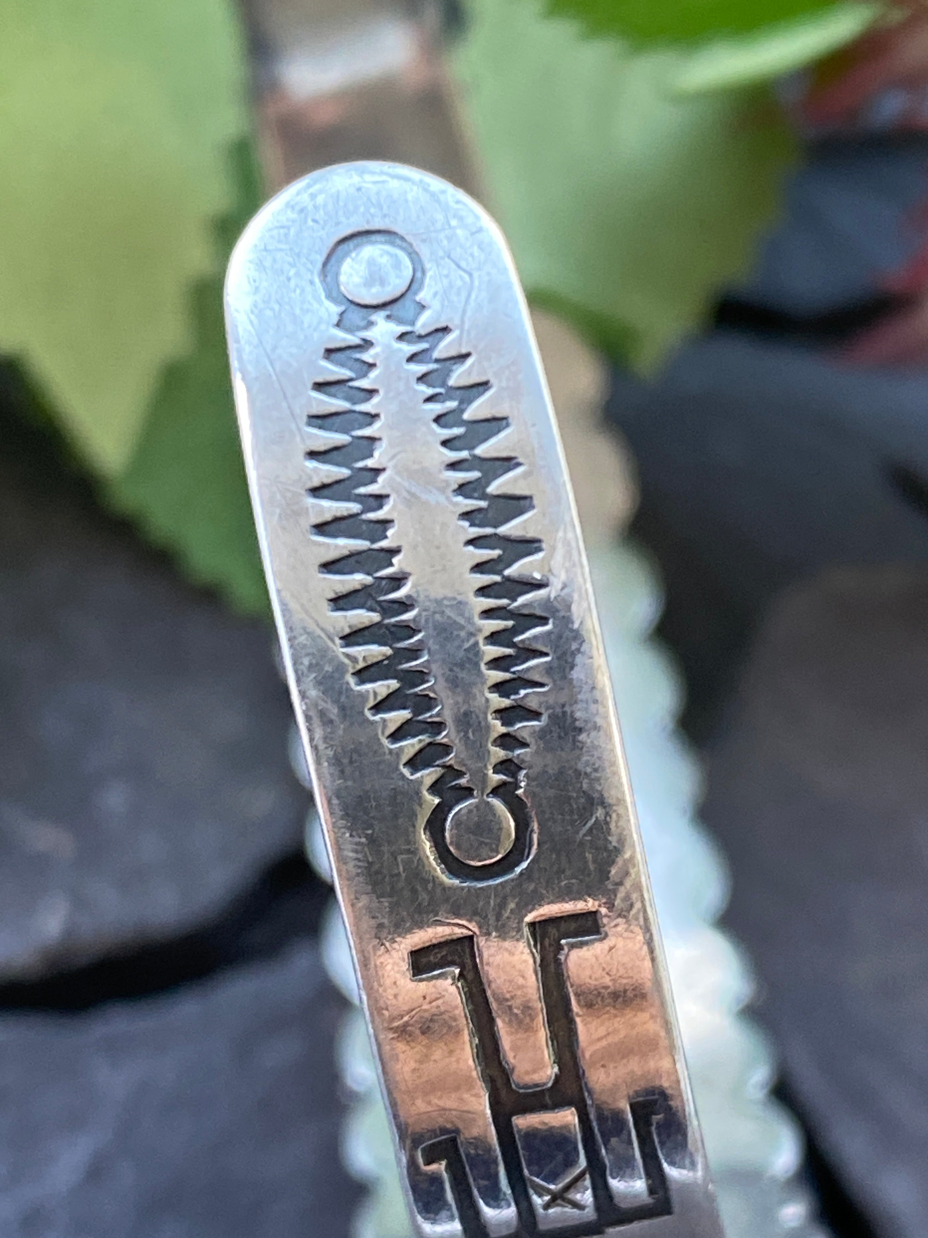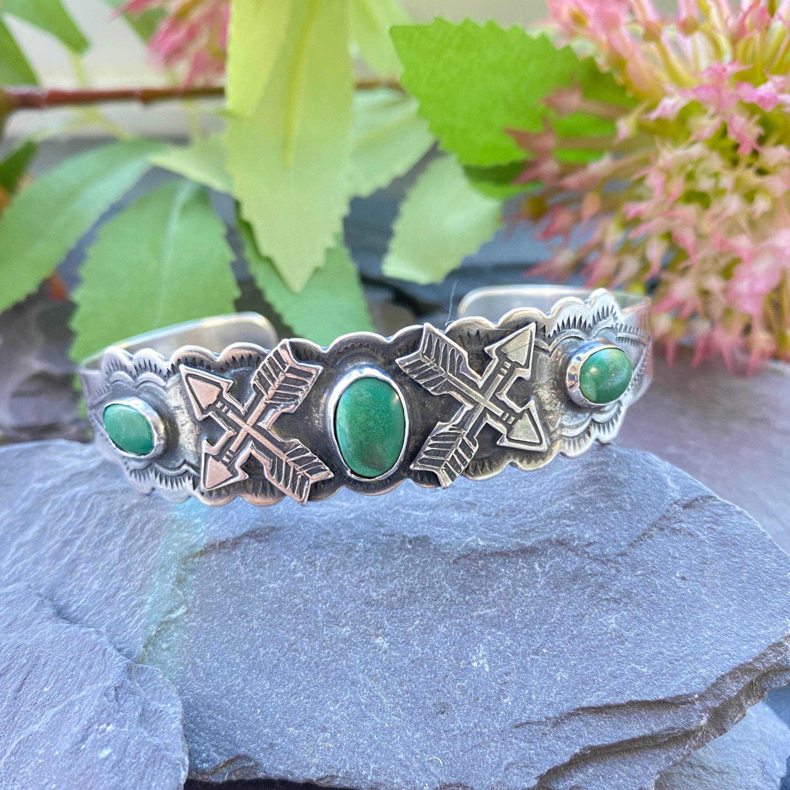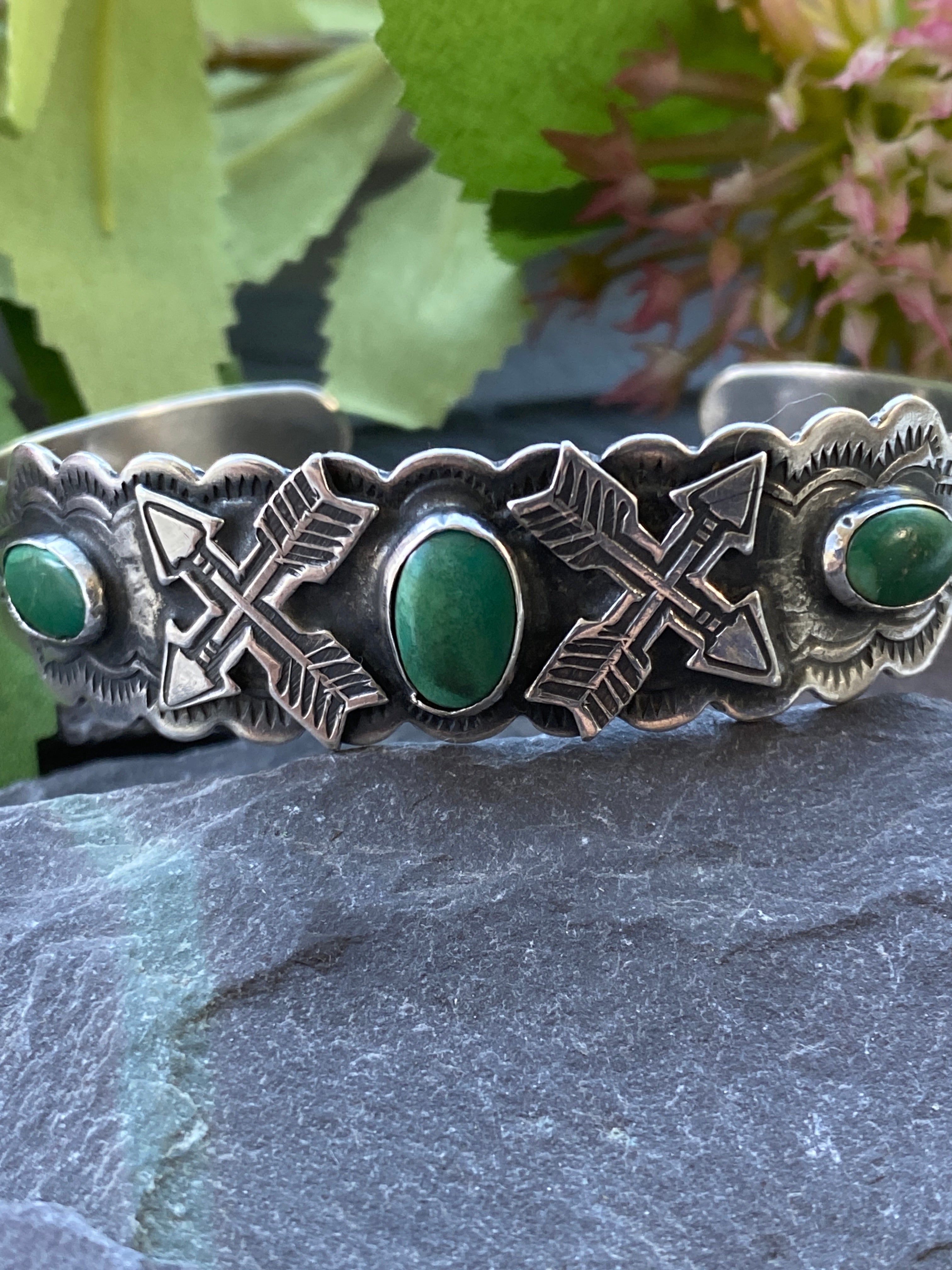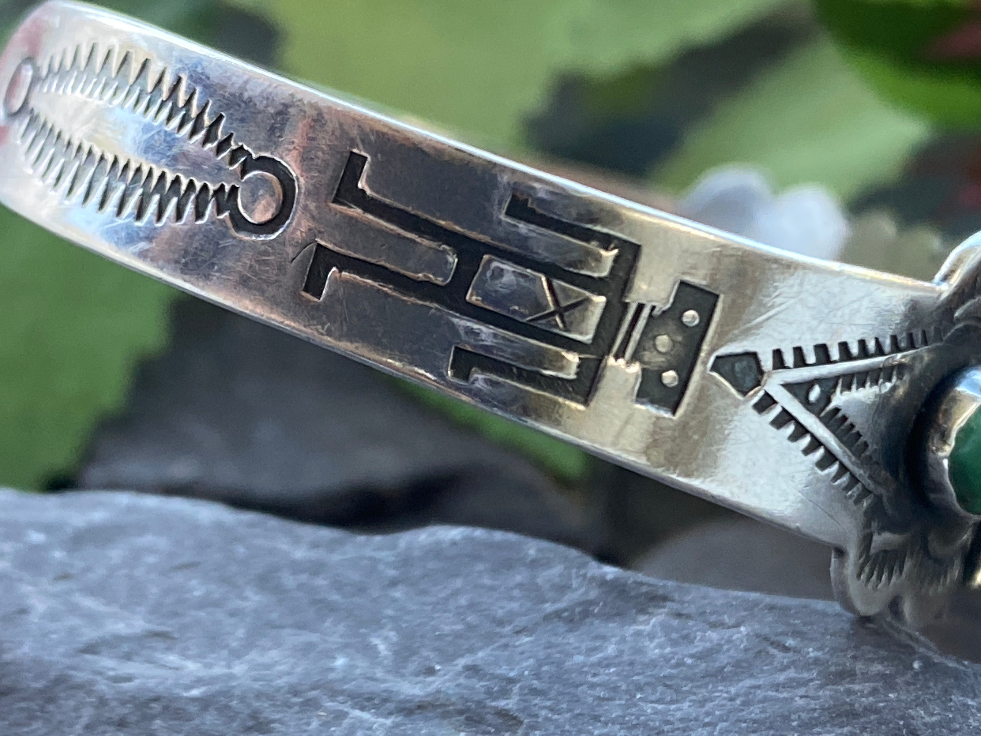 An early piece of Navajo craftsmanship in this lovely coin silver bangle set with natural turquoise stones