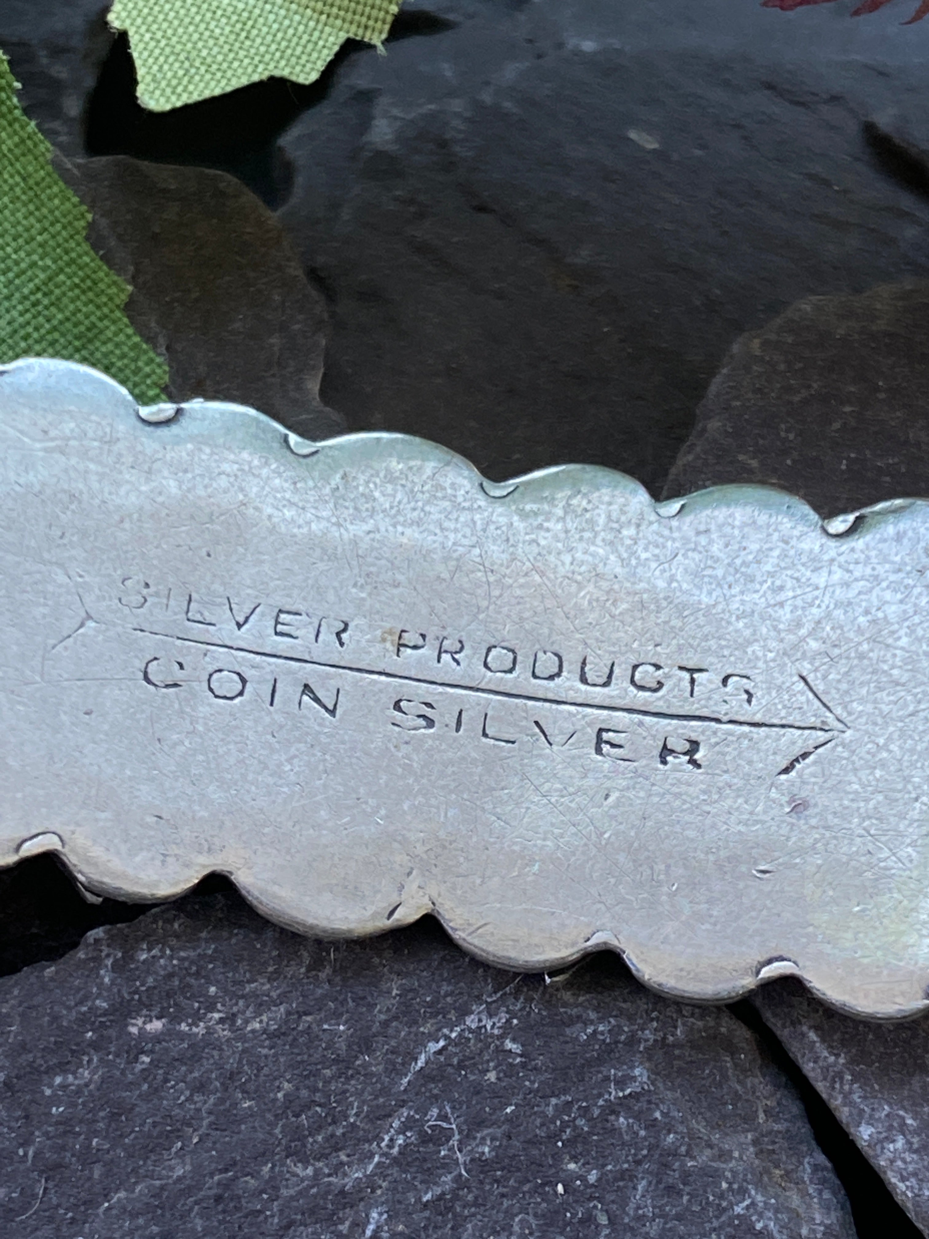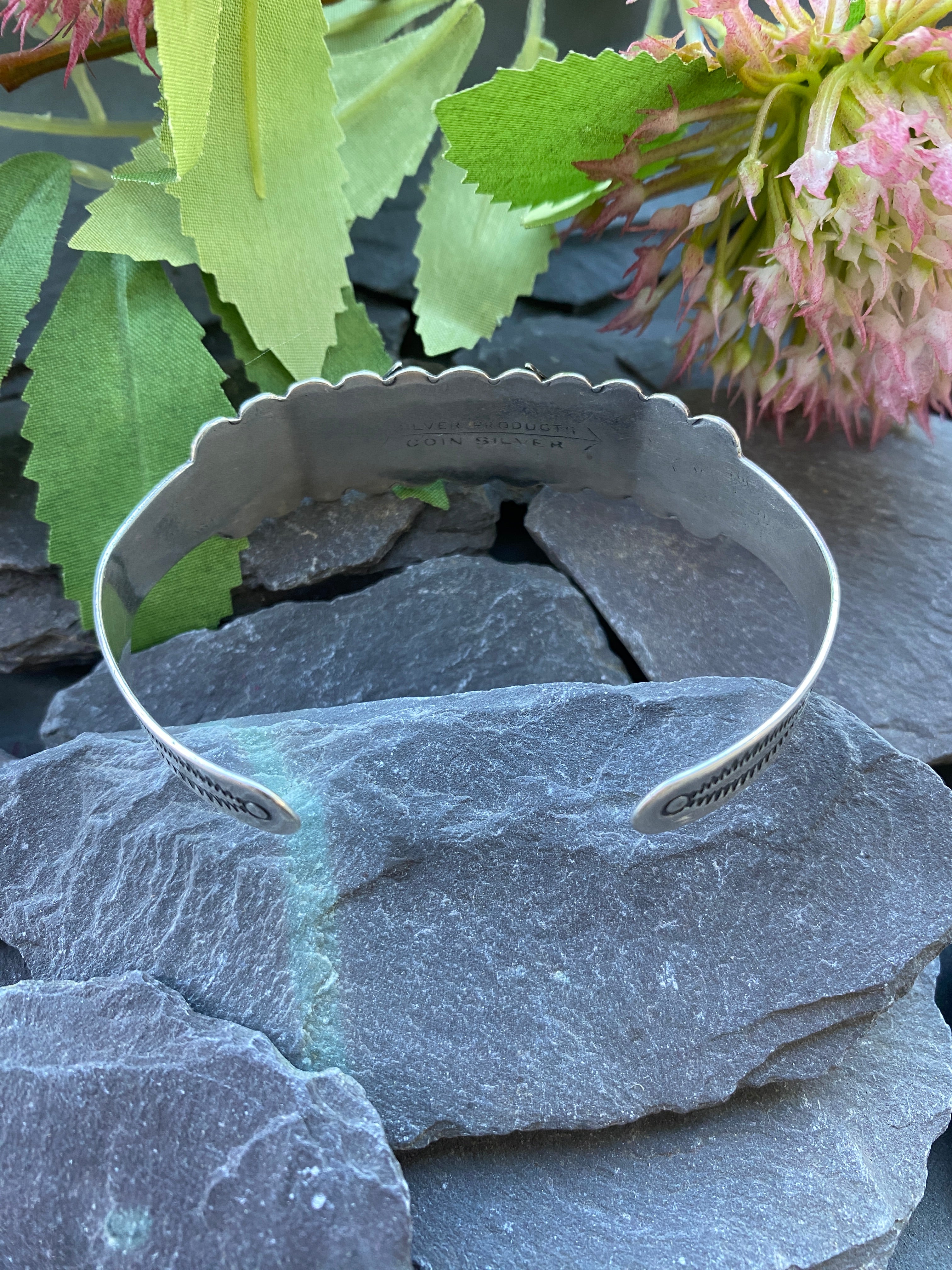 An early piece of Navajo craftsmanship in this lovely coin silver bangle set with natural turquoise stonesCirca 1940Stamped Silver products, coin silver.In good vintage conditionWill fit a standard...