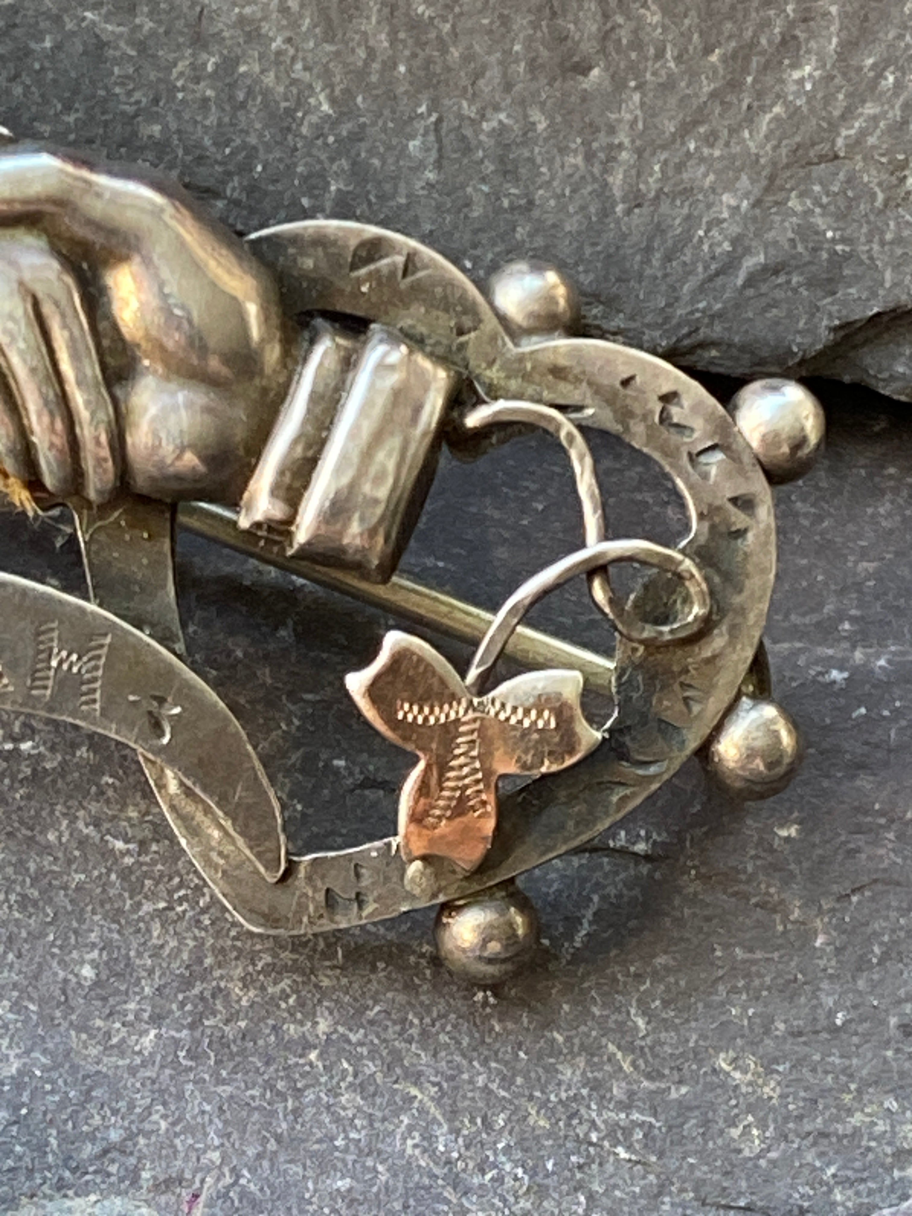 A beautiful example of Antique sentiment jewellery. Set in sterling silver a male and female hand clasp between two hearts with a chased inscription 'Mizpah'.