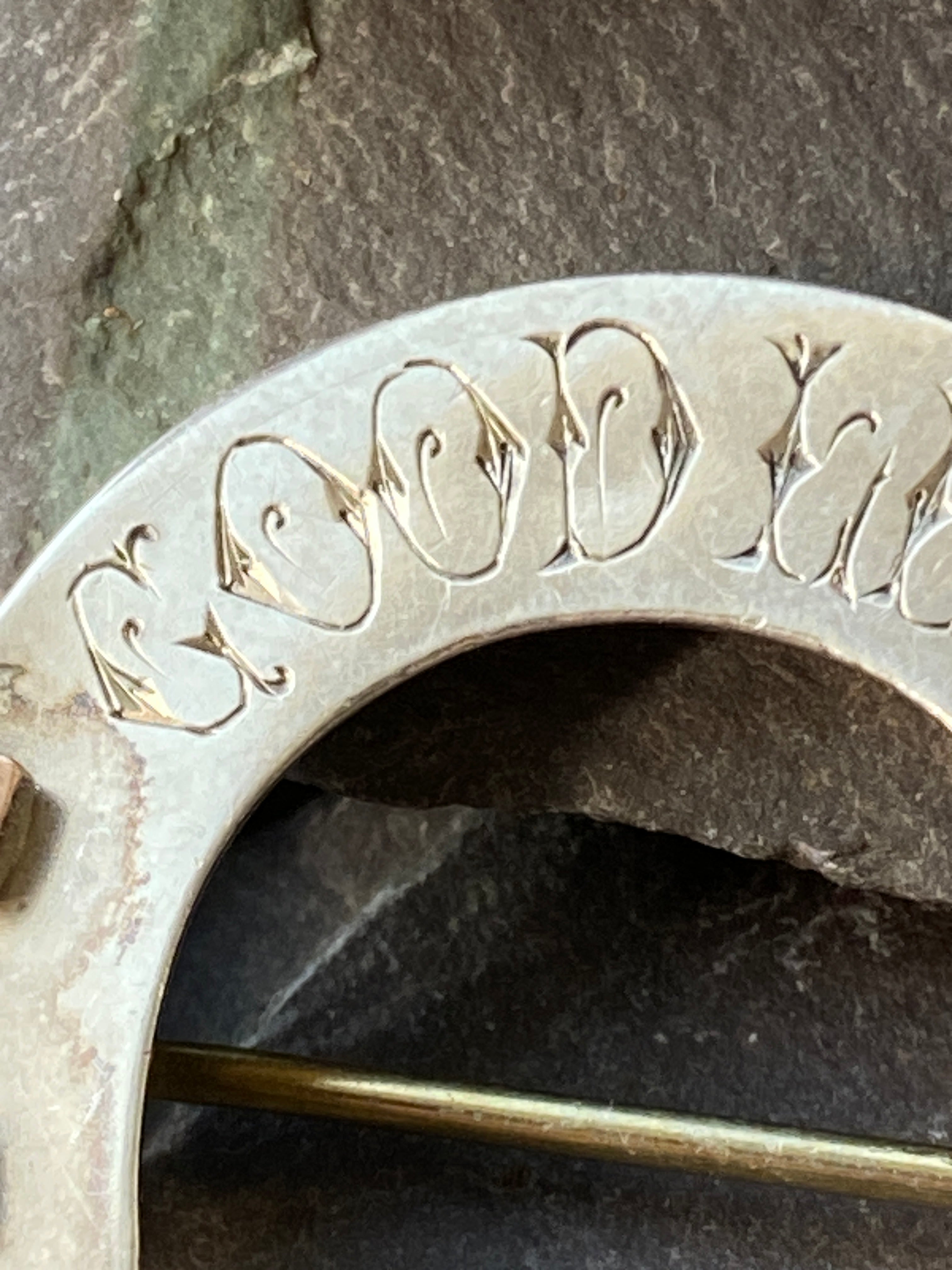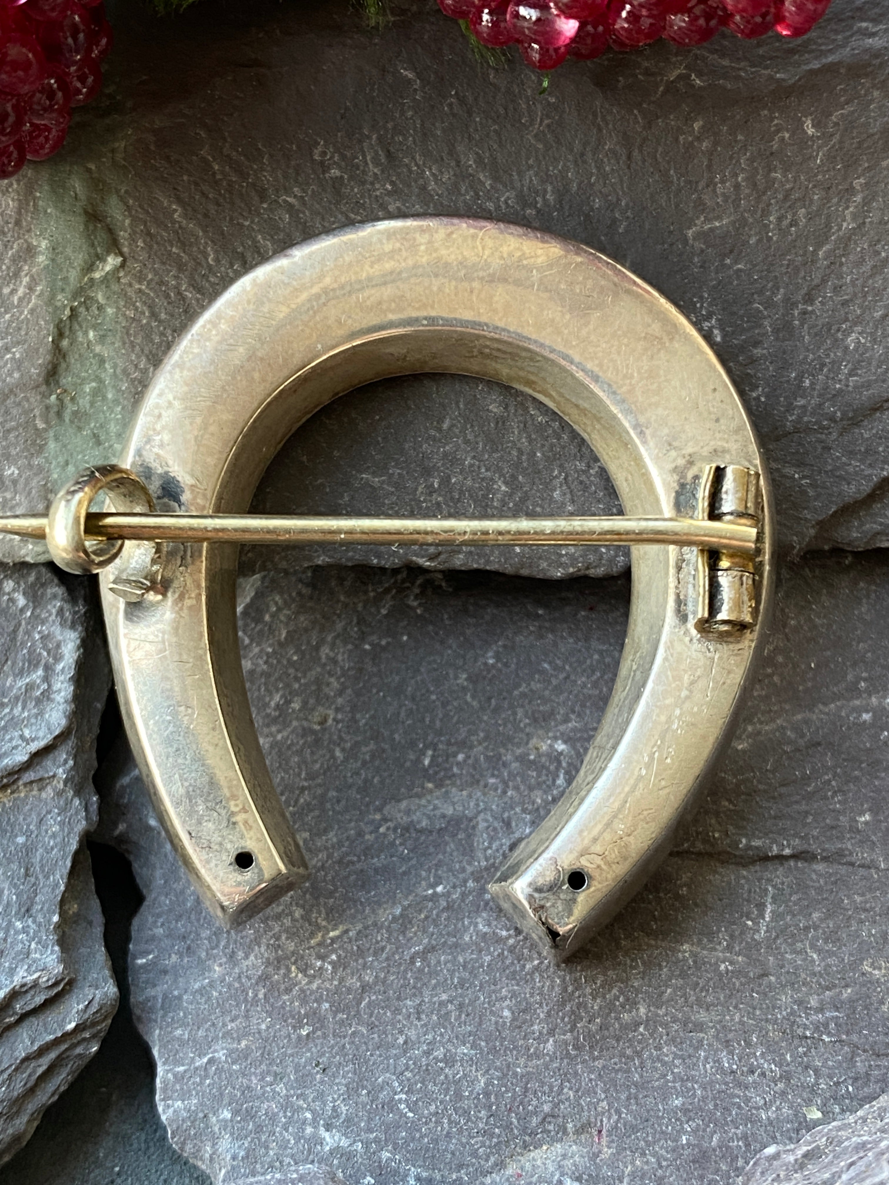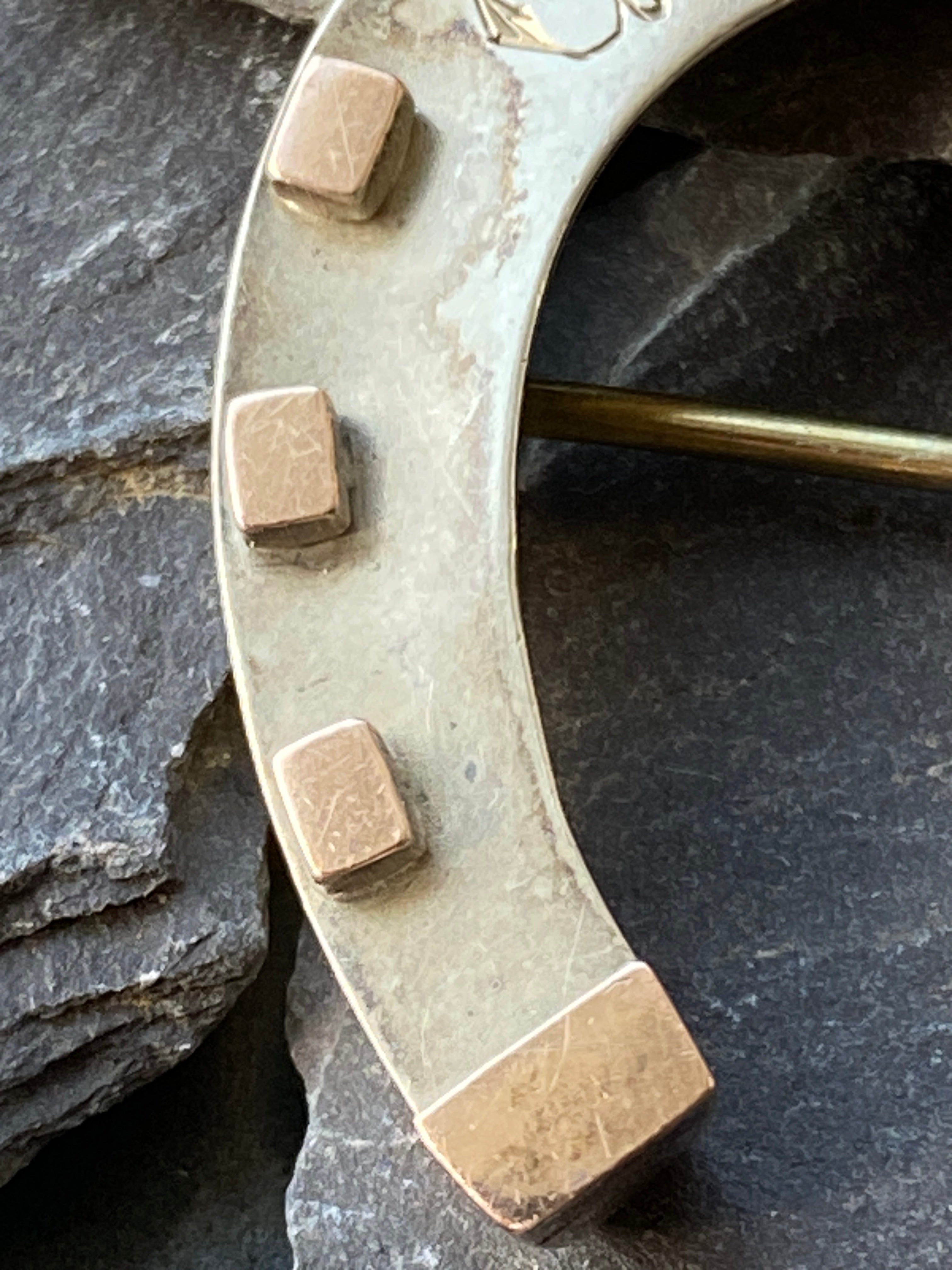 An antique Victorian sterling silver horseshoe brooch with gold accents to the nail heads.