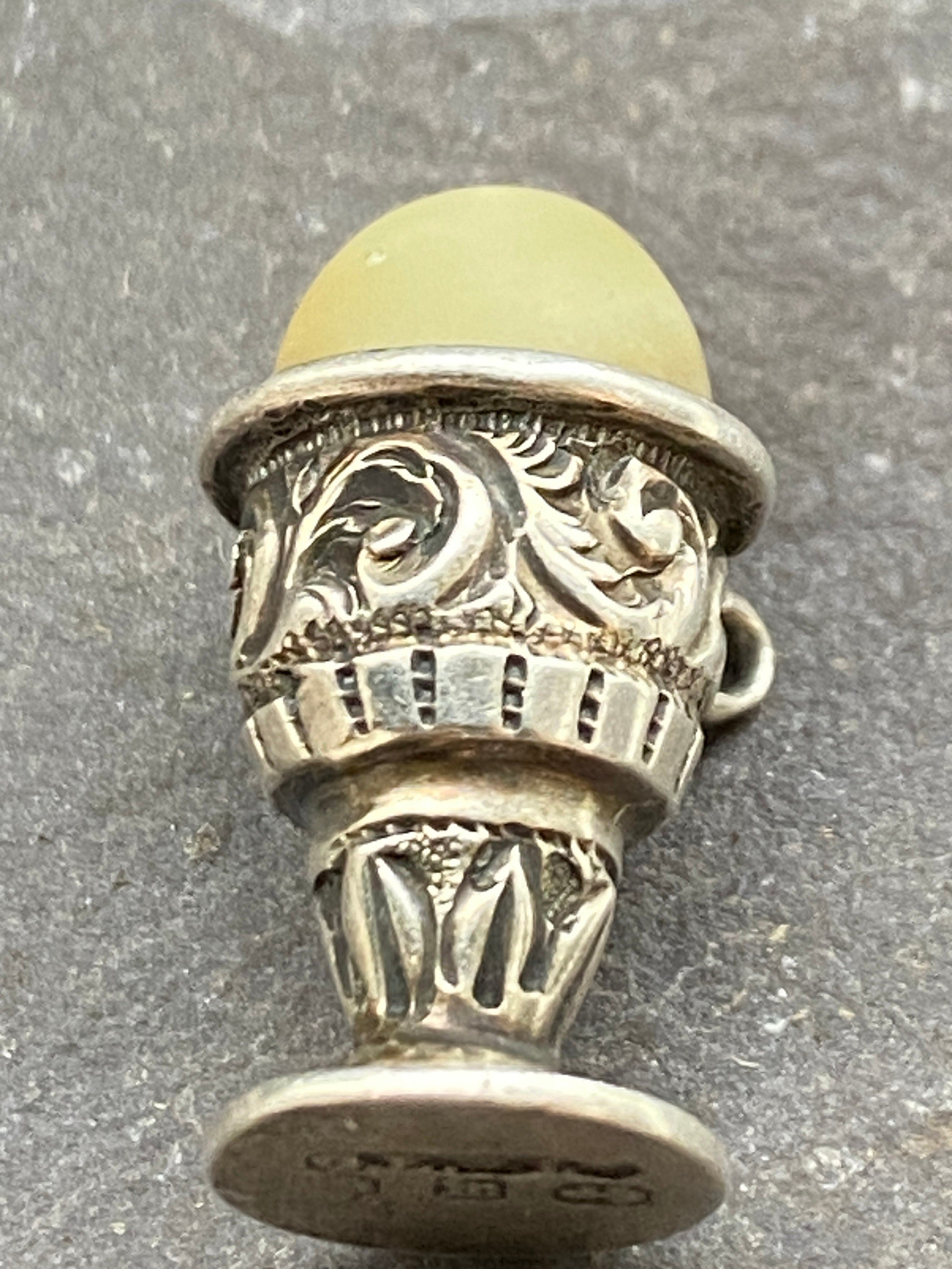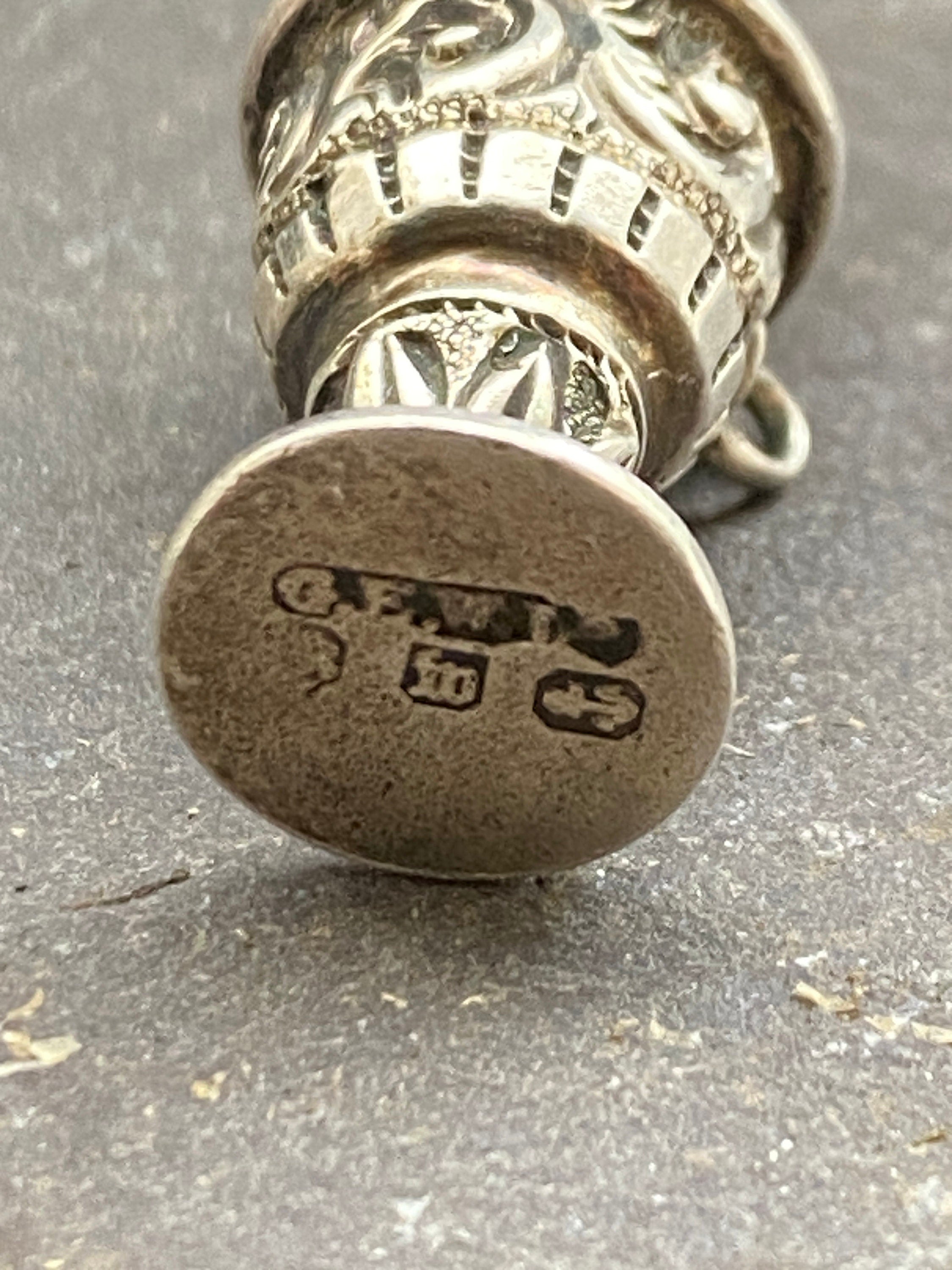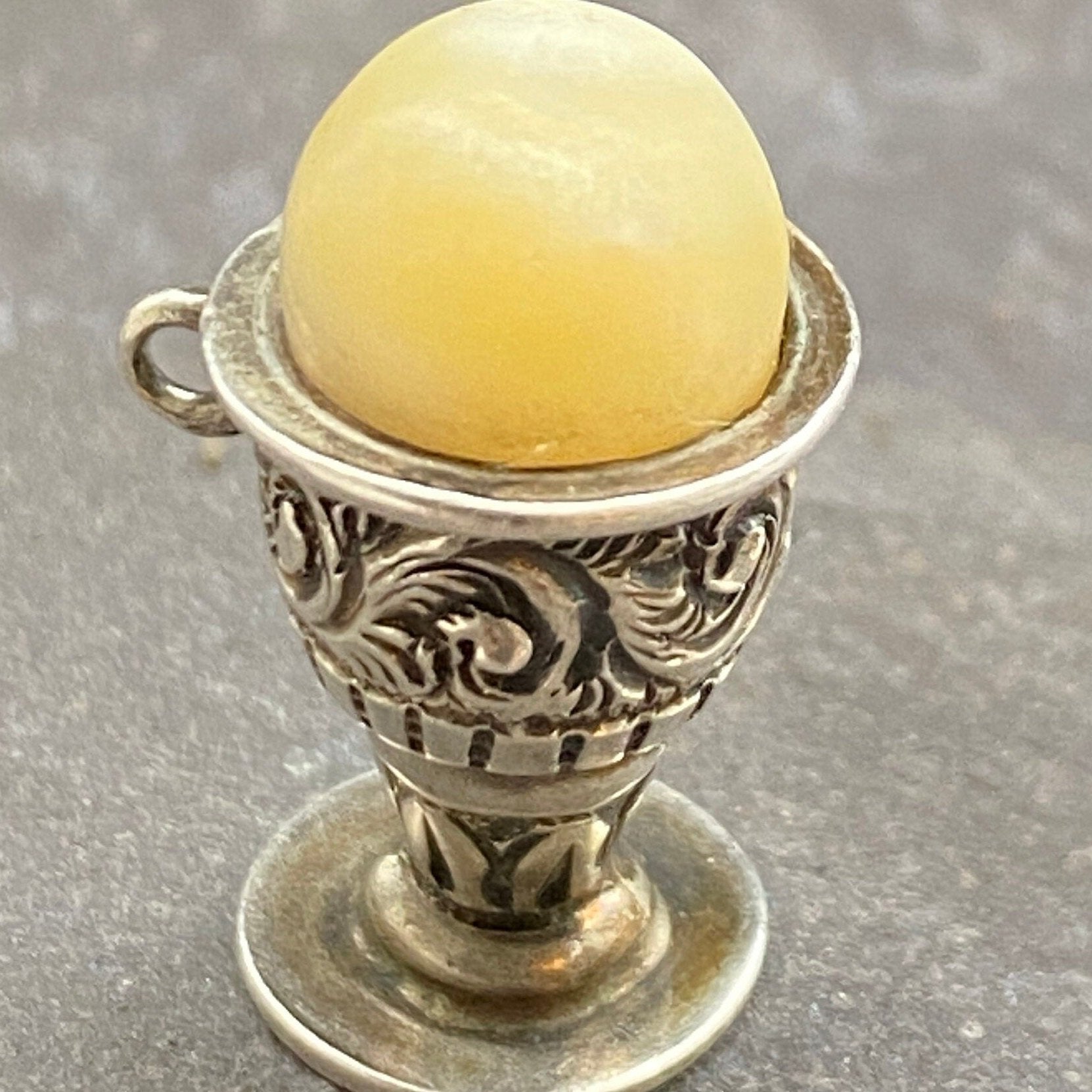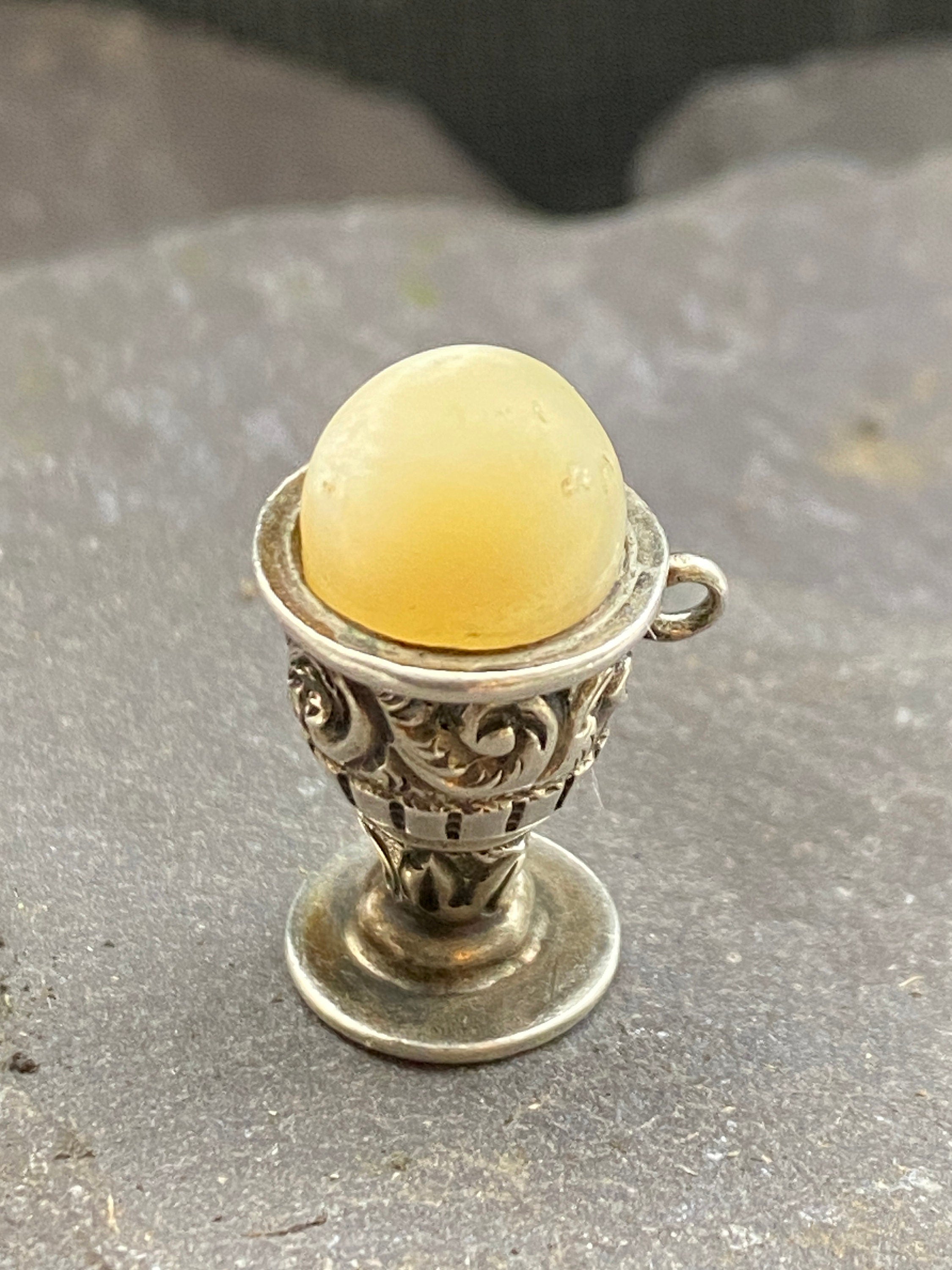 A beautiful and rare sterling silver Antique Victorian charm of an embossed eggcup with mother of pearl 'Egg'