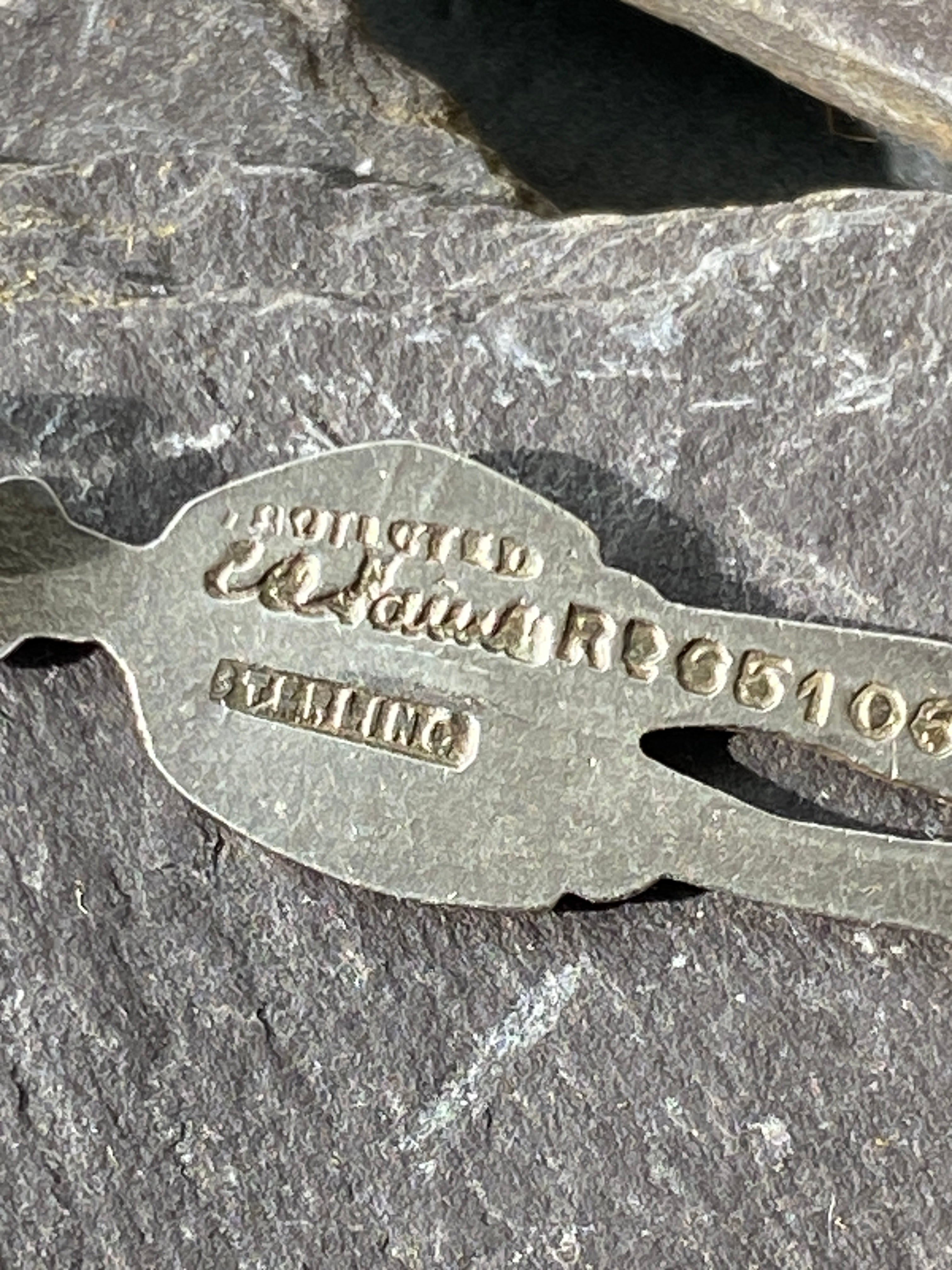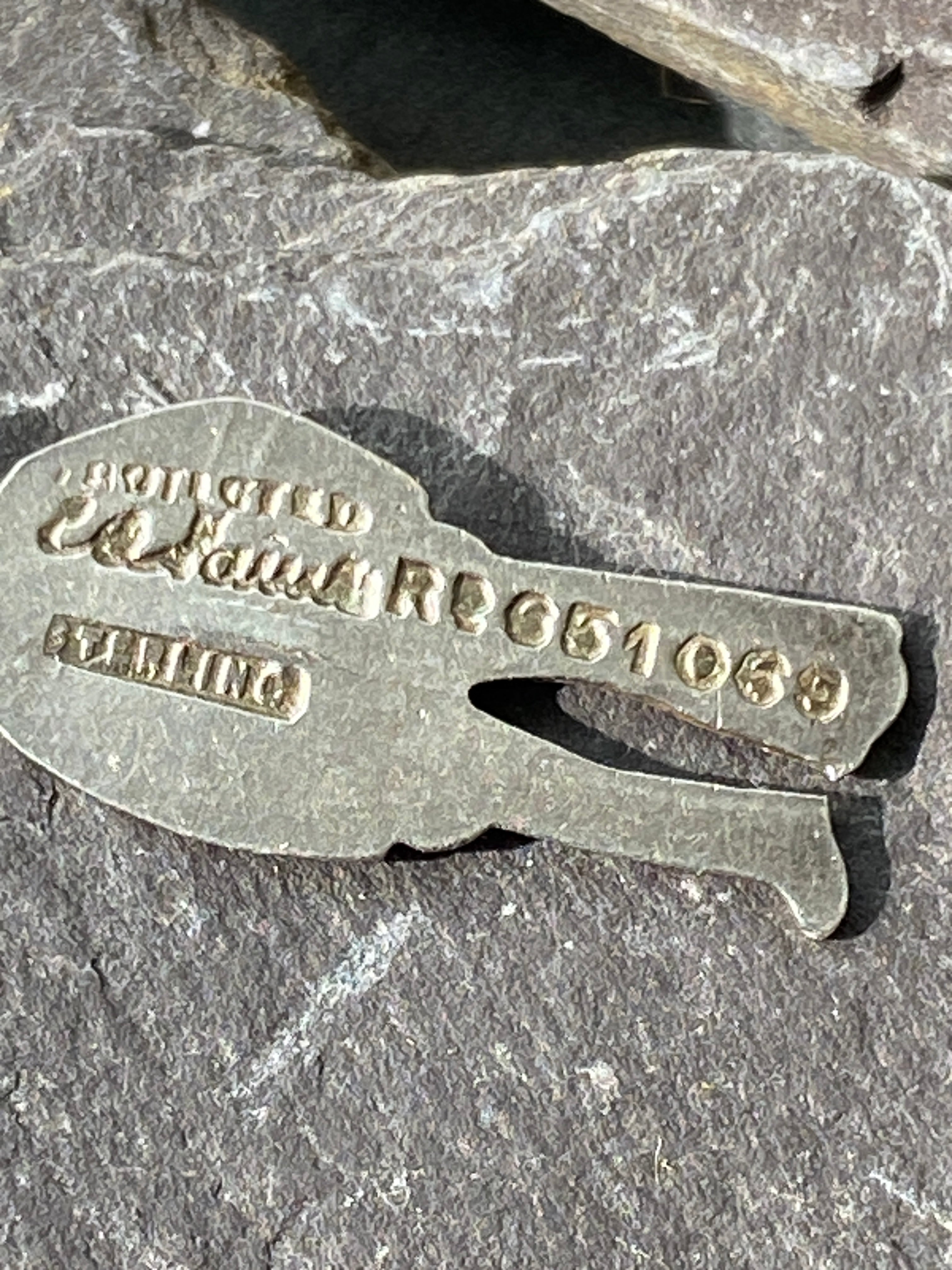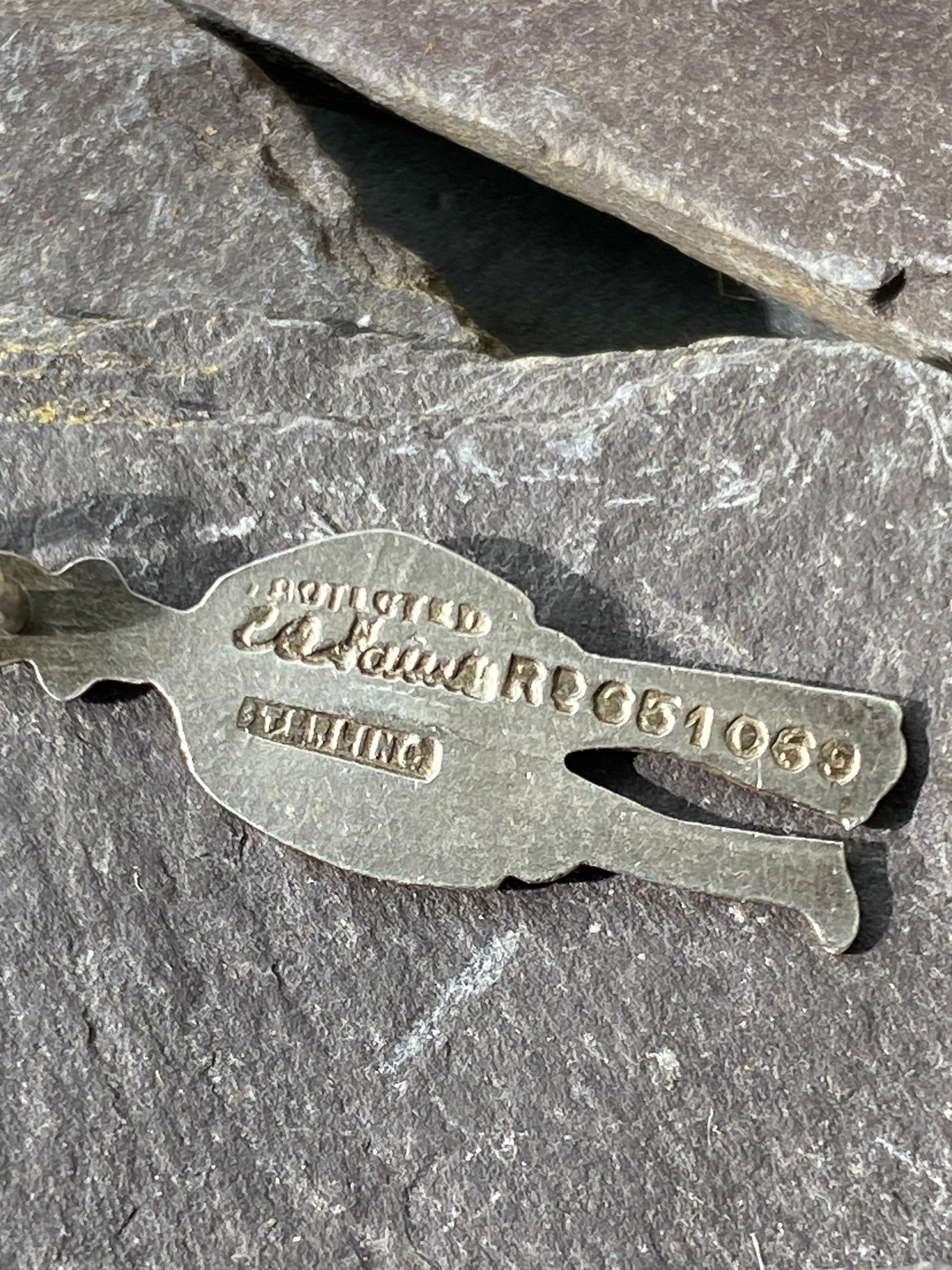 Stamped sterling, protected and registered design number. Also has the makers mark