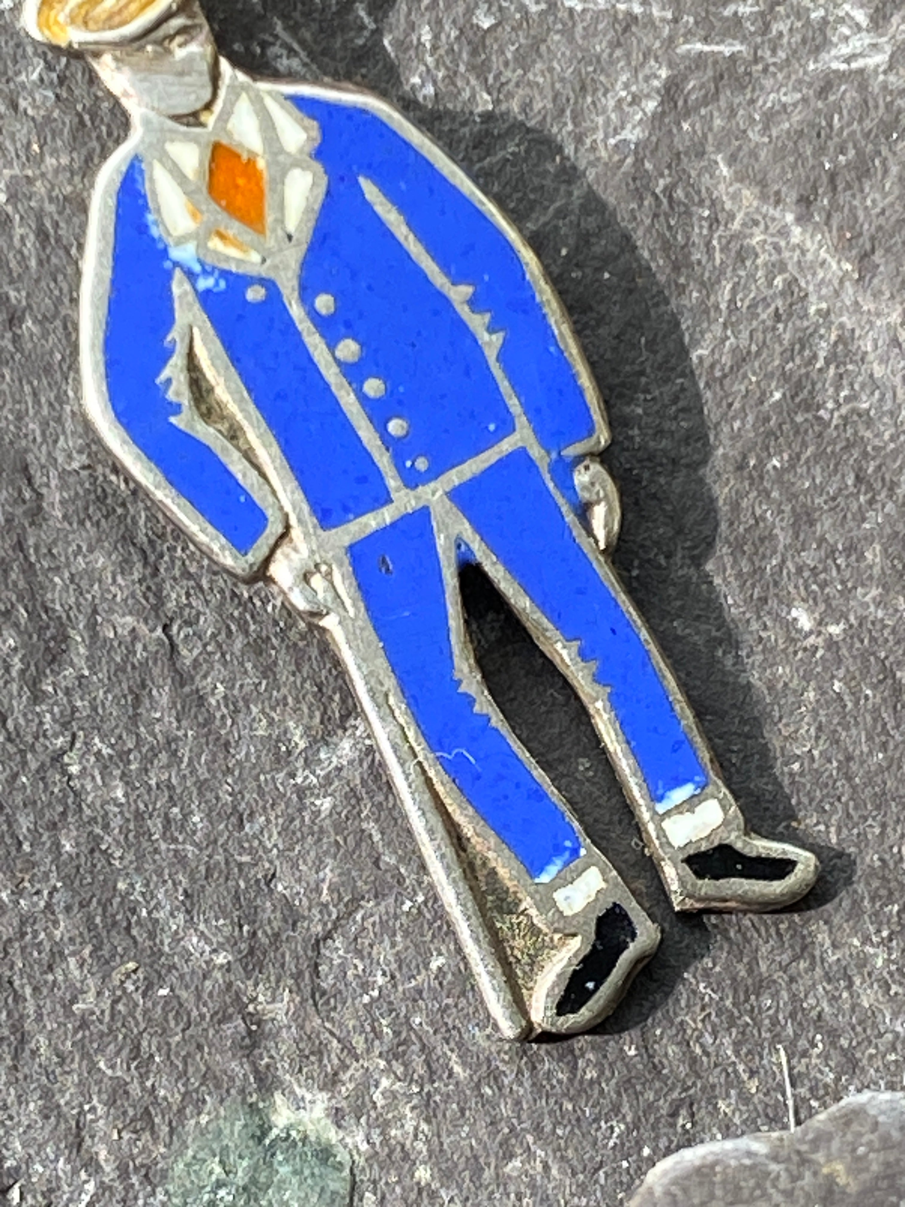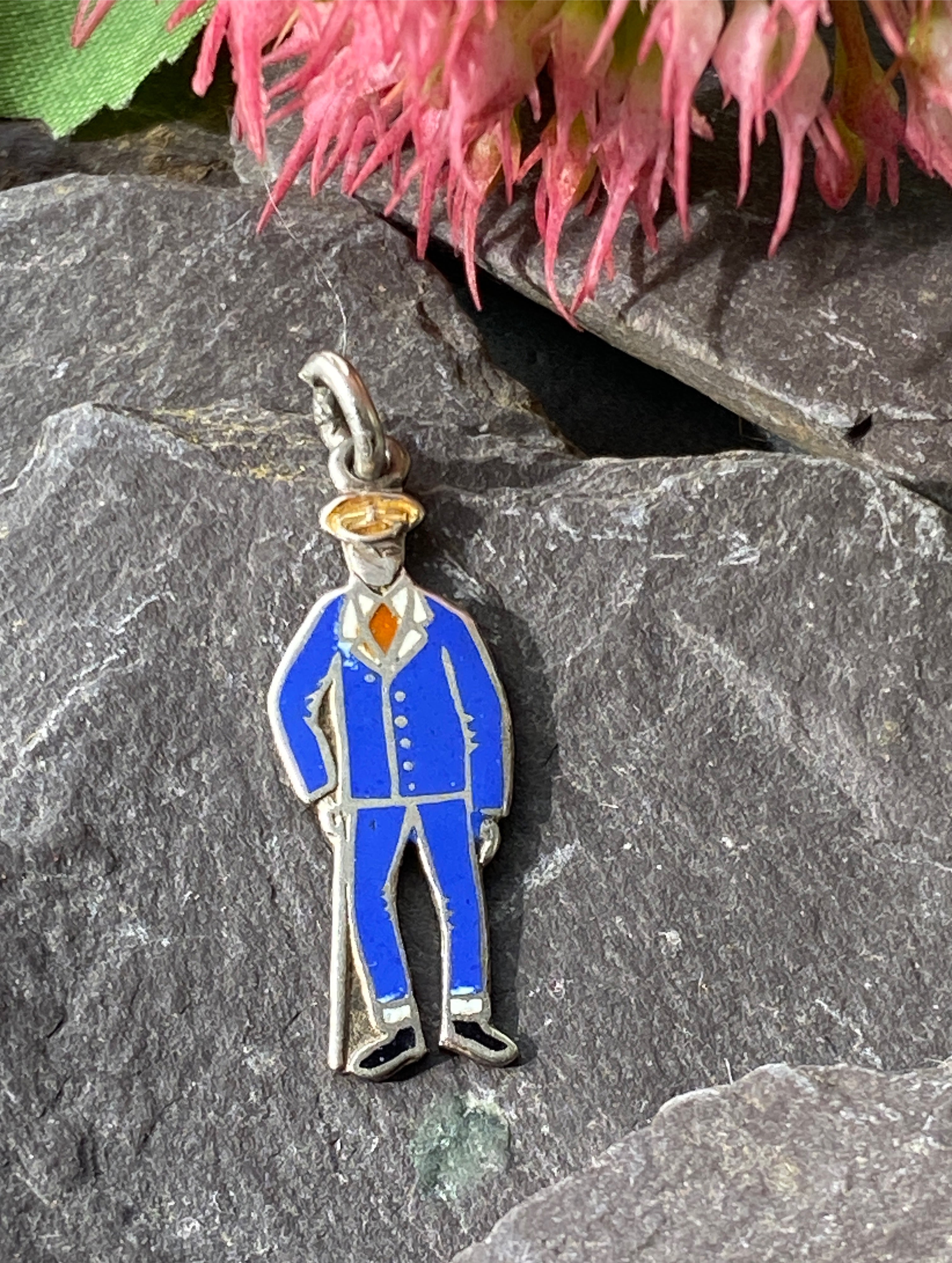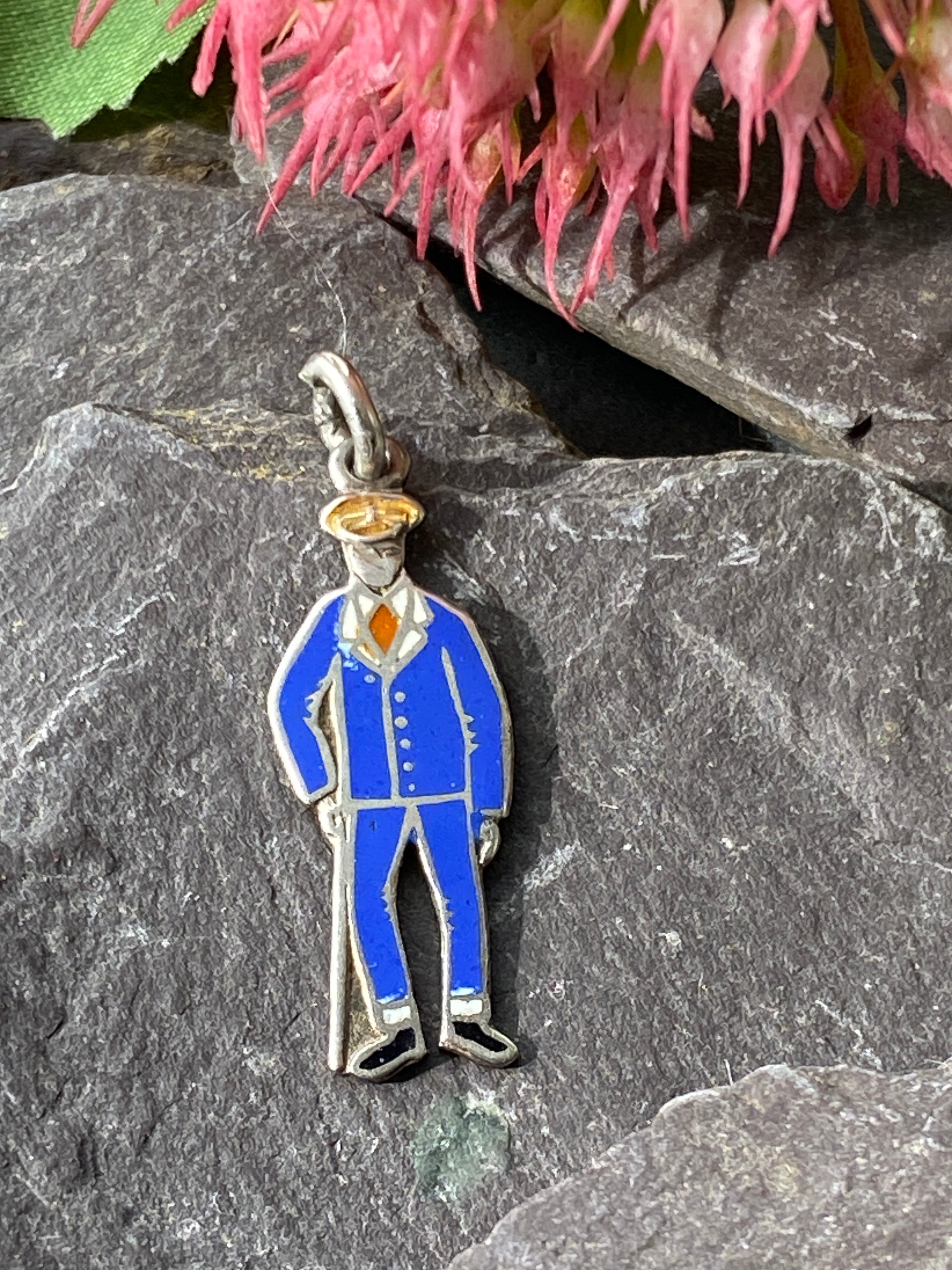 A rare sterling silver and enamel charm featuring a wounded soldier from WW1 in hospital blues.