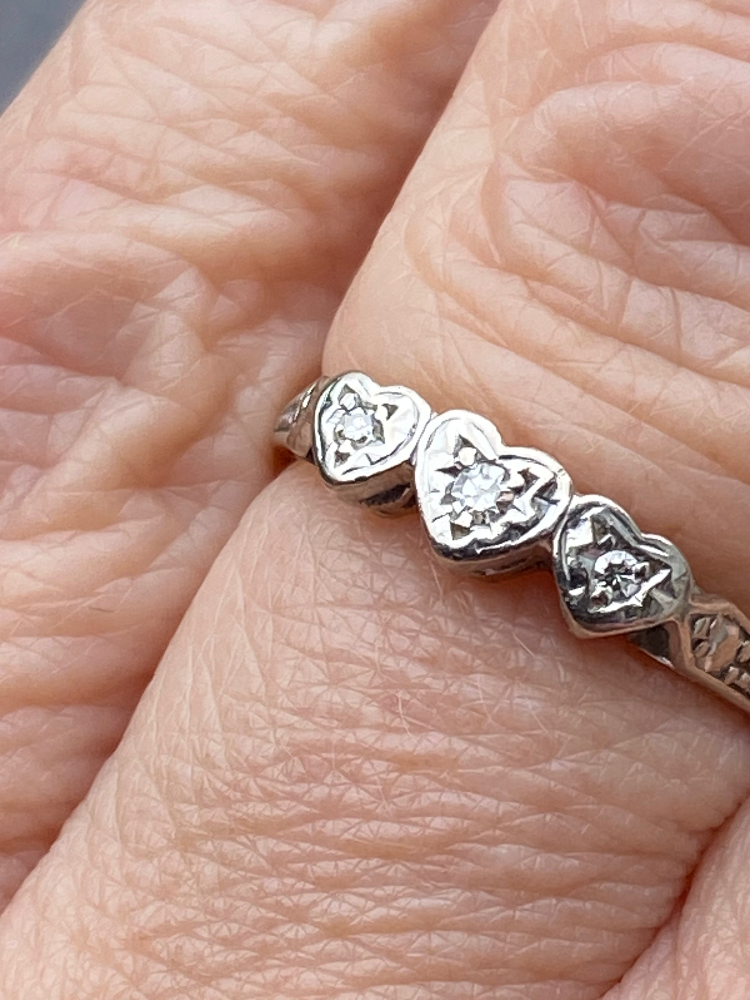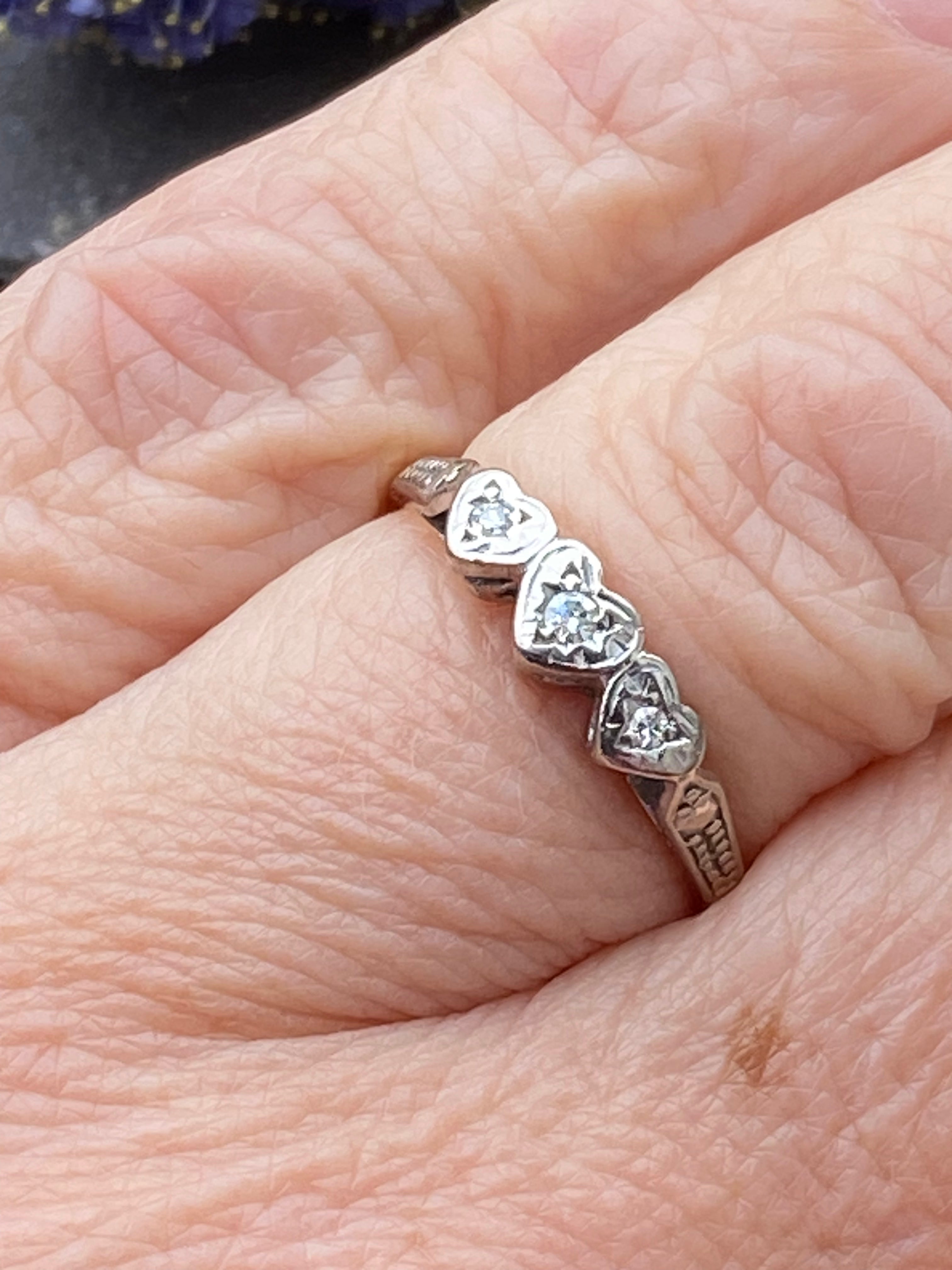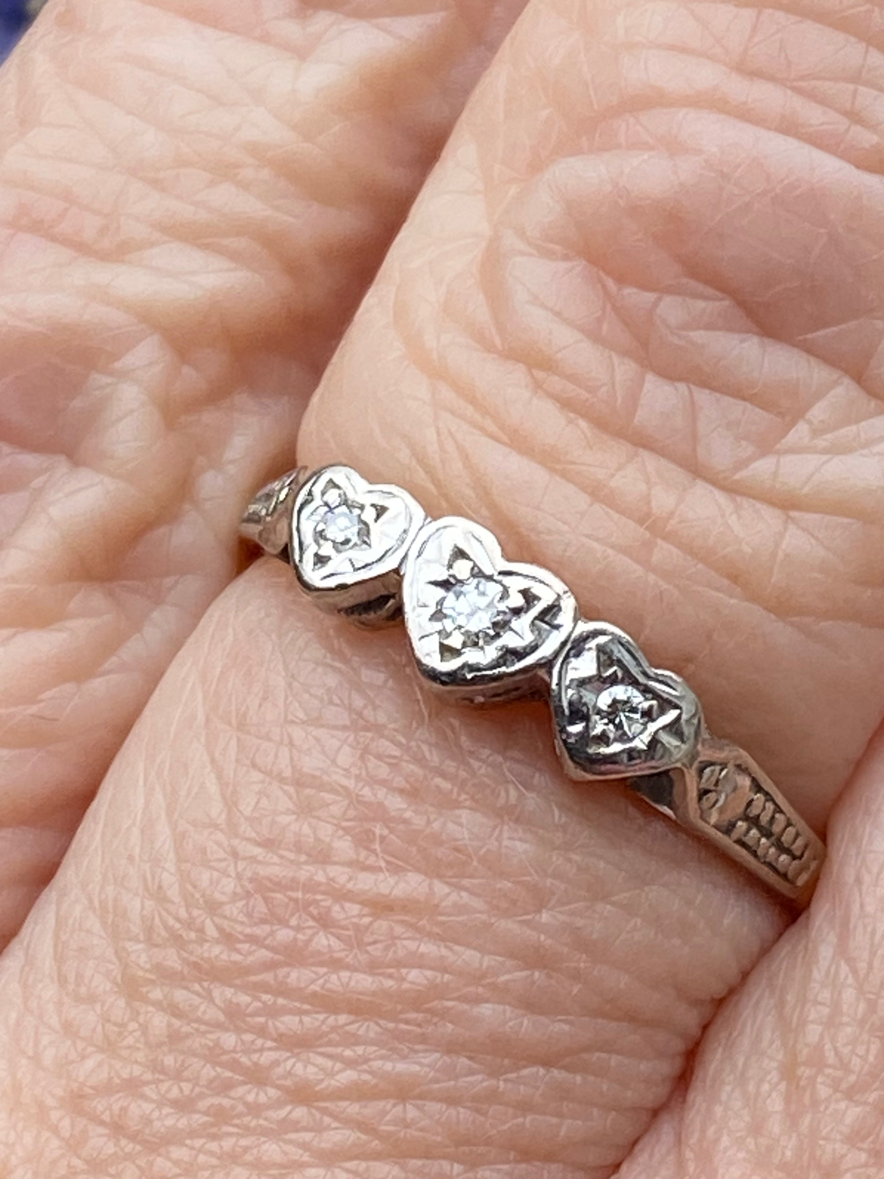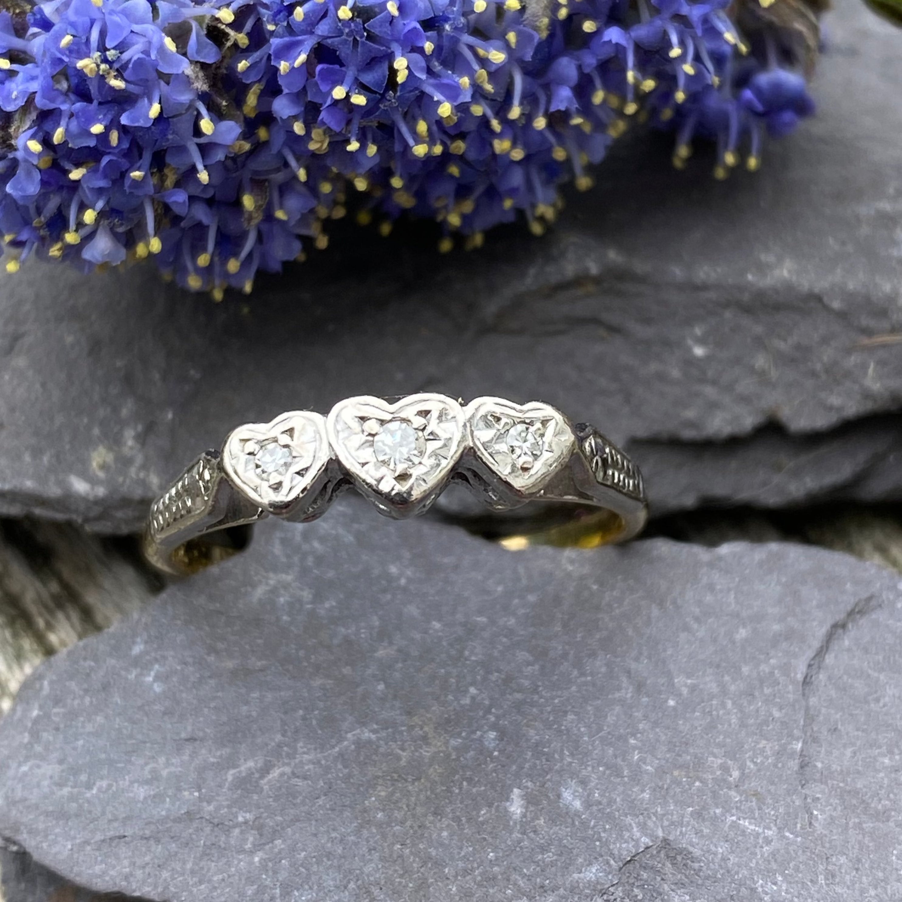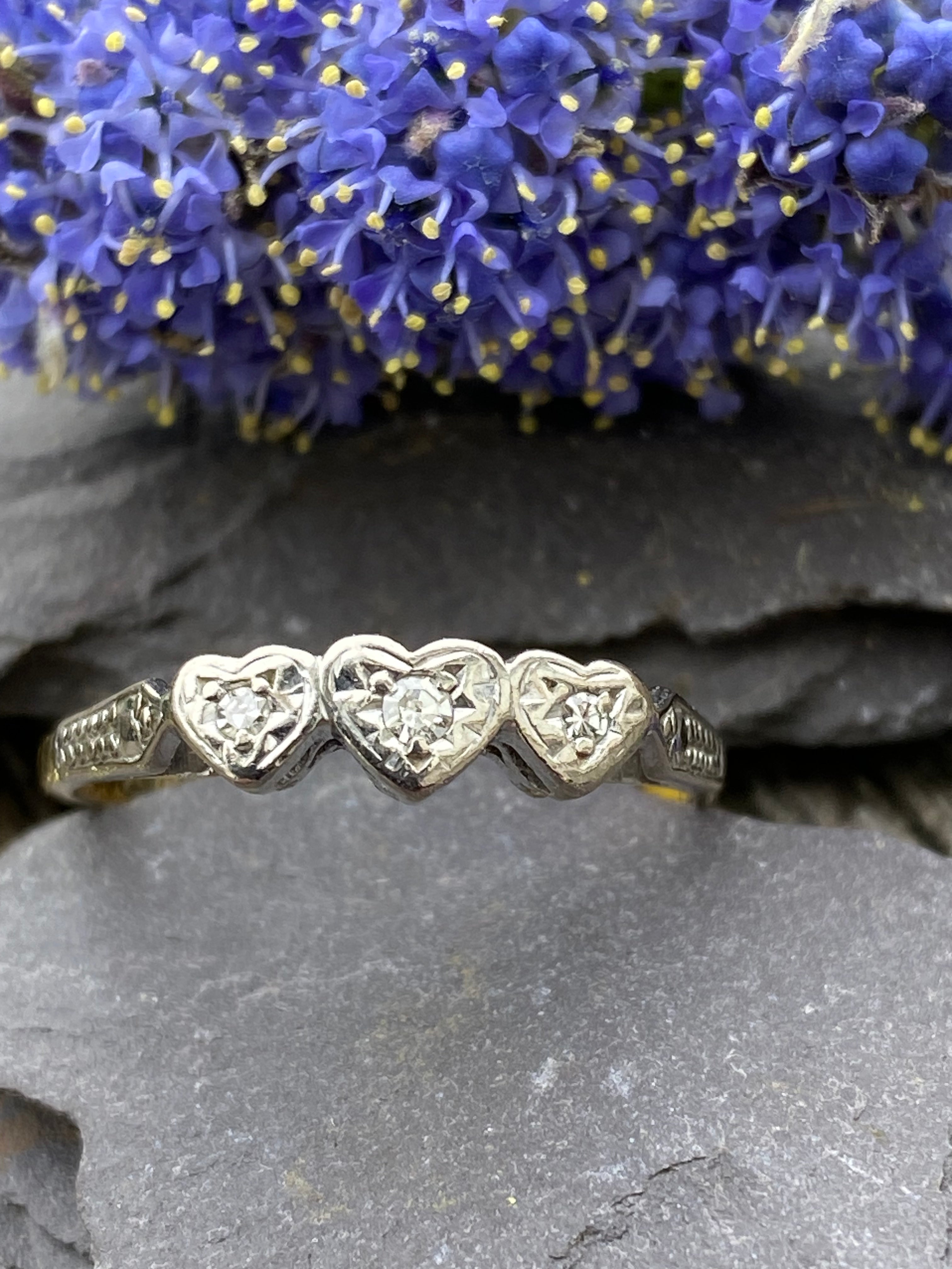An Art Deco ring from the 1930's featuring a setting of three hearts in platinum adorned with round brilliant Diamonds. Lovely detail to this sentimental ring. 18ct yellow gold shank. Stamped 18ct & Plat and a registered design number. In excellent condition. Will arrive gift boxed. Free tracked shipping/ UK next day delivery.