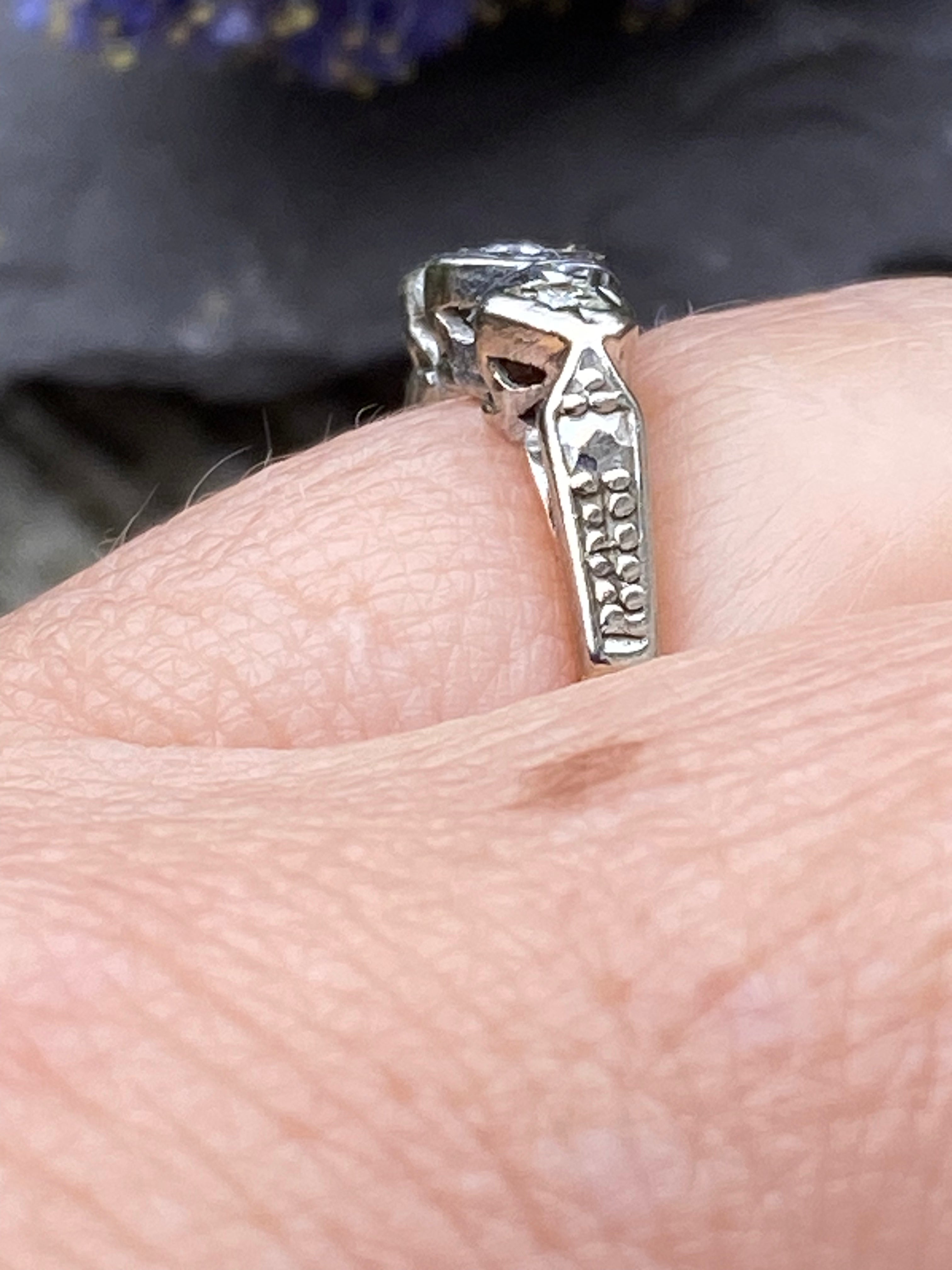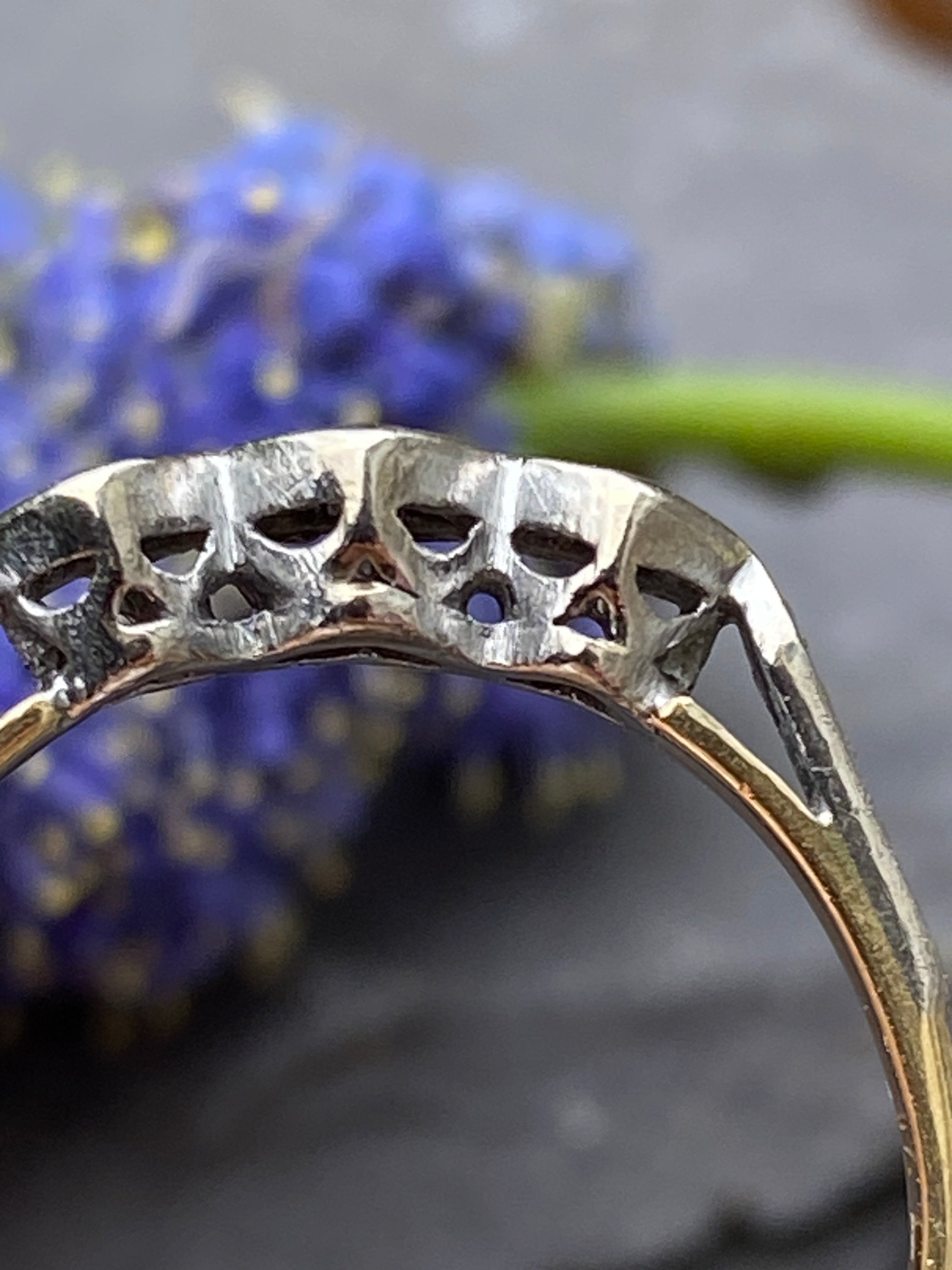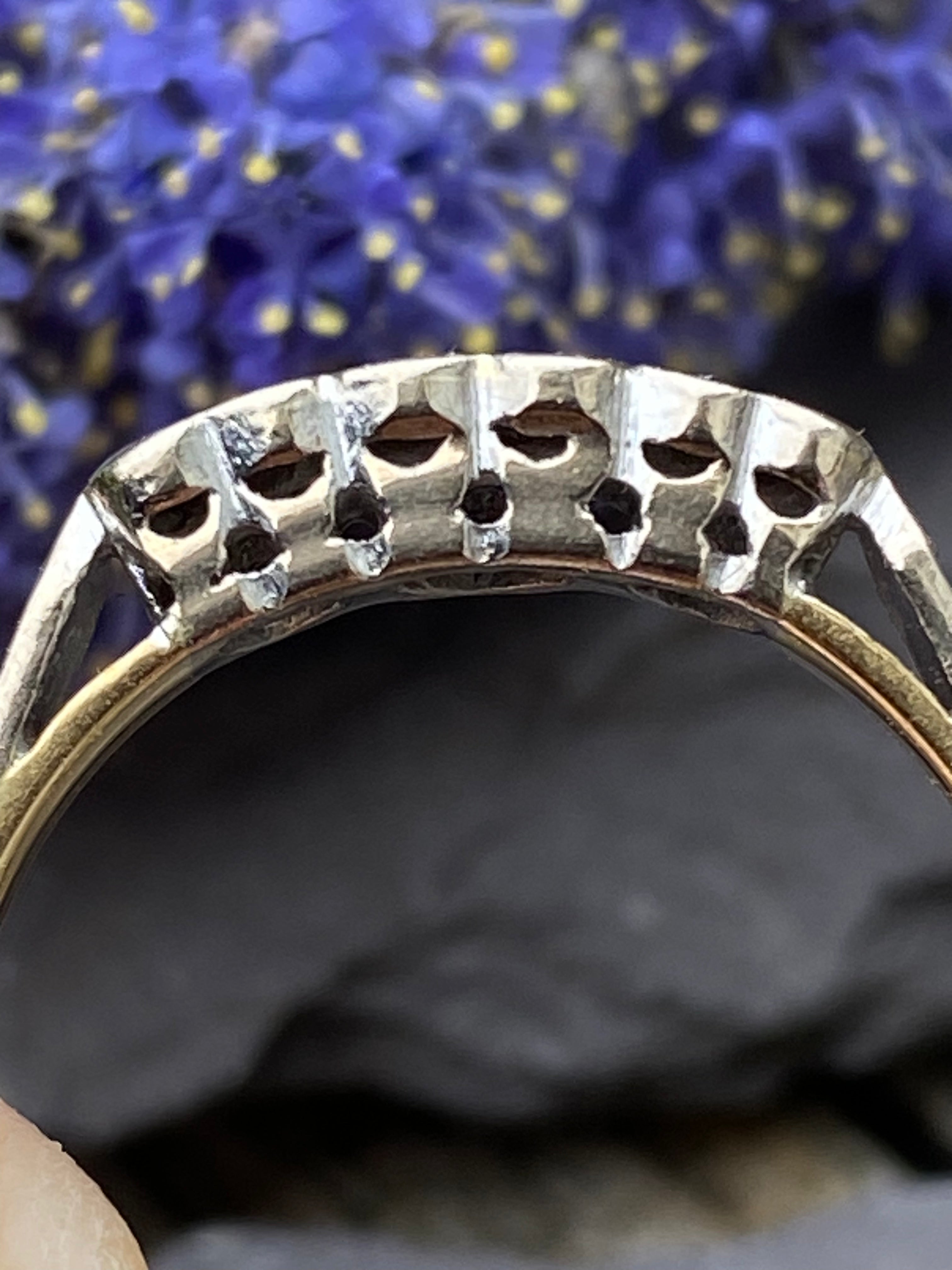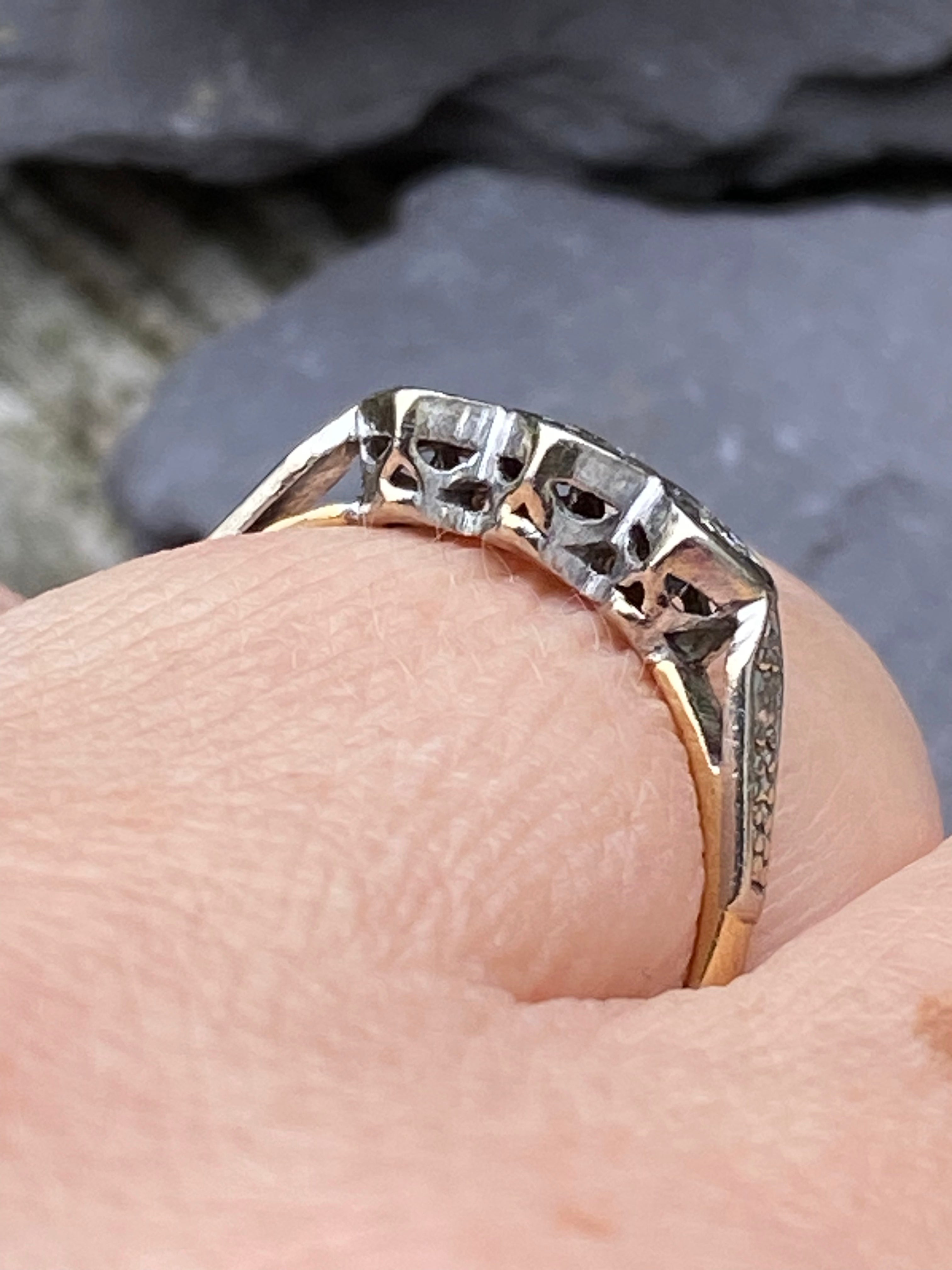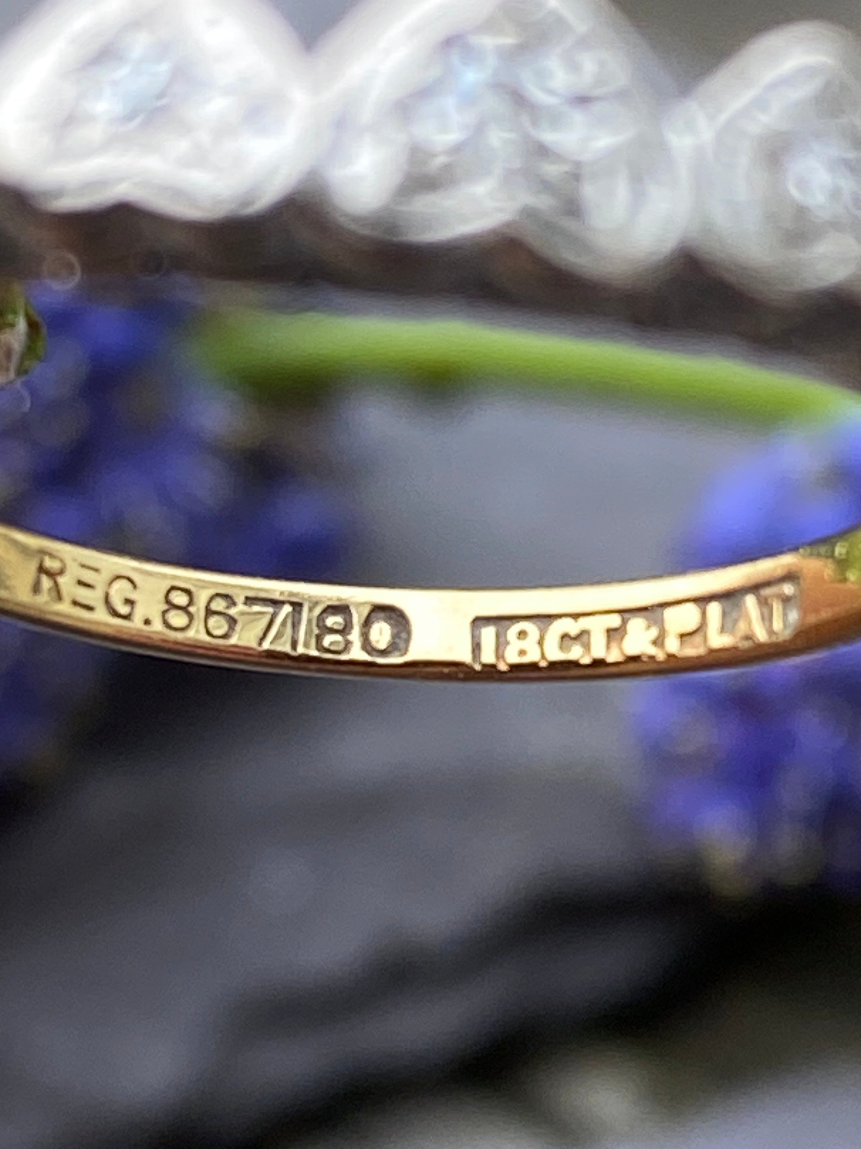 An Art Deco ring from the 1930's featuring a setting of three hearts in platinum adorned with round brilliant Diamonds. Lovely detail to this sentimental ring. 18ct yellow gold shank. Stamped 18ct & Plat and a registered design number. In excellent condition. Will arrive gift boxed. Free tracked shipping/ UK next day delivery.