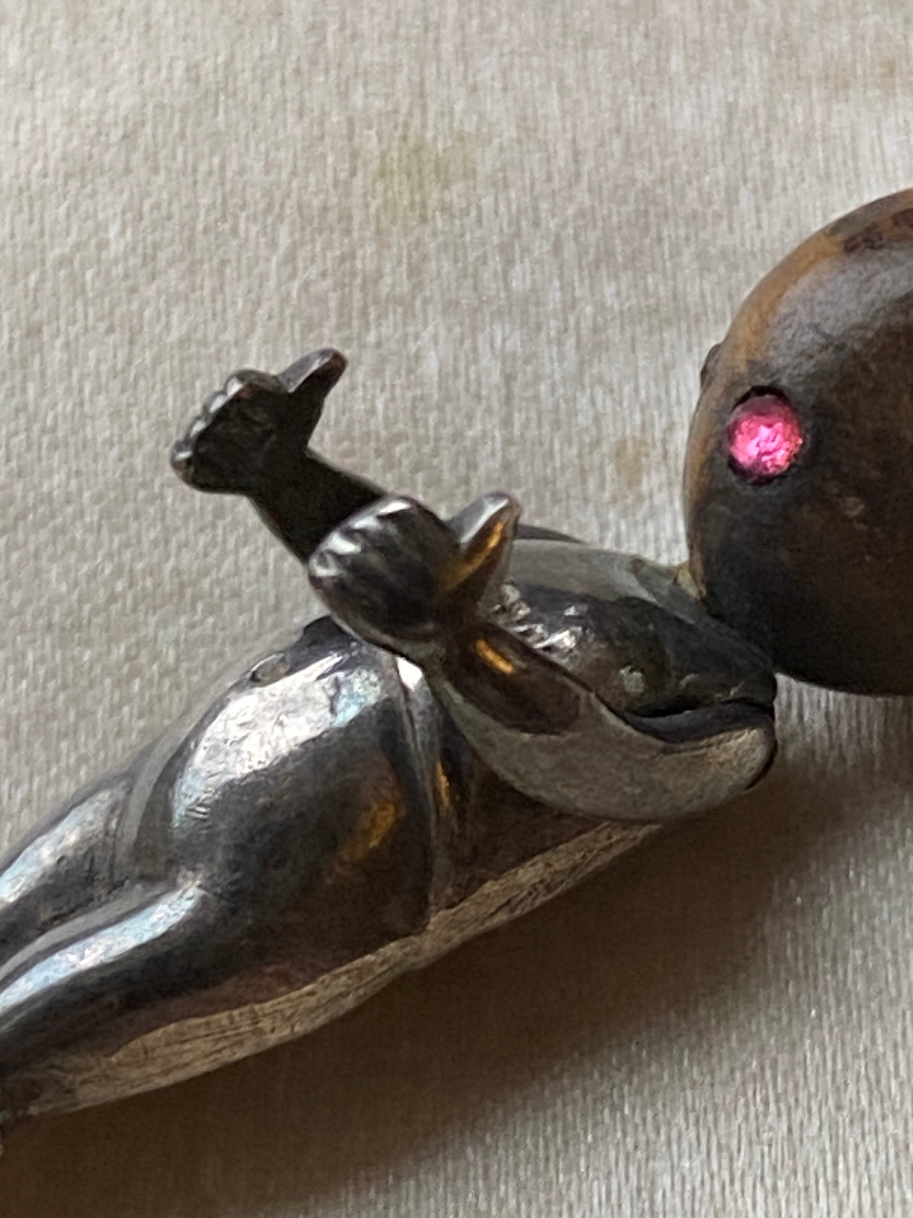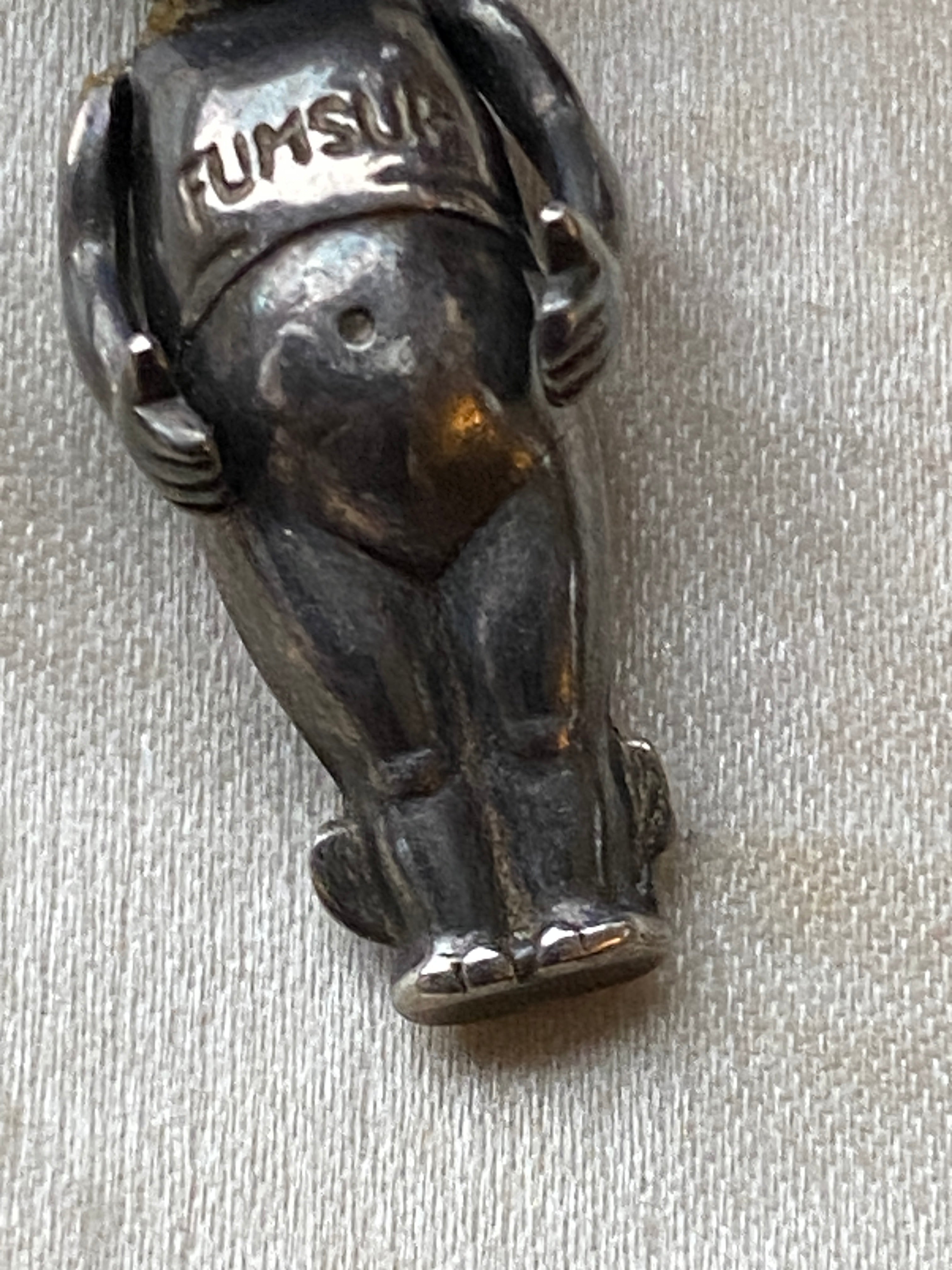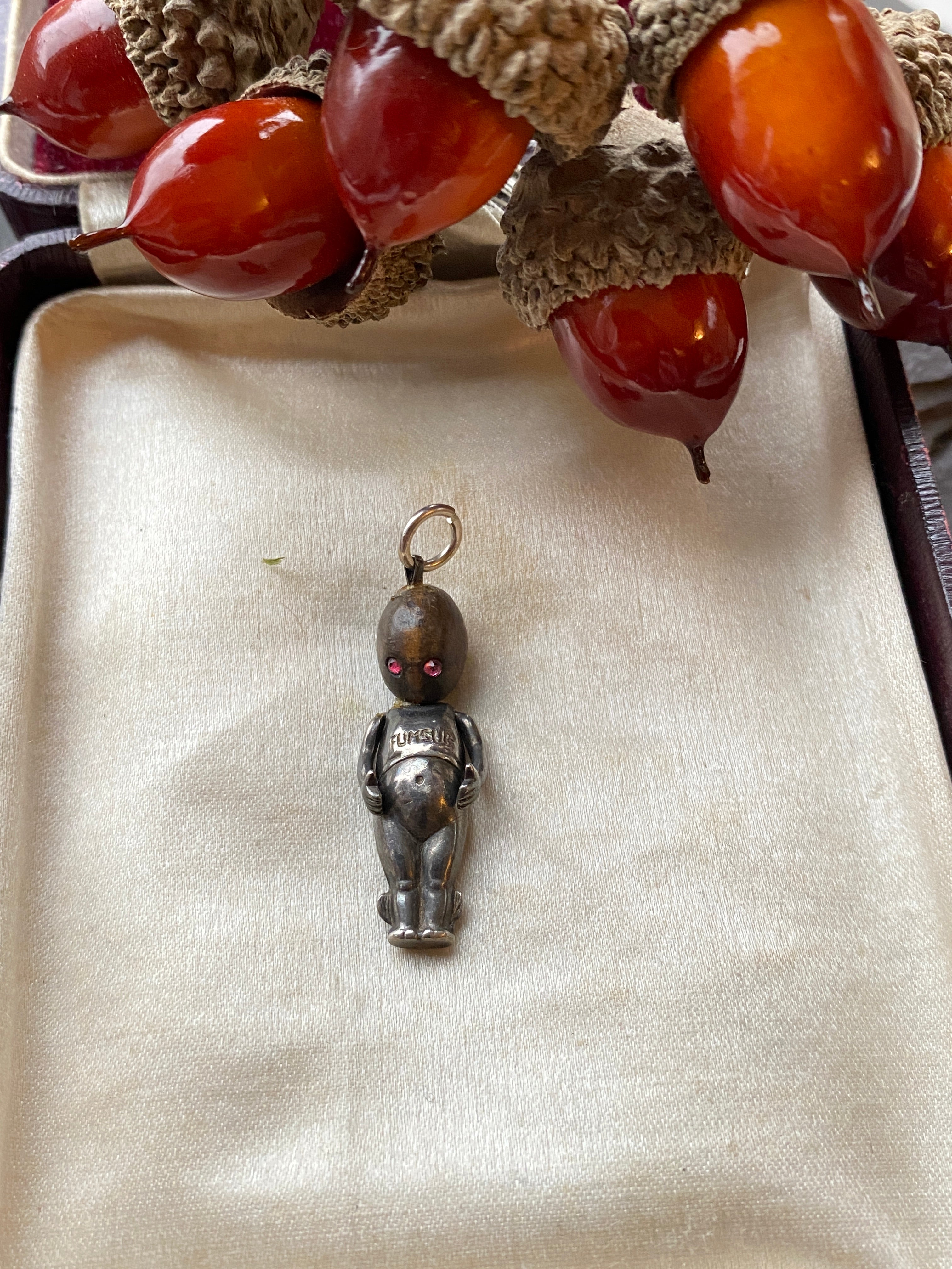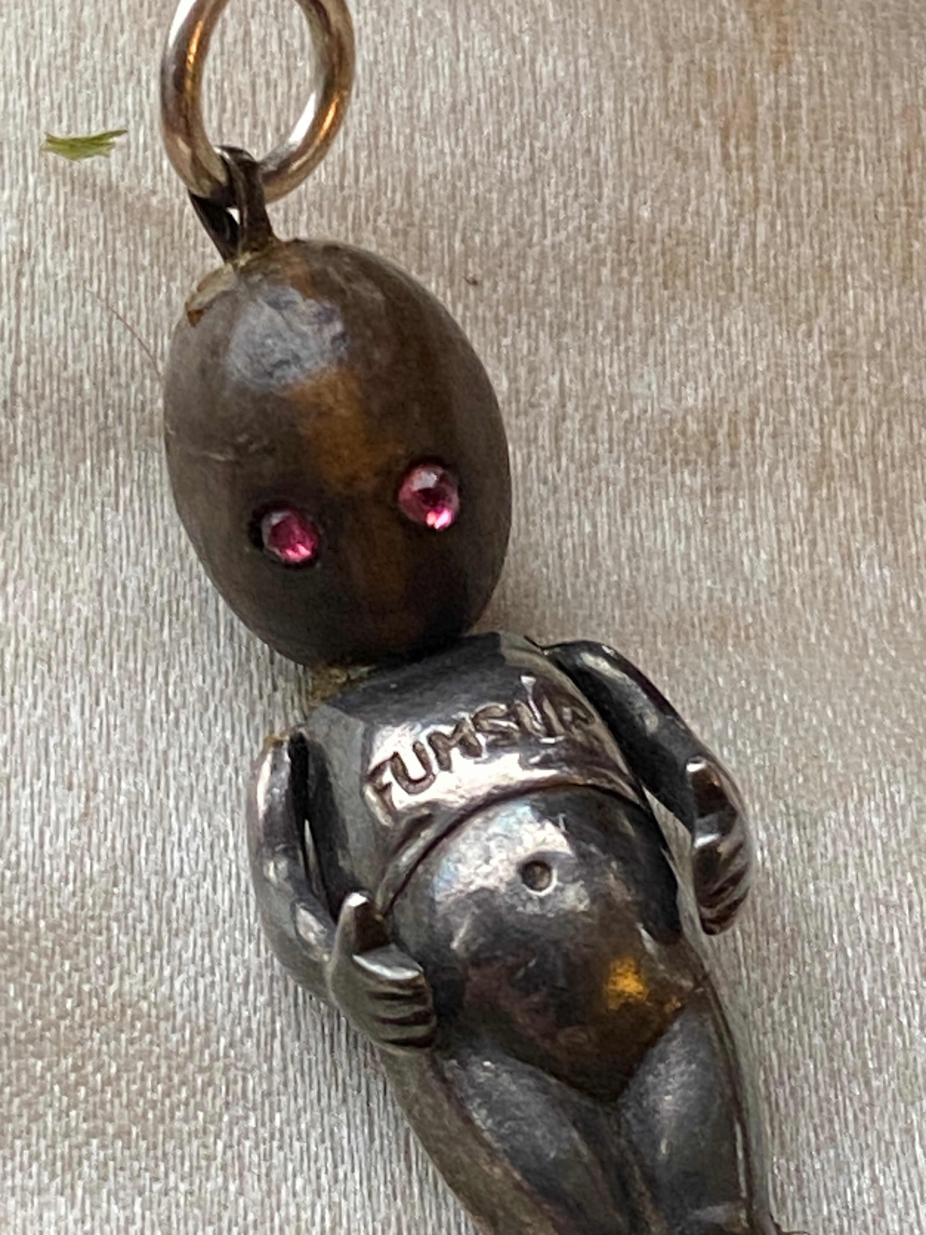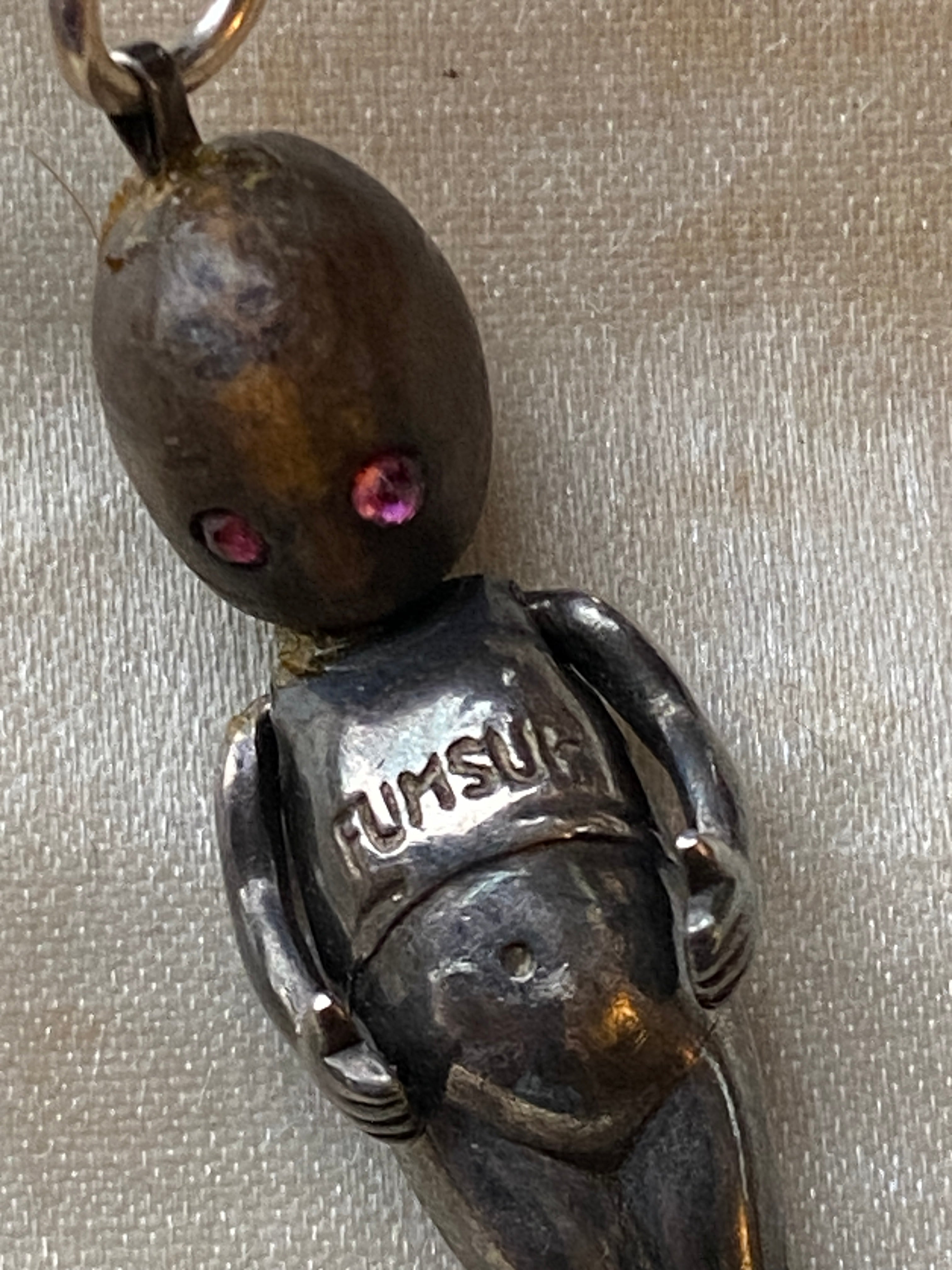 An antique WW1 lucky charm called Fumsup. He gives you the thumbs up but his head is made of wood so he is also touch wood. On his ankles are wings which represents 'God speed' to aid your travels. He has his registered patent number down his back and Fumsup written across his chest.