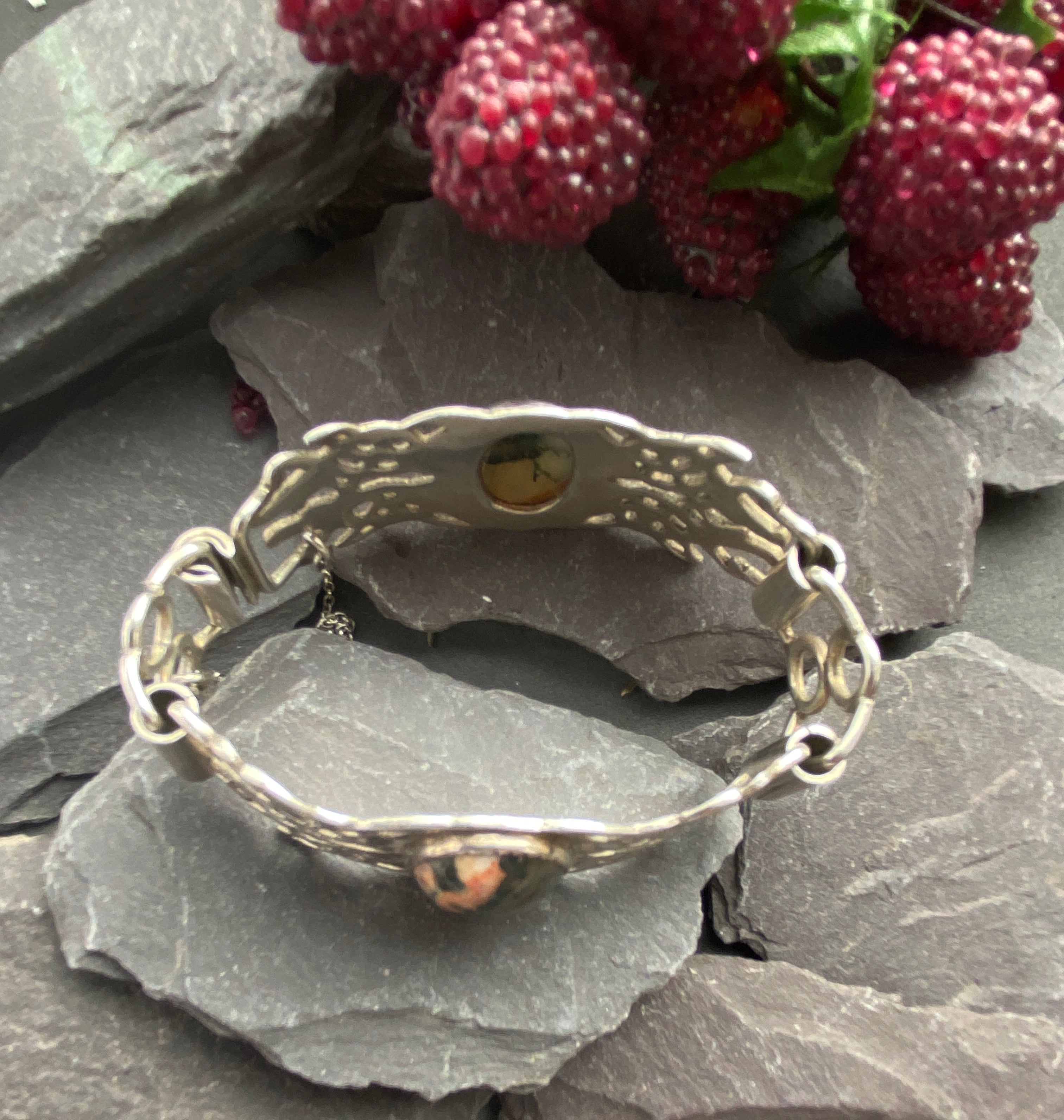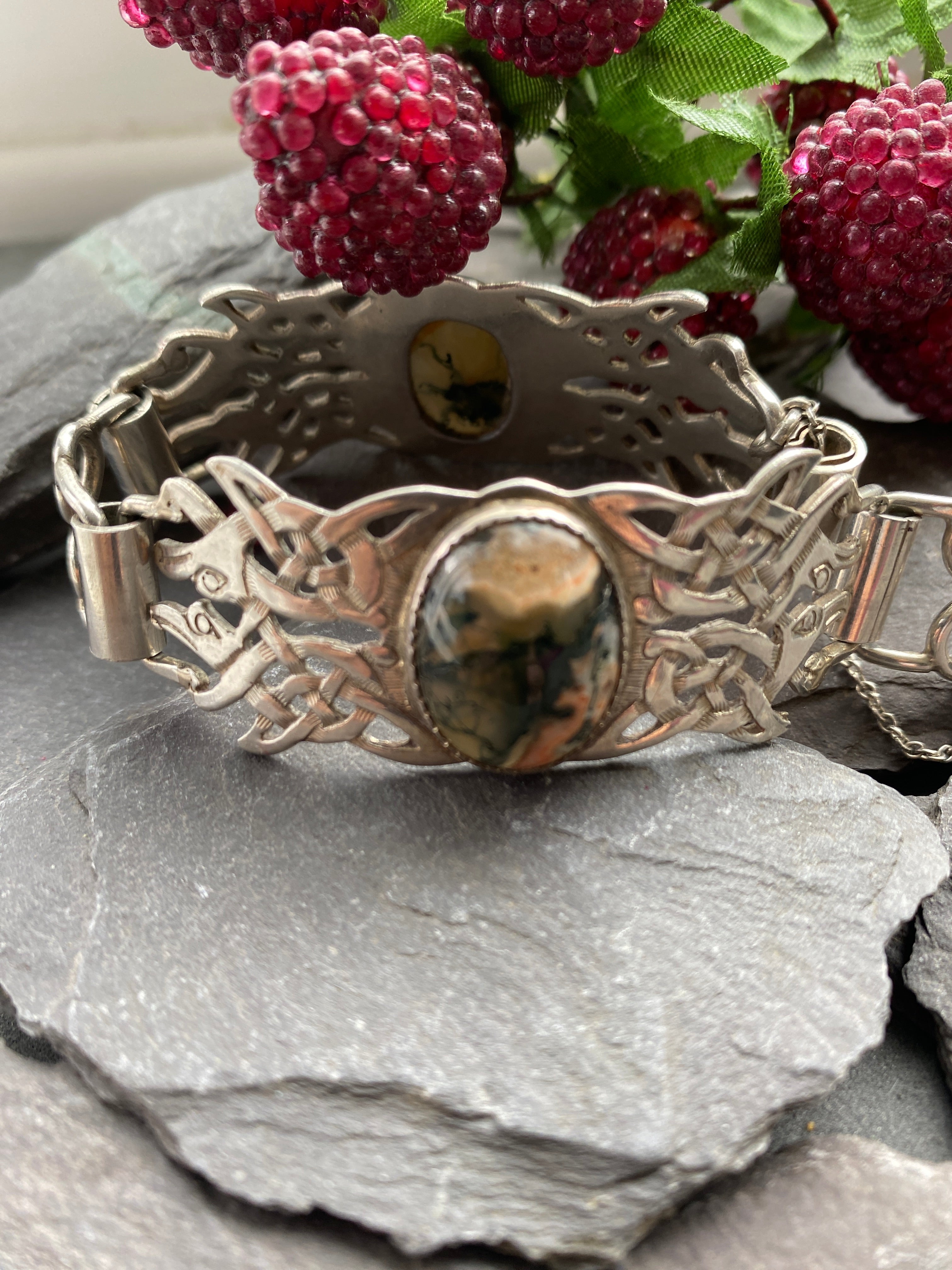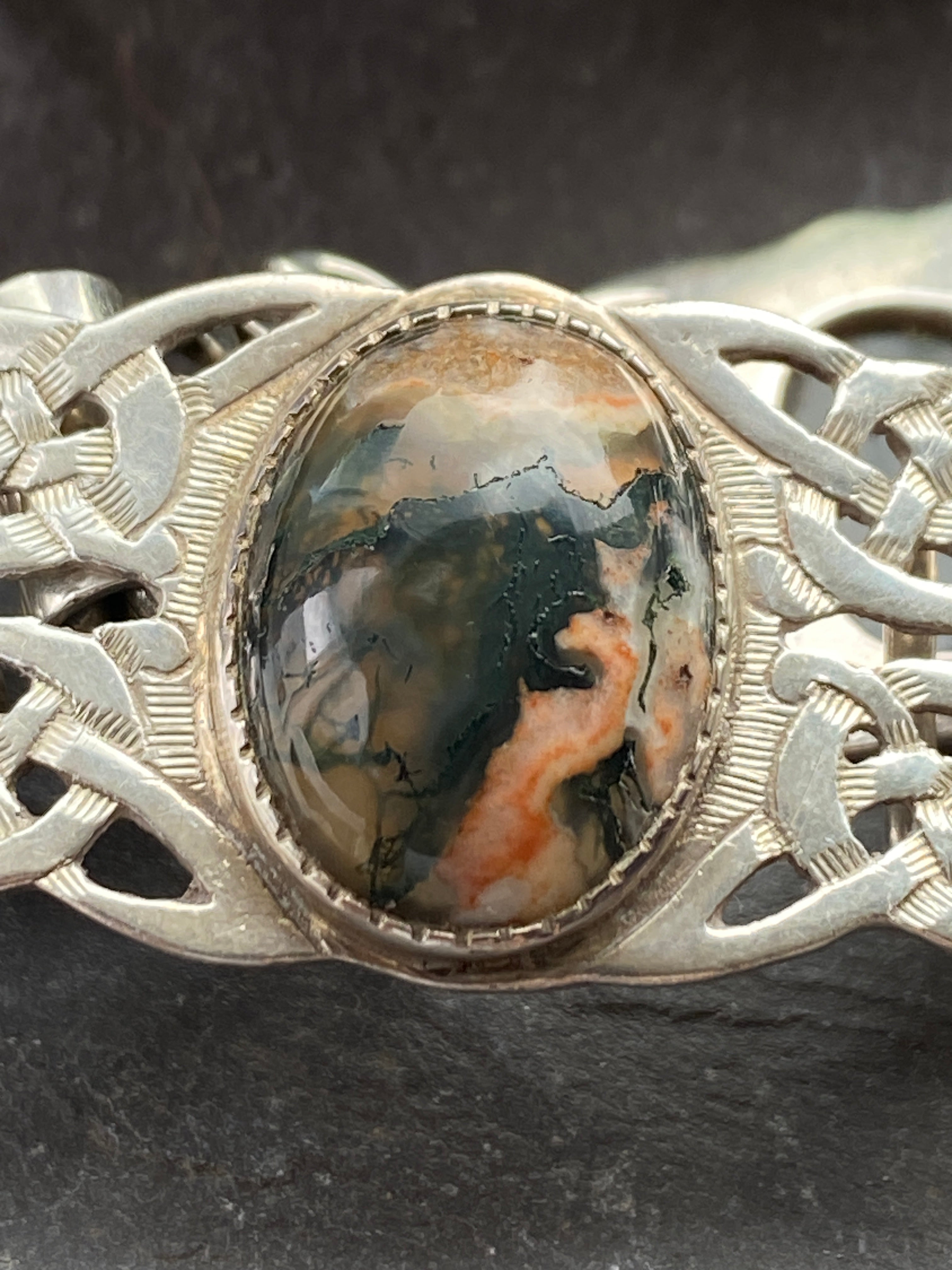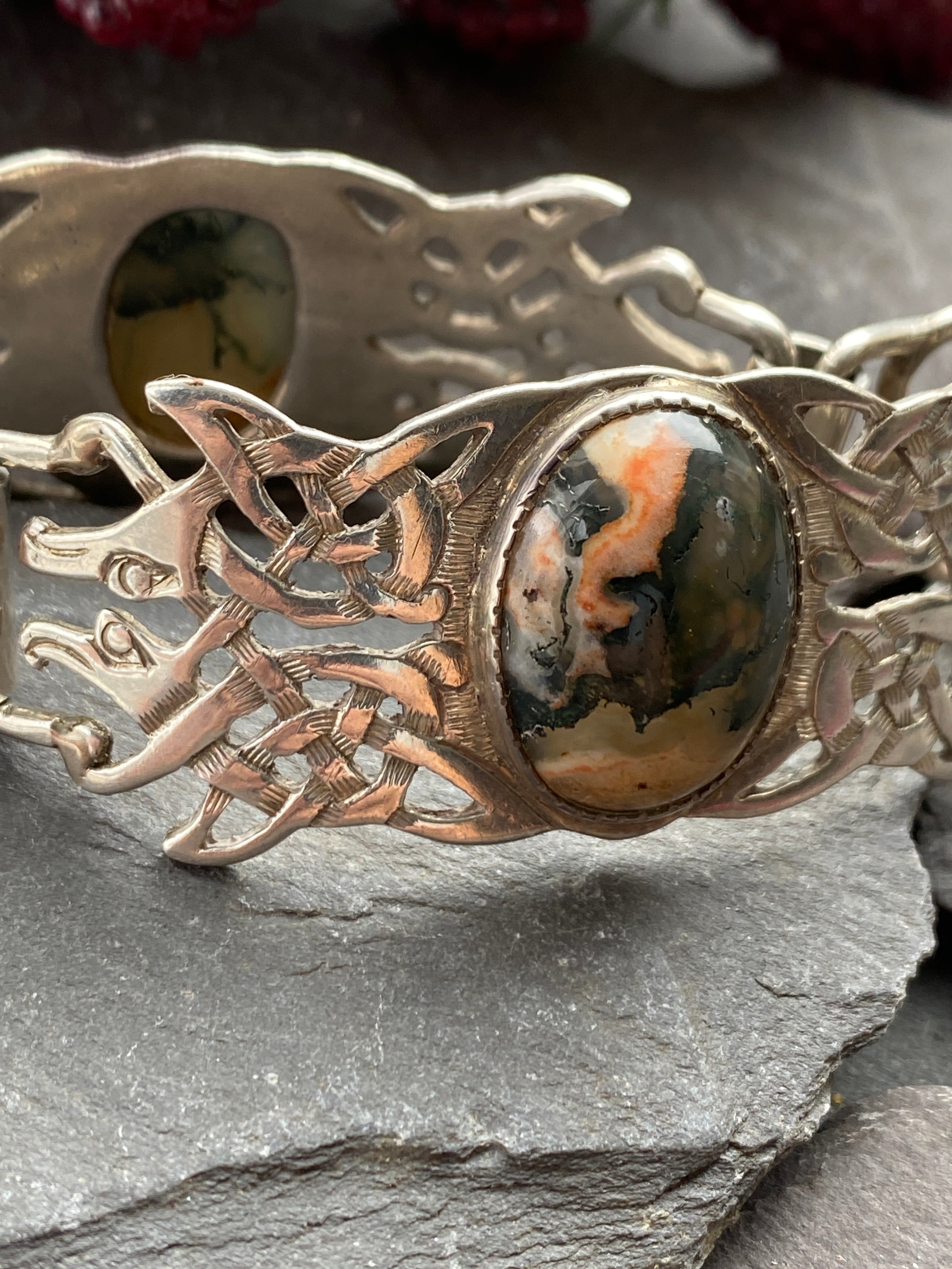 This lovely bracelet is set with two pieces of polished Moss Agate In two panels of intertwined mythical sea serpents. The bracelet is not round, it sits on your wrist quite snugly and is fastened by a cup and bar with a safety chain attachment.