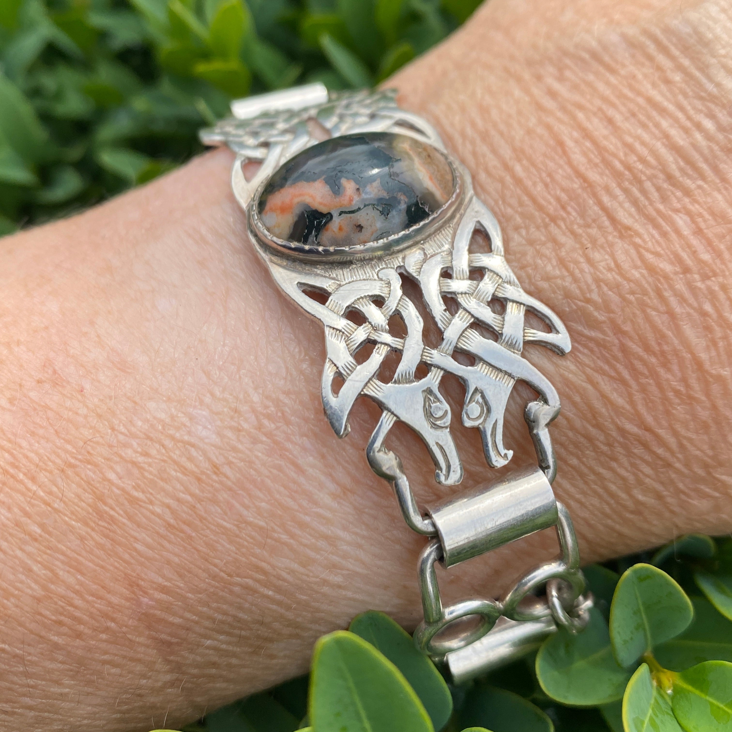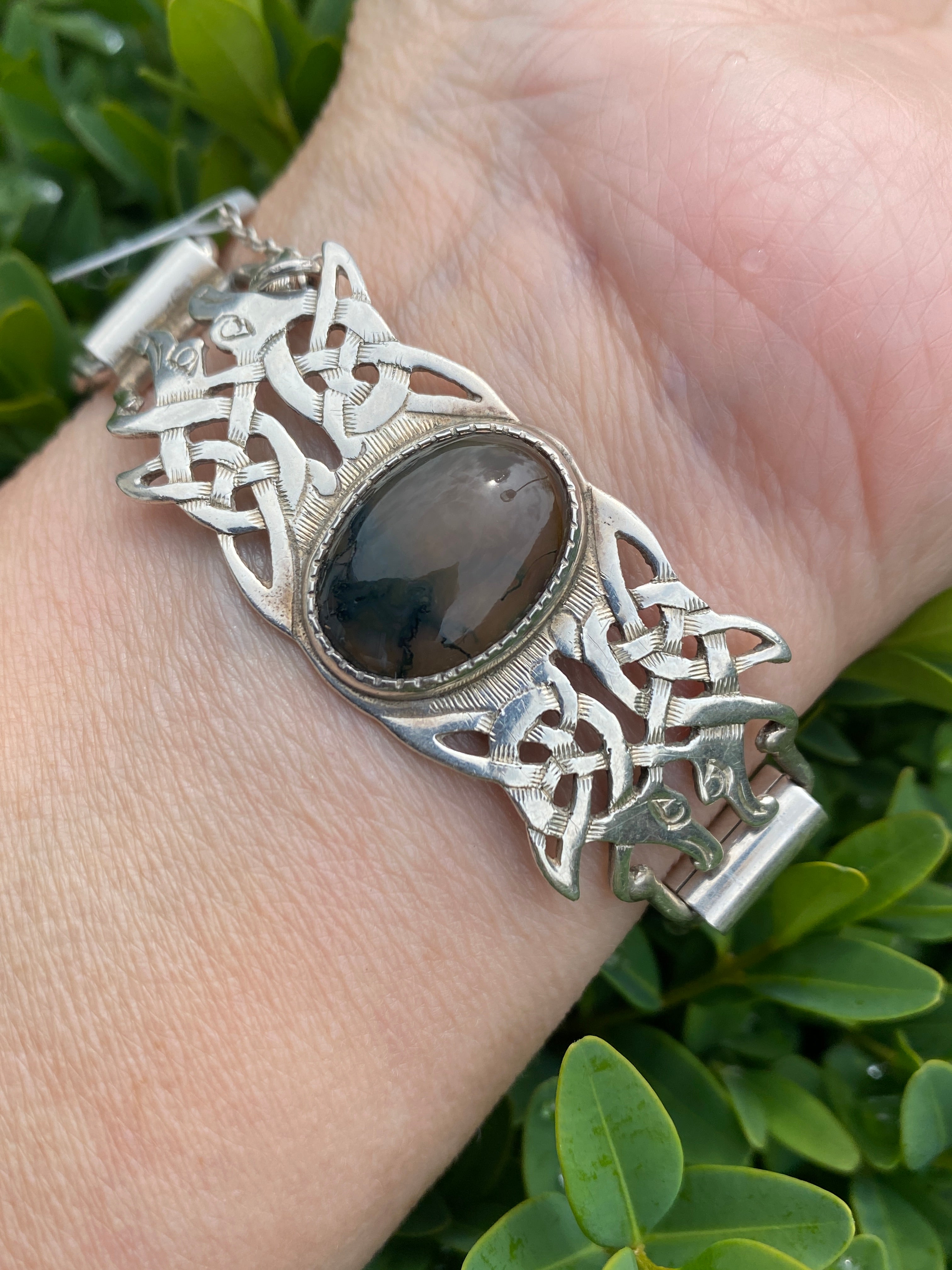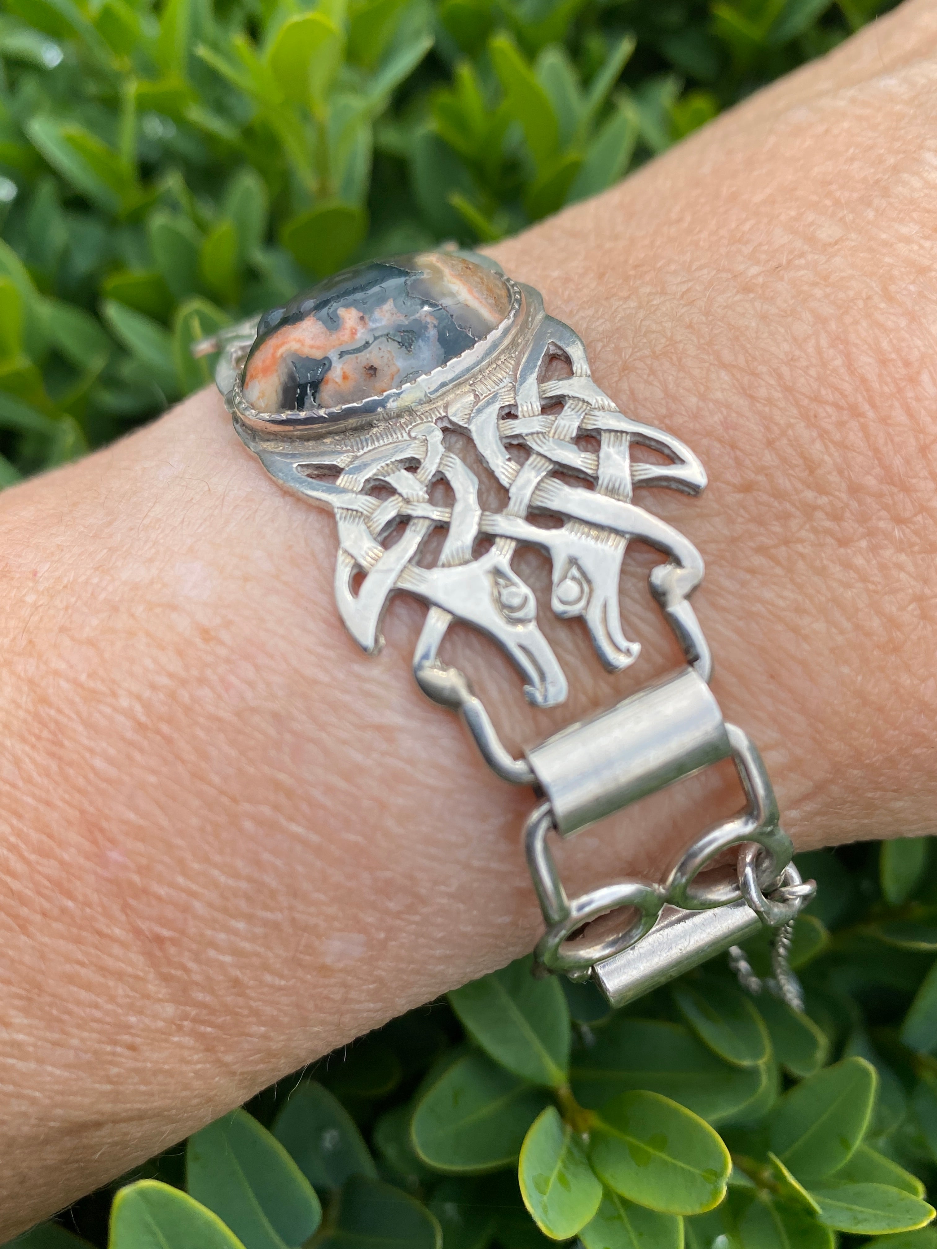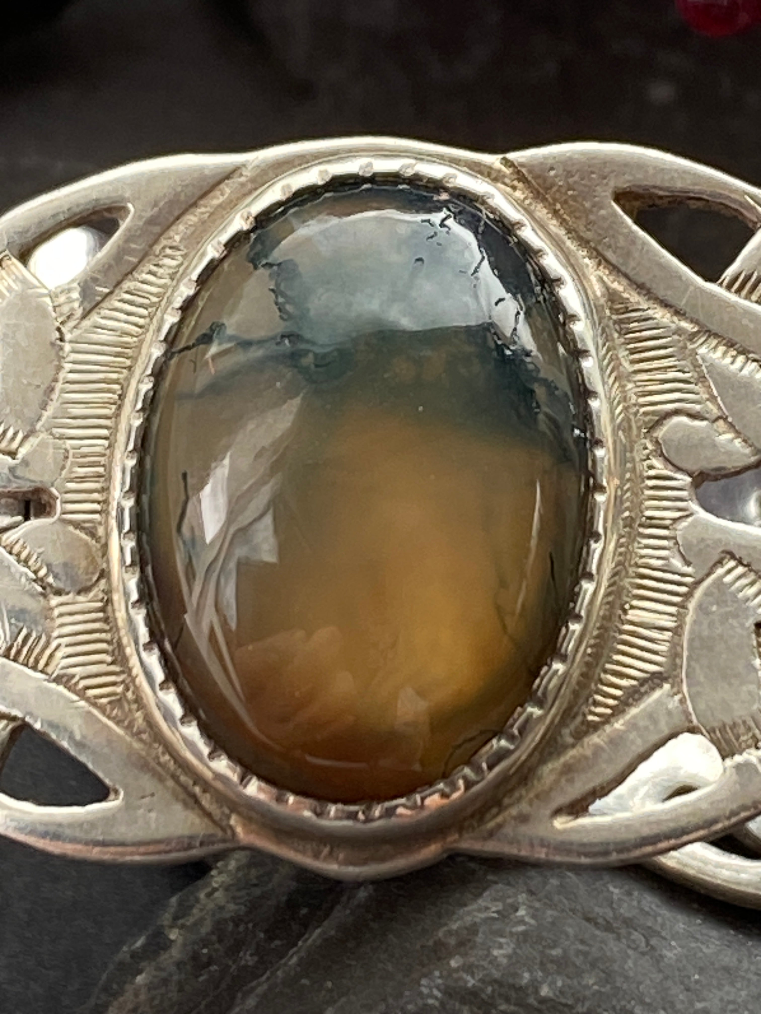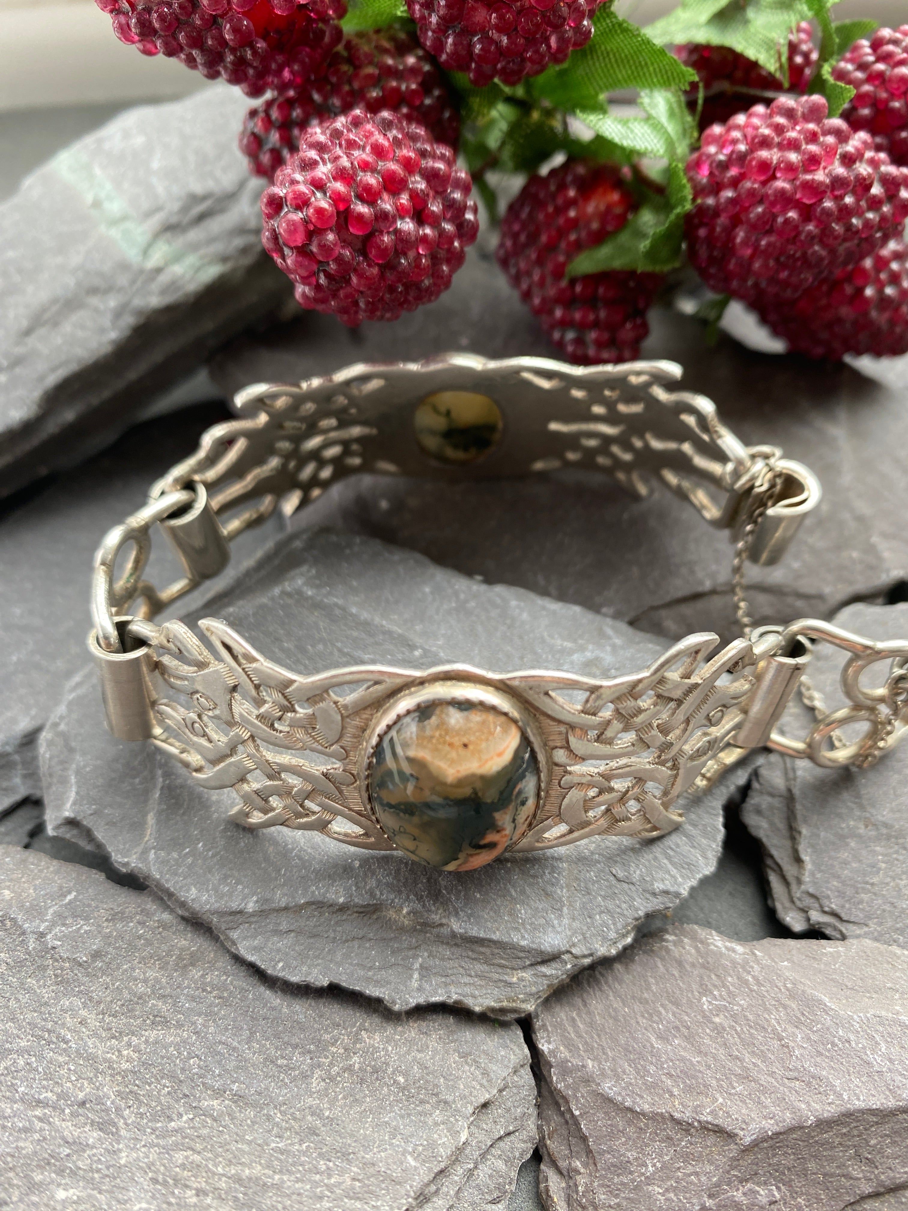 This lovely bracelet is set with two pieces of polished Moss Agate In two panels of intertwined mythical sea serpents. The bracelet is not round, it sits on your wrist quite snugly and is fastened by a cup and bar with a safety chain attachment.