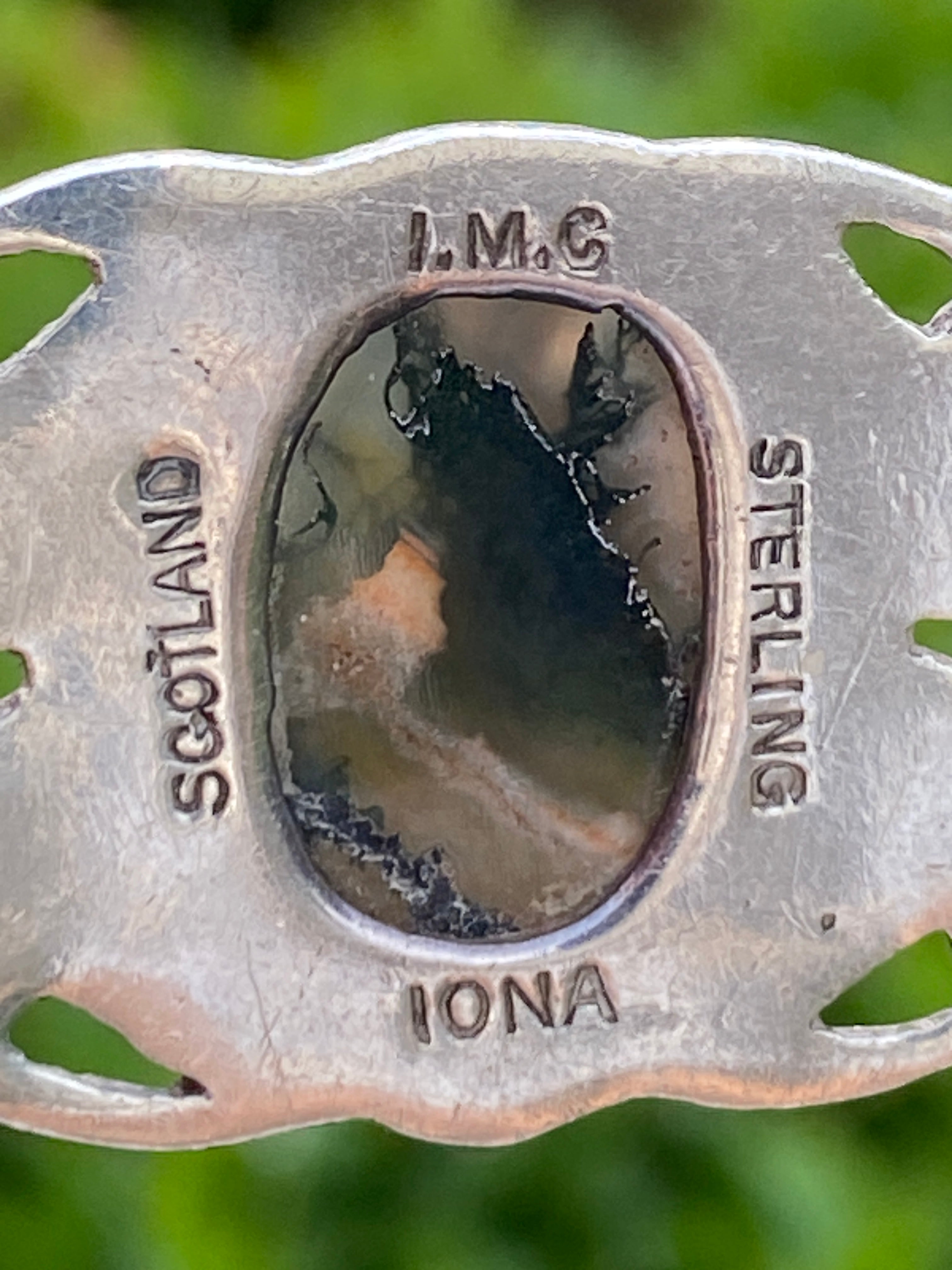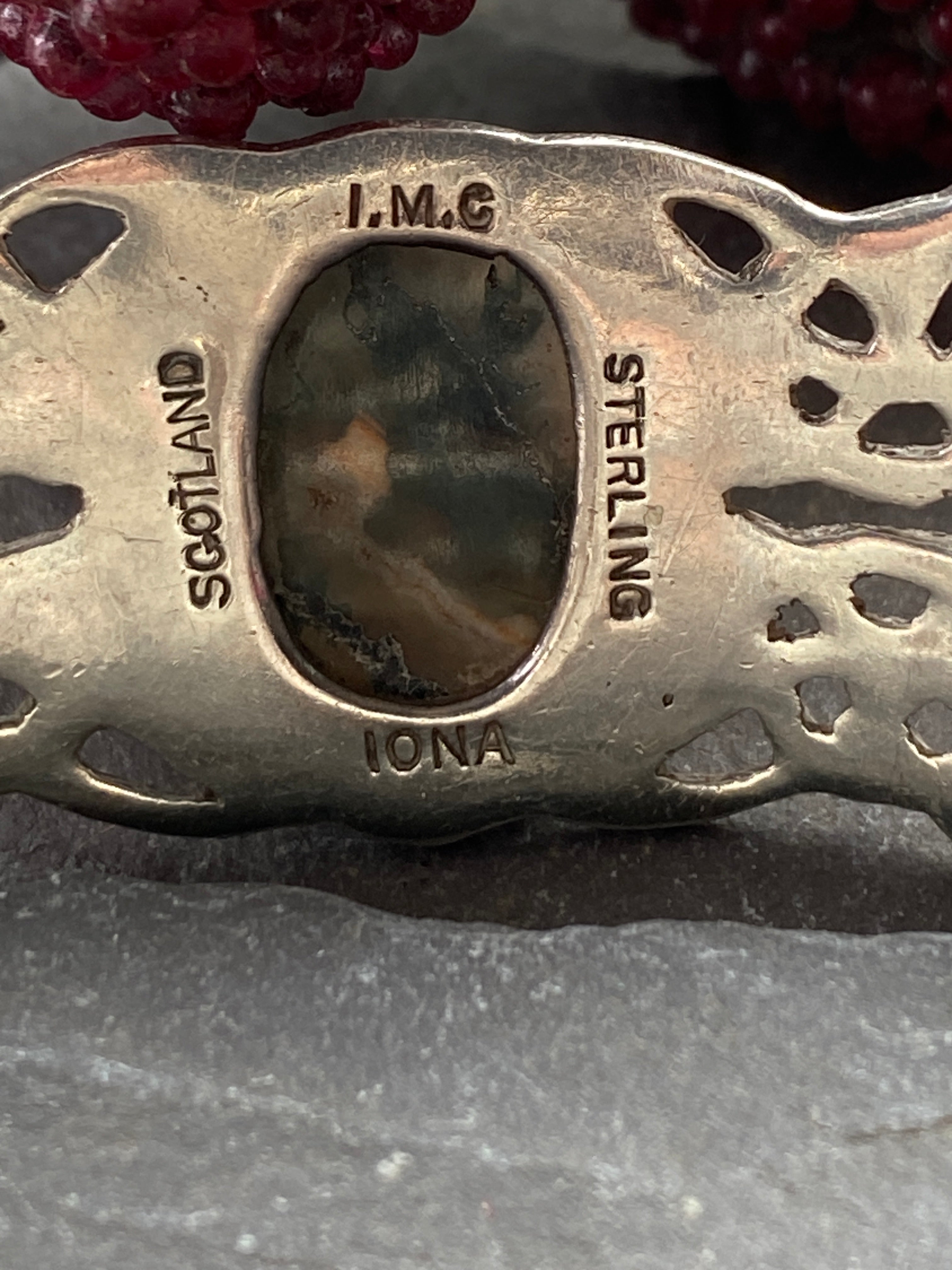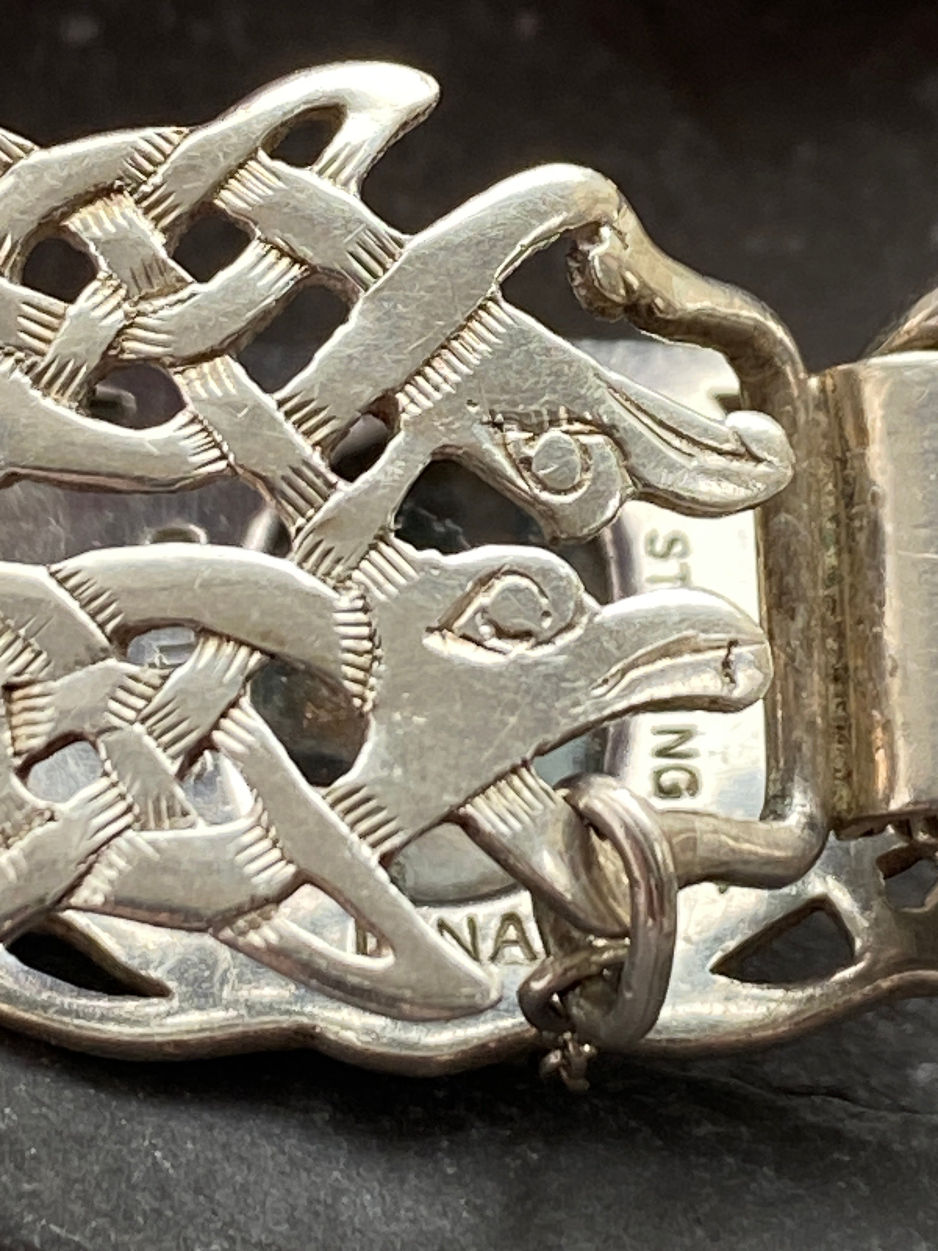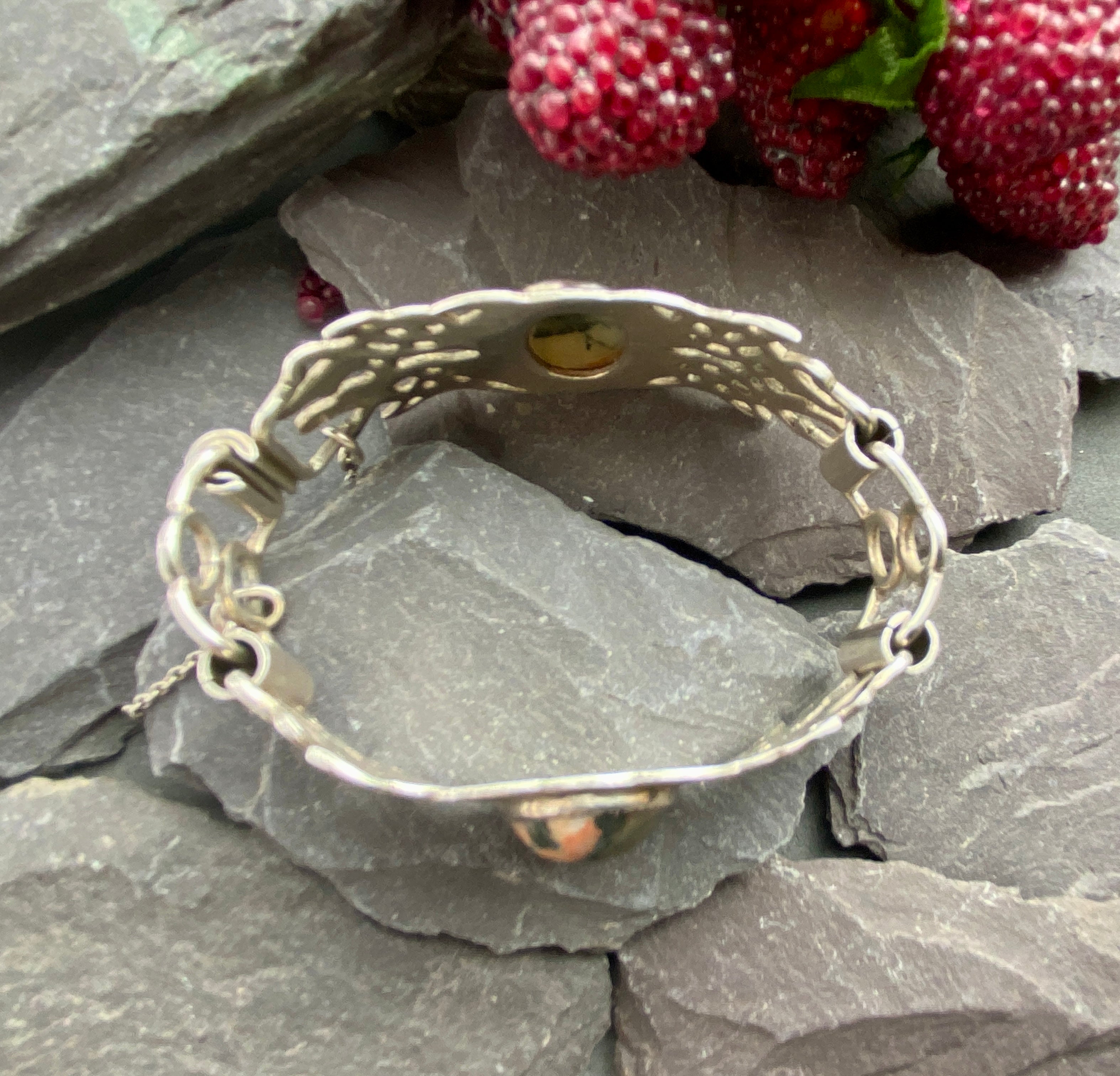 This lovely bracelet is set with two pieces of polished Moss Agate In two panels of intertwined mythical sea serpents. The bracelet is not round, it sits on your wrist quite snugly and is fastened by a cup and bar with a safety chain attachment.