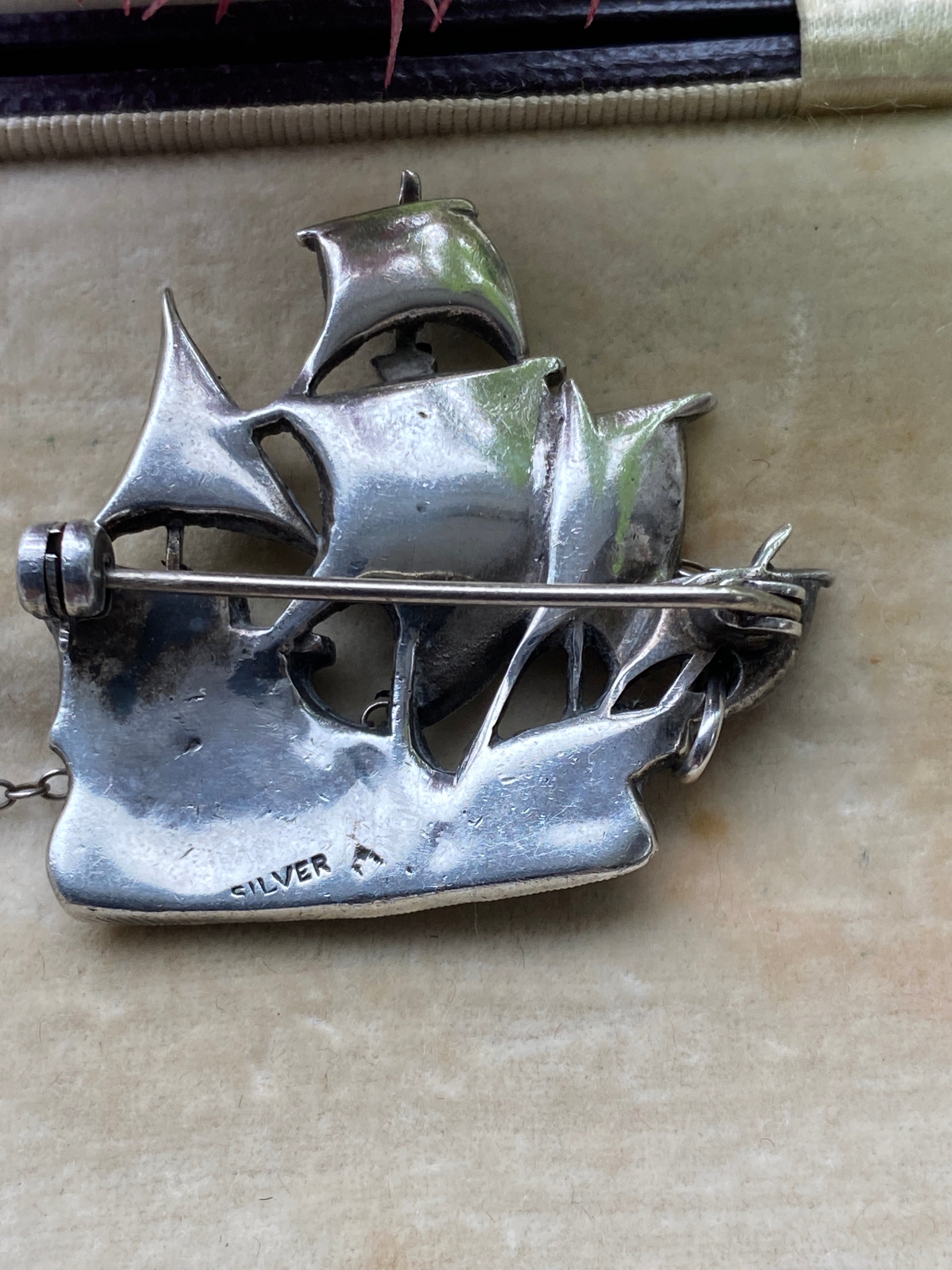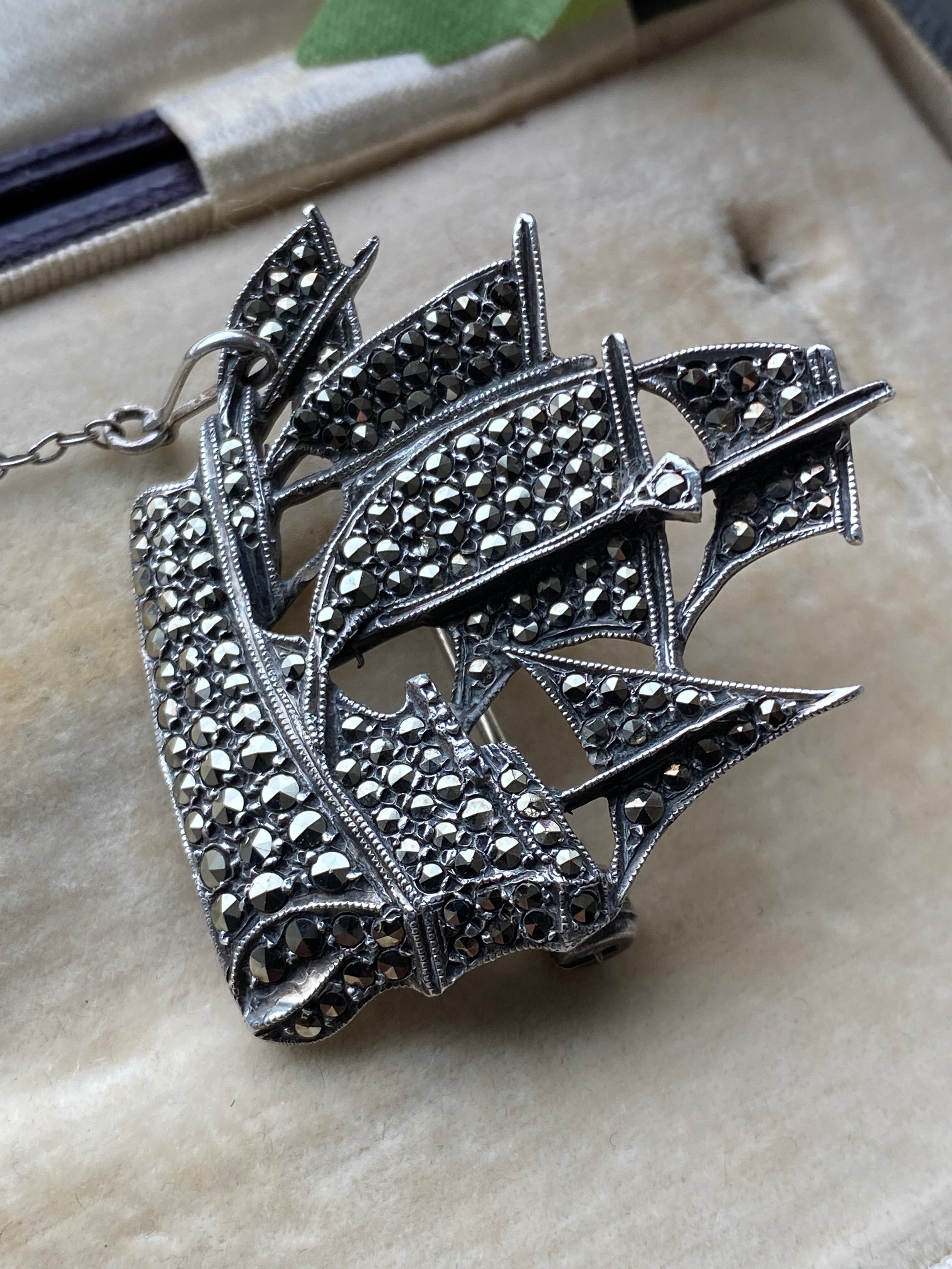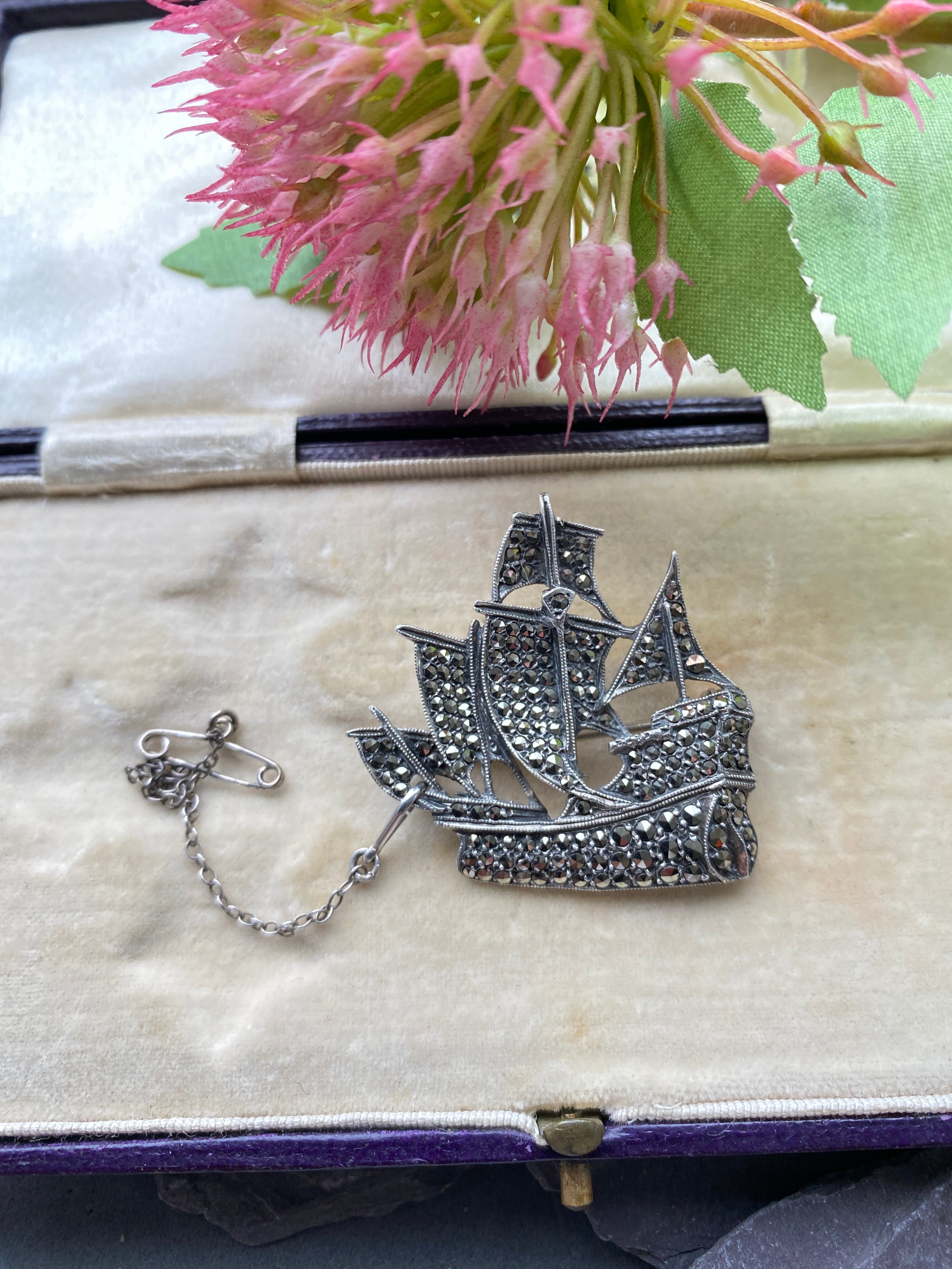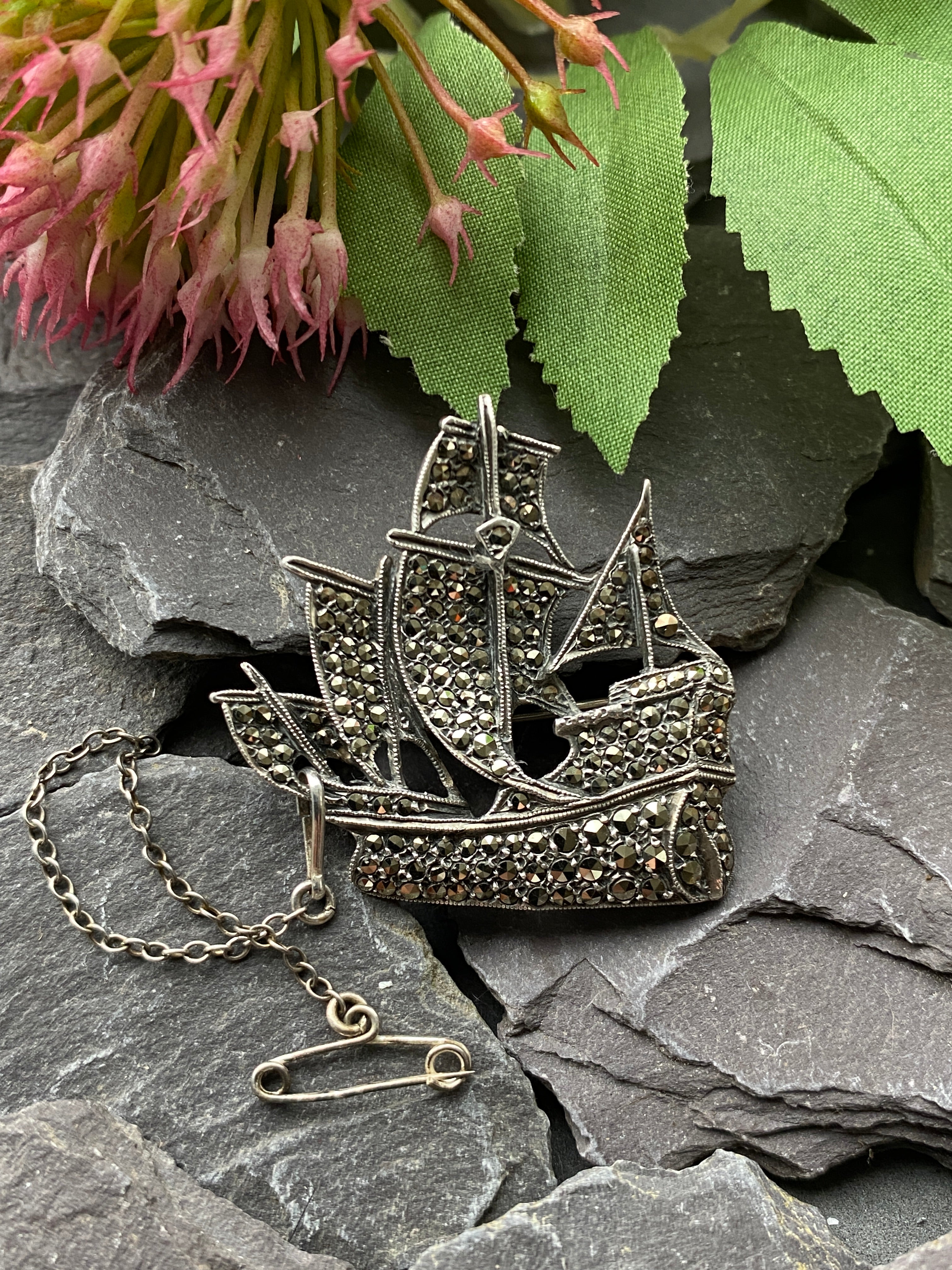 A beautiful sterling silver brooch set with Marcasite stones in the shape of a galleon ship.