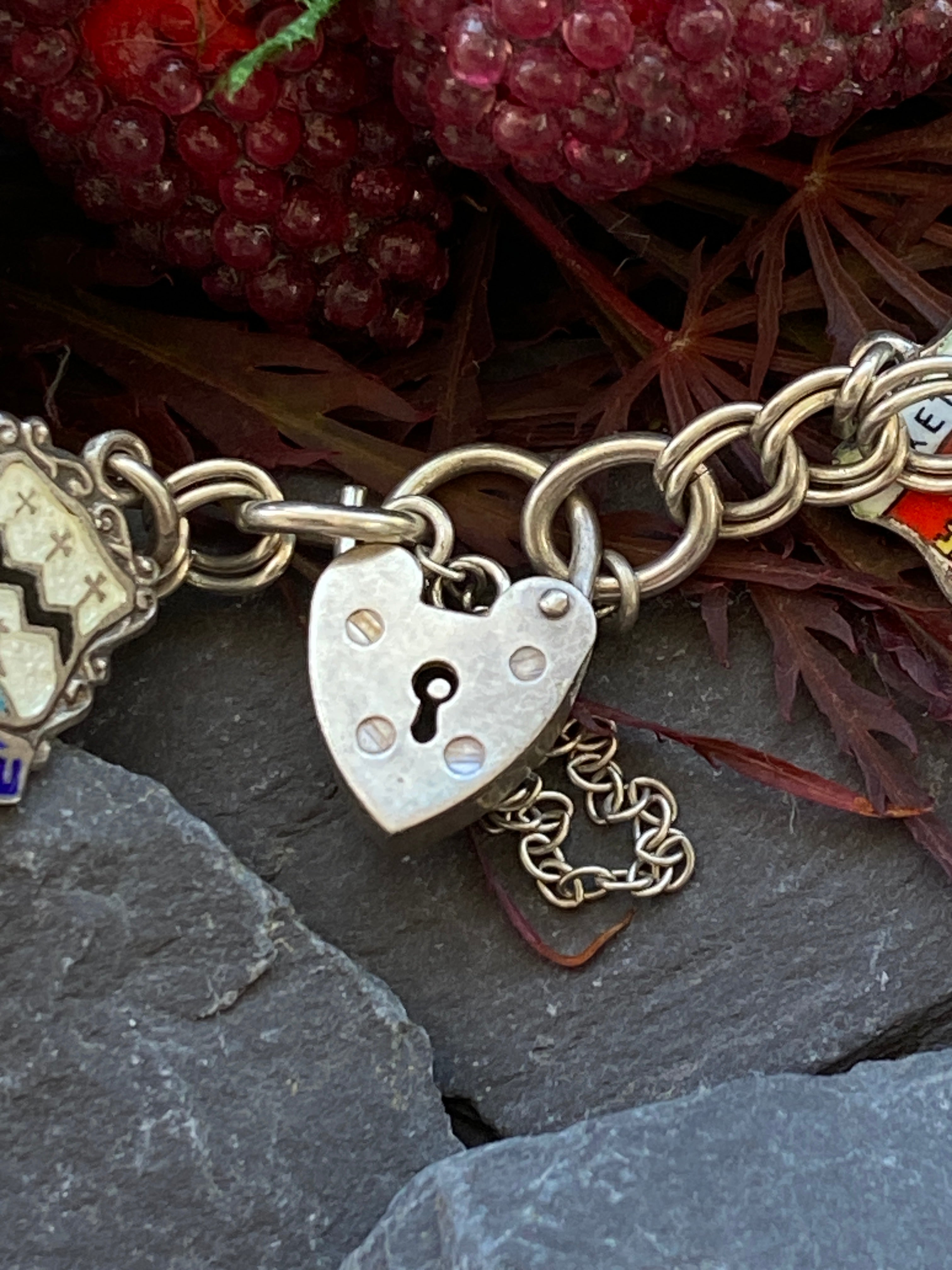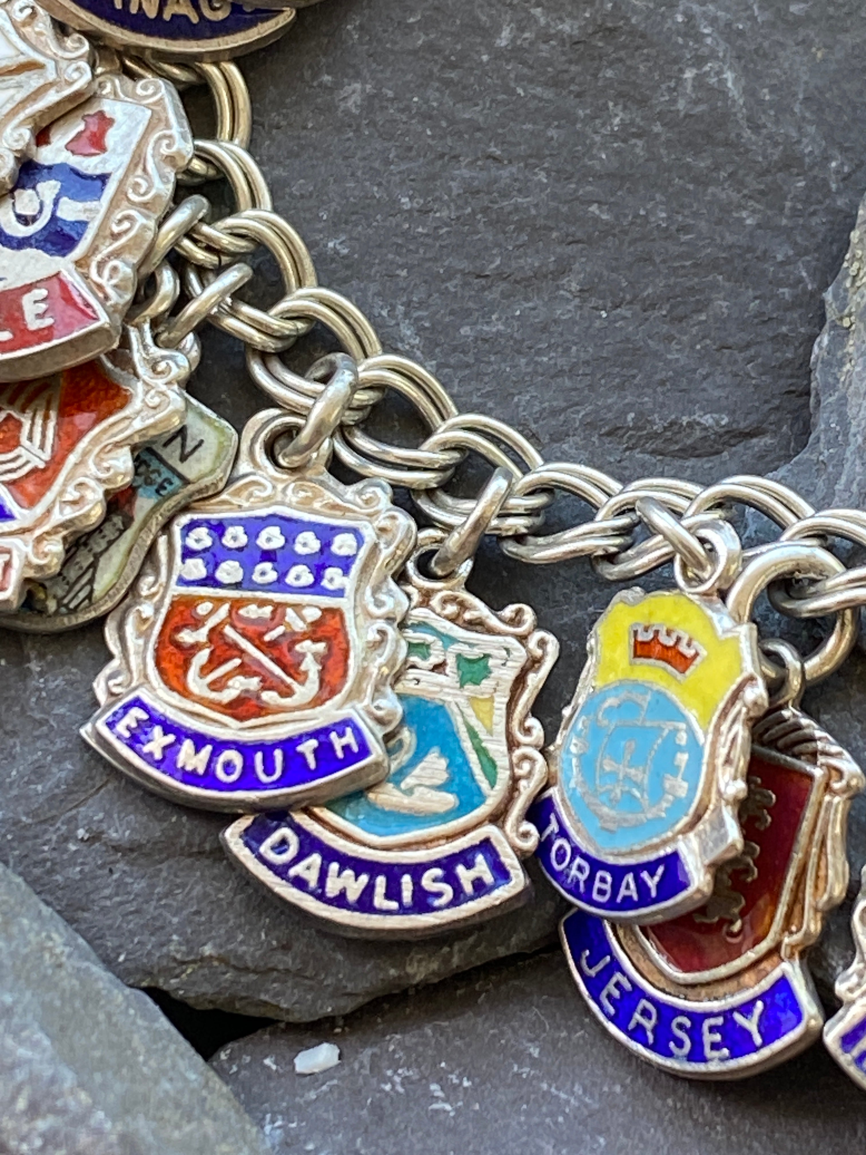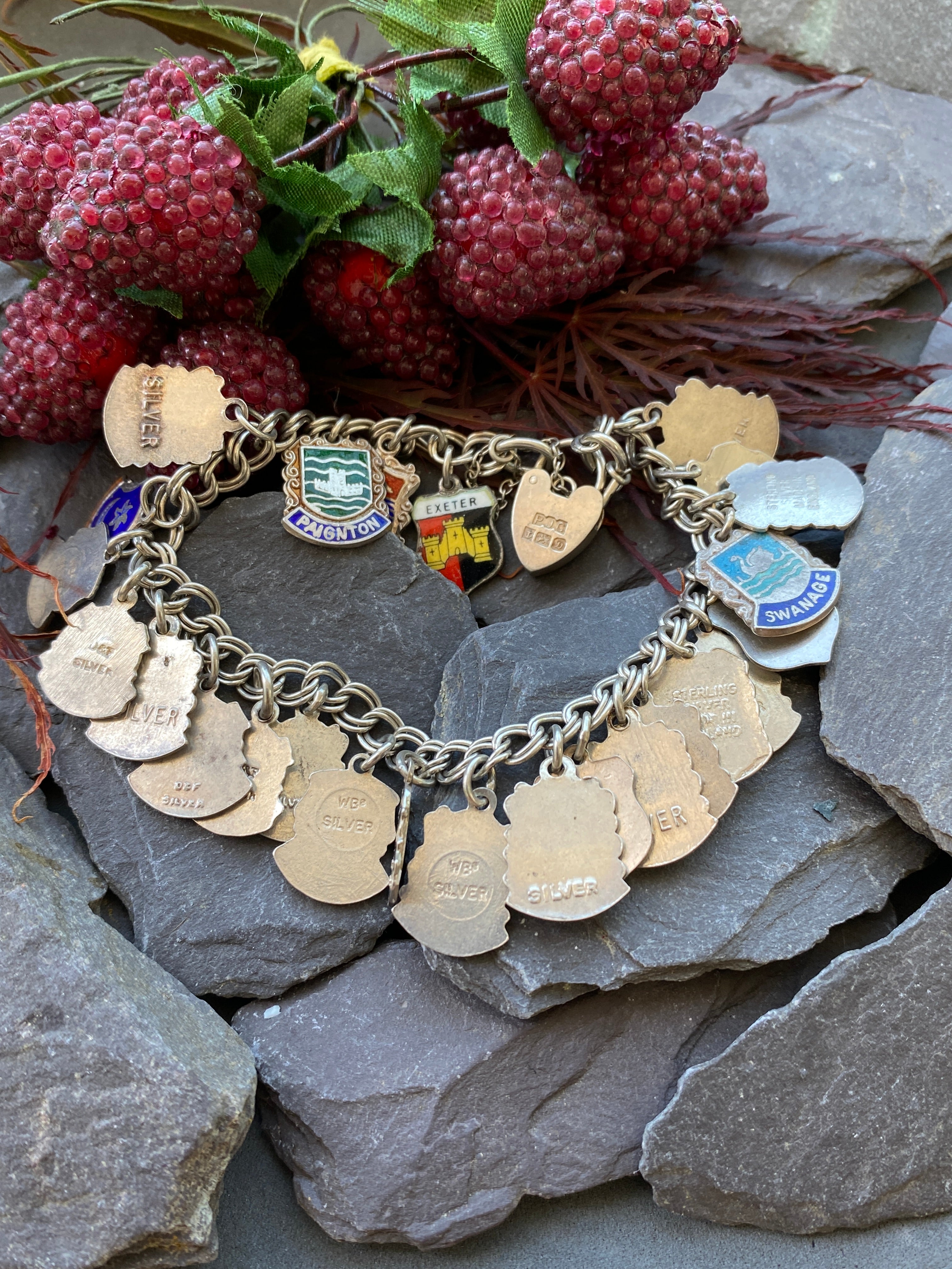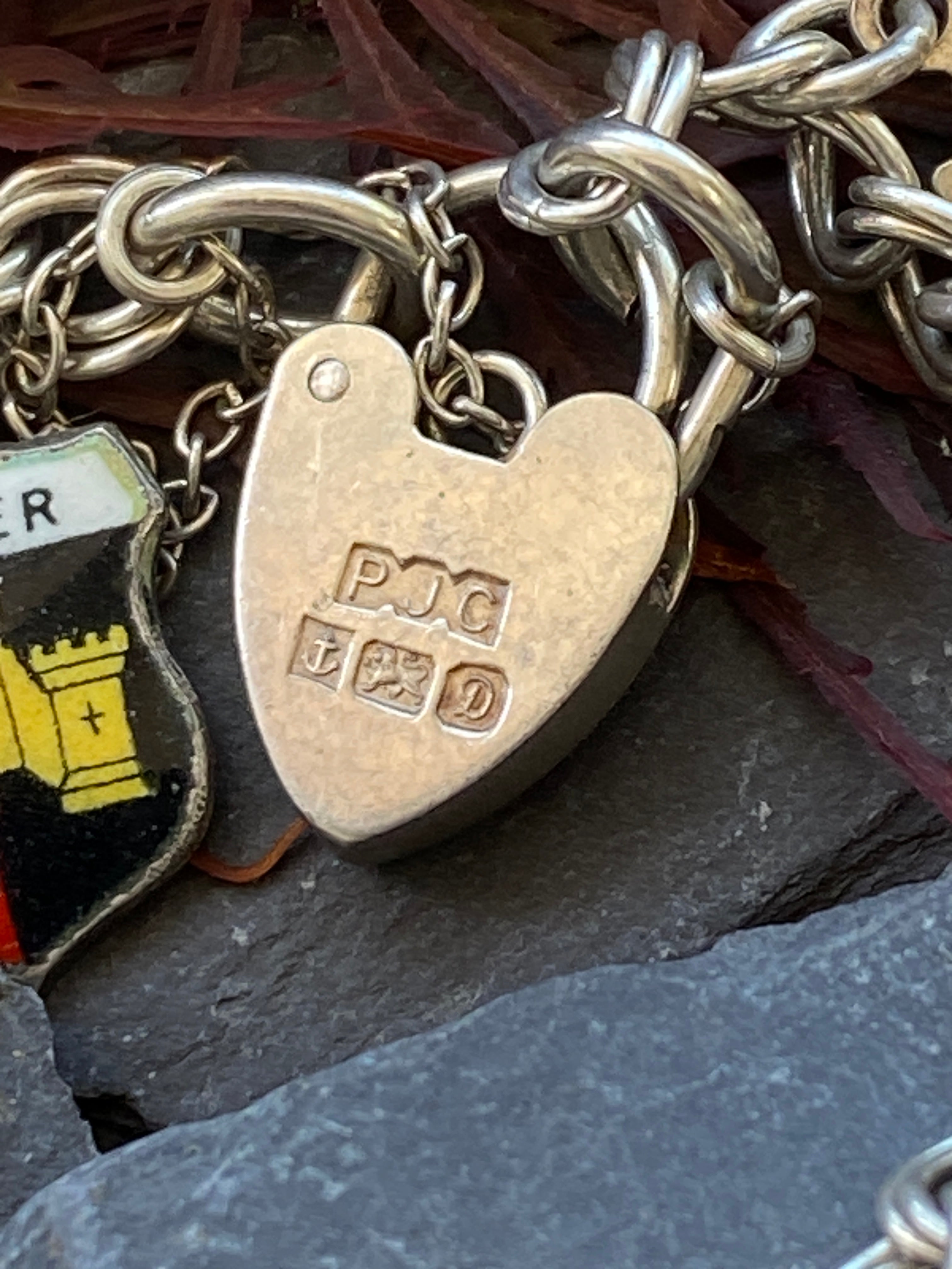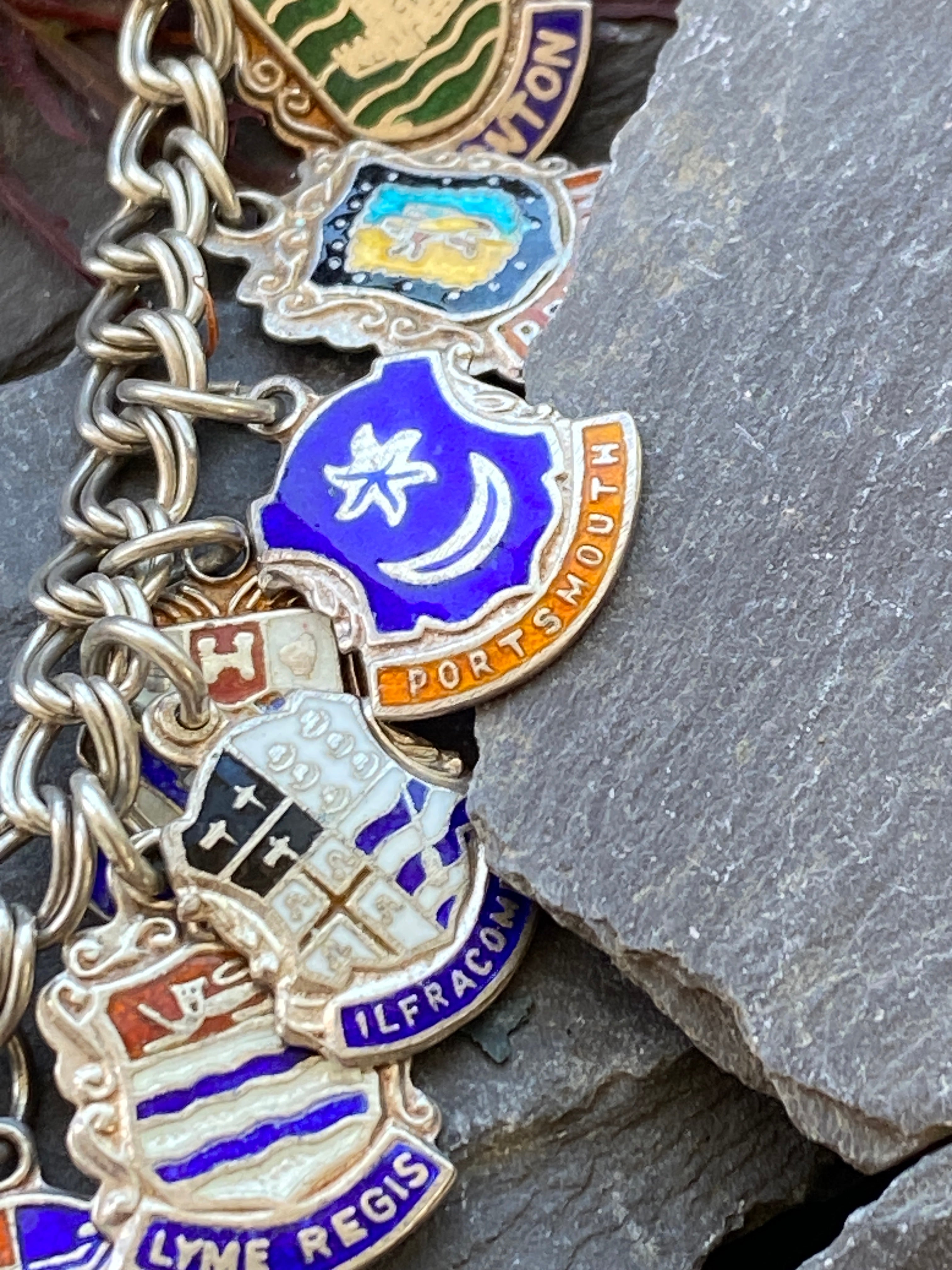 A fully loaded sterling silver charm bracelet with traditional padlock closure fitted with 25 silver and enamel tourist town shield charms