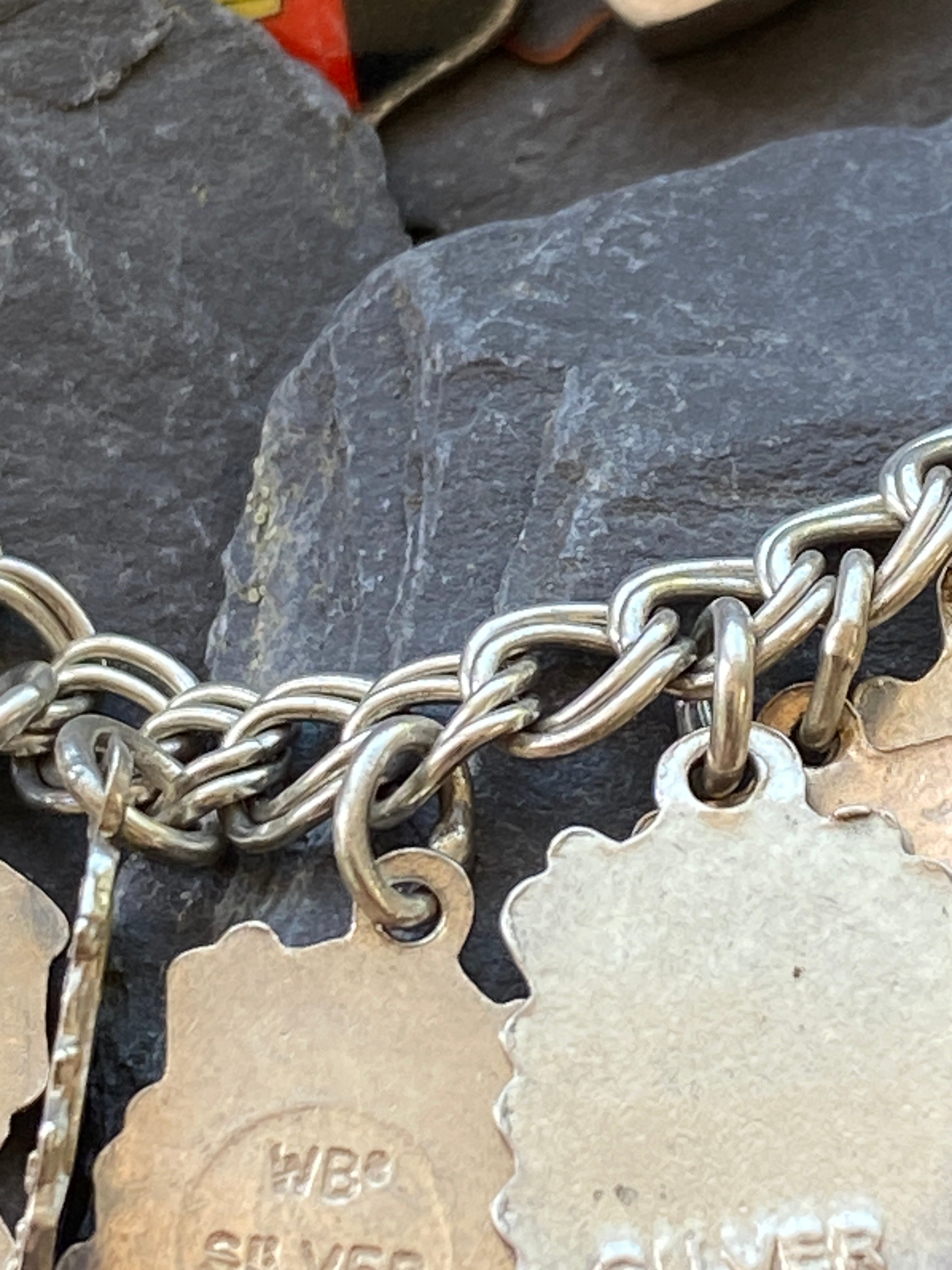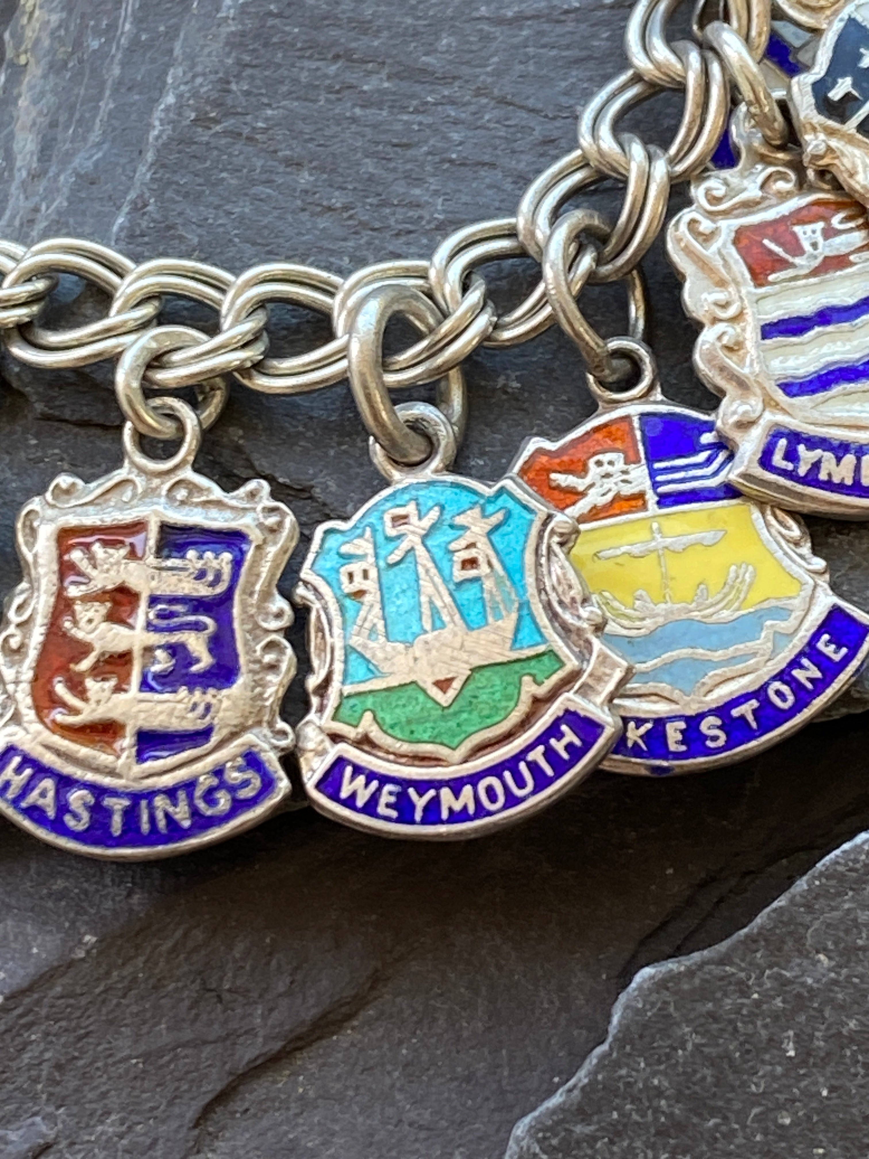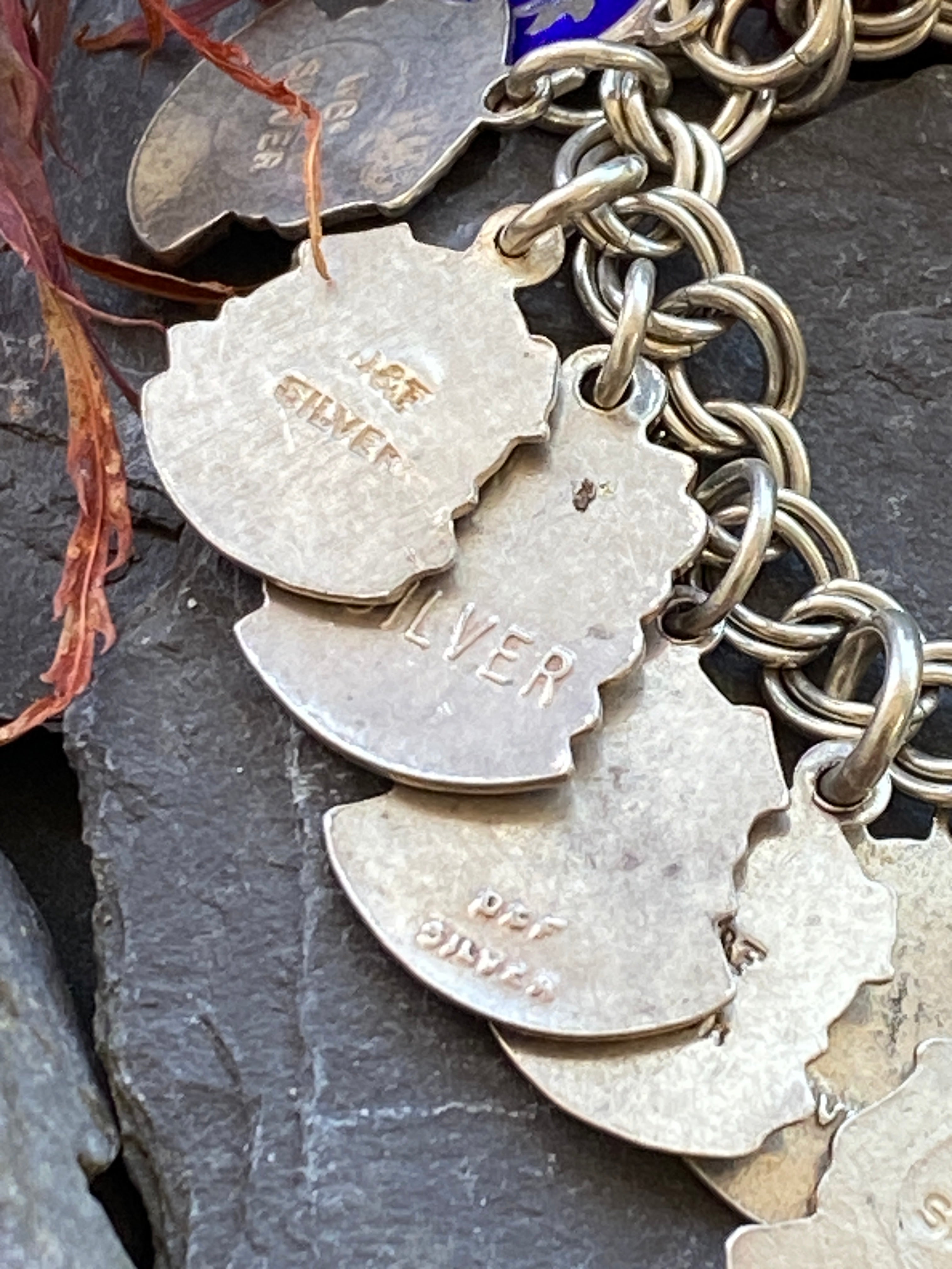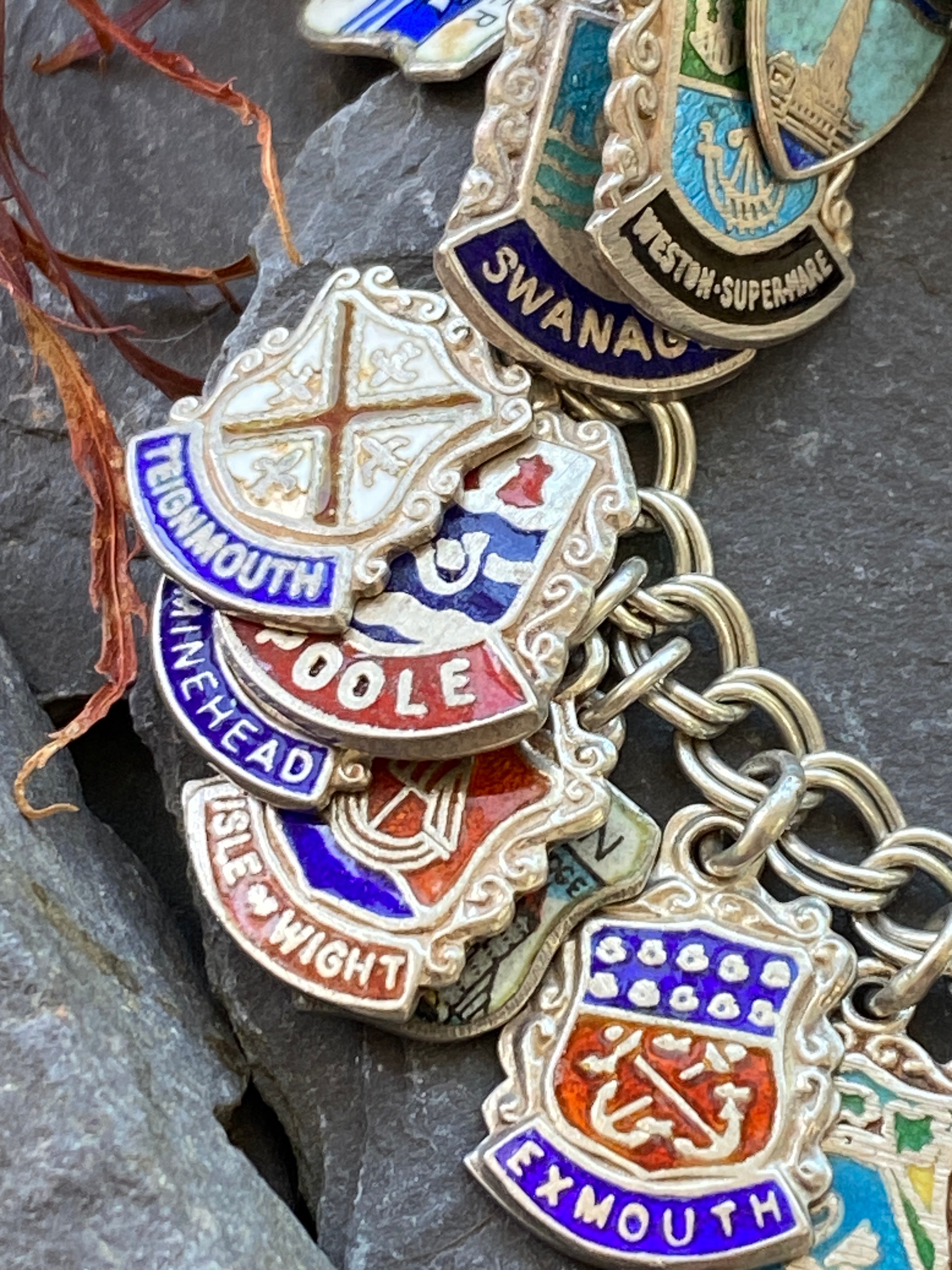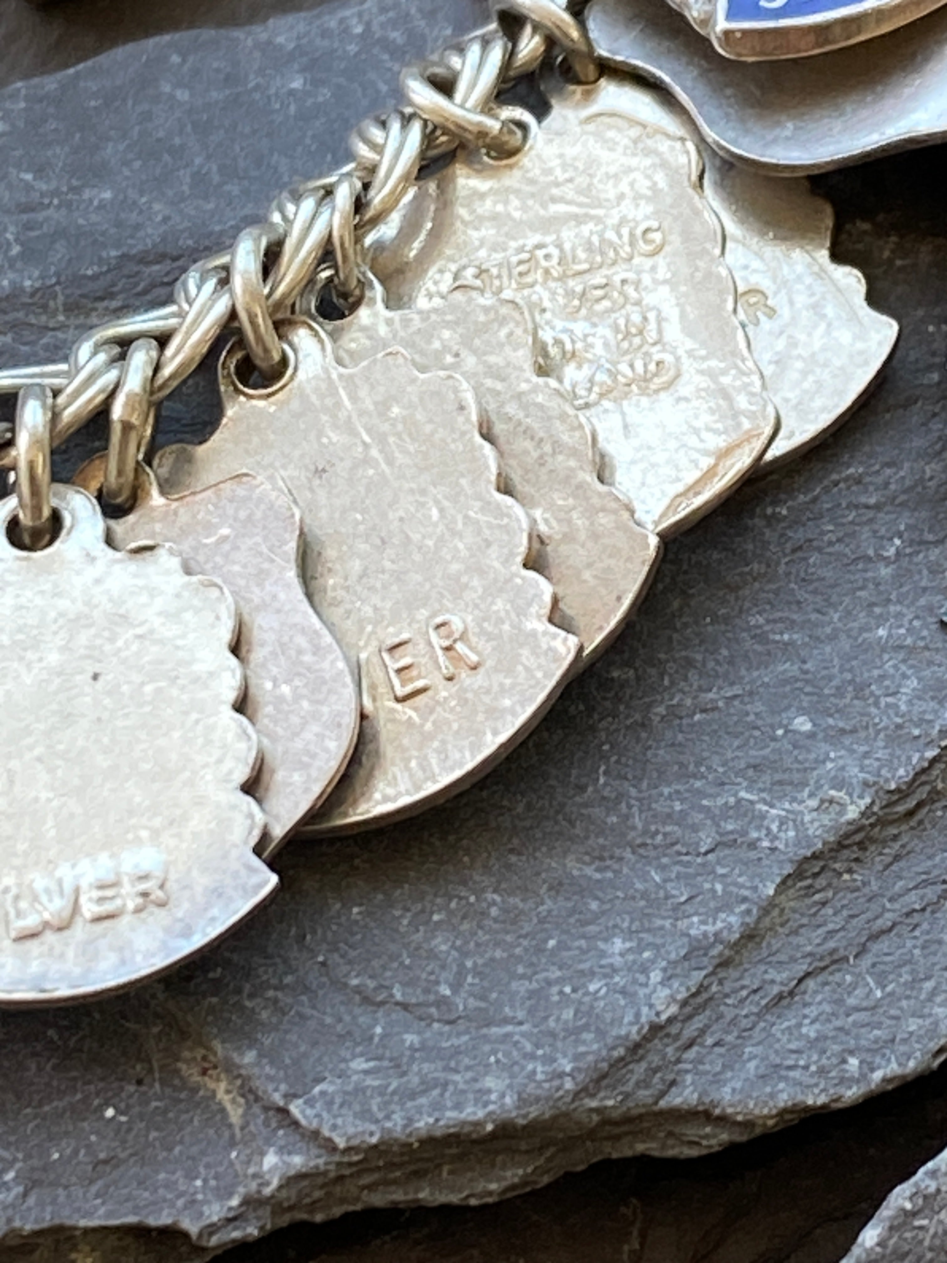 A fully loaded sterling silver charm bracelet with traditional padlock closure fitted with 25 silver and enamel tourist town shield charms