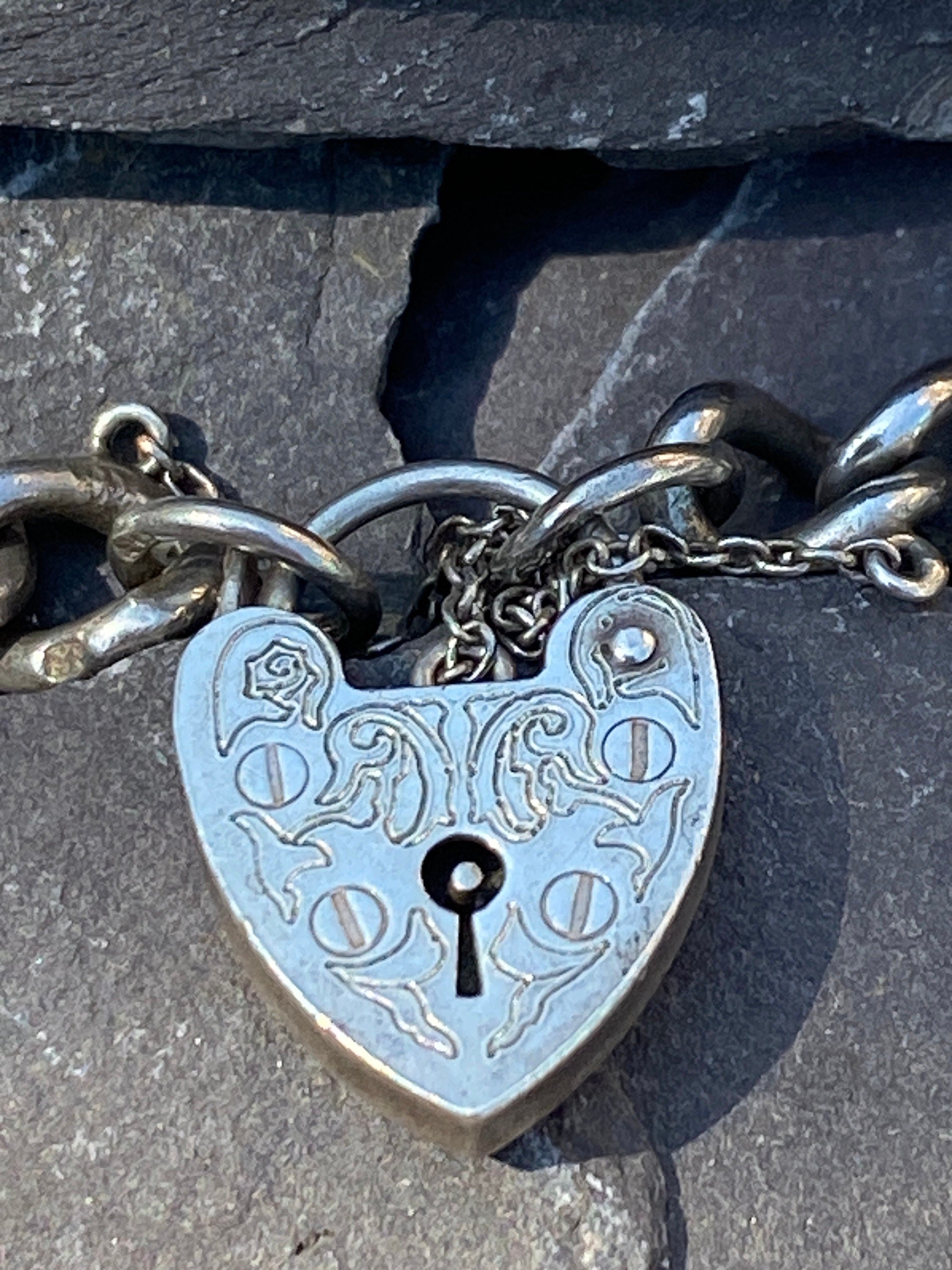 A traditional solid sterling silver curb link bracelet with padlock clasp
