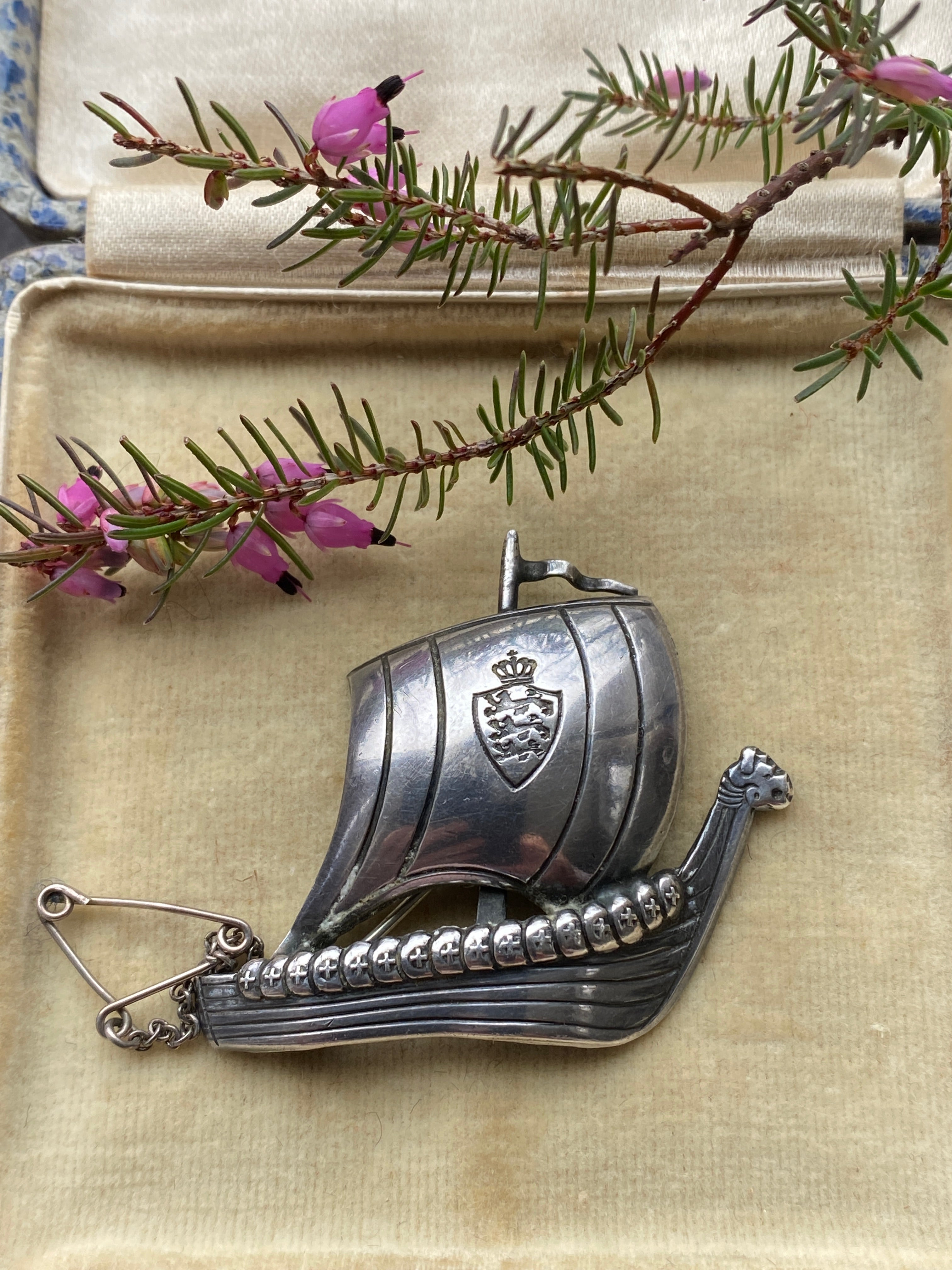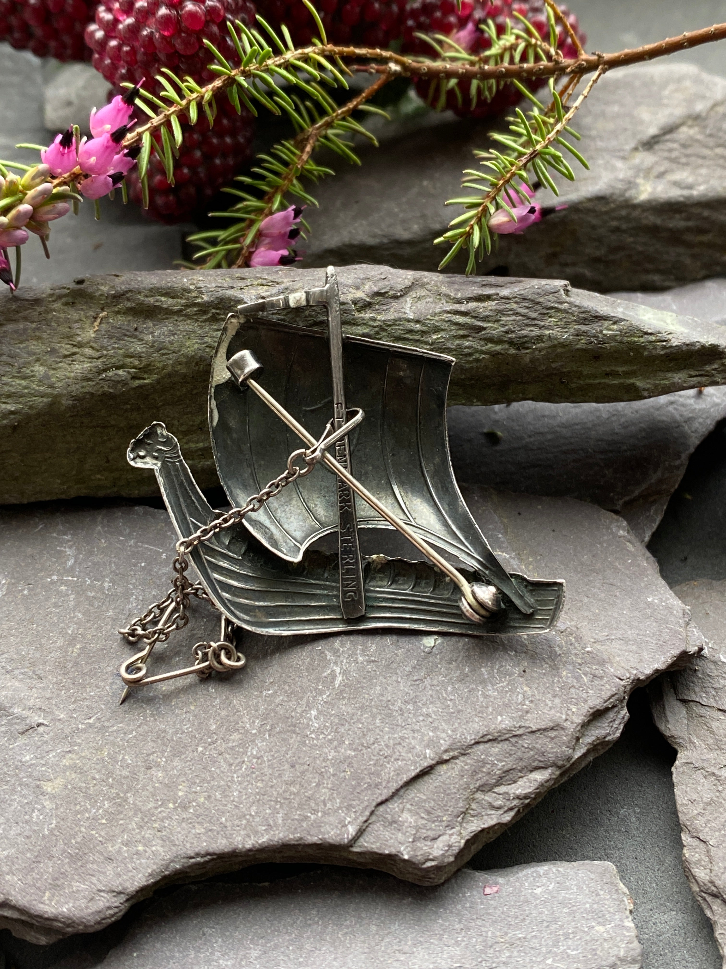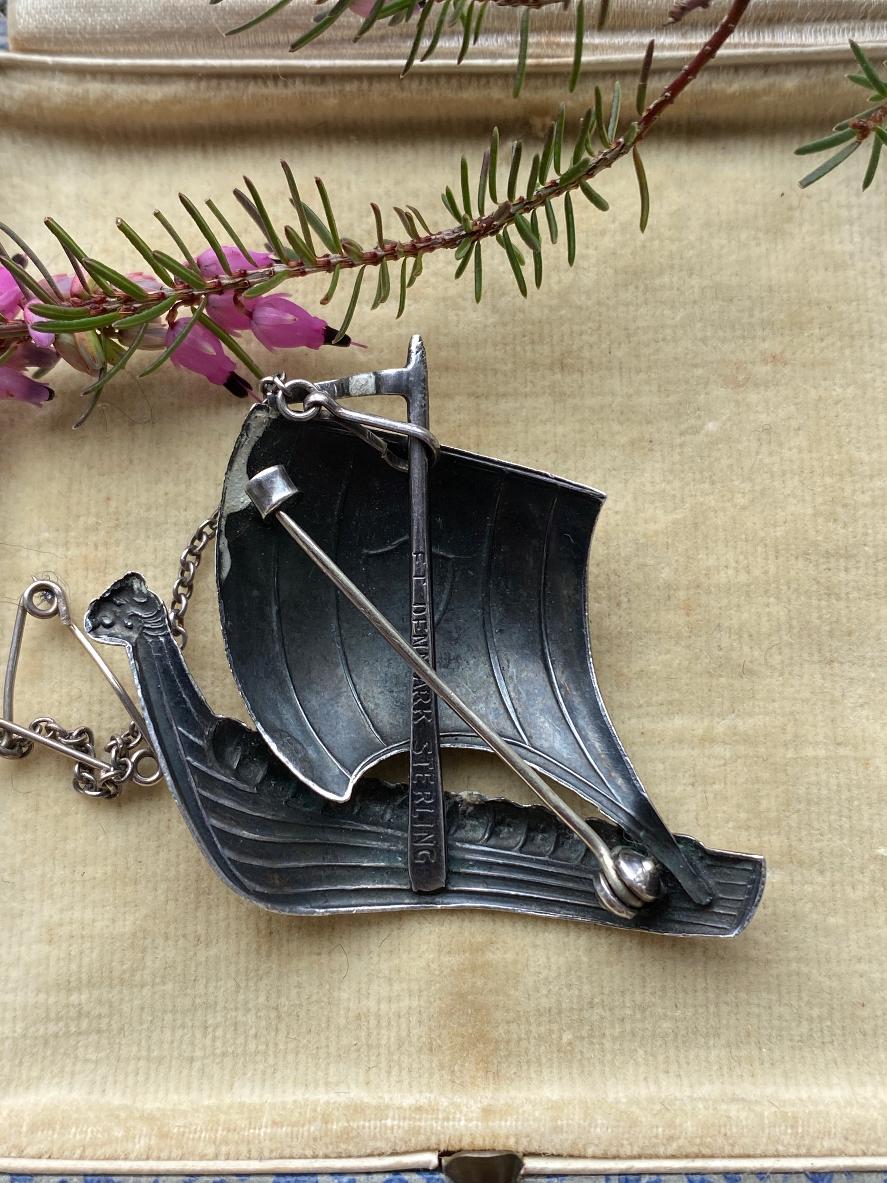 A typical Scandinavian Sterling Silver brooch featuring a Viking ship in full sail.