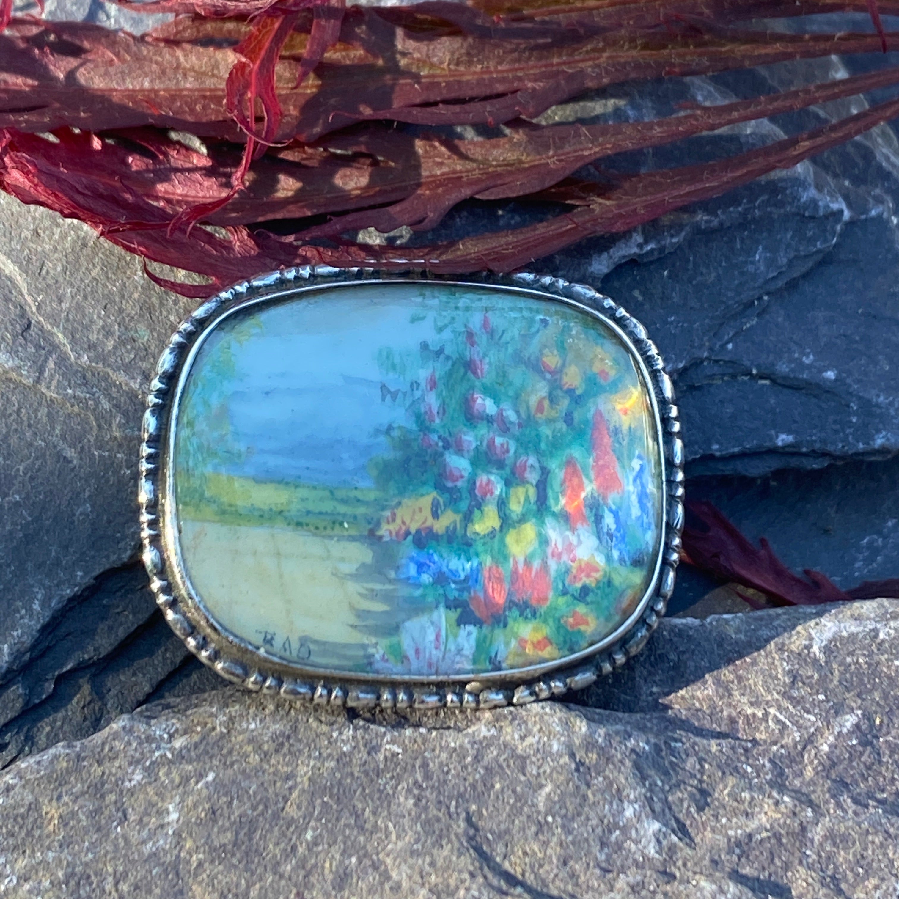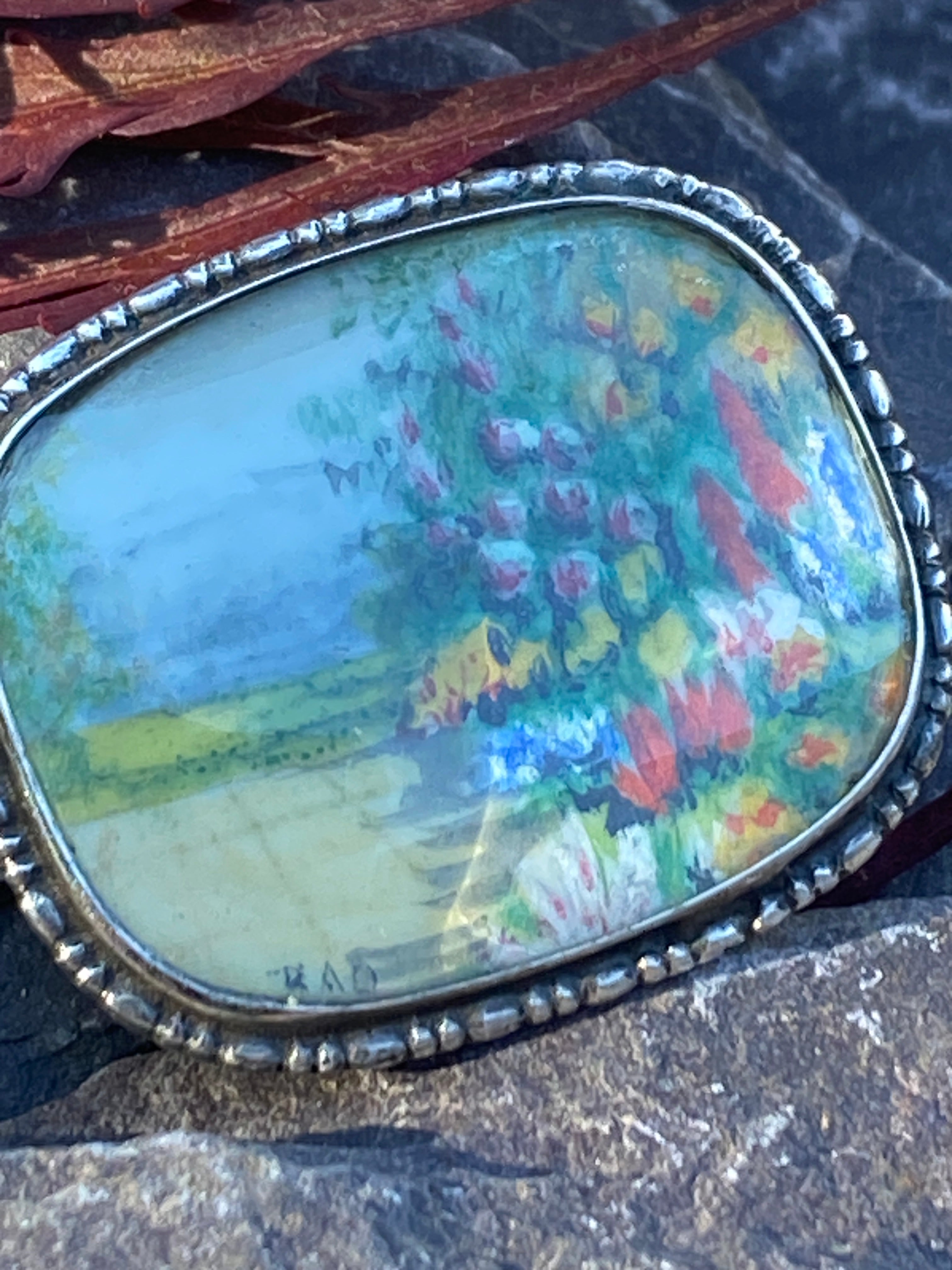 A Signed miniature work of art reverse painted onto glass and framed in sterling silver