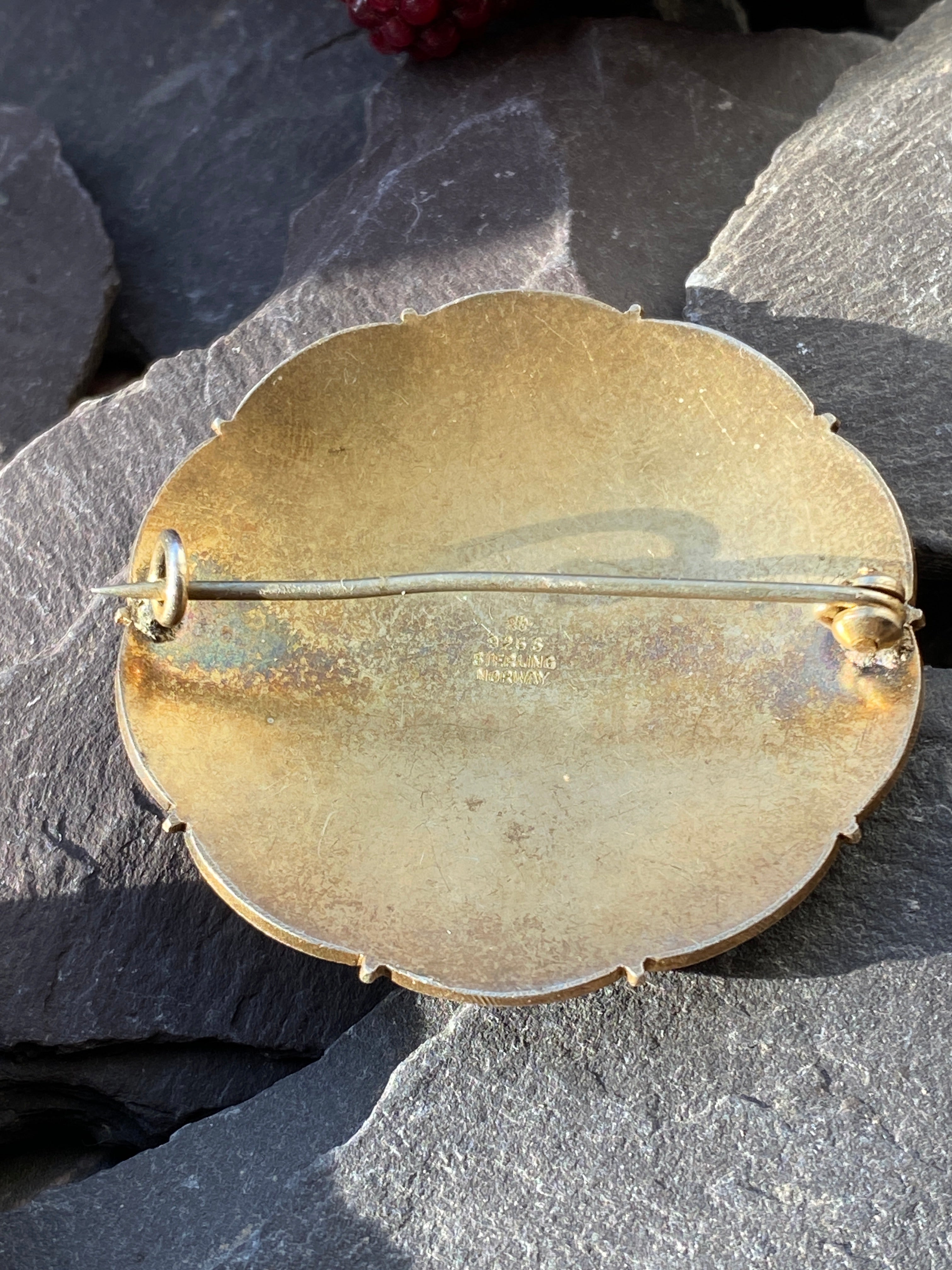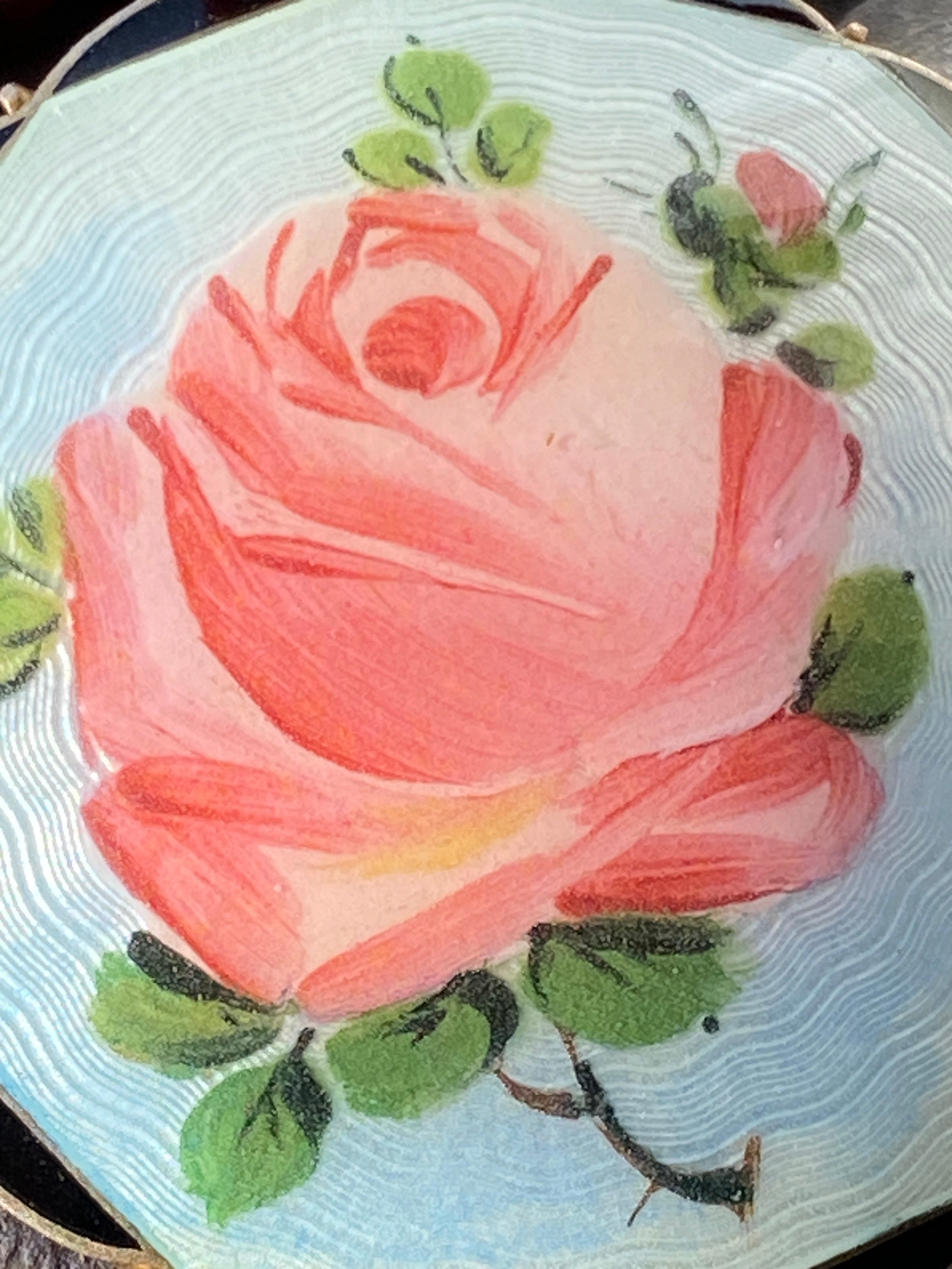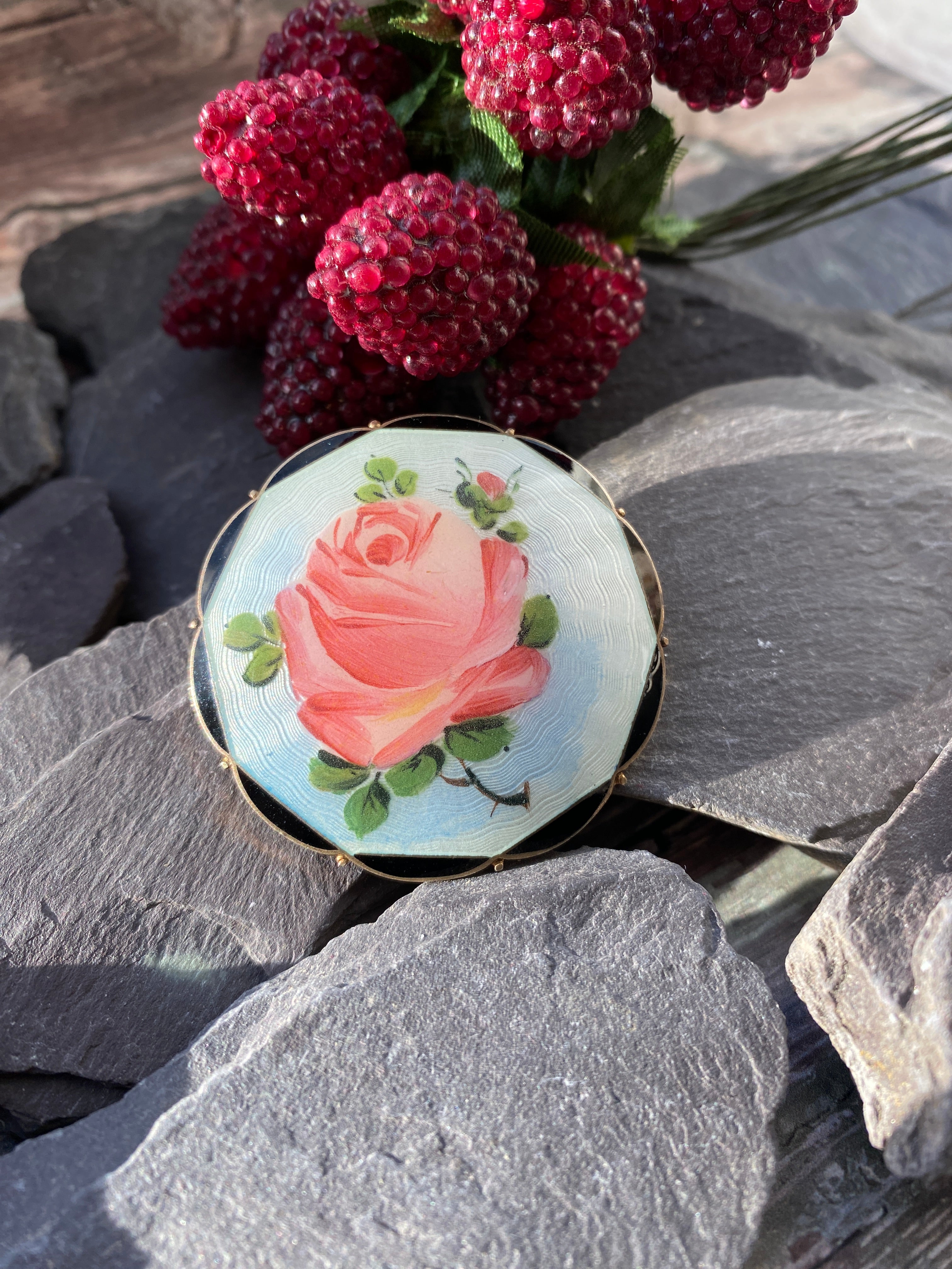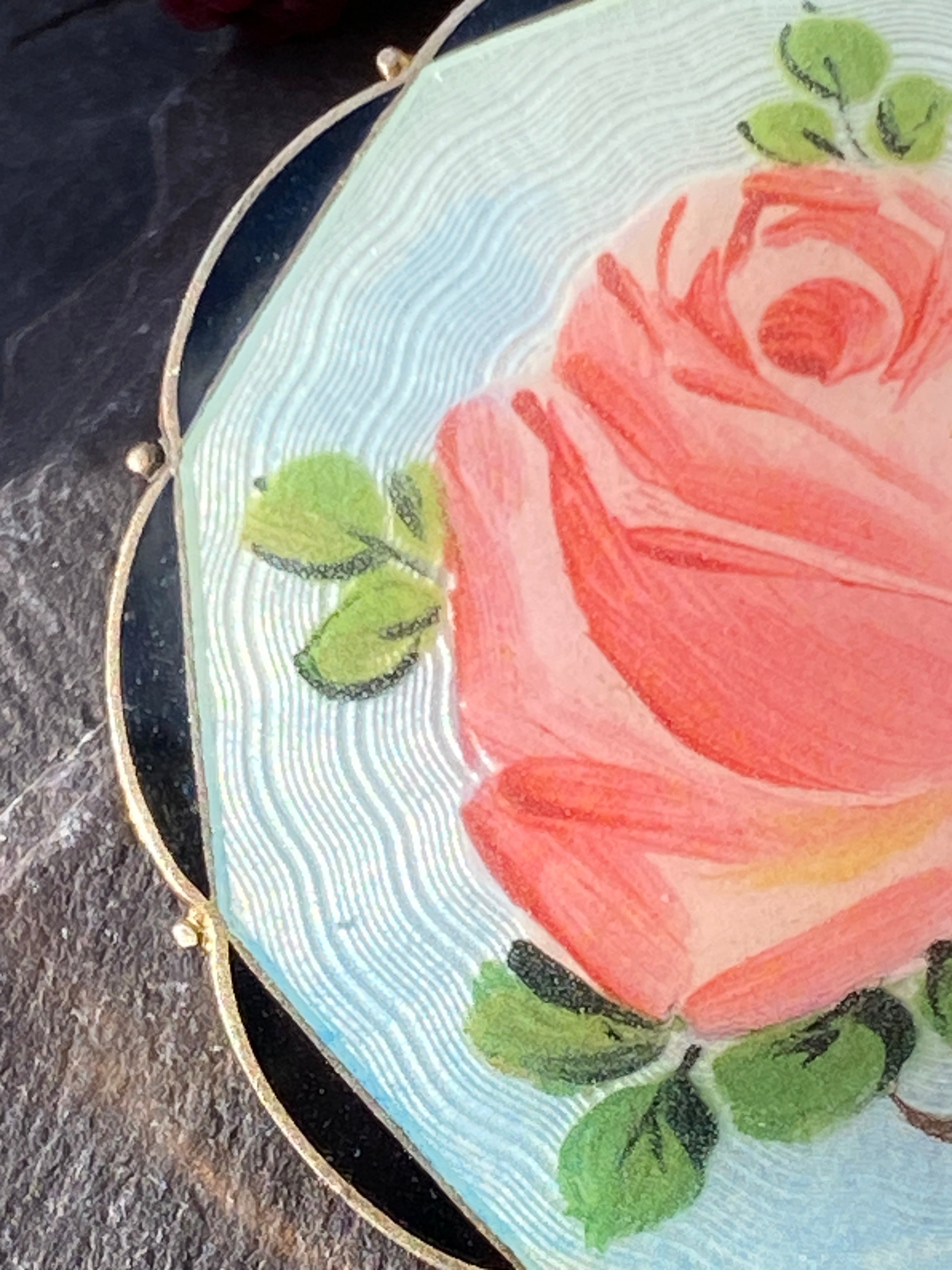 A wonderful sterling silver gilt guilloche enamel brooch featuring a hand painted rose in a scalloped black border