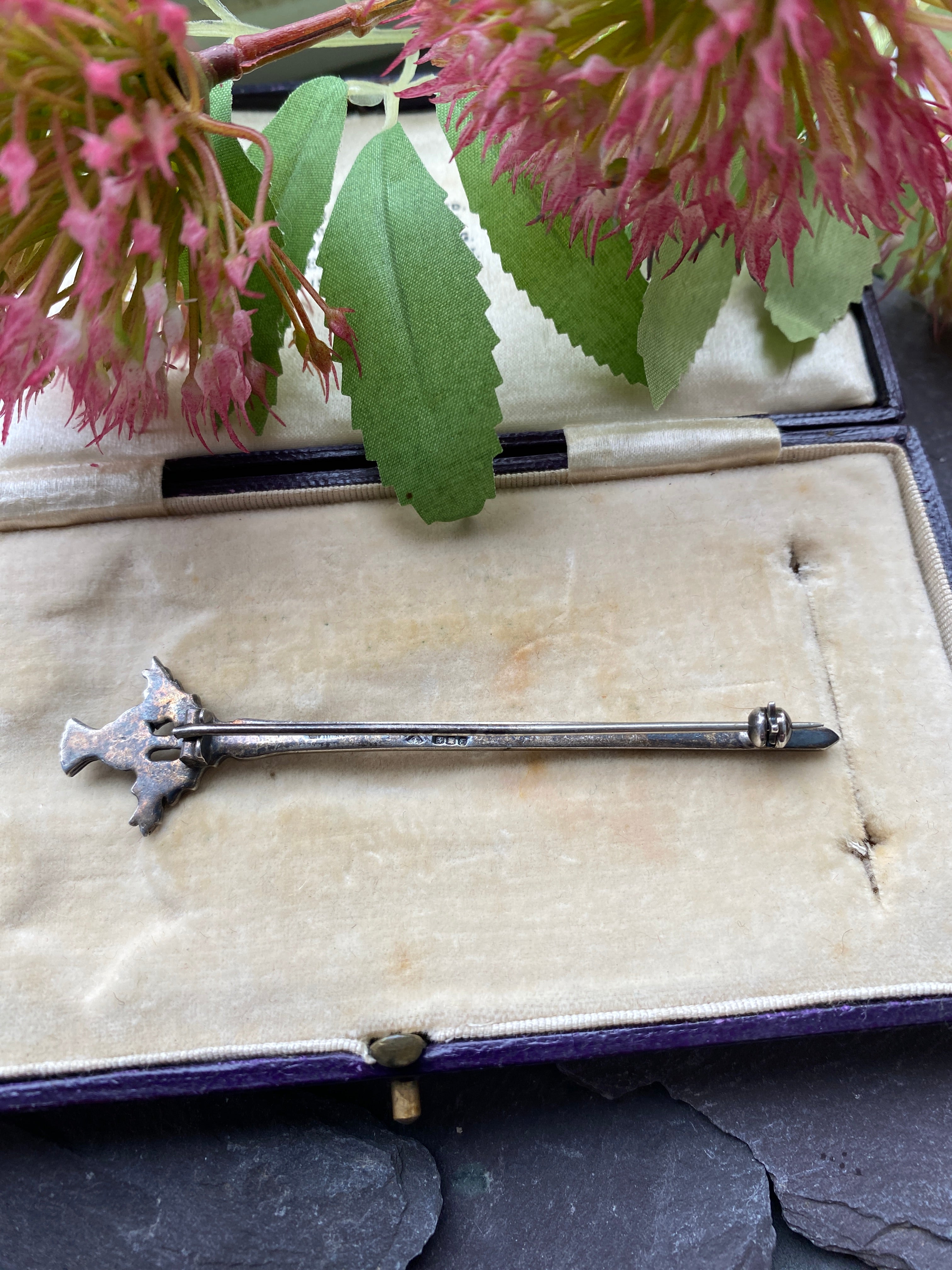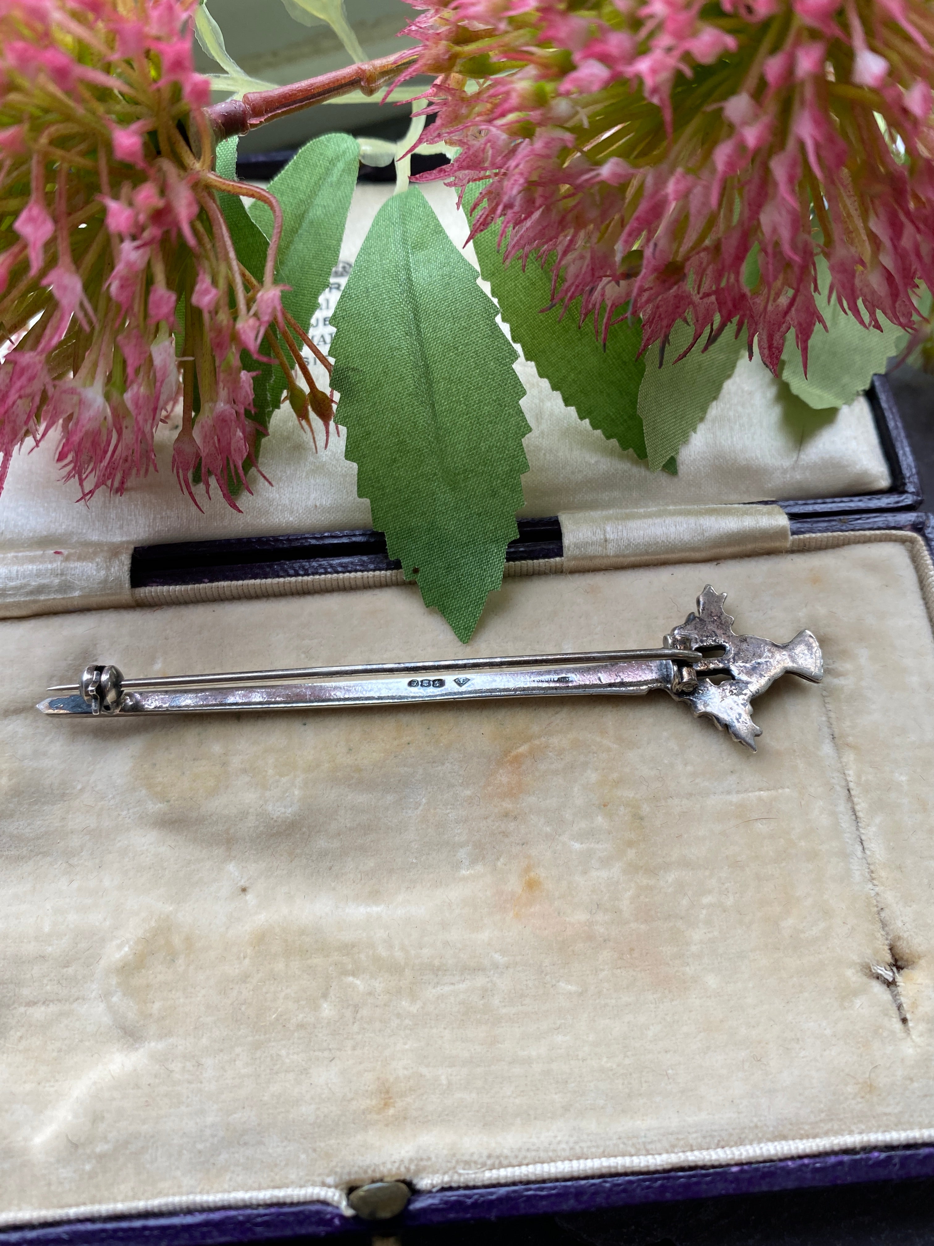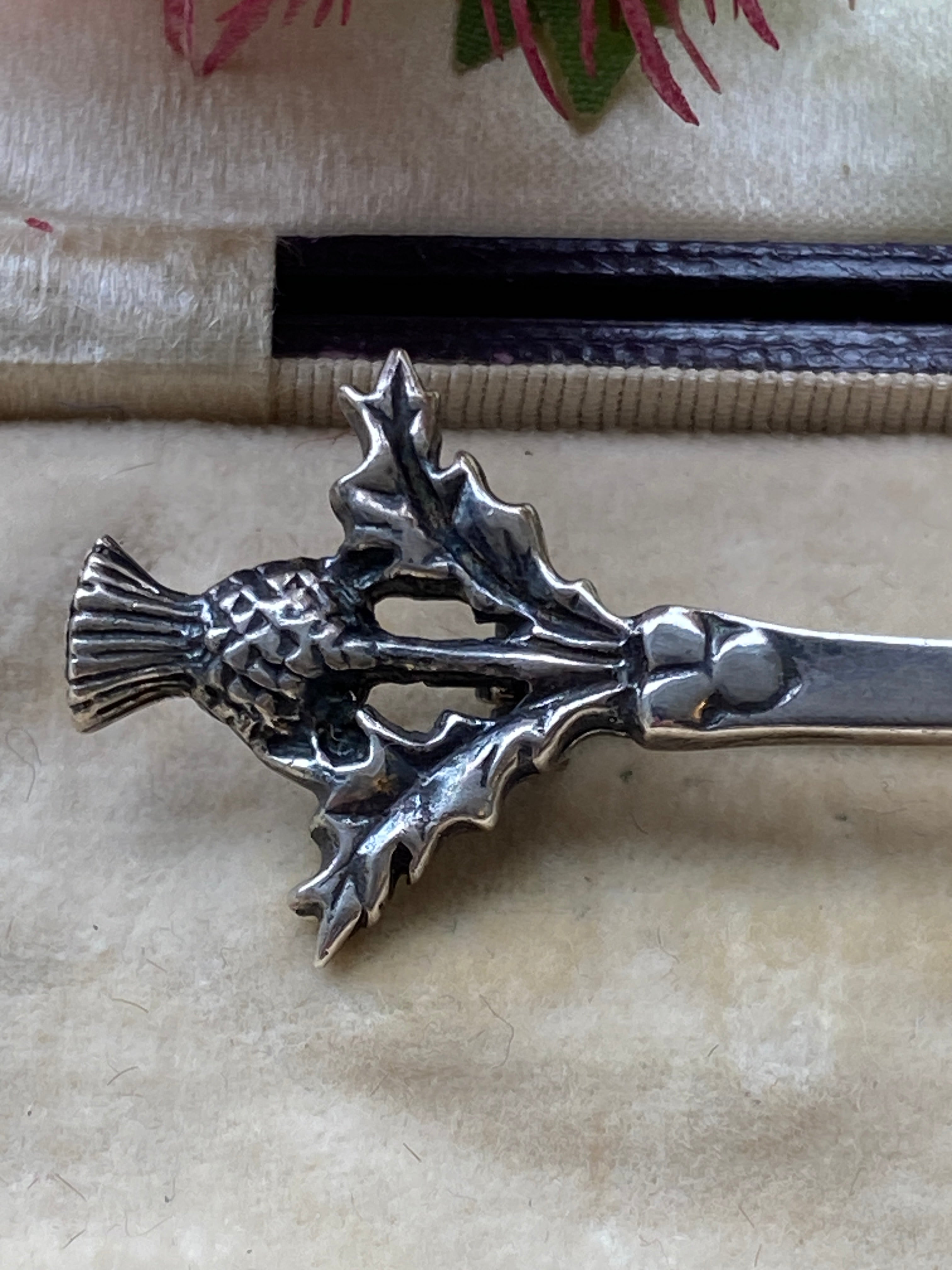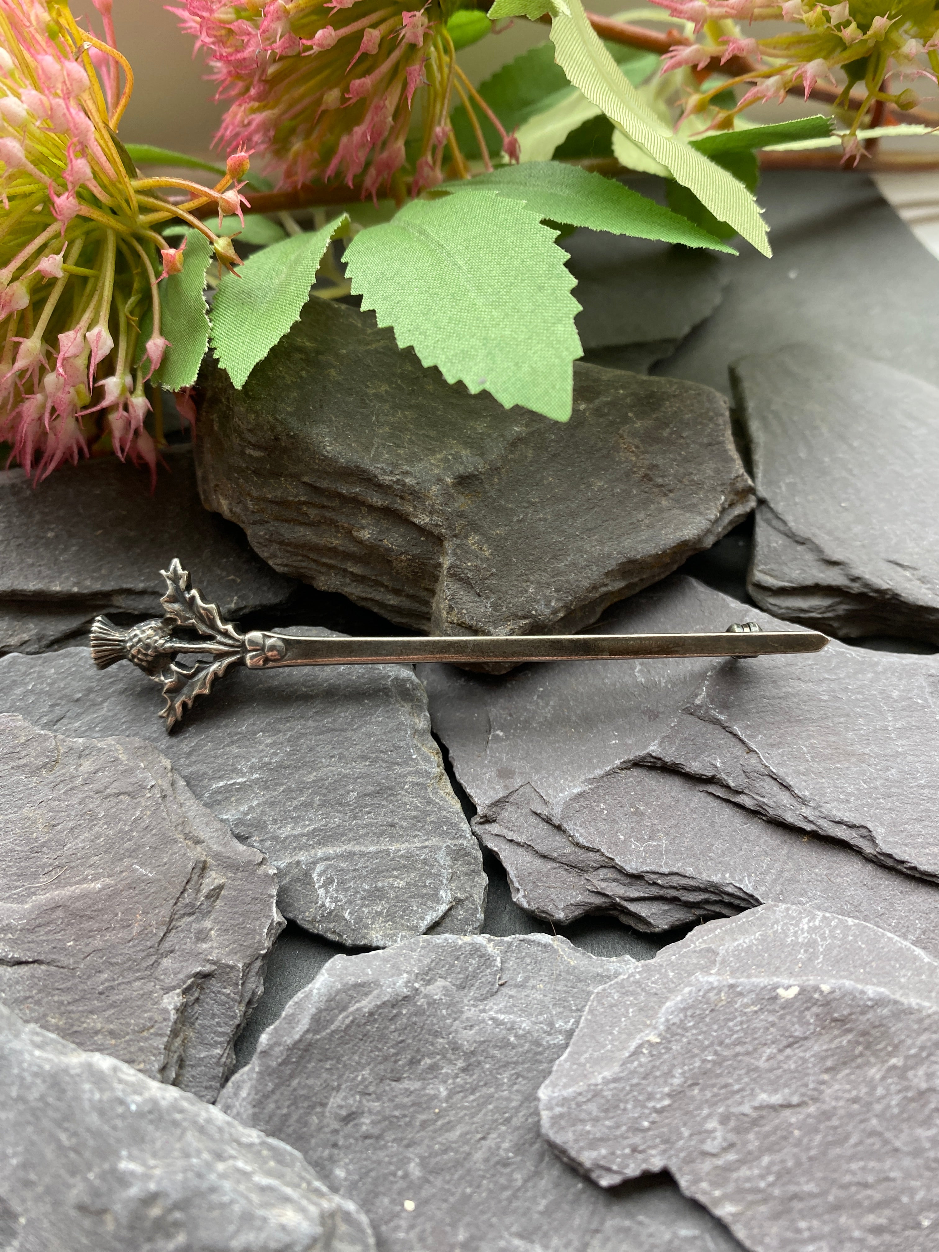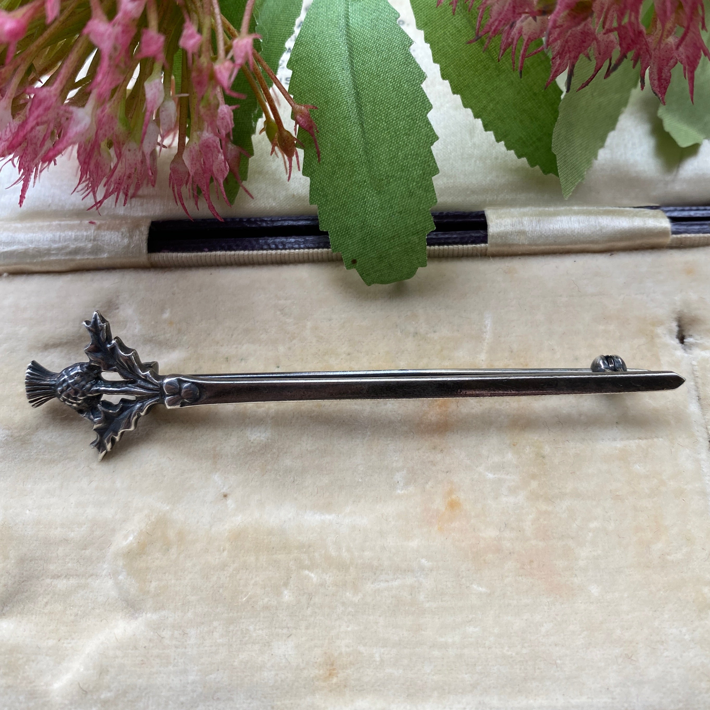 A long sterling silver brooch depicting a sword with a thistle a'top.