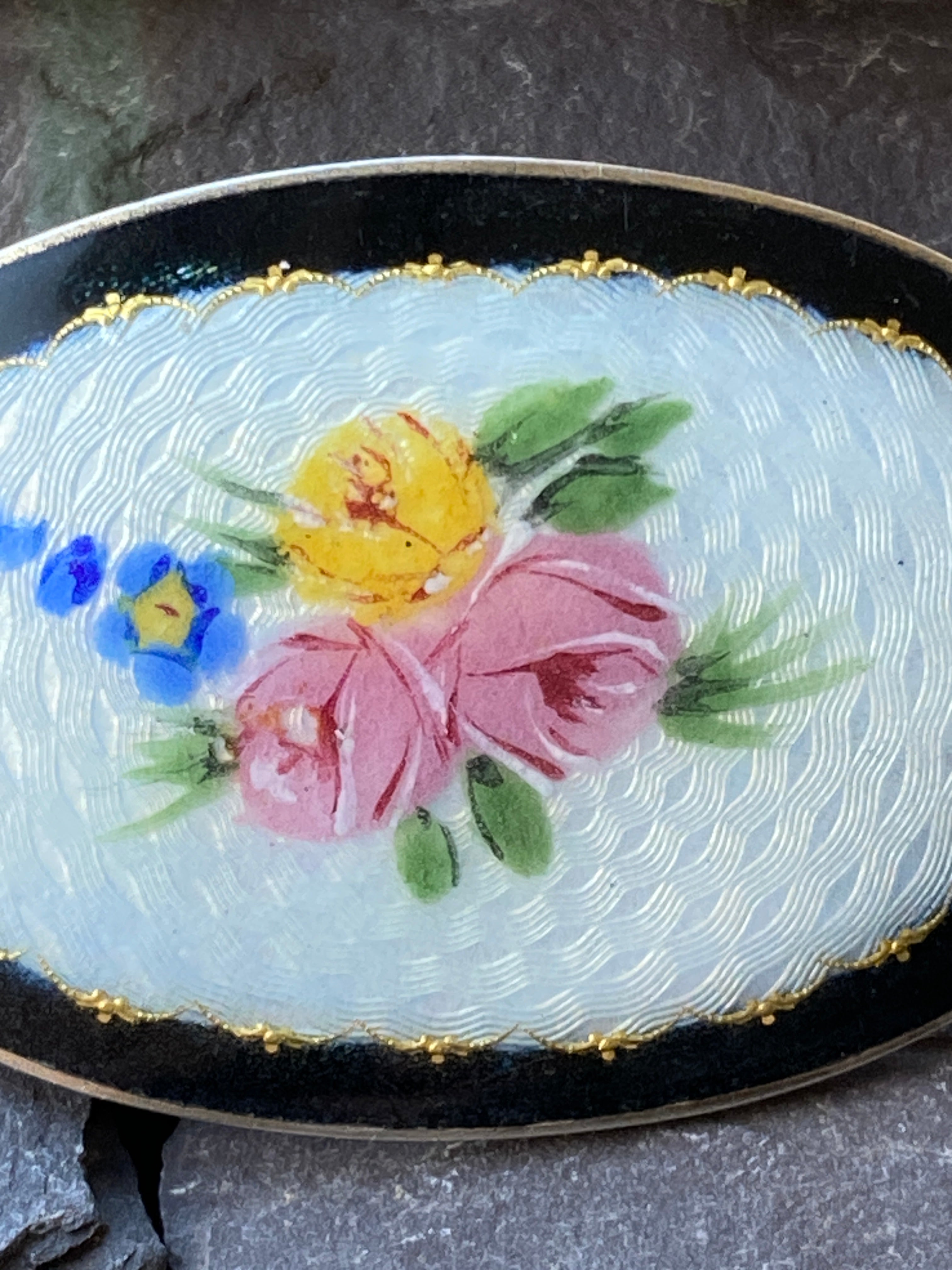 A beautiful sterling silver and guilloche enamel brooch.