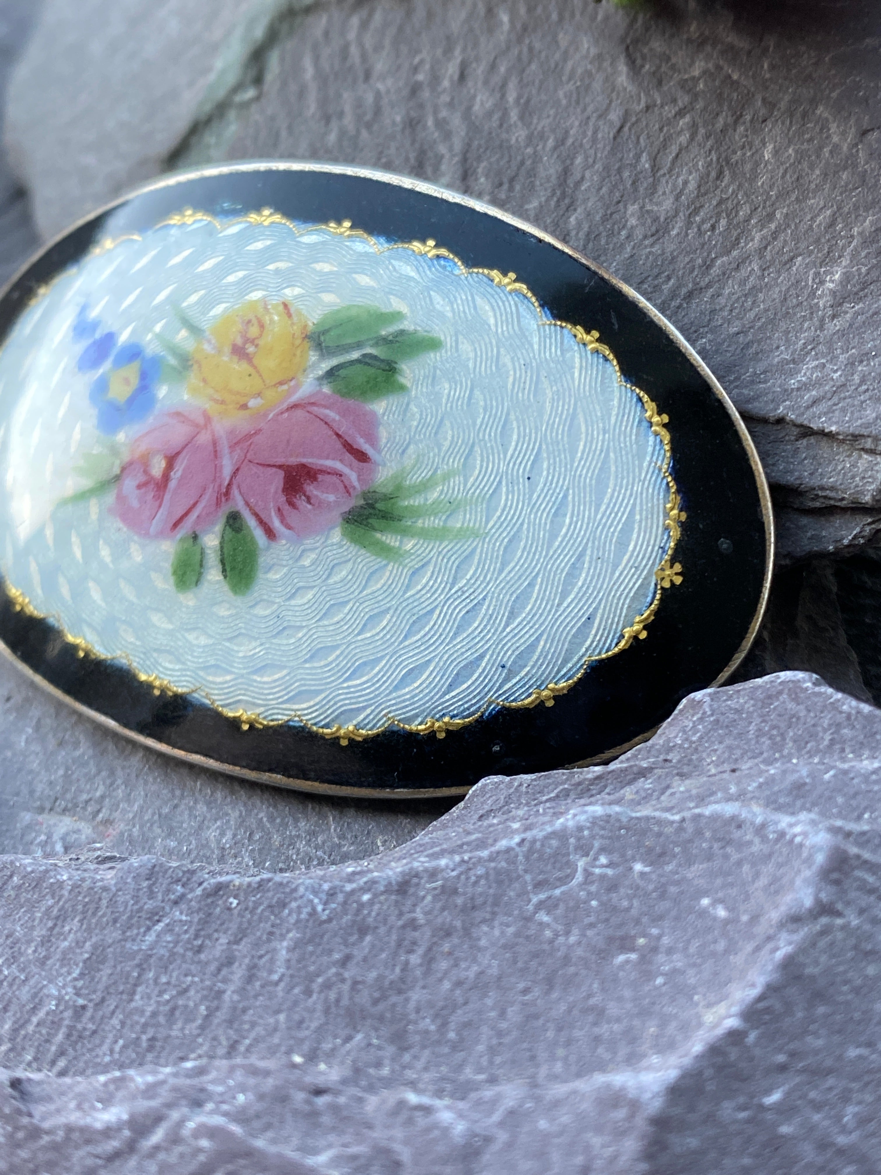 The oval form decorated with an engine turned white enamel background with hand painted flower detail with a gold edge inside a black enamel frame.