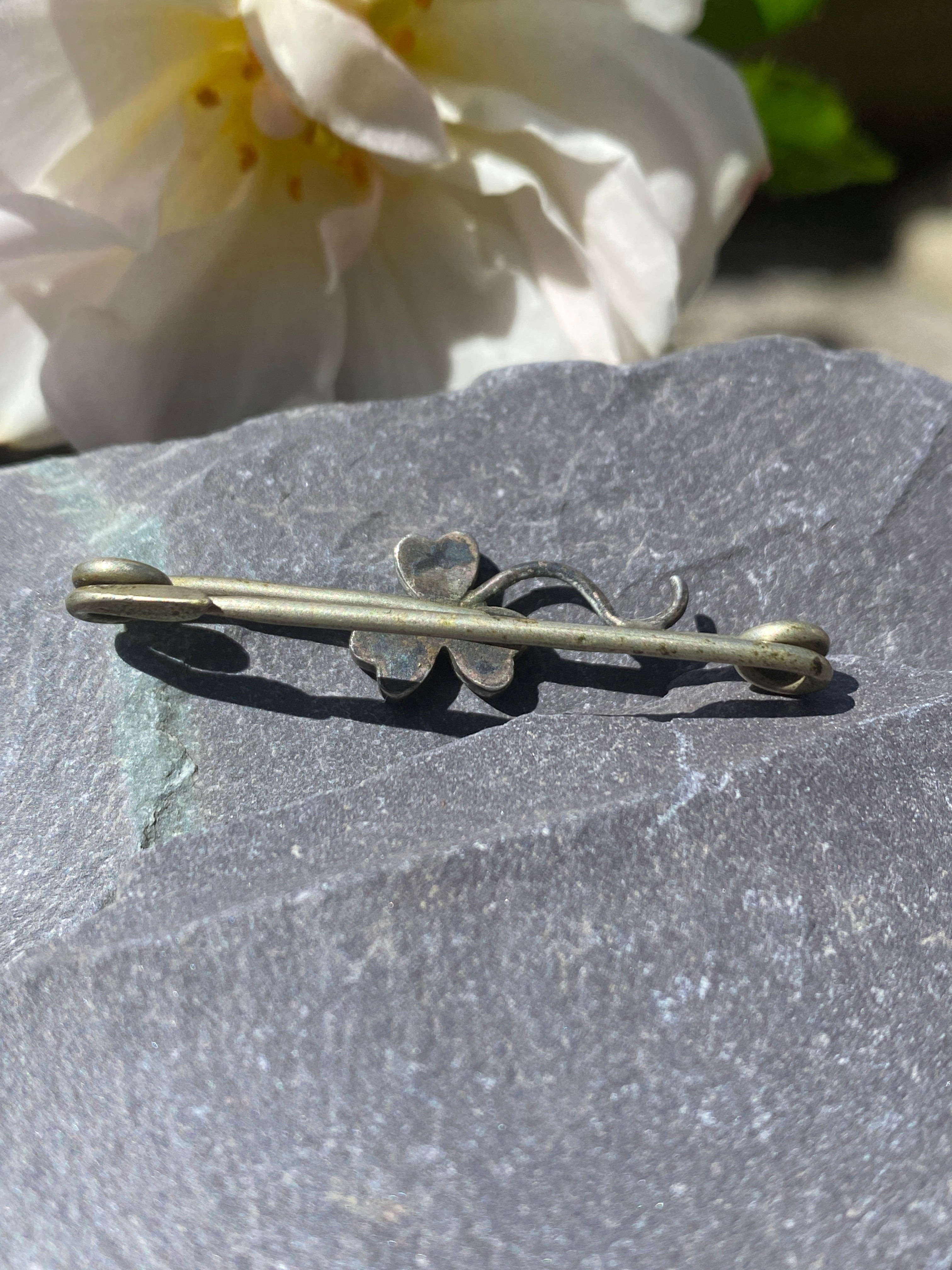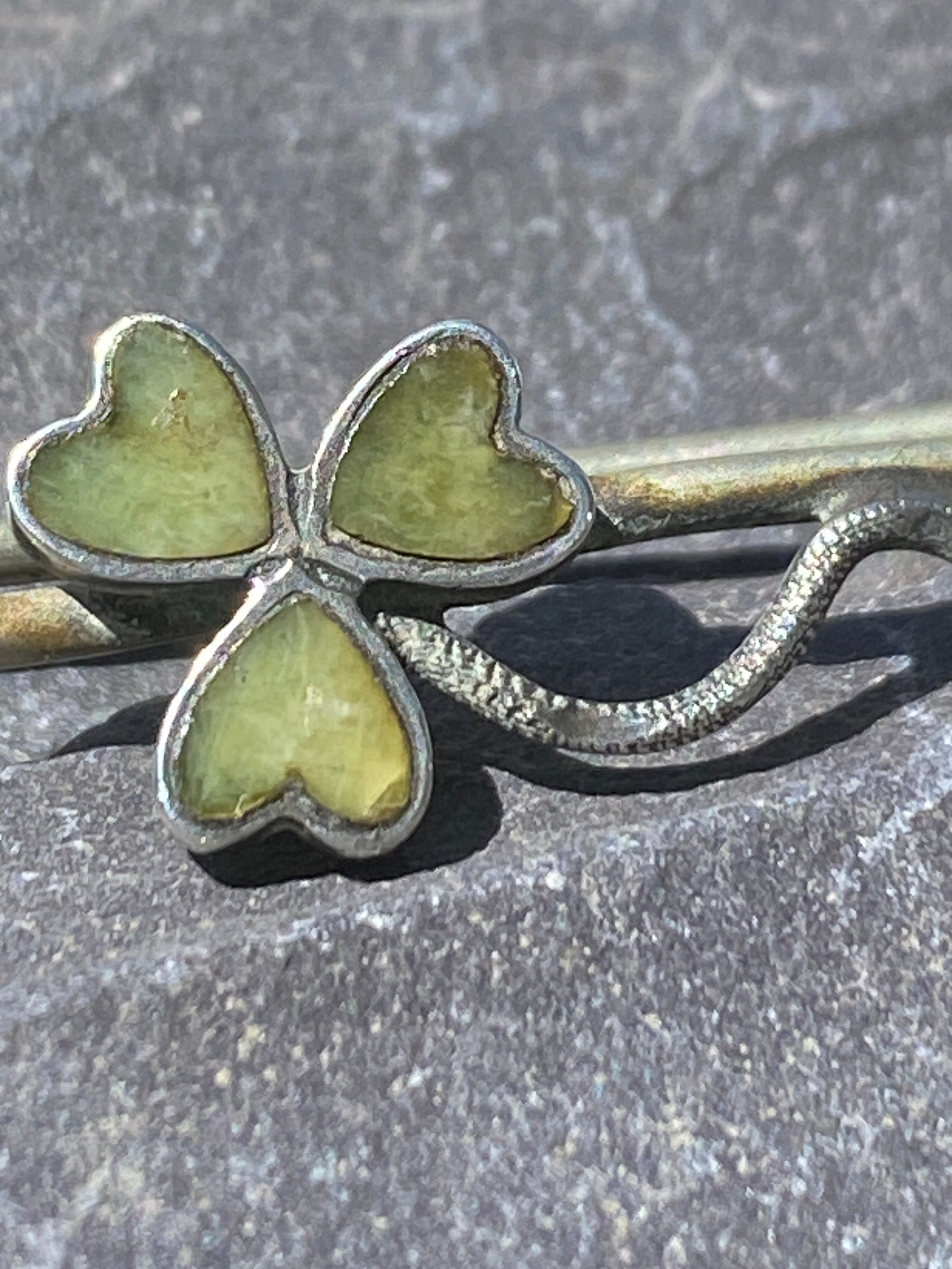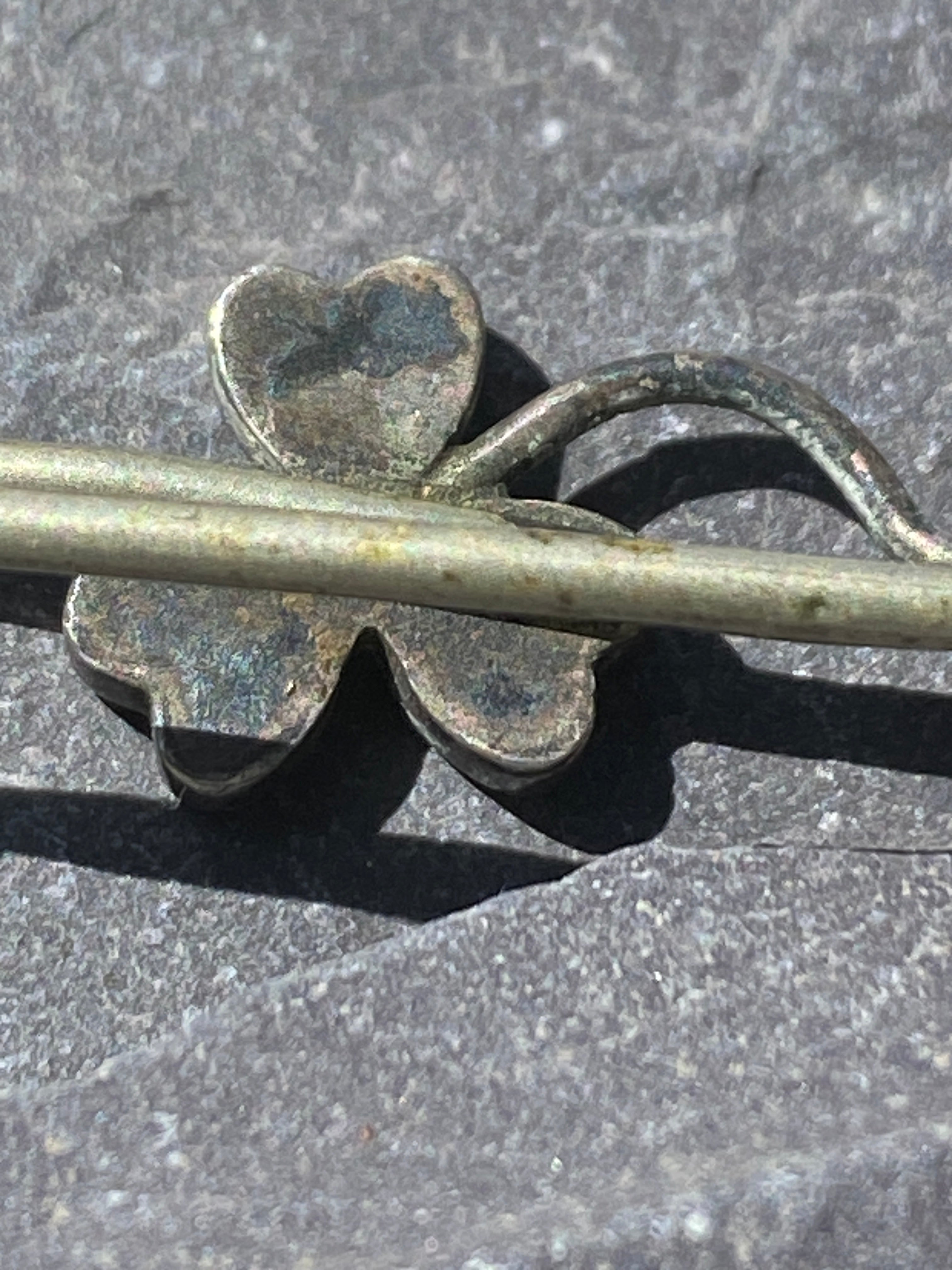 The bar brooch is nickel silver. The shamrock is silver